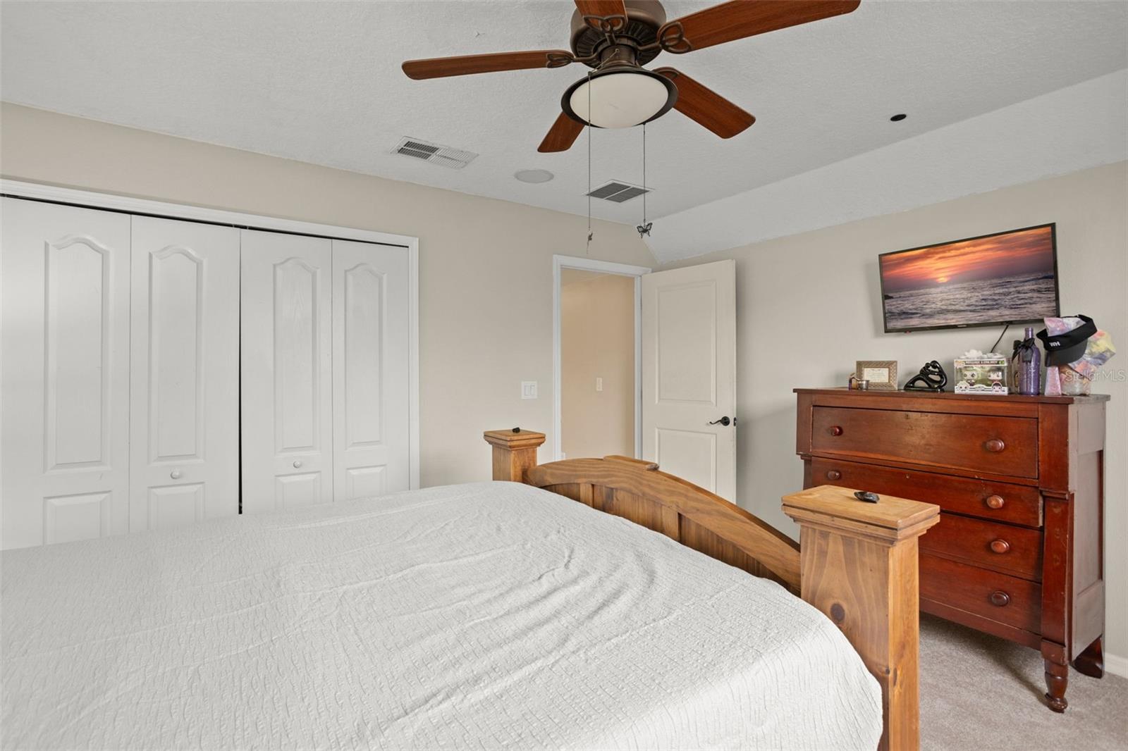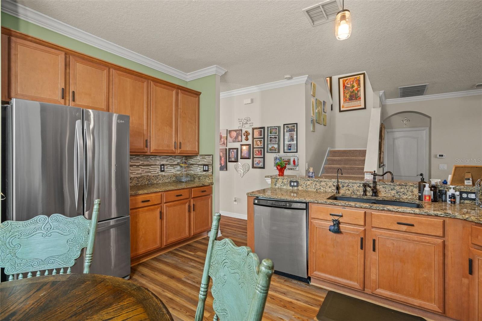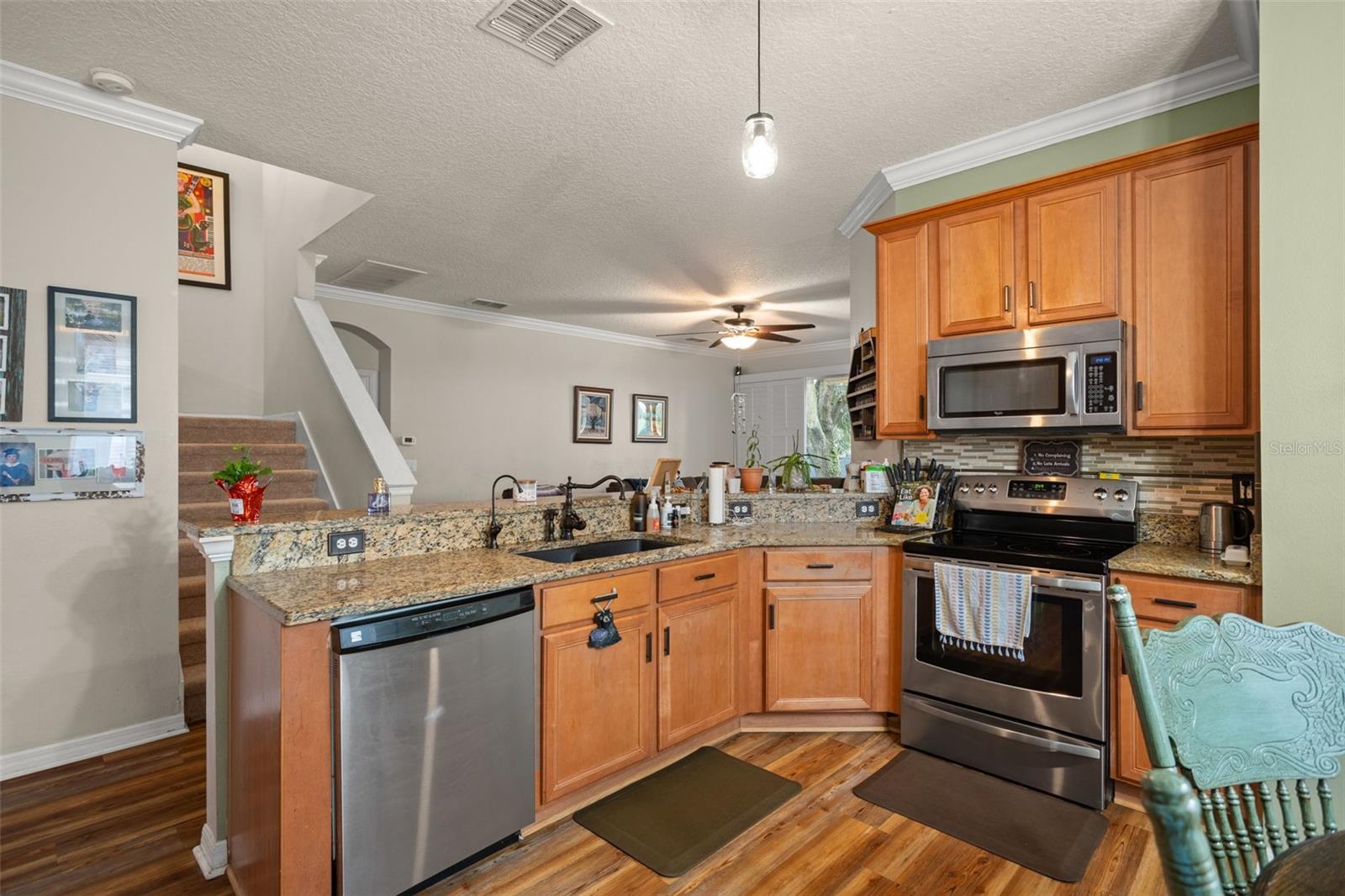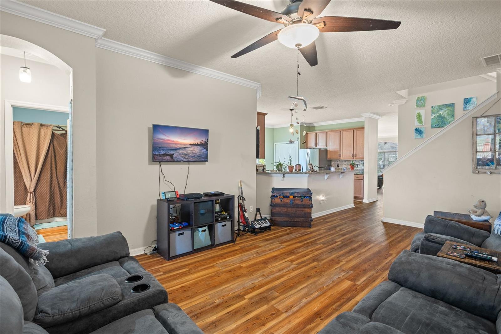 BRAND NEW ROOF and SOLAR PANELS paid off at closing! Amenities and serenity abound with this 4-bedroom, 3-bathroom home located in the guard-gated, golf community of Sorrento Hills and situated perfectly on the 6th tee of the Eagle Dunes Golf Course. Through the etched glass front door, you'll find the formal living or flex room up front with the picturesque window drawing in the natural light leading back into the formal dining room with crown molding throughout. Continuing into the heart of the home, you'll see that the high-end, waterproof laminate floors span through all living areas and bedrooms on the main floor. In the spacious, open kitchen you'll find granite countertops with stylish backsplash, stainless steel appliances, water softener and reverse osmosis system, and additional eat-in space overlooking the family room. A perfect guest bedroom with direct access to the 3rd full bathroom sits invitingly past the family room. Rounding out the main floor is the spacious primary suite featuring dual closets, double sink vanity, soaking tub, and stand-up shower and serene views of the backyard and golf course beyond. As you head upstairs the split floor plan offers endless options with bedrooms on either side of the loft space and another full bathroom. Back downstairs and out the sliding glass doors, you’re brought onto the extended covered patio overlooking your fenced backyard. This space offers mature landscaping throughout with beautiful views of the golf course for a serene backyard setting. The gated community of Sorrento Springs offers residents a fantastic pool with lounge areas, clubhouse, fitness center, tennis/basketball courts and access to the public golf course. Tons of community events including food truck nights, golf cart parades, and farmers markets make this an amazing place to live and play! You’ll be less than 5 mins from all the shopping & dining at Sorrento Hills Village, with historic Mt. Dora just 15 mins from your front door. Schedule your private showing today! **This property qualifies for a closing cost credit up to $3,300 through the Seller’s preferred lender.**