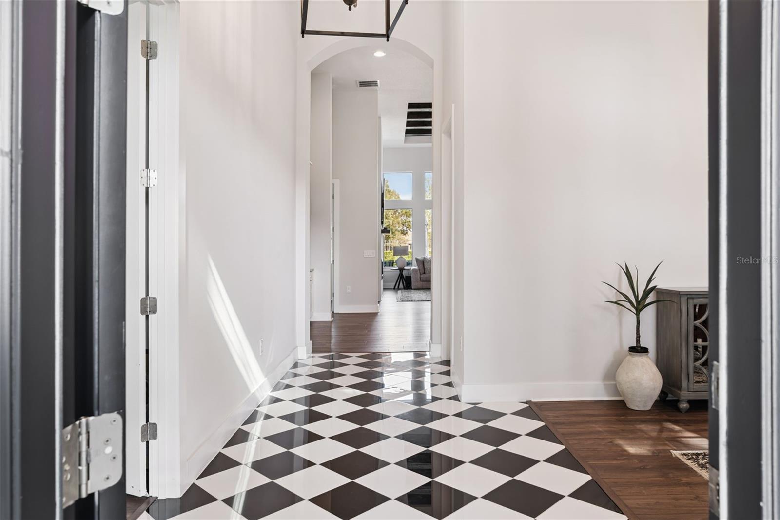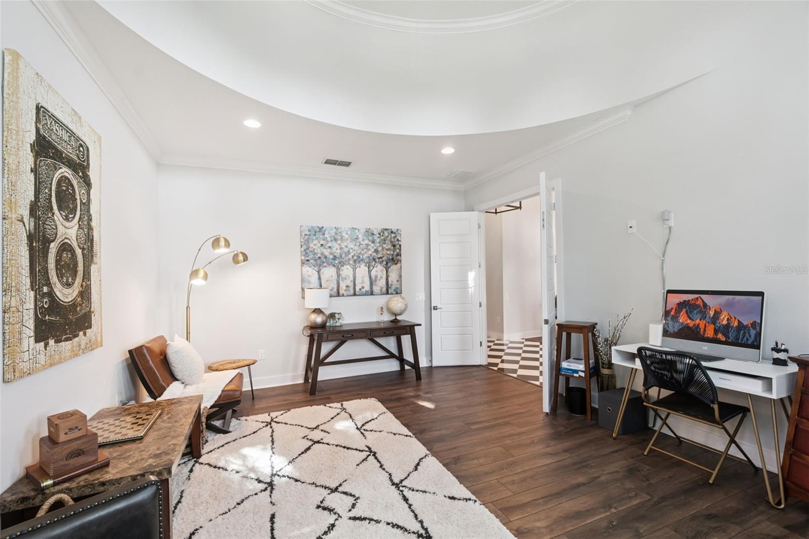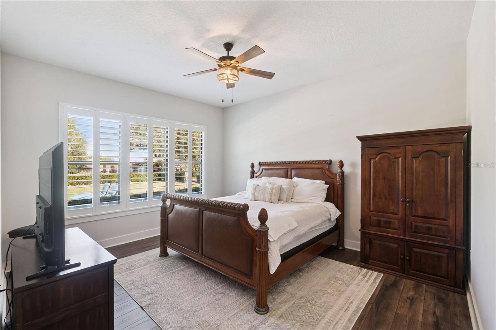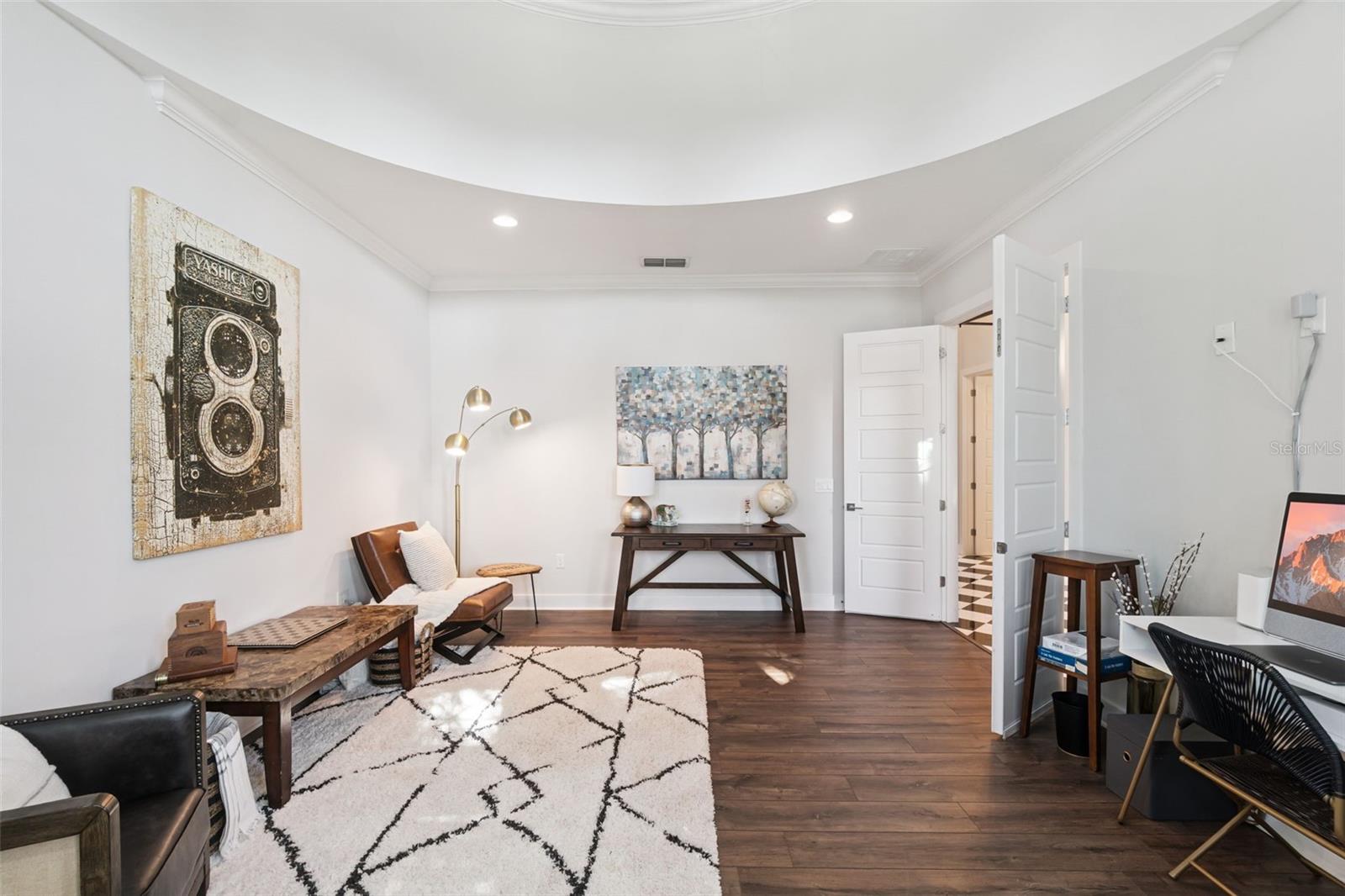 Welcome to 25861 Crossings Bluff, an exceptional estate built in 2019 by Vintage Estate Homes and perfectly positioned on a premier tree-lined street within the coveted gated and golf course community of RedTail. From the moment you arrive, this home sets itself apart with its architectural design, stone-accented elevation, mature oak trees, expansive paver driveway, and an oversized three-car garage. The property sits at over half an acre, fully fenced, and features a custom pool and large deck. The best part is the panoramic golf course views overlooking the 3rd hole of the RedTail golf course! Step through the front door to a beautifully tiled foyer, where the formal dining room sits to your right and a spacious dedicated office is to your left. Into the great room, floor-to-ceiling windows immediately draw your eye outside, showcasing the pool, the yard, and golf views. The living room features soaring 14-foot ceilings with wood beam accents and a stunning floor-to-ceiling gas fireplace. The fireplace is an impressive focal point, and anchors the entire space. The gourmet kitchen is open to the living area and designed with a large island for entertaining. The kitchen also features a cooktop, double ovens, a coffee bar, a cabinet-finished refrigerator, and a large walk-in pantry. The breakfast nook leads to French doors that open to the covered paver lanai. The homes boasts over 3,300 square feet of single-story living and features a functional split floorplan. The expansive primary suite is tucked away for privacy and features an oversized walk-in closet and an ensuite with split vanities, quartz countertops, a frameless glass shower, and a freestanding soaking tub. A spacious bonus/media room, two additional bedrooms, two full baths and a dedicated laundry room are located on the opposite wing of the home. The bonus room can be used as a fourth dedicated bedroom. The golf cart is INCLUDED in the sale - 2022 Club Car Onward. There home also conveys with a transferable home warranty. Living in RedTail means enjoying estate-style homes, mature landscaping, and a lifestyle centered around recreation and convenience. Community amenities include a golf course, clubhouse, fitness center, pool, and clay tennis courts. Ideally located between Mount Dora and the Orlando/Sanford area, Sorrento provides quick access to Lake Mary, the 429, the Wekiva Parkway, The City of Orlando, Disney, and the Orlando International Airport. This one-of-a-kind home offers high level finishes, space, privacy, and breathtaking views in a location that cannot be beat. Call today to schedule your private tour.