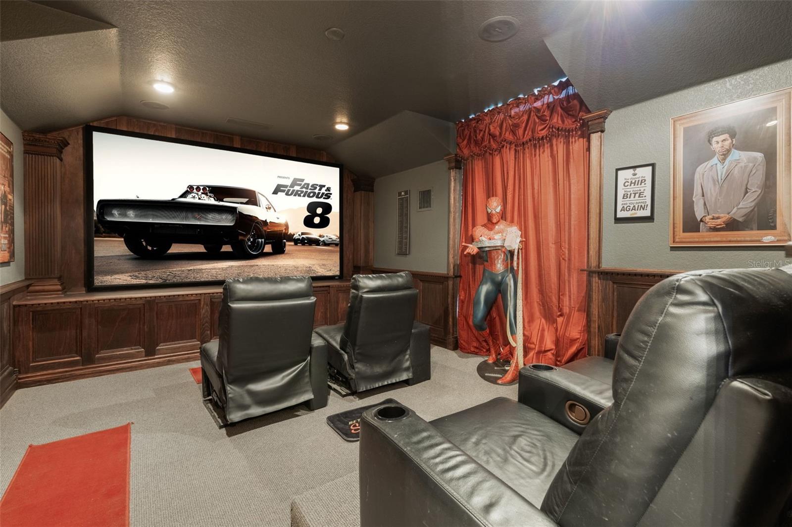 Welcome to this custom-built home that reflects exceptional craftsmanship and resort-style living, set within the gated golf community of RedTail. This thoughtfully designed residence showcases real hardwood flooring in formal areas, 8-foot interior doors, plantation shutters, and detailed solid wood trim and crown molding throughout, highlighting the quality of construction. Granite countertops are featured throughout the home. The kitchen is both functional and refined, showcasing 42-inch cabinetry, a large center island, stainless steel appliances, a natural stone backsplash, a walk-in pantry, and a separate wet coffee bar. A see-through gas fireplace connects the main living areas, adding warmth and architectural interest. The layout includes a dedicated office or bonus space with built-in shelving and desk, a private home theater, and a second bonus area enhanced with built-in closets, allowing it to function as a fifth bedroom. The primary suite serves as a spacious retreat, featuring 12-foot tray ceilings and his-and-hers walk-in closets. Outdoor living features a screened lagoon-style pool with full privacy and a well-equipped outdoor kitchen with granite countertops and a stainless-steel oven, ideal for entertaining. Mature landscaping creates a secluded and serene outdoor setting. RedTail offers championship golf, dining, fitness and spa amenities, Har-Tru clay tennis courts, scenic walking trails, and golf-cart-friendly streets, all conveniently located near downtown Orlando, major highways, and area attractions.