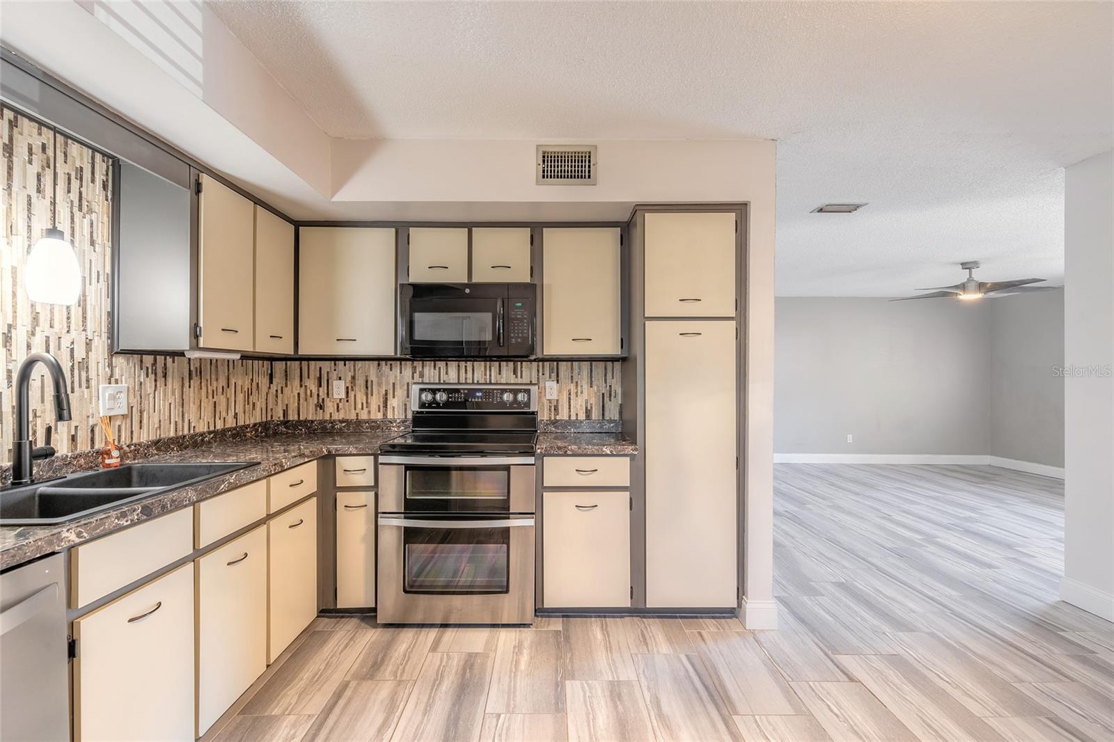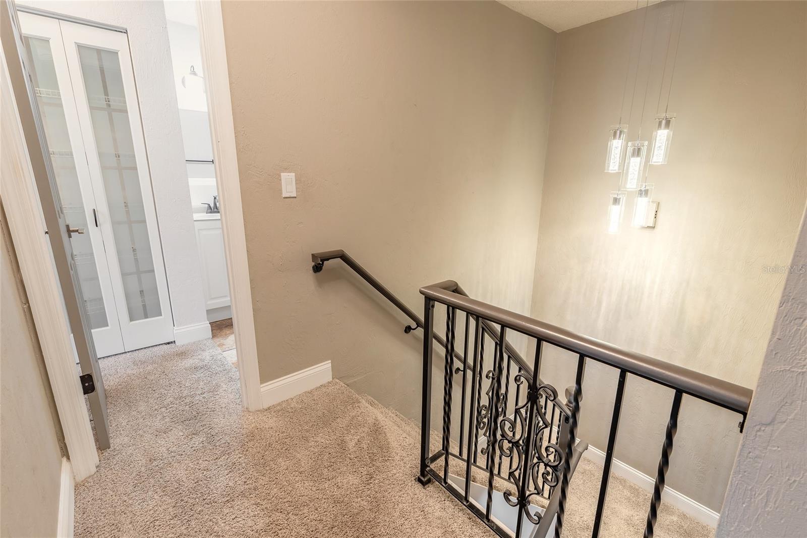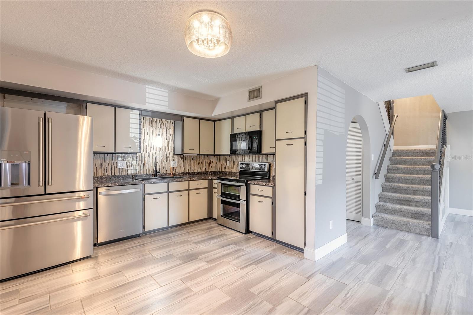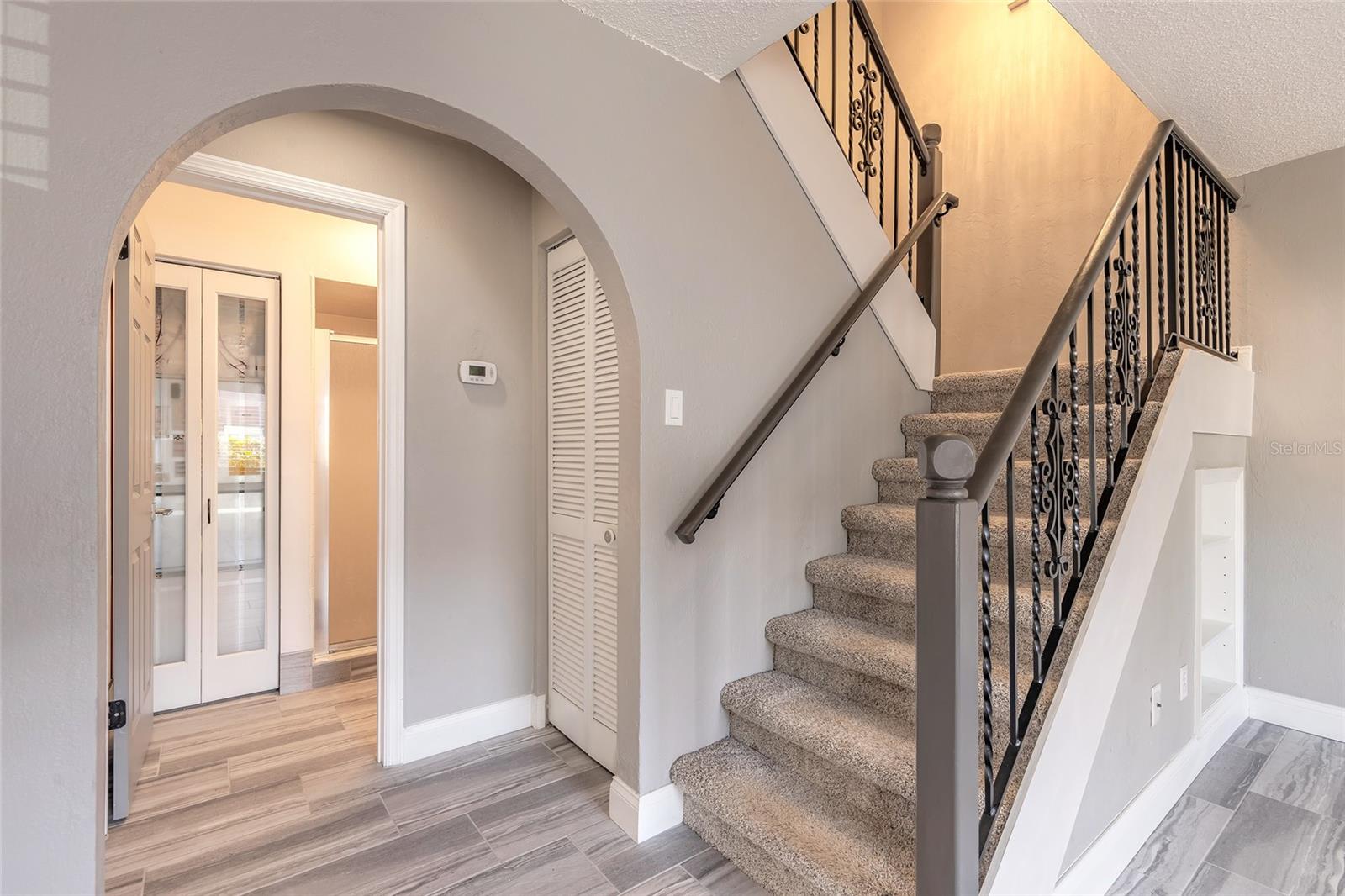 Fall in love with this beautifully renovated 2-bedroom, 2-bath townhome that’s never flooded and is truly move-in ready! Step inside to discover a stylish blend of modern updates and cozy charm, including sleek tile floors downstairs, plush new carpet upstairs, elegant 6-inch baseboards, and eye-catching 12-inch stair trim. The designer kitchen will impress with a double sink, stainless steel appliances—including a double oven and large refrigerator—chic glass lighting, trendy backsplash, and generous cabinet space. Both bathrooms have been tastefully upgraded with new vanities, modern plumbing, and a stunning master shower featuring raised ceilings, a custom niche, and fresh tile work. Every detail has been considered—from remote-controlled ceiling fans and a dazzling stairwell chandelier to energy-efficient LED lighting throughout. Unique custom touches like glass bifold closet doors, bold colored interior doors with square handles, and a wood-paneled accent wall in the second bedroom give this home a fresh, contemporary vibe. Curb appeal is on point with fresh exterior paint, a newly built wooden balcony railing, and a stylish modern front door. This is the one you've been waiting for—schedule your showing today before it’s gone!