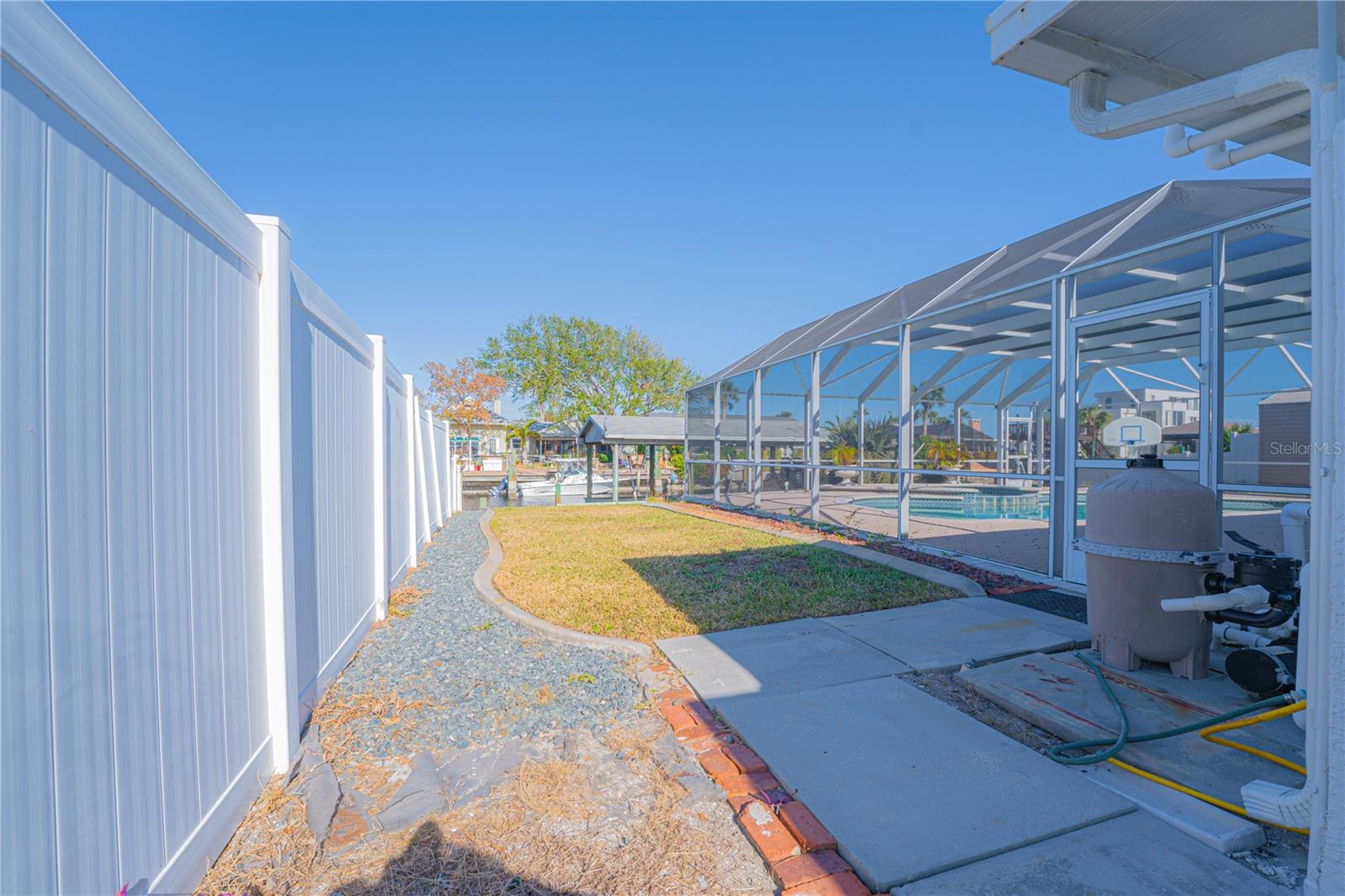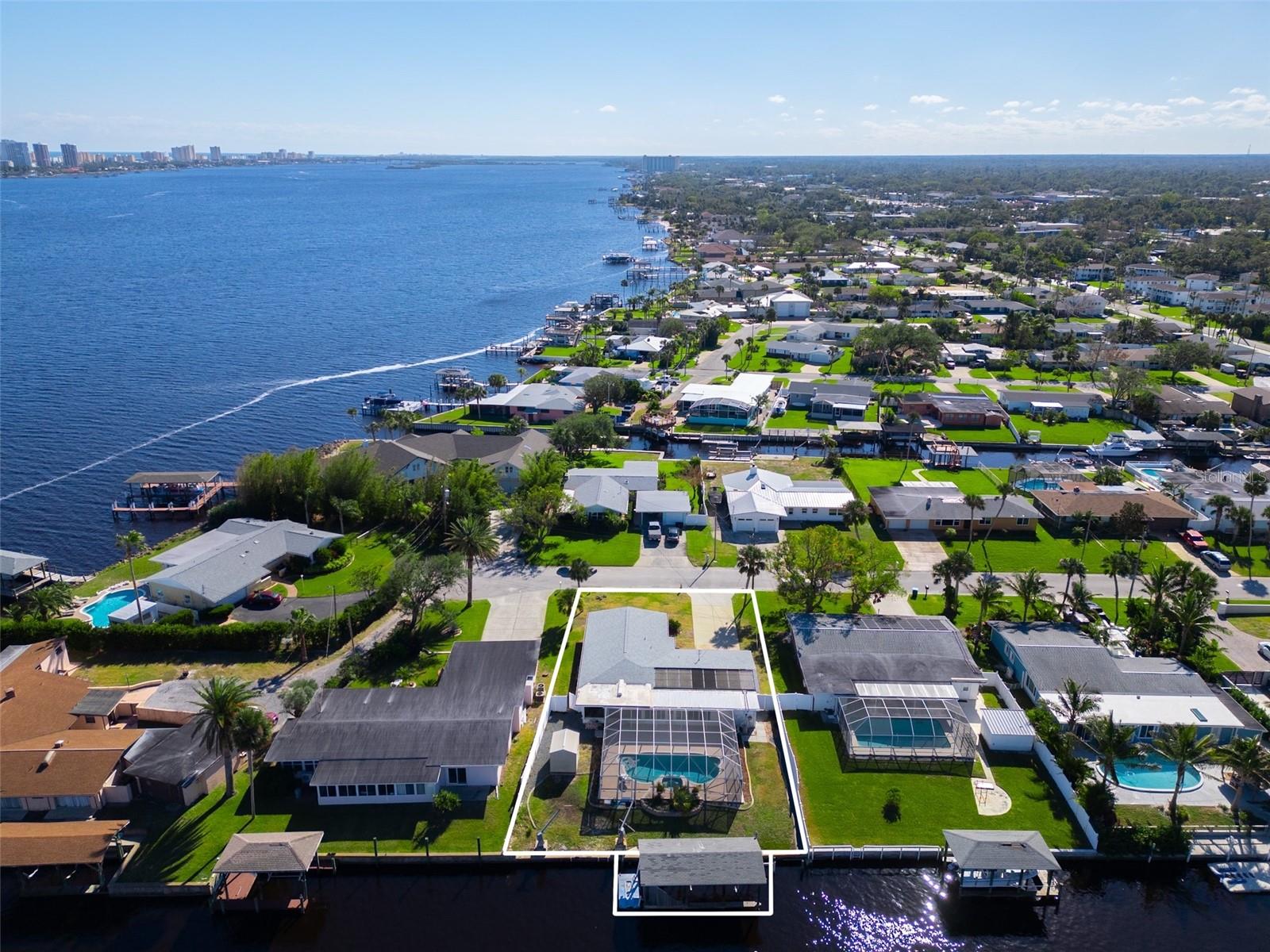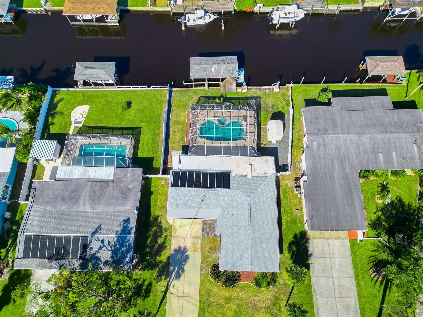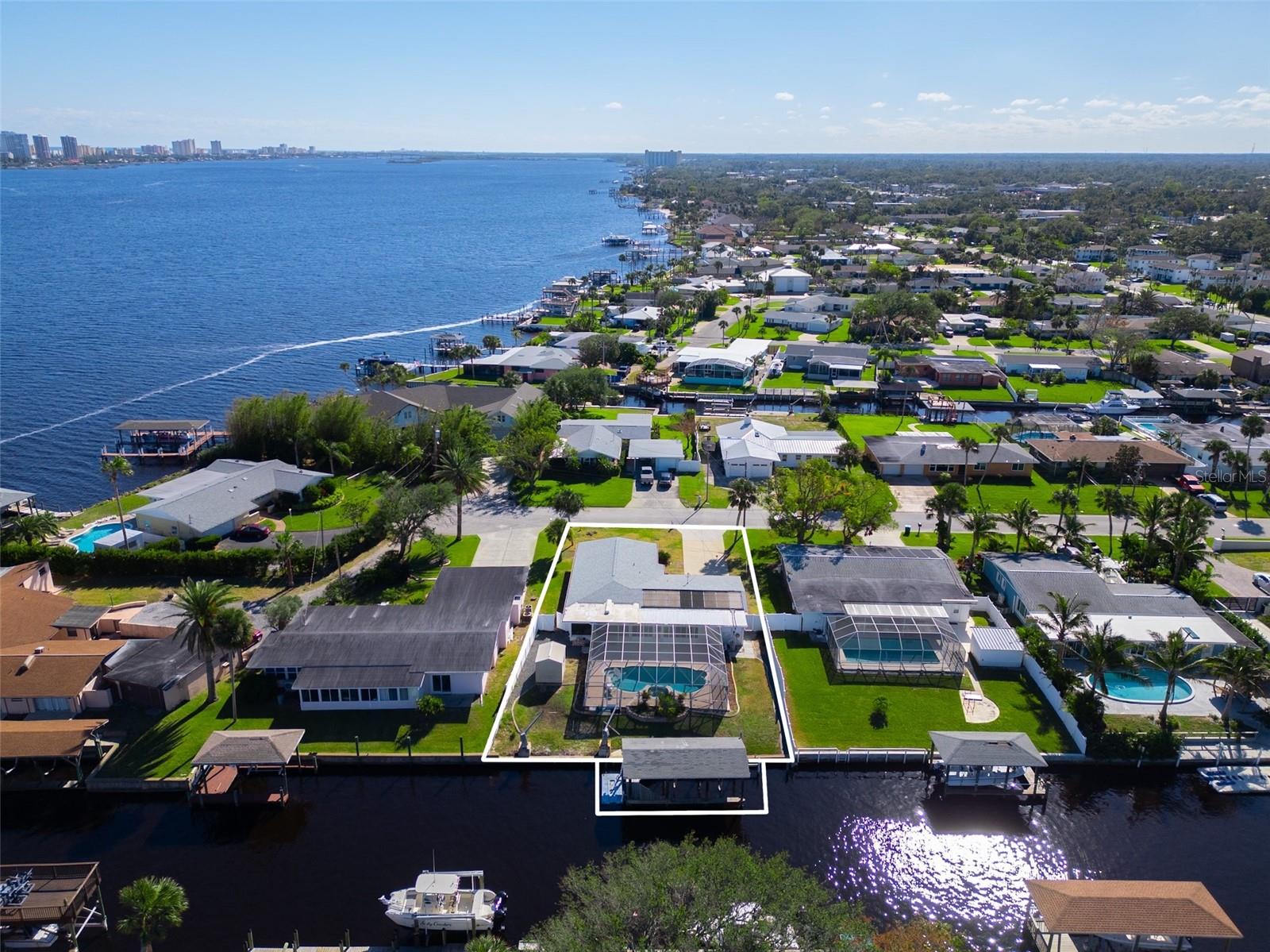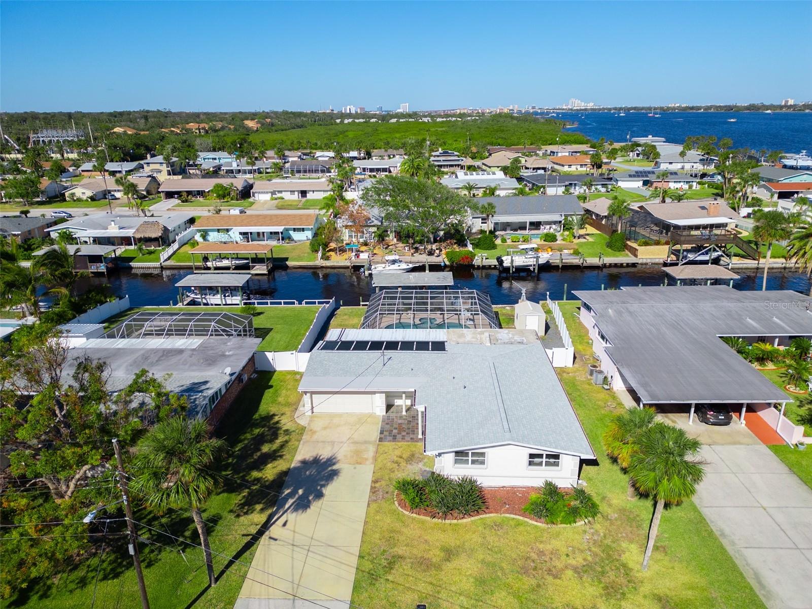 WATERFRONT! Improved Beautiful Canal Front Home! Bring your boat, jet skis and have them docked just steps out of your back door. This home is located on a wide and deep saltwater canal that leads directly out to the Intracoastal waterway and out to the Atlantic Ocean in minutes. Relax on your screened in lanai with a solar heated pool and integrated hot tub or on the 30' boathouse and take in breathtaking sunrises and frequent manatee visits, great fishing and gentle ocean breezes. This home sits high and stays dry and has been beautifully updated with new LVP flooring, a new primary bathroom, roof from 2021 and AC 2019. Featuring 3 bedrooms & 2 full bathrooms PLUS a FLEX room with 9' windows. The open kitchen is centrally located and provides ample storage with pull out drawers and a mixer pull out to cater to all your cooking needs. This home also offers the safety of hurricane shutters and convenience of extra storage located in Florida room and the back 8x10 shed. Don't miss the chance to enjoy waterfront living. All information is deemed to be correct however should be verified by representative and buyer.