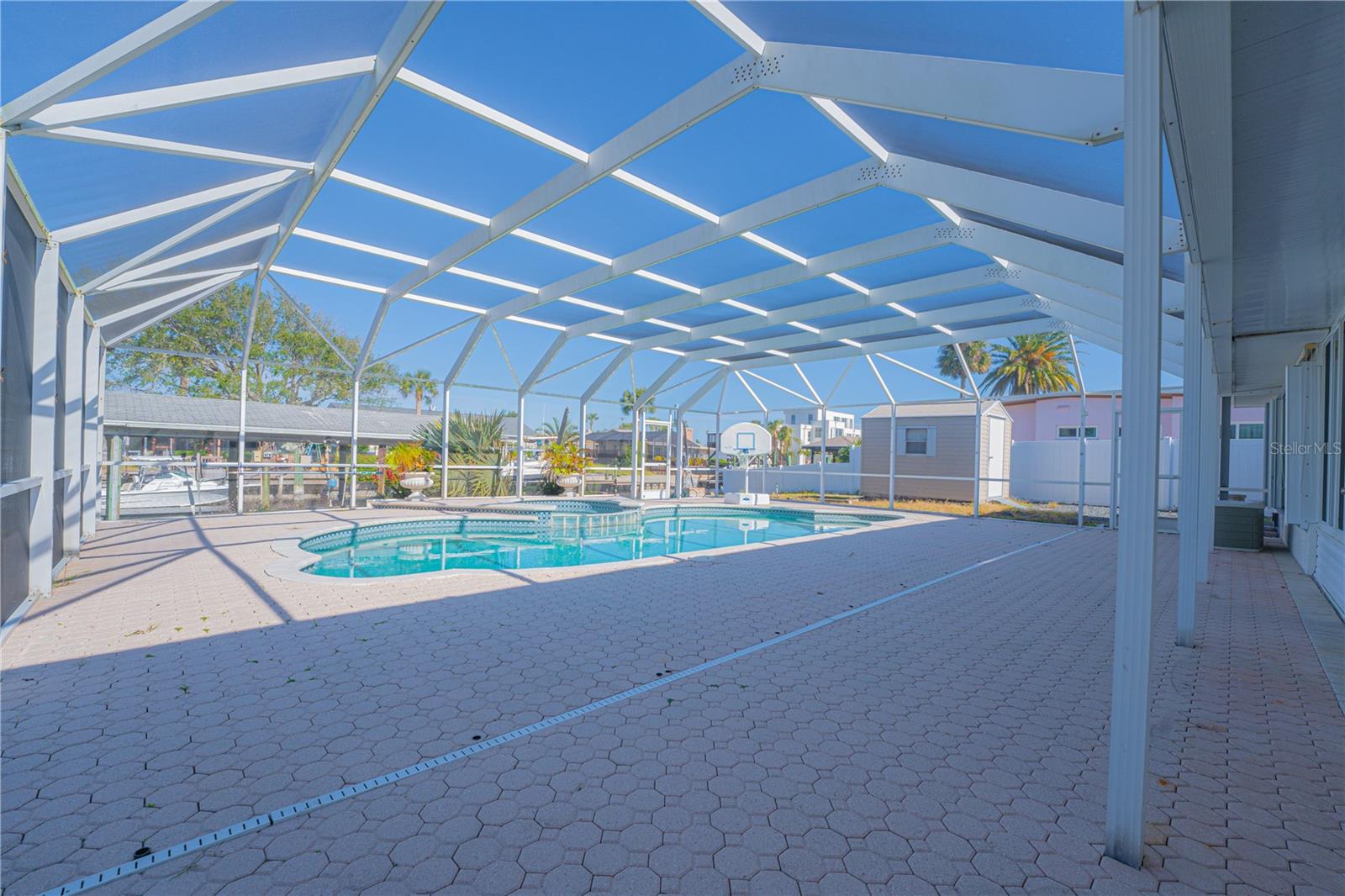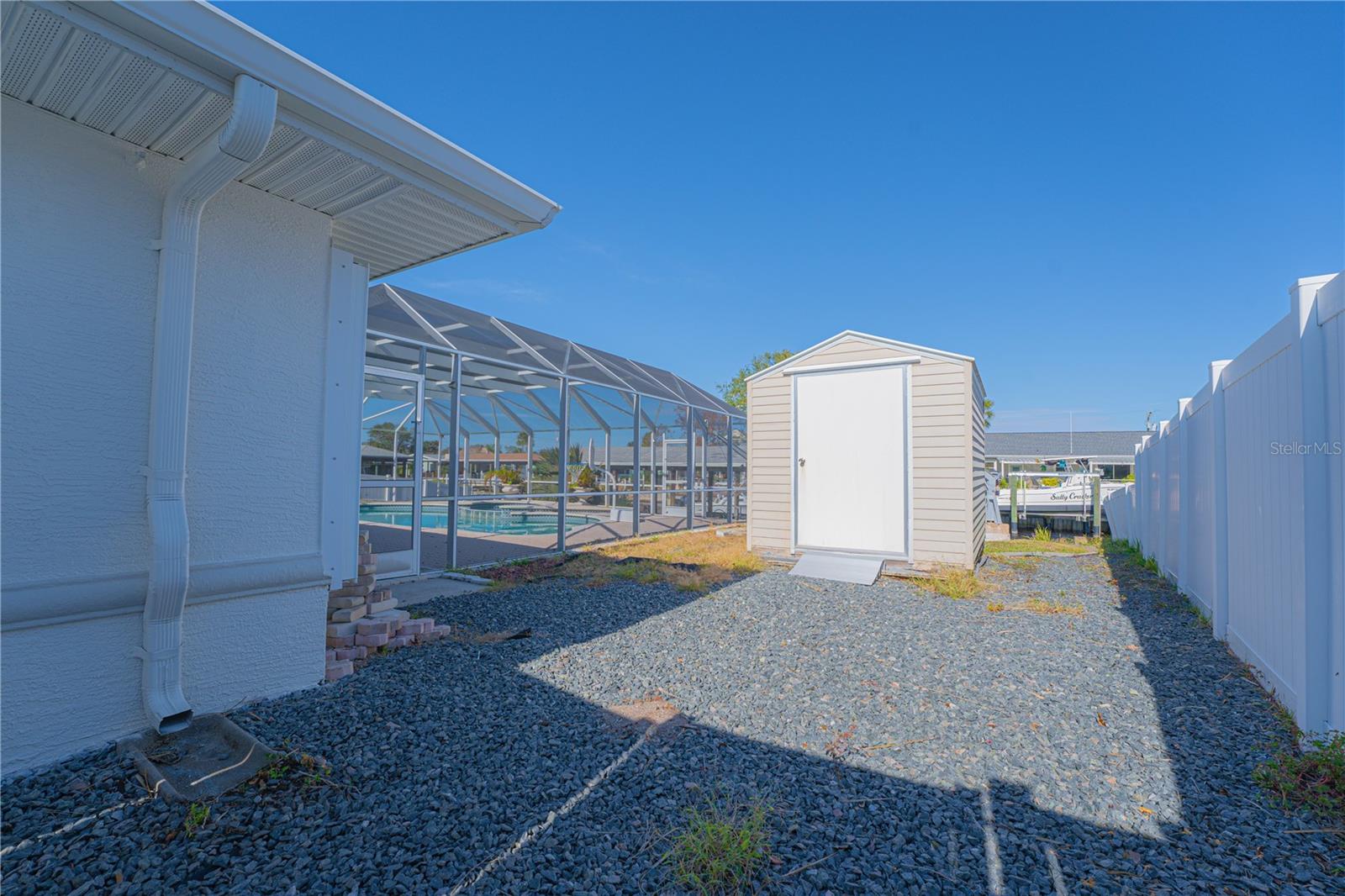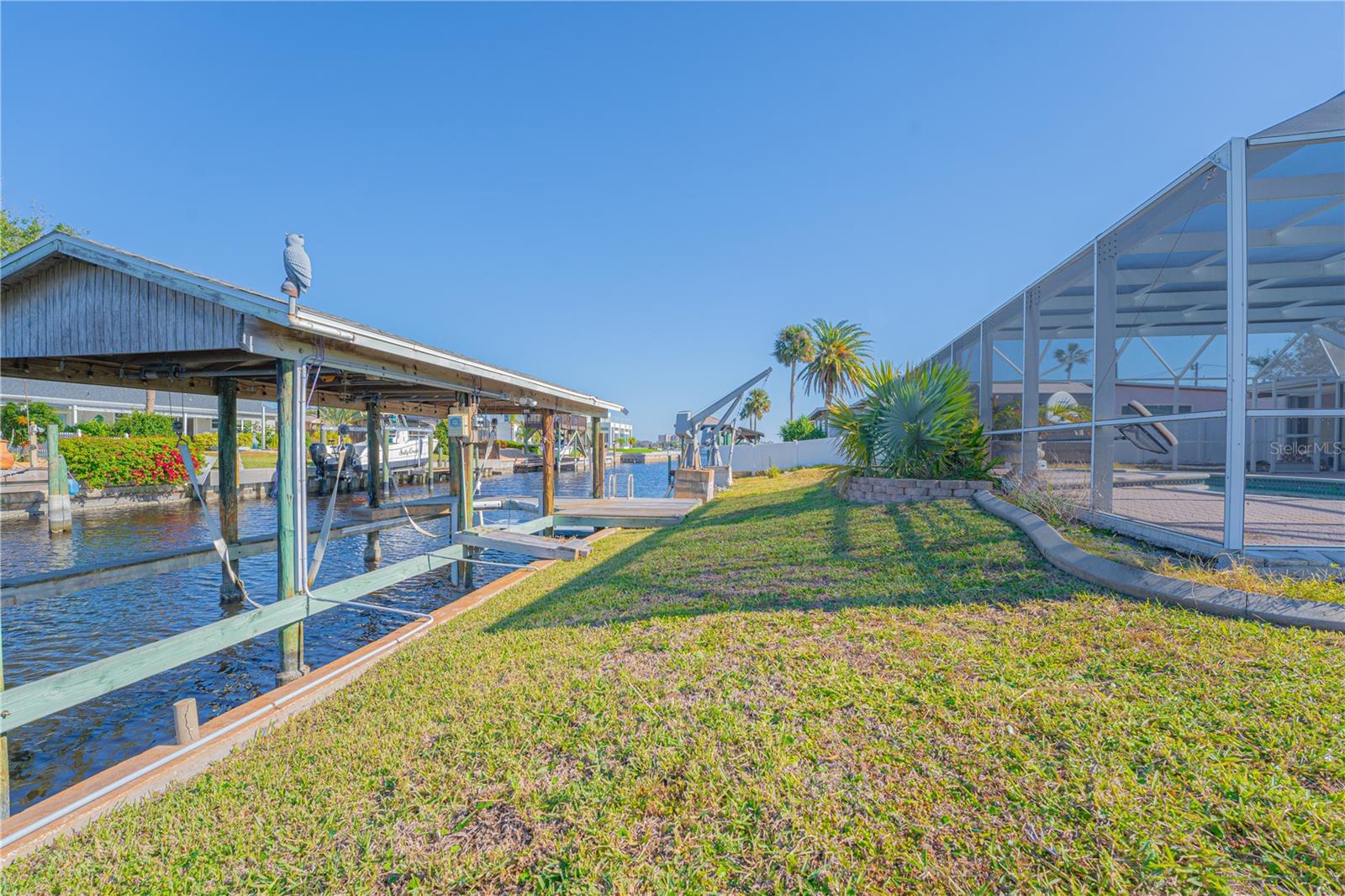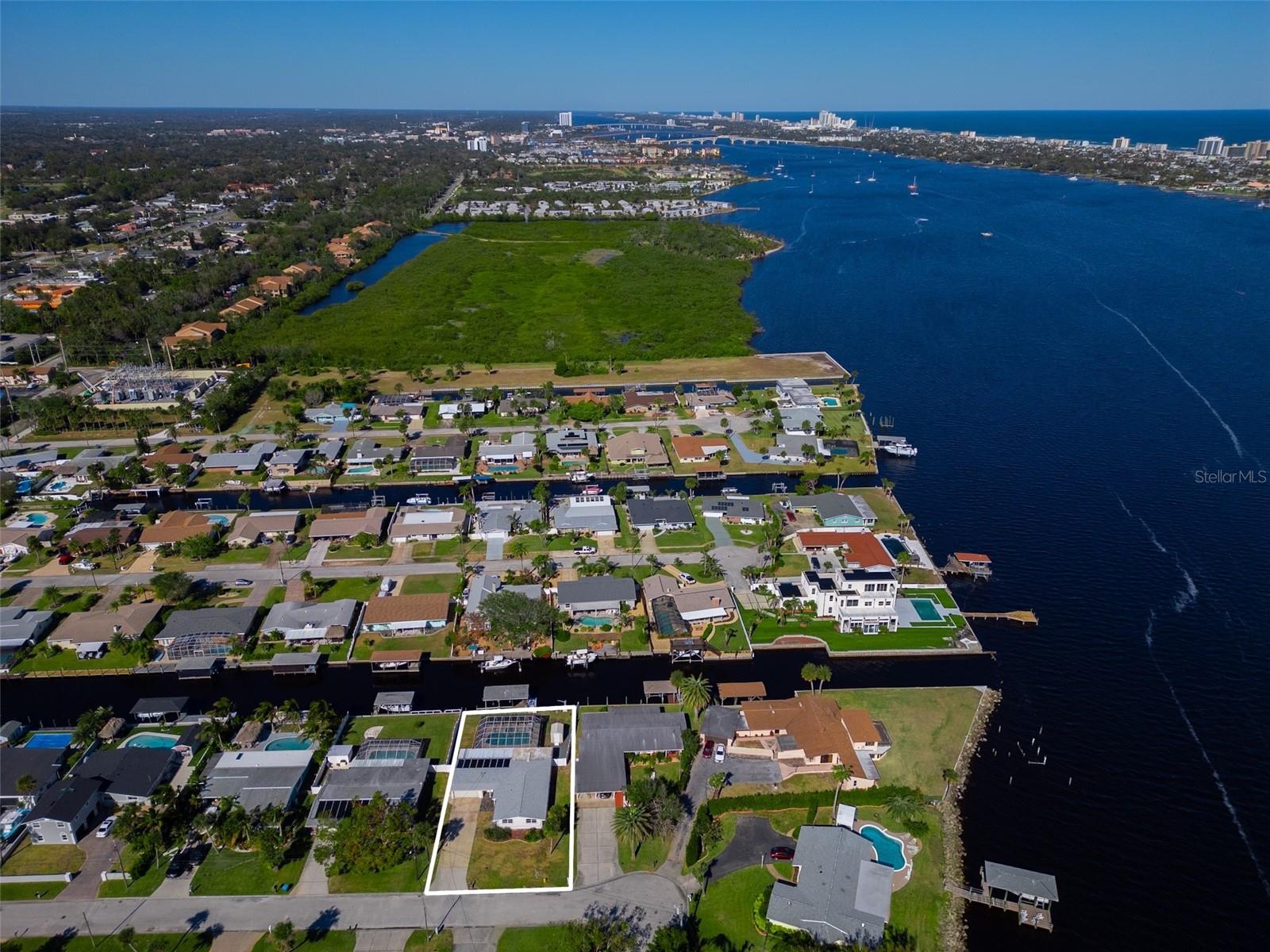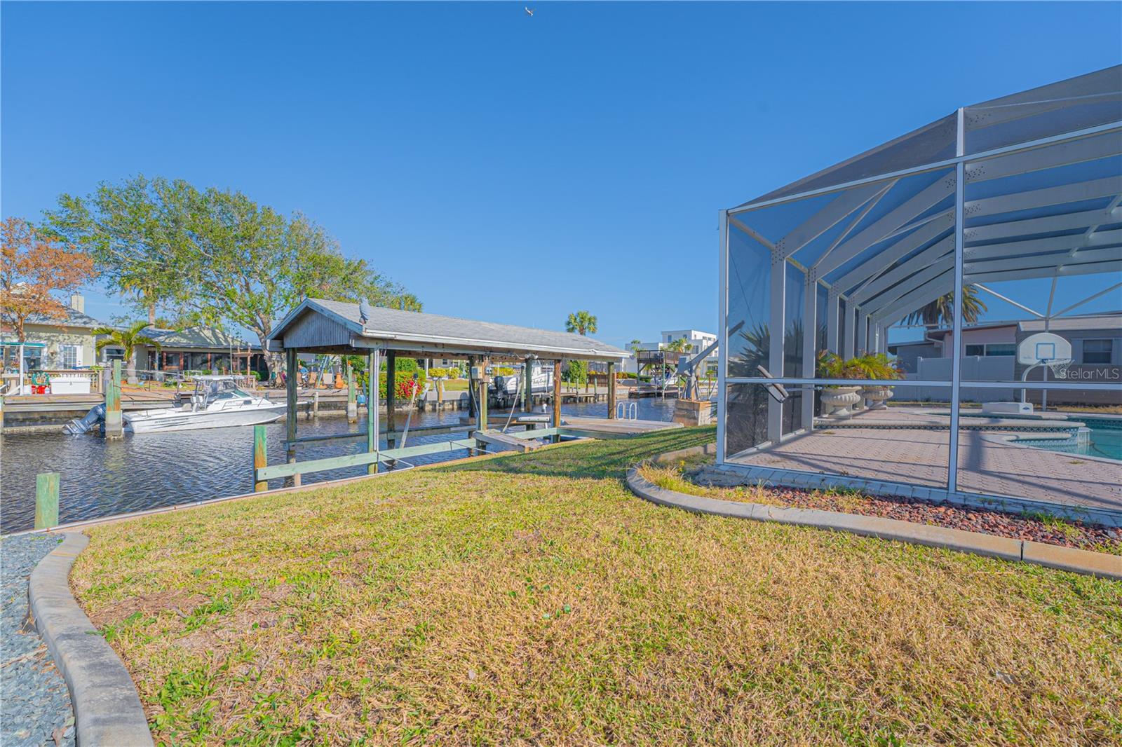 WATERFRONT! Improved Beautiful Canal Front Home! Bring your boat, jet skis and have them docked just steps out of your back door. This home is located on a wide and deep saltwater canal that leads directly out to the Intracoastal waterway and out to the Atlantic Ocean in minutes. Relax on your screened in lanai with a solar heated pool and integrated hot tub or on the 30' boathouse and take in breathtaking sunrises and frequent manatee visits, great fishing and gentle ocean breezes. This home sits high and stays dry and has been beautifully updated with new LVP flooring, a new primary bathroom, roof from 2021 and AC 2019. Featuring 3 bedrooms & 2 full bathrooms PLUS a FLEX room with 9' windows. The open kitchen is centrally located and provides ample storage with pull out drawers and a mixer pull out to cater to all your cooking needs. This home also offers the safety of hurricane shutters and convenience of extra storage located in Florida room and the back 8x10 shed. Don't miss the chance to enjoy waterfront living. All information is deemed to be correct however should be verified by representative and buyer.