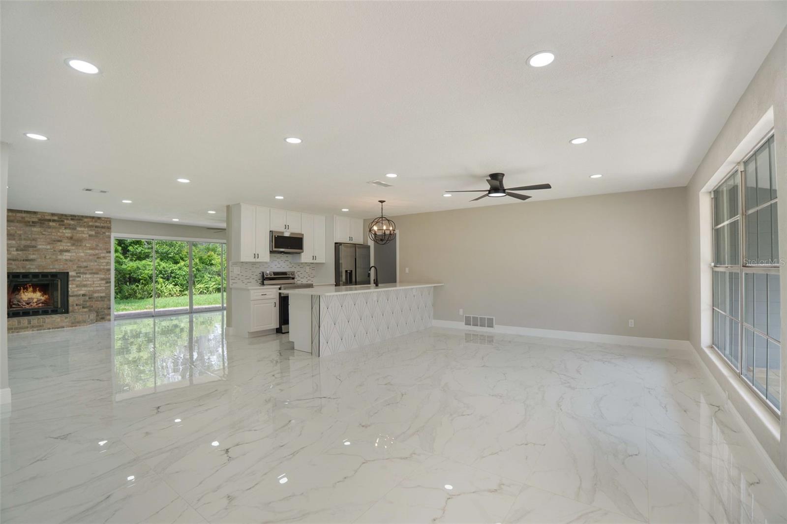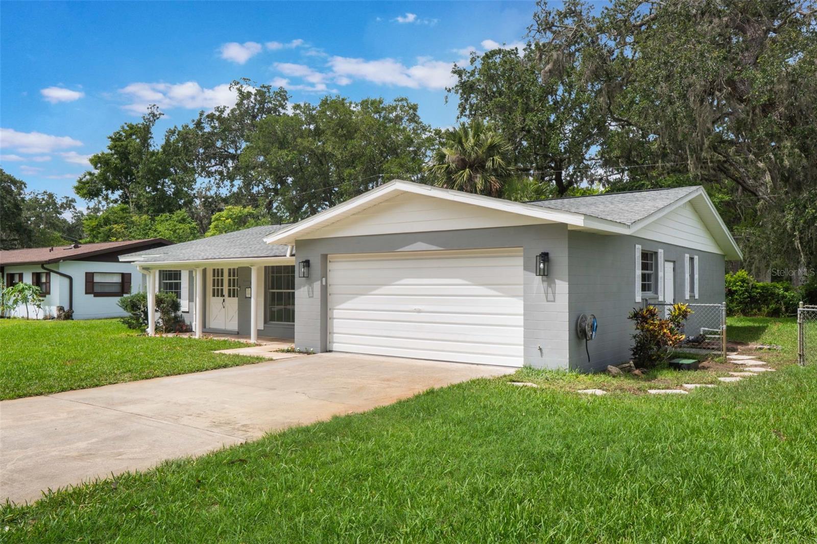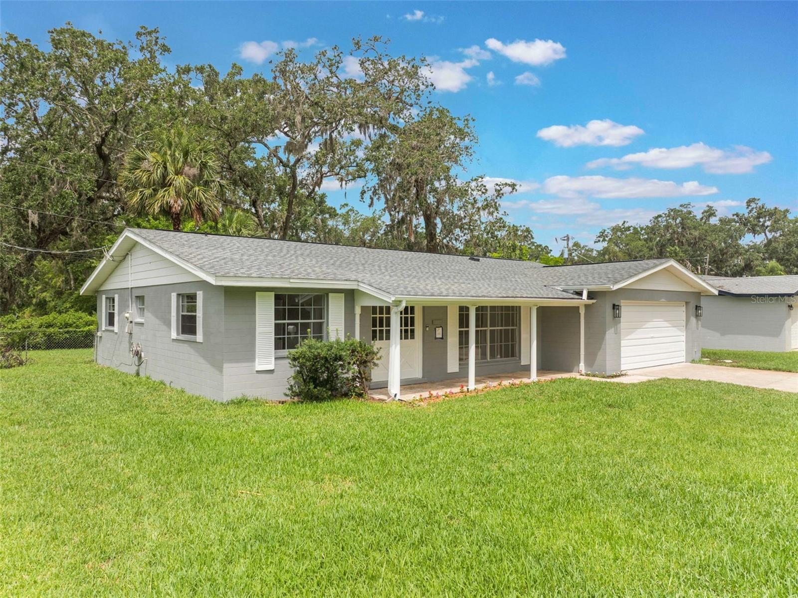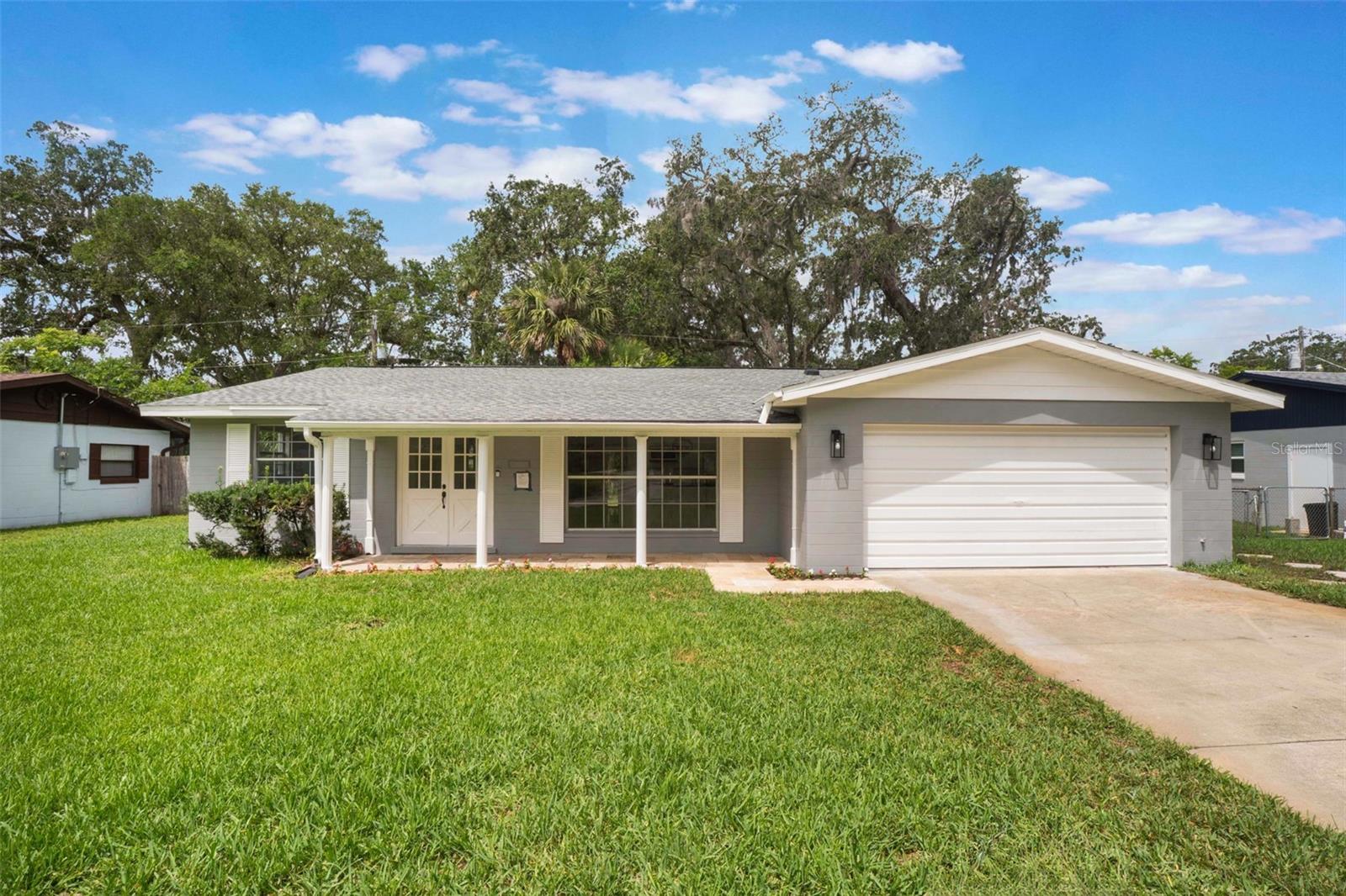 One or more photo(s) has been virtually staged. Welcome to this beautifully remodeled 3-bedroom, 2-bath home in the heart of South Daytona, offering the perfect blend of style, comfort, and functionality. Step inside and be greeted by an open-concept living space featuring stunning porcelain tile floors throughout, recessed lighting, and a cozy brick fireplace that creates the perfect ambiance. The modern kitchen is a showstopper, boasting crisp white cabinetry, quartz countertops, sleek black fixtures, and a designer tile backsplash. The oversized island with geometric detail is perfect for entertaining or enjoying casual meals. Natural light floods the space through large windows, while the fresh neutral palette provides a clean, contemporary feel. Outside, the home sits on a spacious lot with mature trees and a charming front porch—ideal for relaxing with your morning coffee. Additional features include a new roof, updated lighting, and a 2-car garage. Conveniently located near local schools, parks, shopping, and dining, this move-in-ready gem won’t last long. Schedule your private tour today!