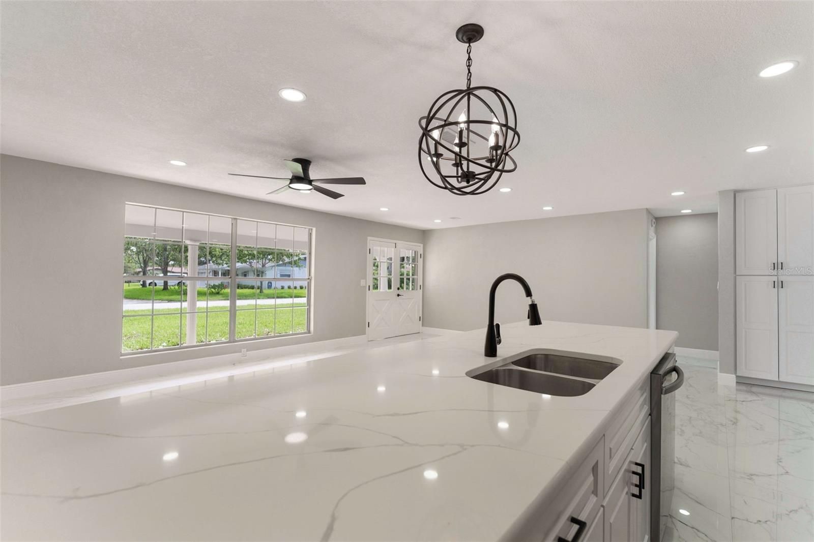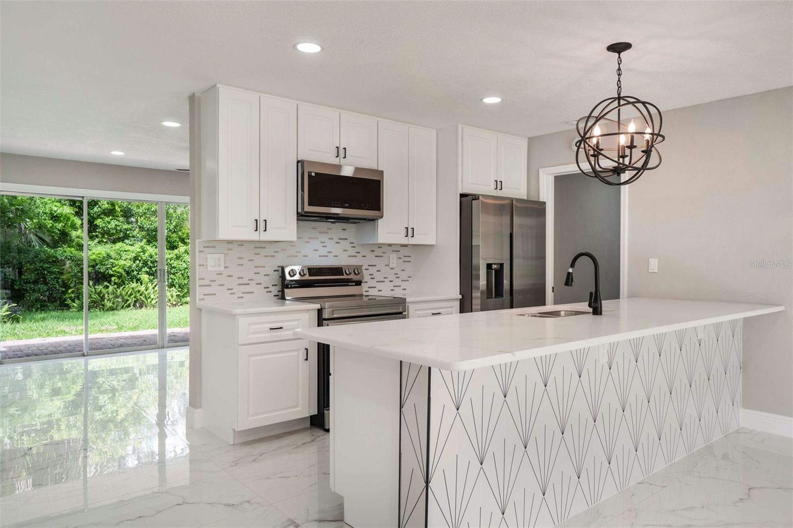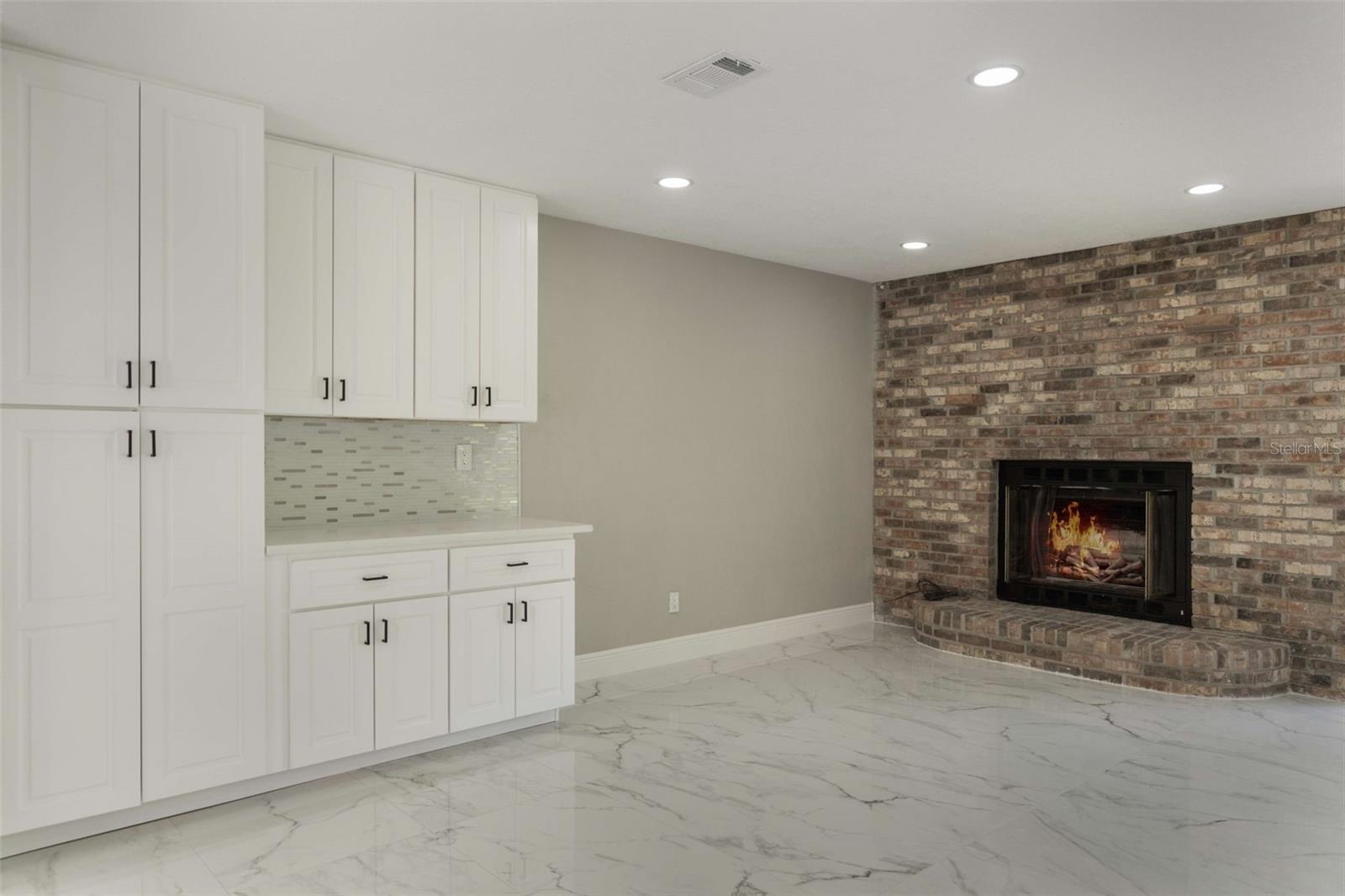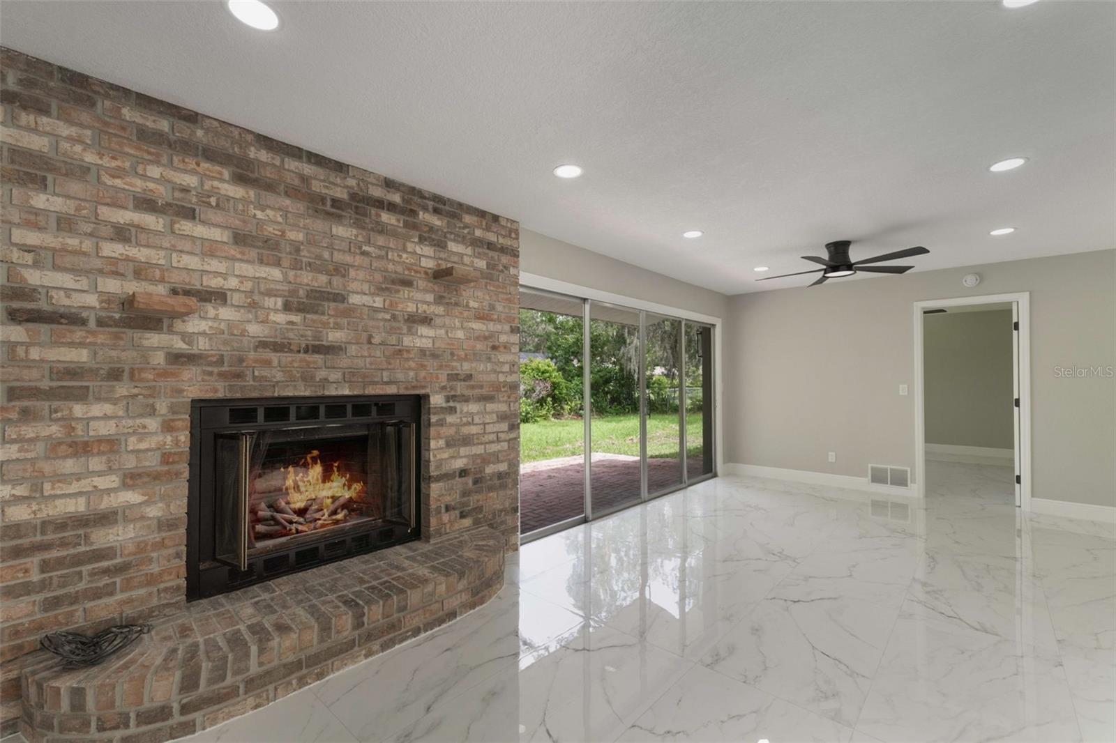 One or more photo(s) has been virtually staged. Welcome to this beautifully remodeled 3-bedroom, 2-bath home in the heart of South Daytona, offering the perfect blend of style, comfort, and functionality. Step inside and be greeted by an open-concept living space featuring stunning porcelain tile floors throughout, recessed lighting, and a cozy brick fireplace that creates the perfect ambiance. The modern kitchen is a showstopper, boasting crisp white cabinetry, quartz countertops, sleek black fixtures, and a designer tile backsplash. The oversized island with geometric detail is perfect for entertaining or enjoying casual meals. Natural light floods the space through large windows, while the fresh neutral palette provides a clean, contemporary feel. Outside, the home sits on a spacious lot with mature trees and a charming front porch—ideal for relaxing with your morning coffee. Additional features include a new roof, updated lighting, and a 2-car garage. Conveniently located near local schools, parks, shopping, and dining, this move-in-ready gem won’t last long. Schedule your private tour today!