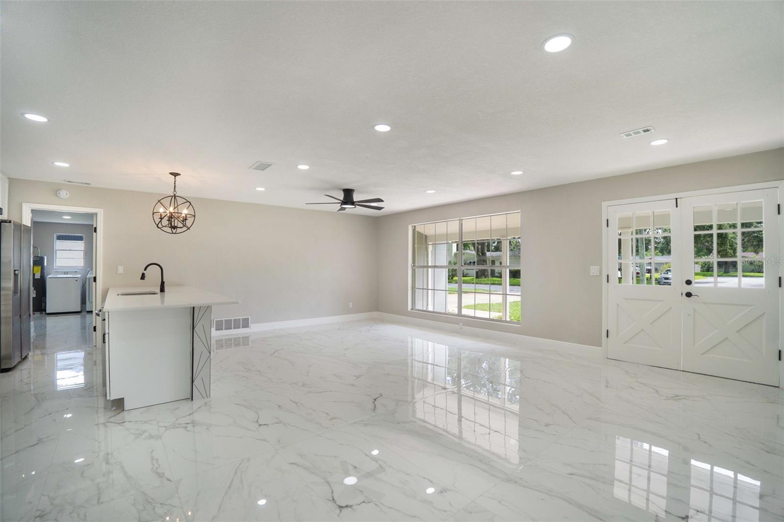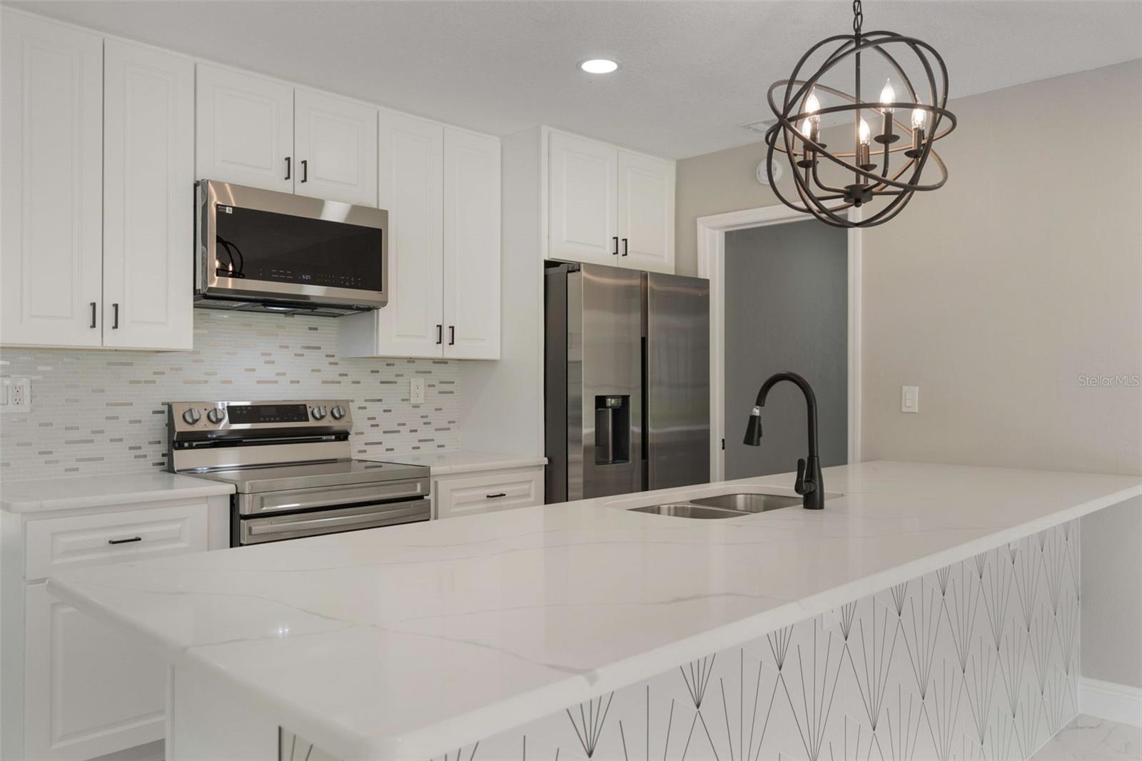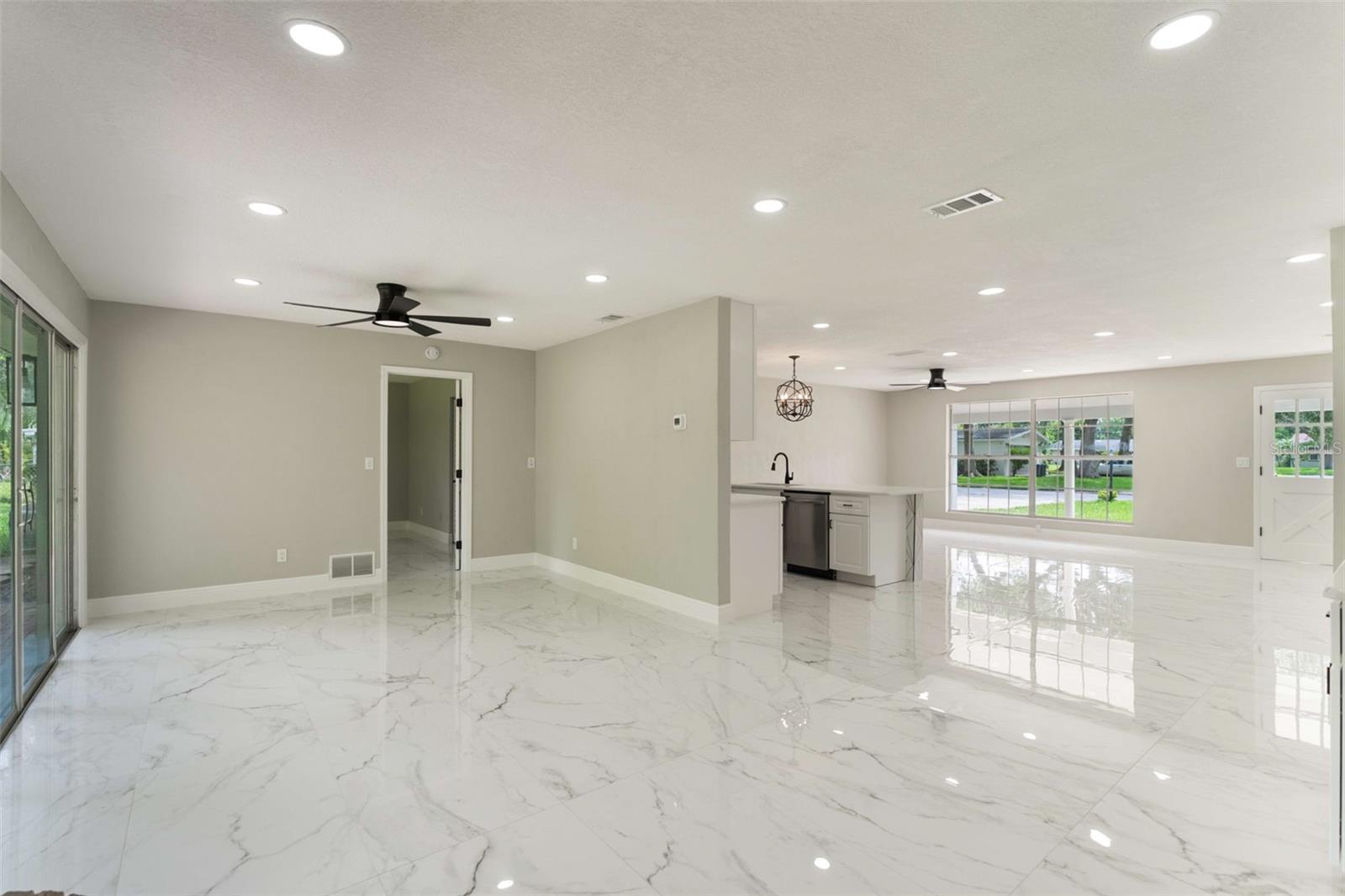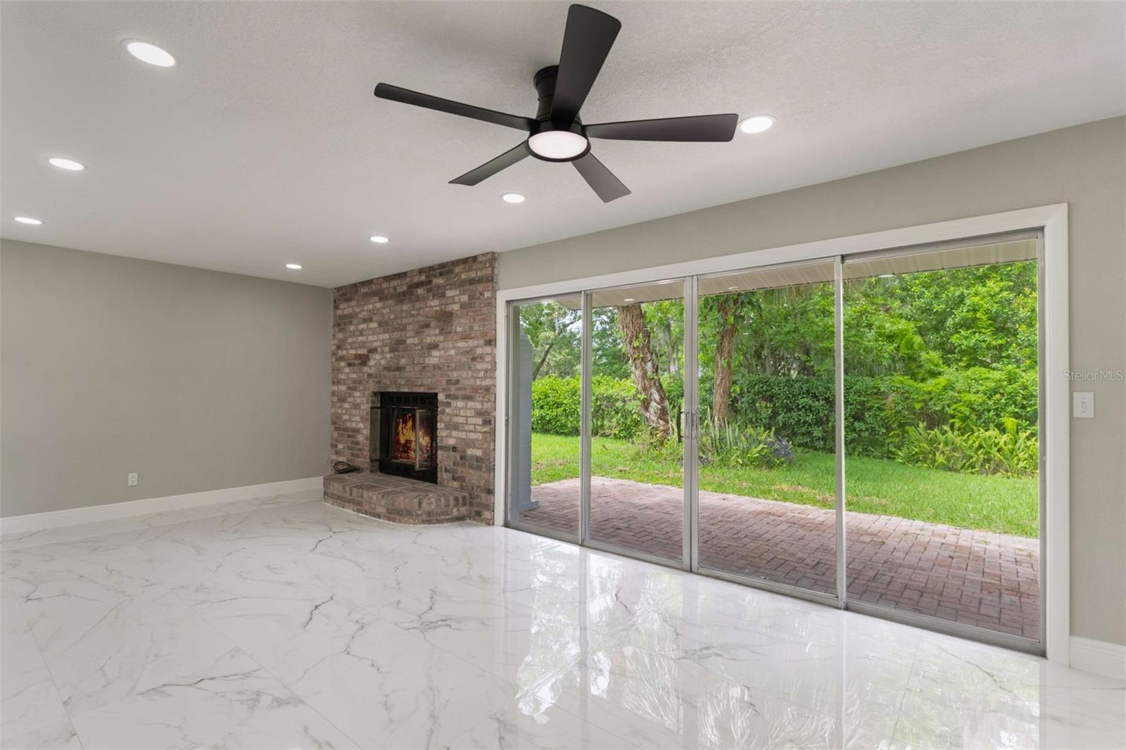 One or more photo(s) has been virtually staged. Welcome to this beautifully remodeled 3-bedroom, 2-bath home in the heart of South Daytona, offering the perfect blend of style, comfort, and functionality. Step inside and be greeted by an open-concept living space featuring stunning porcelain tile floors throughout, recessed lighting, and a cozy brick fireplace that creates the perfect ambiance. The modern kitchen is a showstopper, boasting crisp white cabinetry, quartz countertops, sleek black fixtures, and a designer tile backsplash. The oversized island with geometric detail is perfect for entertaining or enjoying casual meals. Natural light floods the space through large windows, while the fresh neutral palette provides a clean, contemporary feel. Outside, the home sits on a spacious lot with mature trees and a charming front porch—ideal for relaxing with your morning coffee. Additional features include a new roof, updated lighting, and a 2-car garage. Conveniently located near local schools, parks, shopping, and dining, this move-in-ready gem won’t last long. Schedule your private tour today!