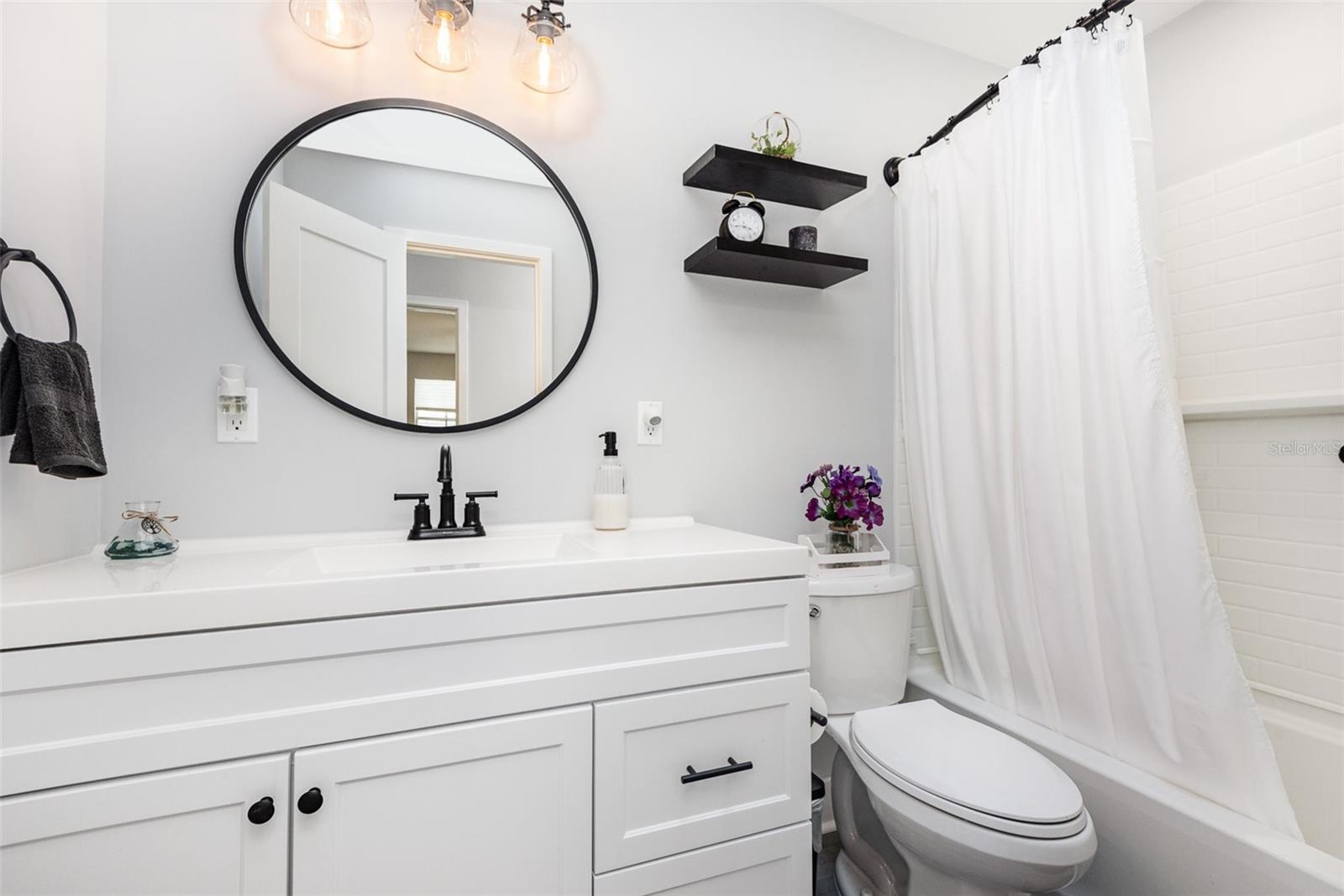One or more photo(s) has been virtually staged. This beautifully updated concrete block home offers the perfect blend of modern design, comfort & functionality. Featuring 3 spacious bedrooms, 2 full bathrooms and a 2-car garage, this home has been freshly painted inside & out with an inviting, open-concept layout ideal for entertaining. Totally remodeled in 2023 with new roof, new kitchen, new appliances (including washer/dryer), new bathrooms, new luxury vinyl flooring and ceiling fans., New A/C motor in 2024 and hot water heater in 2020. A welcoming screened front porch with matte epoxy flooring—rescreened just two years ago—creates the perfect space to relax outdoors. Inside, luxury vinyl plank flooring flows throughout the home, enhancing its cohesive/contemporary feel. At the heart of the home, the stunning kitchen is a true showstopper. A custom-designed movable island includes a removable center section and wraparound seating, offering flexibility & function. Elegant Quartz countertops are complemented by new GE Smart Appliances, all app-controlled for convenience. Additional kitchen features include a deep stainless-steel sink, soft-close drawers, a full pull-out pantry and built-in spice & cookie sheet storage. A dedicated coffee or appliance bar features upper cabinetry with beautiful seed glass also echoed in the display cabinet perfect for showcasing fine china. The open family room, currently used as a dining area, provides flexible living space, while the oversized kitchen easily accommodates informal dining. The generously sized, enclosed lanai features a newly refinished matte epoxy floor. Bedrooms are well-proportioned. The spacious primary suite includes a fully remodeled en-suite bath with a tiled walk-in shower, built-in quartz seat, and upgraded vanity with quartz countertop. The second bedroom currently serves as an office. The third bedroom is equally spacious. The fully remodeled guest bath features impressive high-end finishes. Additional features include a 2023 smart washer/dryer set located in the garage, utility splash tub & newly installed side-entry door. Throughout the home, smooth ceilings add to the modern aesthetic. The living room has two closets for additional storage. Gutter guards are installed on gutters to prevent leaf buildup and easy maintenance. Seller has professionally sealed the foundation adding important advantages with Florida’s humid climate, rainfall, and high-water tables. Benefits: to sealing the foundation: 1. Moisture Protection - Prevents water intrusion into the foundation, which can lead to mold, mildew, and rot. Reduces humidity levels in crawl spaces or basements, improving air quality. 2. Flood & Storm Resilience - Sealing adds a layer of protection against minor flooding or pooling water. 3. Pest Prevention - Helps block entry points for termites, ants, and rodents, which are common in Florida. 4. Structural Longevity - Protects concrete from erosion and weakening over time due to moisture infiltration. Helps prevent cracking, settling, or spalling, preserving structural integrity. 5. Energy Efficiency - By reducing air and moisture leaks, it can improve HVAC performance and lower cooling costs important in Florida's hot climate. 6. Property Value & Maintenance Savings -Demonstrates proactive home maintenance Plus - custom hurricane shutters!! This loved home is loaded with thoughtful upgrades and stylish finishes truly move-in ready. Come experience the quality and comfort this beautiful property has to offer!