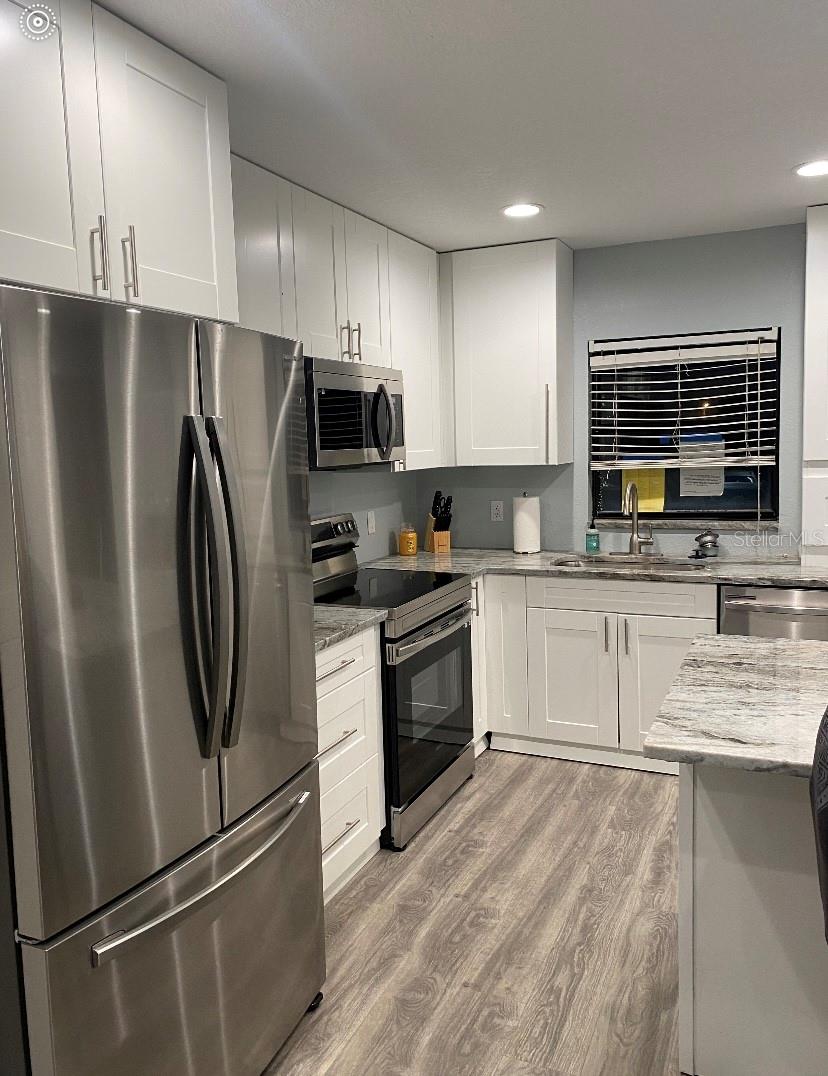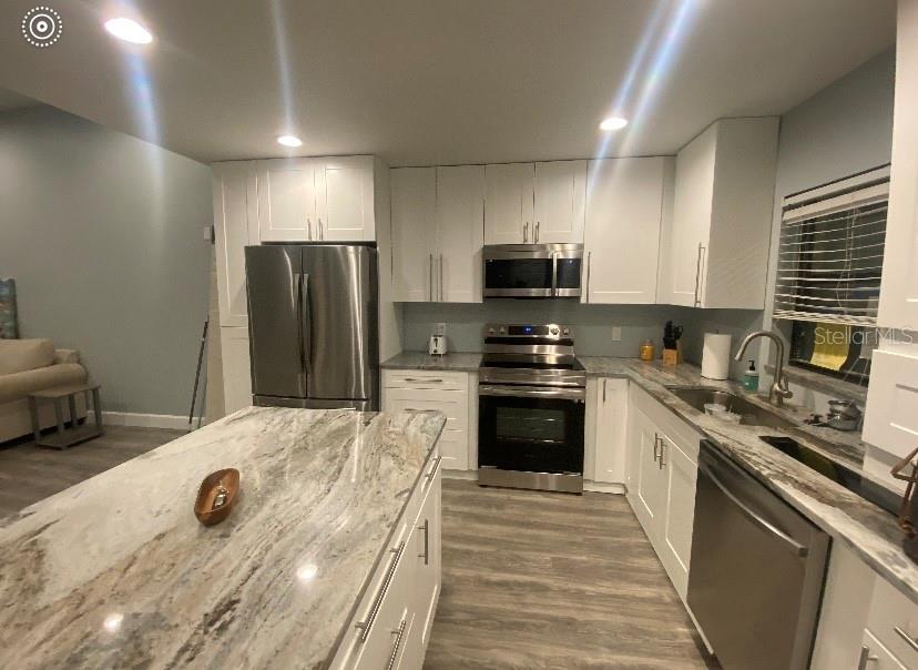 Location location! Welcome to 16 foot ceilings in your new waterfront condo! Completely renovated ground floor unit at 7050 Sunset Dr S 104, South Pasadena FL! This charming 1 bedroom, 1.5 bathroom condo offers an updated and open modern living space, within Chateau Towers condominium complex. Not 55+ unit!! As you enter the unit, you are greeted by a open, updated, bright and airy living room with gorgeous gray-toned waterproof flooring and 16’ ceilings that expand the living space feeling. This large living area is perfect for relaxing or entertaining guests. The new extra large sliding glass door lets in lots of natural sunlight. The extra large marble island in the brand-new kitchen serves as a gathering area between the living and eating areas, creating a spacious feeling throughout the home. The modern kitchen is equipped with matching Stainless Samsung appliances (with warranty), ample custom kitchen cabinetry with extra large floor to ceiling storage pantry and corner lazy Susan storage. The custom washer and dryer utility closet adds convenience to everyday tasks by having W/D in the unit. The large bedroom is a peaceful retreat with a raised tray ceiling and a generous custom closet organization system, complete with drawers, shelving and plenty of hanging space. The large bedroom windows let in plenty of natural light. Both the renovated bathrooms include new cabinet vanities and granite countertop and the master ensuite features a tile floor-to-ceiling walk-in shower, a clear glass door, and a clean, contemporary design. Custom Washer/dryer closet within unit provide convenience. New electrical Hurricane shutter for ease of safety during hurricane season. This condo also includes a private poolside patio where you can enjoy your morning coffee or unwind after a long day, overlooking Boca Ciega Bay. The community offers amenities such as a swimming pool, hot tub, fitness center that overlooks pool, sauna, steam room, billiard/game room, and clubhouse for residents to enjoy. Located in South Pasadena, this property is just a short drive away from the beautiful beaches of St. Pete Beach and Treasure Island. You'll have easy access to shopping, dining, hospitals, and entertainment options in the area. The vibrant downtown St. Petersburg is also nearby, offering a variety of cultural attractions. Reserved parking close to unit. The bike rack and canoe/kayak rack are a bonus. Interior Community mailbox area with community area (with utilities) for larger gatherings.