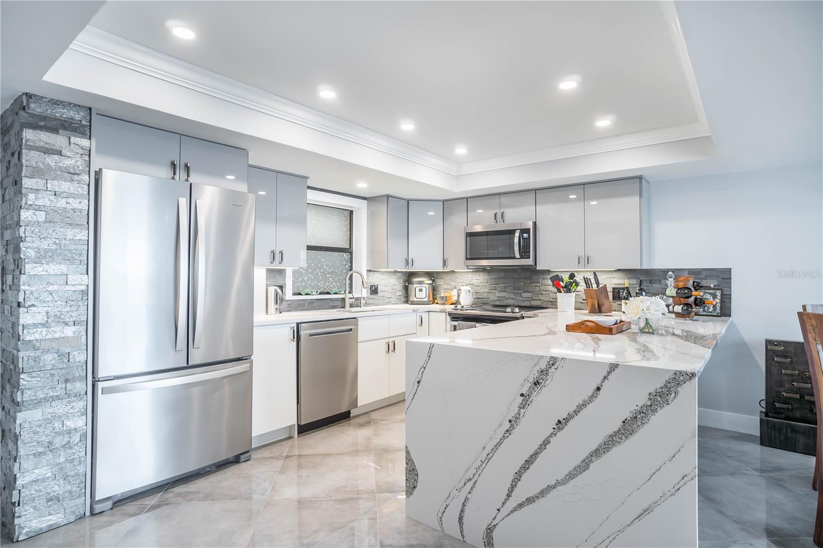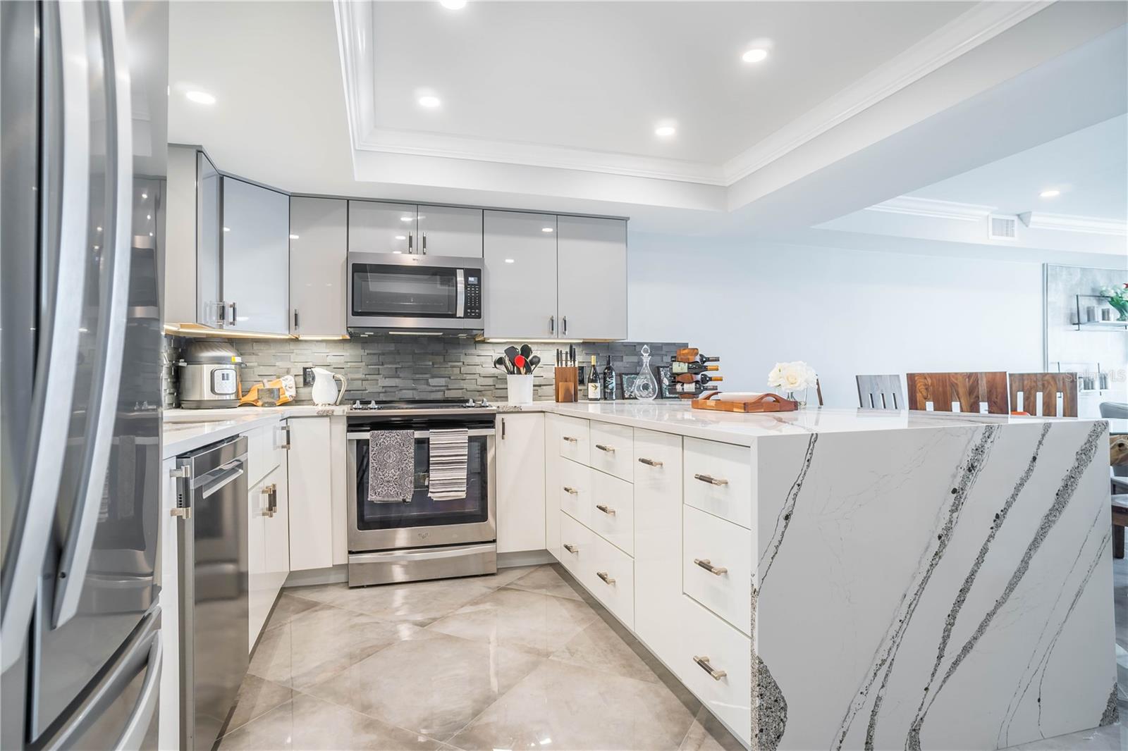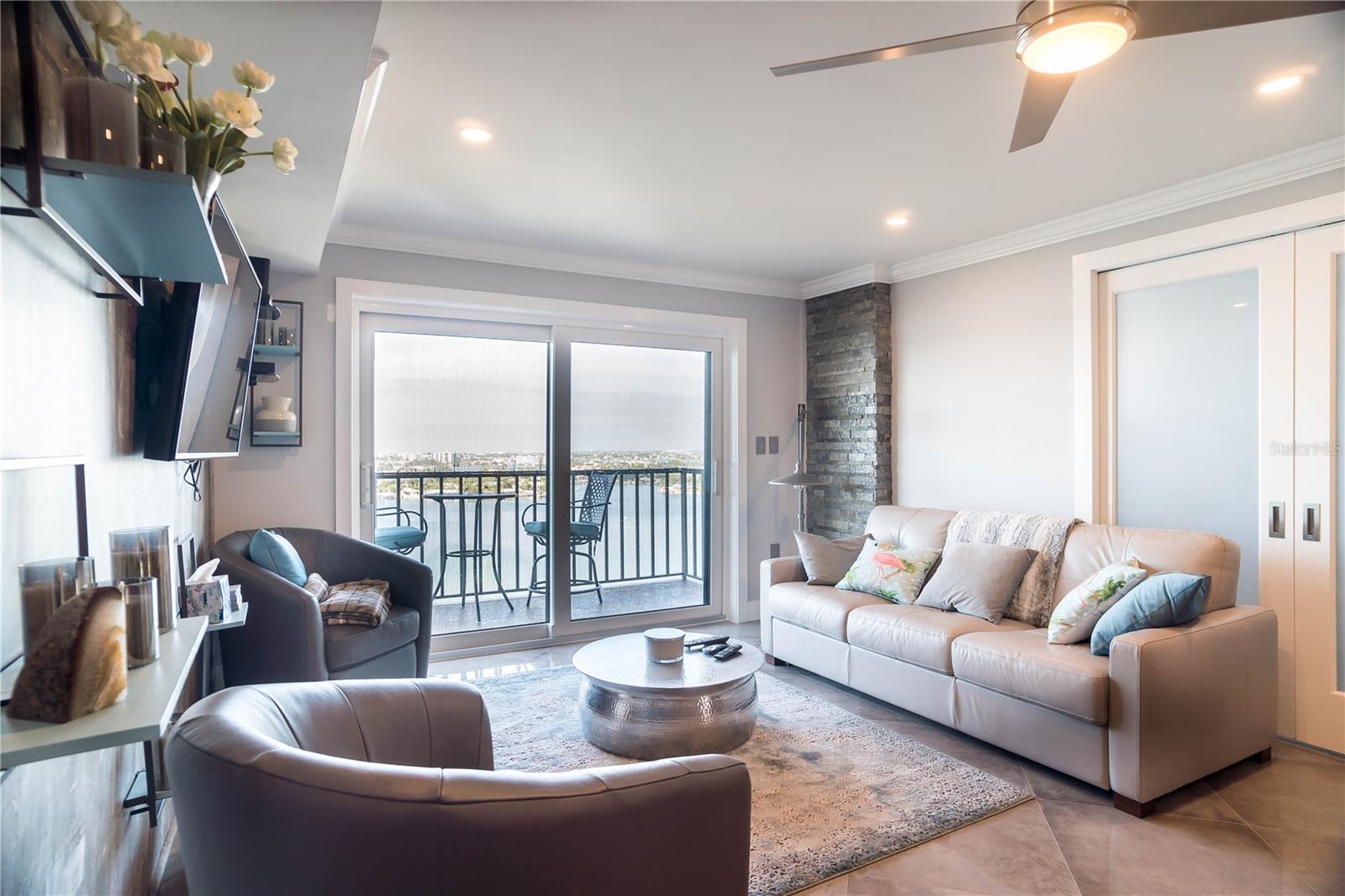 TURN KEY with high-end décor and furniture INCLUDED! LOW condo fees, STRONG Reserves, and NO Assessments! Step into the pinnacle of luxury with this exquisite penthouse condo, where unparalleled west-facing views of the Gulf await. Positioned on the top floor, this gem has undergone a comprehensive transformation, achieving a standard of luxury and sophistication that is truly rare. With every inch meticulously renovated, this home showcases the finest quality finishes and craftsmanship, promising a living experience that is as breathtaking as its views. The journey begins with striking, oversized diagonal porcelain tile flooring that sets the stage for an interior brimming with elegance and light. The heart of this home, a chef’s kitchen, boasts all-new, top-of-the-line stainless steel appliances and dazzling quartz countertops, complete with a waterfall edge. The addition of high gloss, soft-close custom cabinetry and a stylish backsplash elevates the space further. Designed with an open floor plan, the kitchen flows seamlessly into the living area, ensuring that the captivating Gulf views are always within sight. Not a detail has been overlooked in enhancing both the beauty and functionality of this penthouse. From upgraded plumbing and modern bathrooms to a tankless hot water heater and meticulously selected fixtures, every element has been chosen with the utmost care. Privacy and luxury converge in the master suite, accessible through custom pocket French doors. Here, Gulf views offer a tranquil backdrop to every moment, complemented by his and hers custom closets and an integrated office space, ensuring comfort and convenience. This penthouse's strategic location offers expedient access to the finest beaches, from Treasure Island to St. Pete Beach, and is merely a short drive from the dynamic offerings of Downtown St. Pete, Clearwater, Indian Rocks Beach, and Ft. DeSoto. With the added benefit of covered parking and the option for negotiated furnishings, this opportunity is truly unparalleled.