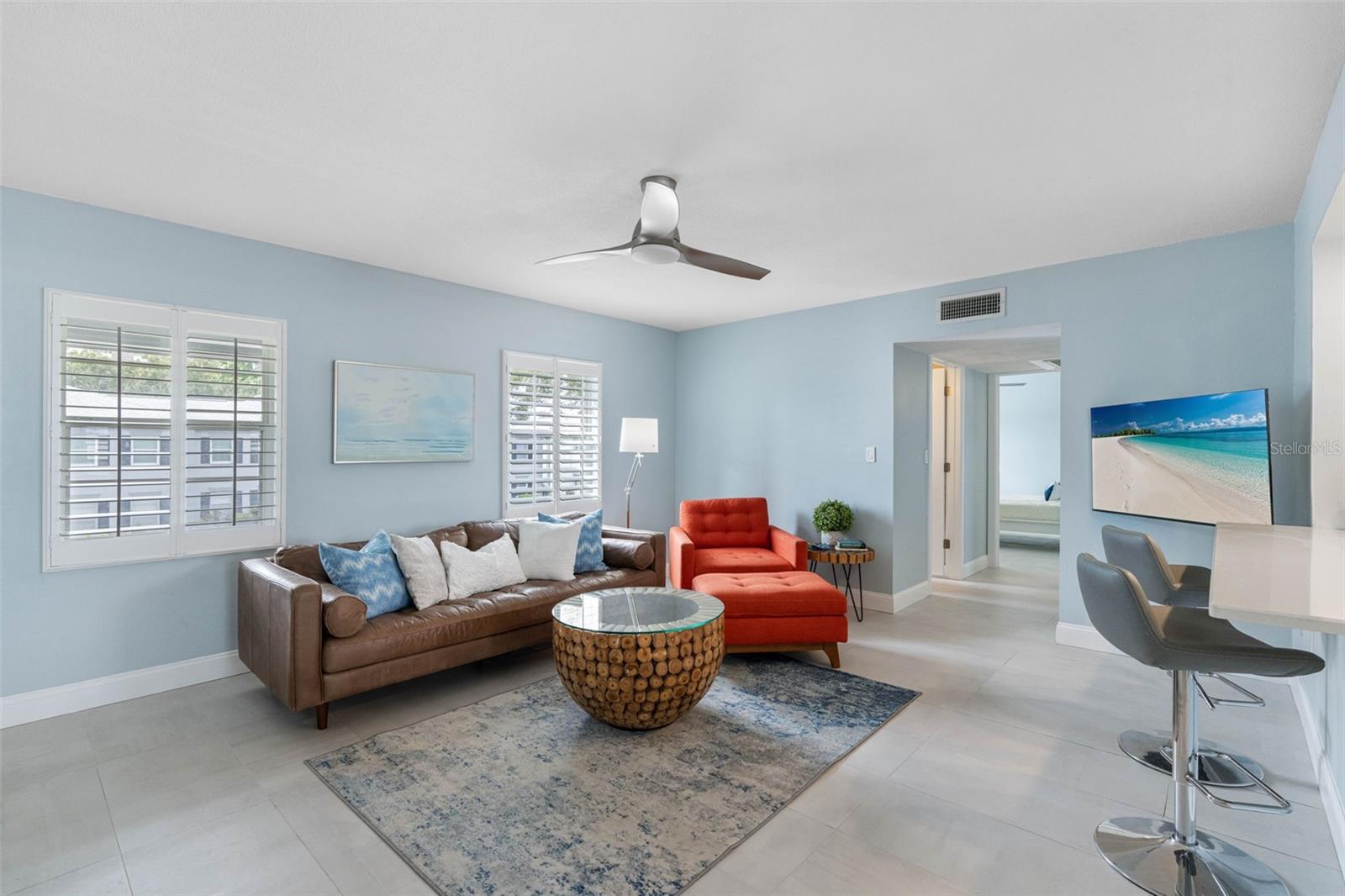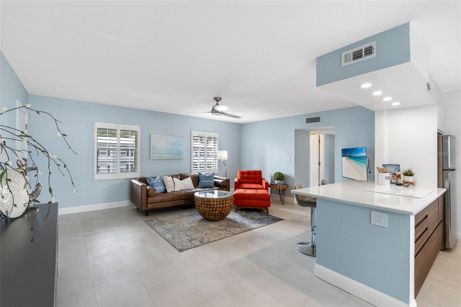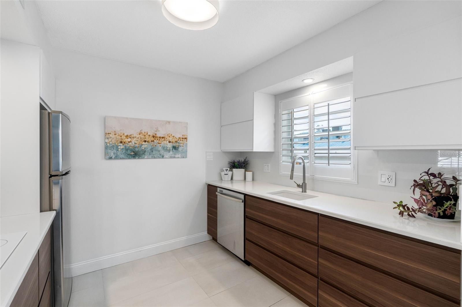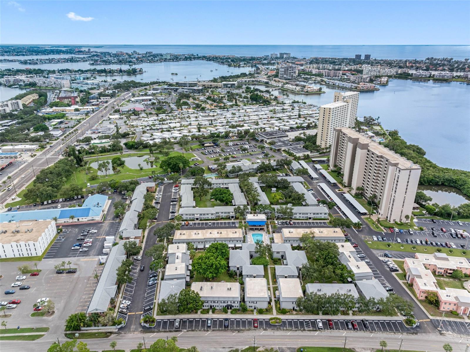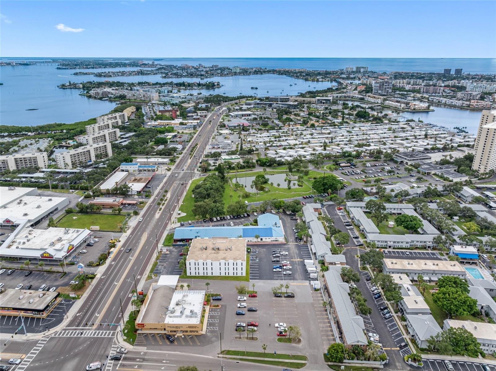 **HOME DID NOT HAVE HURRICANE DAMAGE** Welcome to your beautifully updated modern condo ideally situated near stunning sugary sandy beaches and a short drive to vibrant downtown St. Pete! This chic 2-bedroom, 2-bath home features a thoughtfully designed open floor plan with large-format tile flooring and coastal-inspired paint throughout. Enter the home into the spacious and inviting living room through either the front or back door. The room, painted in a soft, light blue, enhances its open and airy feel, complemented by high ceilings with a modern ceiling fan. Adjacent to the living area, a sleek and modern kitchen with bar seating allows for easy conversation and interaction between spaces. The kitchen showcases rich, Italian walnut-toned lower cabinetry and white upper cabinets that provide ample storage while adding a warm contrast to the crisp walls and quartz countertops. A large, single-basin sink situated beneath a wide window allows natural light to brighten the space, enhancing the clean and uncluttered feel. The kitchen is also equipped with stainless steel appliances. The charming dining area offers a fresh, coastal vibe highlighted by a striking glass pendant light overhead. Large windows throughout, equipped with white plantation shutters, frame views of lush greenery and palms, enhancing the home’s airy and bright ambiance. The primary bedroom beautifully combines serenity and modern elegance, making it a perfect retreat. The walk-in closet features built-ins, and a tankless water heater saves space and ensures you never run out of hot water. The updated ensuite bathroom presents a clean and modern design, highlighted by a soothing neutral palette. It features large, light gray tiles that cover the walls, complementing the white fixtures and cabinetry. The sleek vanity offers ample storage with a flat-panel design, topped with a white countertop and modern fixtures, and custom practical additions like the wooden shelving built-in provide extra space for towels or decor, enhancing the bathroom’s utility and style. The second bedroom features a large built-in closet, TV, and tile flooring. This updated guest bathroom showcases travertine tiles on the walls and floor, a white vanity, sleek white countertop, and contemporary lighting. The HVAC was replaced in 2024. The building has a new roof and is conveniently located, allowing an easy walk to Publix, Wal-Mart, CVS, and many more stores, restaurants, houses of worship, public transportation, hospitals, and the beautiful Galatea Park. Nearby Duryea Bay View Park offers gorgeous waterfront views of Boca Ciega Bay, walking paths, public tennis courts, and a local playground. The community features a heated pool, putting greens, shuffleboard, a clubhouse with pool tables, and is just a short walk to the intercoastal. St Pete Beach is only minutes away. Assigned parking spot steps from the front door. Call for a showing today!