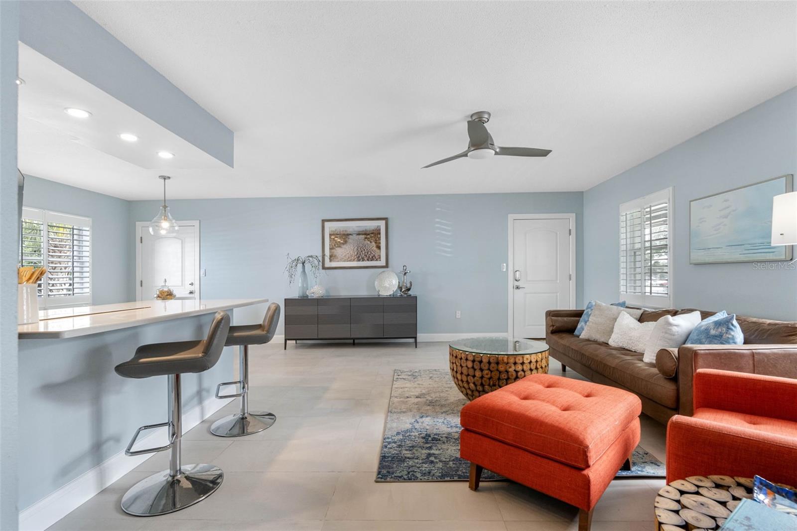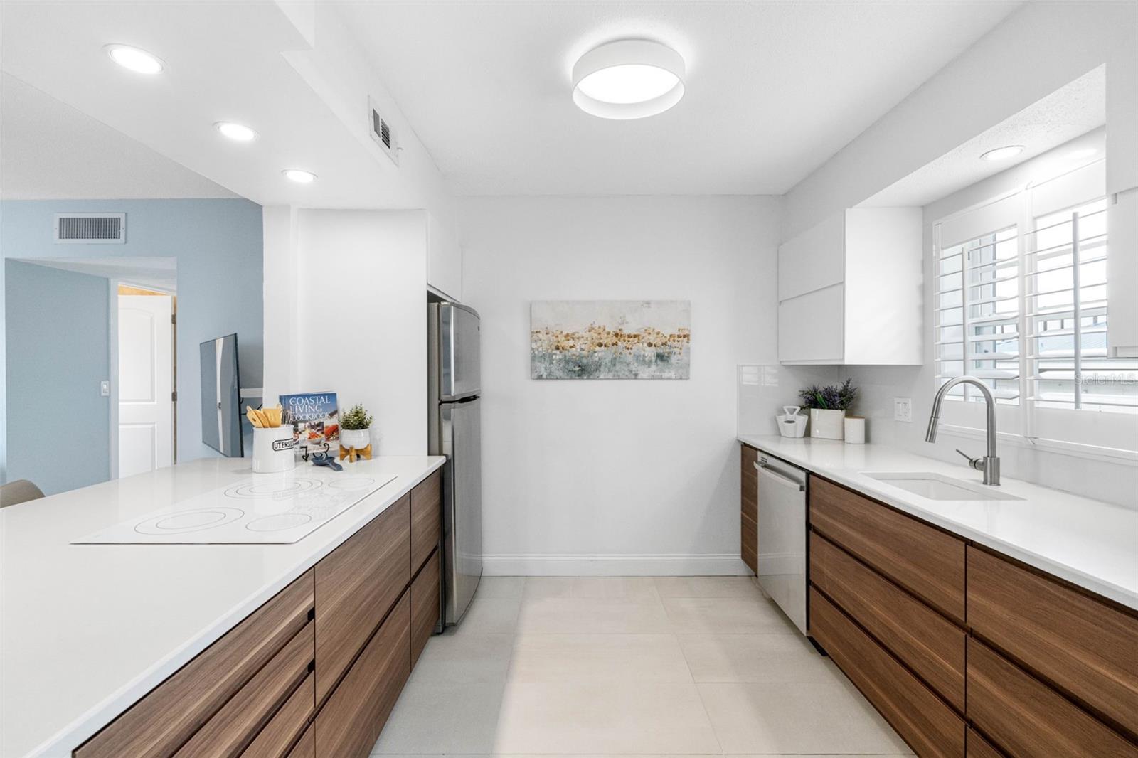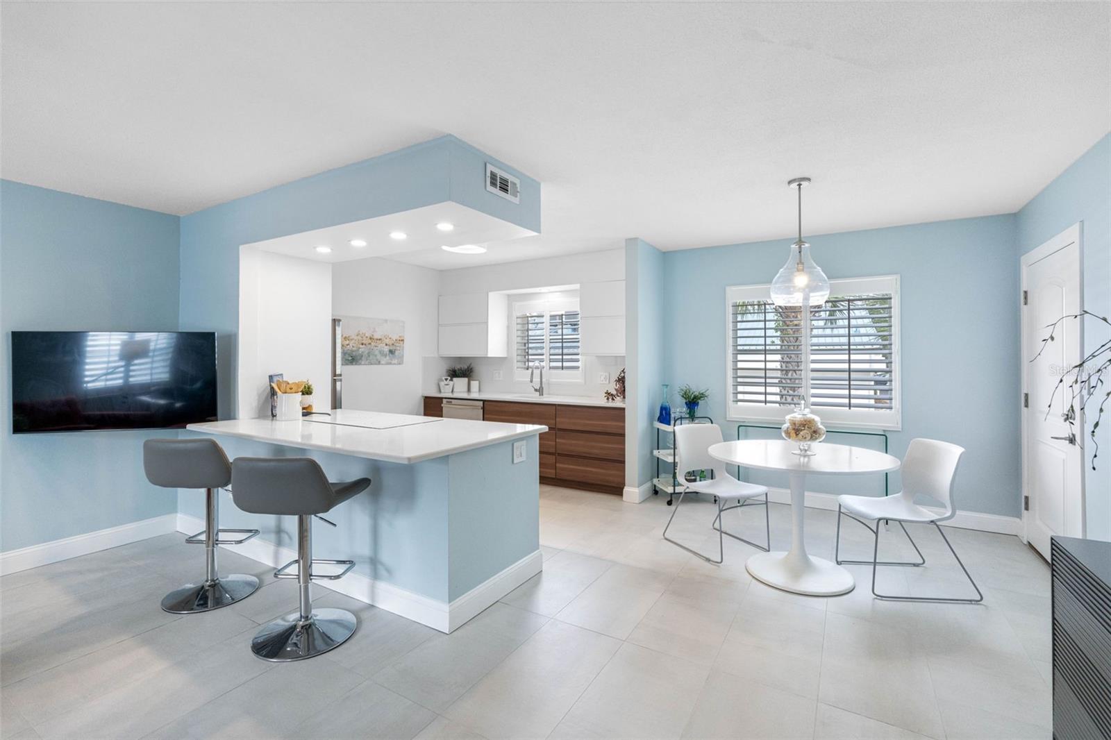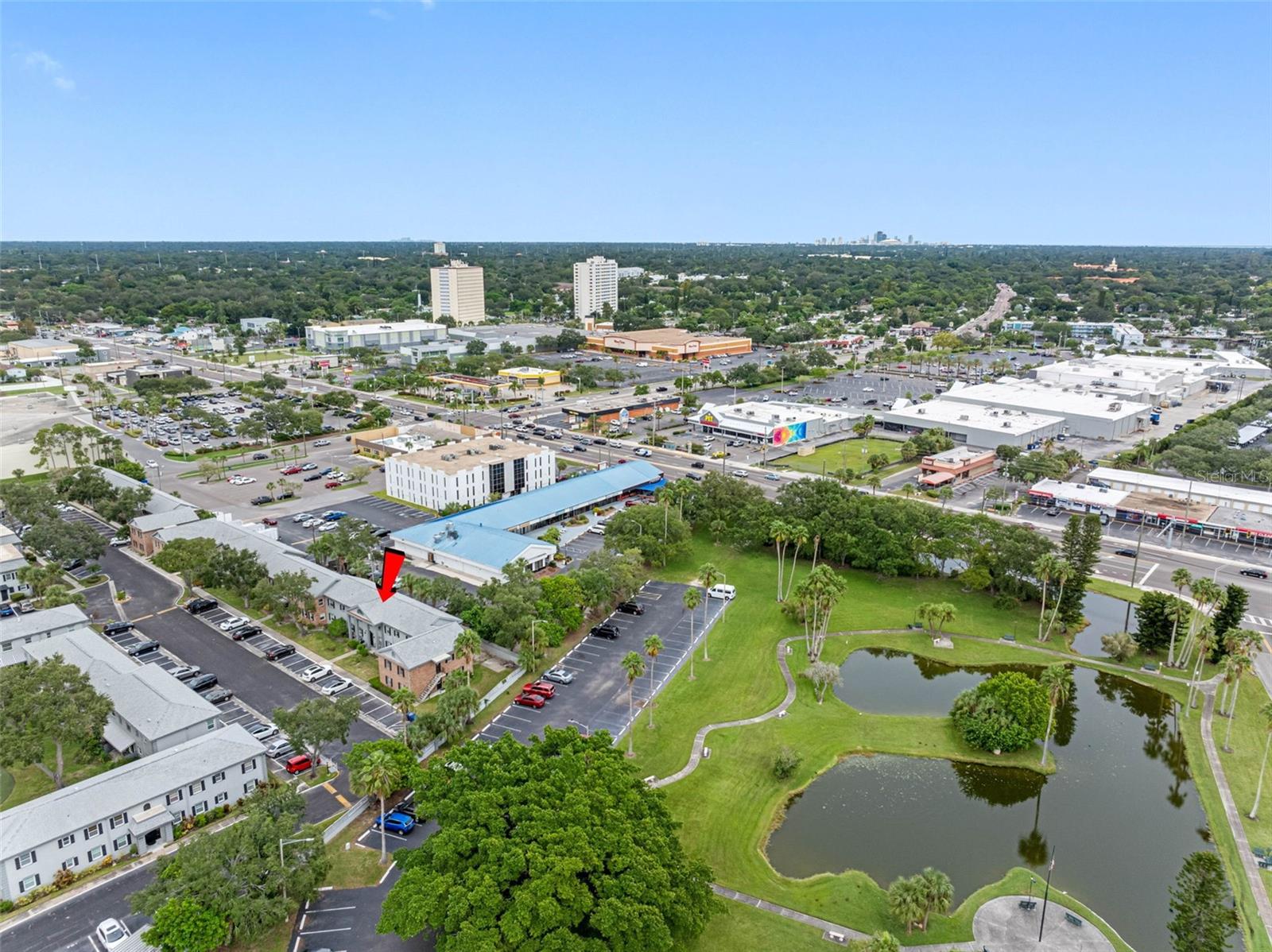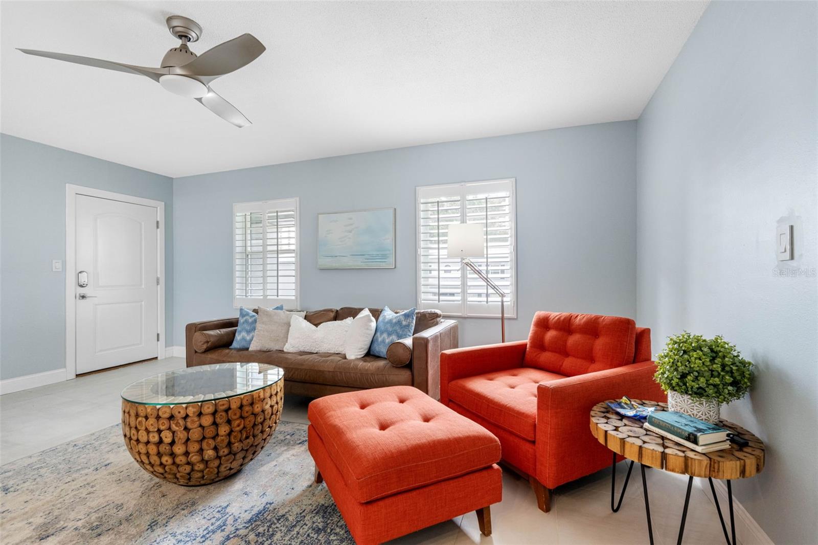 **HOME DID NOT HAVE HURRICANE DAMAGE** Welcome to your beautifully updated modern condo ideally situated near stunning sugary sandy beaches and a short drive to vibrant downtown St. Pete! This chic 2-bedroom, 2-bath home features a thoughtfully designed open floor plan with large-format tile flooring and coastal-inspired paint throughout. Enter the home into the spacious and inviting living room through either the front or back door. The room, painted in a soft, light blue, enhances its open and airy feel, complemented by high ceilings with a modern ceiling fan. Adjacent to the living area, a sleek and modern kitchen with bar seating allows for easy conversation and interaction between spaces. The kitchen showcases rich, Italian walnut-toned lower cabinetry and white upper cabinets that provide ample storage while adding a warm contrast to the crisp walls and quartz countertops. A large, single-basin sink situated beneath a wide window allows natural light to brighten the space, enhancing the clean and uncluttered feel. The kitchen is also equipped with stainless steel appliances. The charming dining area offers a fresh, coastal vibe highlighted by a striking glass pendant light overhead. Large windows throughout, equipped with white plantation shutters, frame views of lush greenery and palms, enhancing the home’s airy and bright ambiance. The primary bedroom beautifully combines serenity and modern elegance, making it a perfect retreat. The walk-in closet features built-ins, and a tankless water heater saves space and ensures you never run out of hot water. The updated ensuite bathroom presents a clean and modern design, highlighted by a soothing neutral palette. It features large, light gray tiles that cover the walls, complementing the white fixtures and cabinetry. The sleek vanity offers ample storage with a flat-panel design, topped with a white countertop and modern fixtures, and custom practical additions like the wooden shelving built-in provide extra space for towels or decor, enhancing the bathroom’s utility and style. The second bedroom features a large built-in closet, TV, and tile flooring. This updated guest bathroom showcases travertine tiles on the walls and floor, a white vanity, sleek white countertop, and contemporary lighting. The HVAC was replaced in 2024. The building has a new roof and is conveniently located, allowing an easy walk to Publix, Wal-Mart, CVS, and many more stores, restaurants, houses of worship, public transportation, hospitals, and the beautiful Galatea Park. Nearby Duryea Bay View Park offers gorgeous waterfront views of Boca Ciega Bay, walking paths, public tennis courts, and a local playground. The community features a heated pool, putting greens, shuffleboard, a clubhouse with pool tables, and is just a short walk to the intercoastal. St Pete Beach is only minutes away. Assigned parking spot steps from the front door. Call for a showing today!