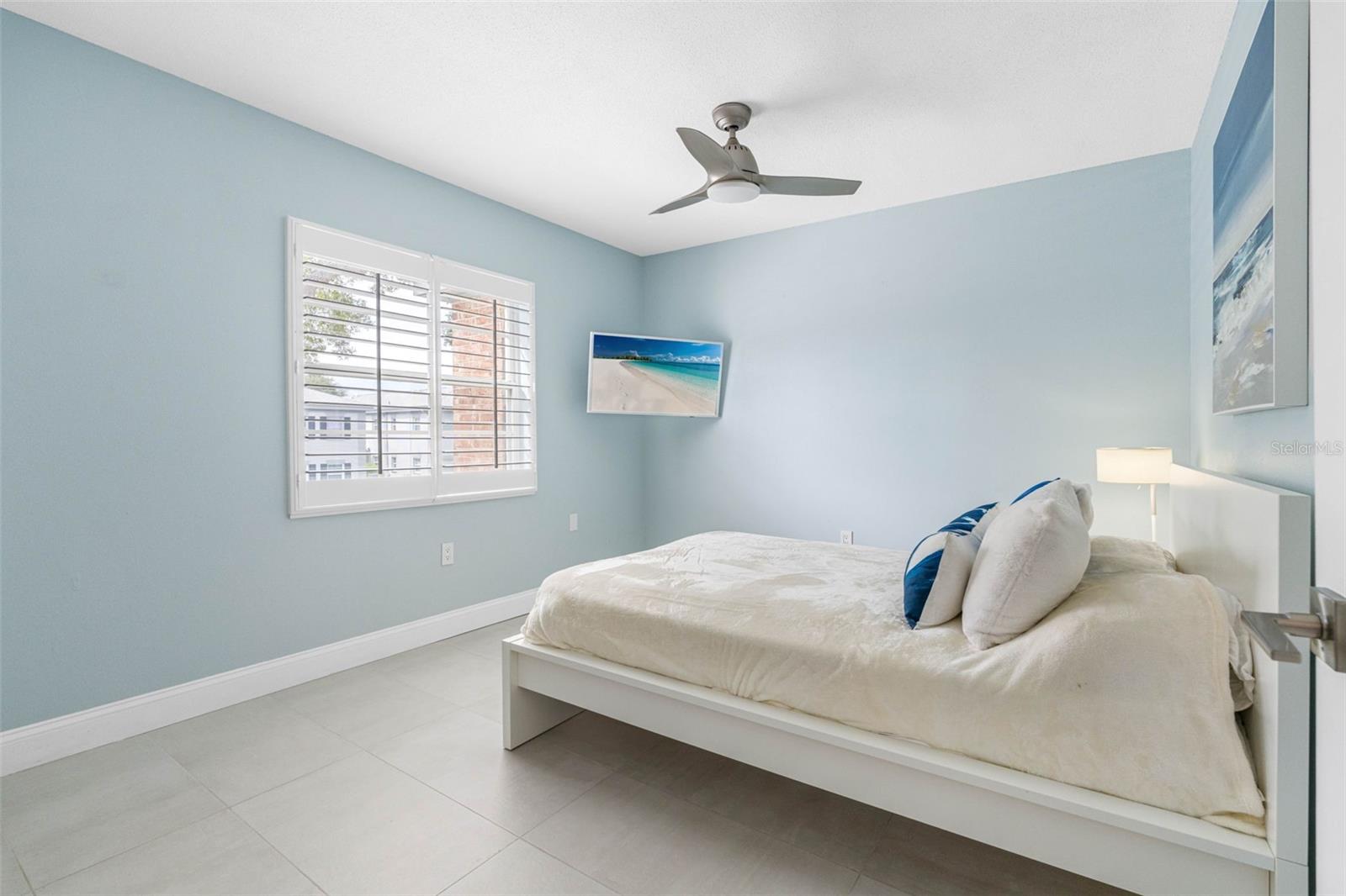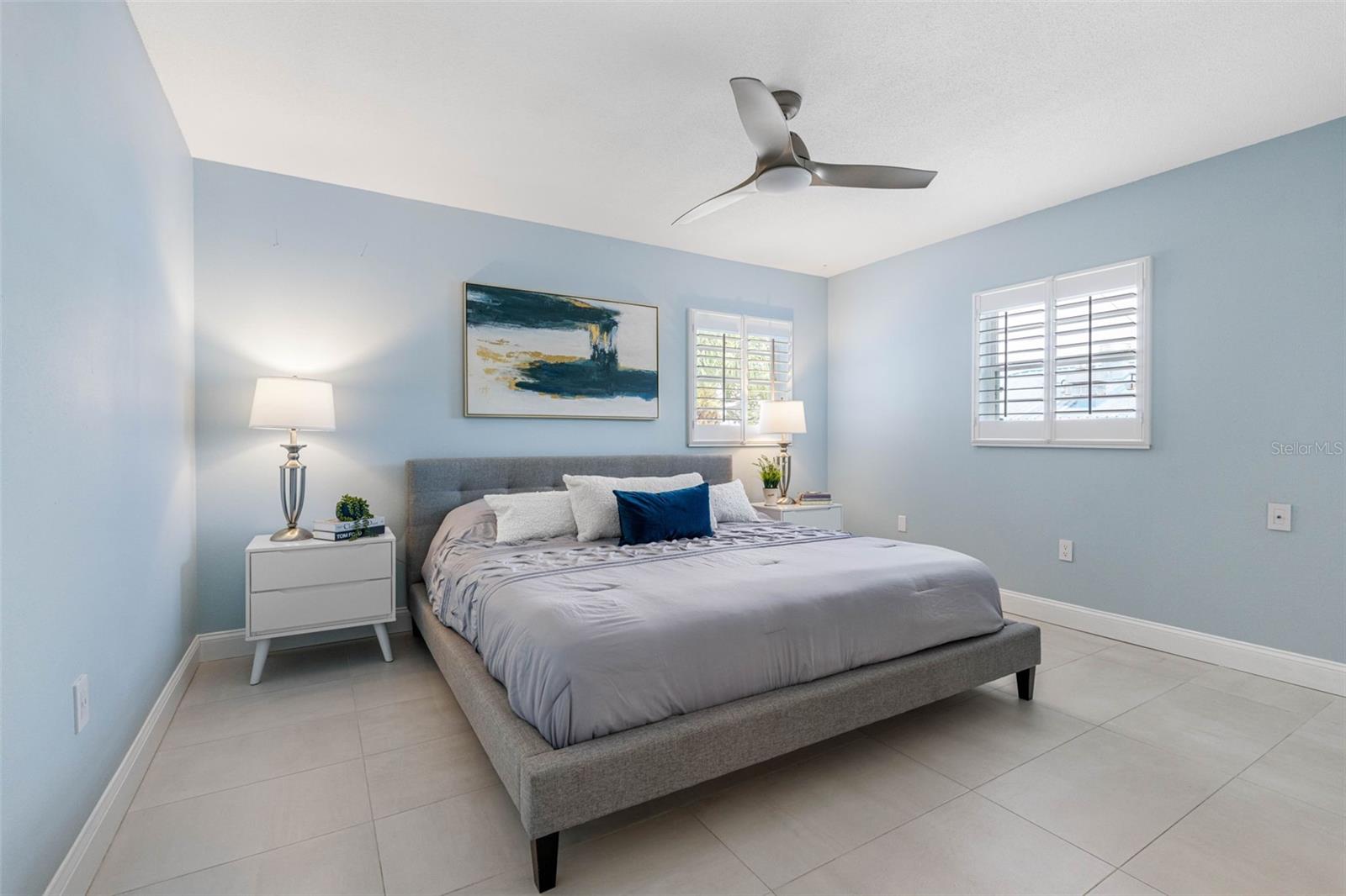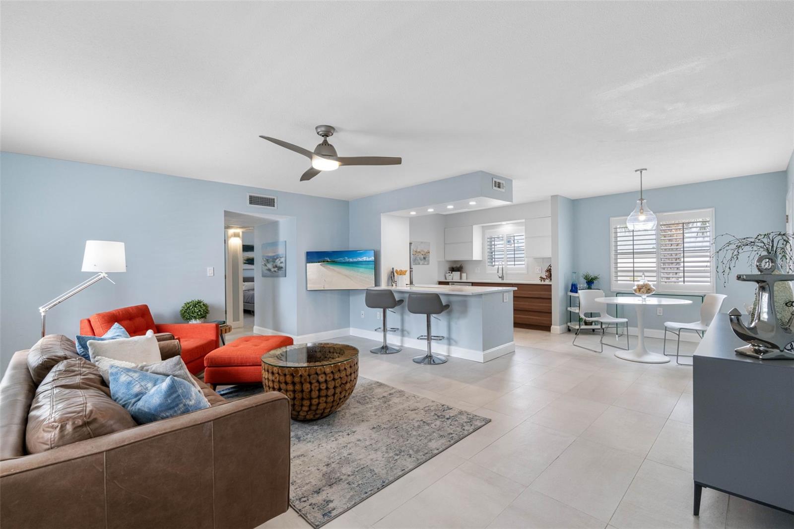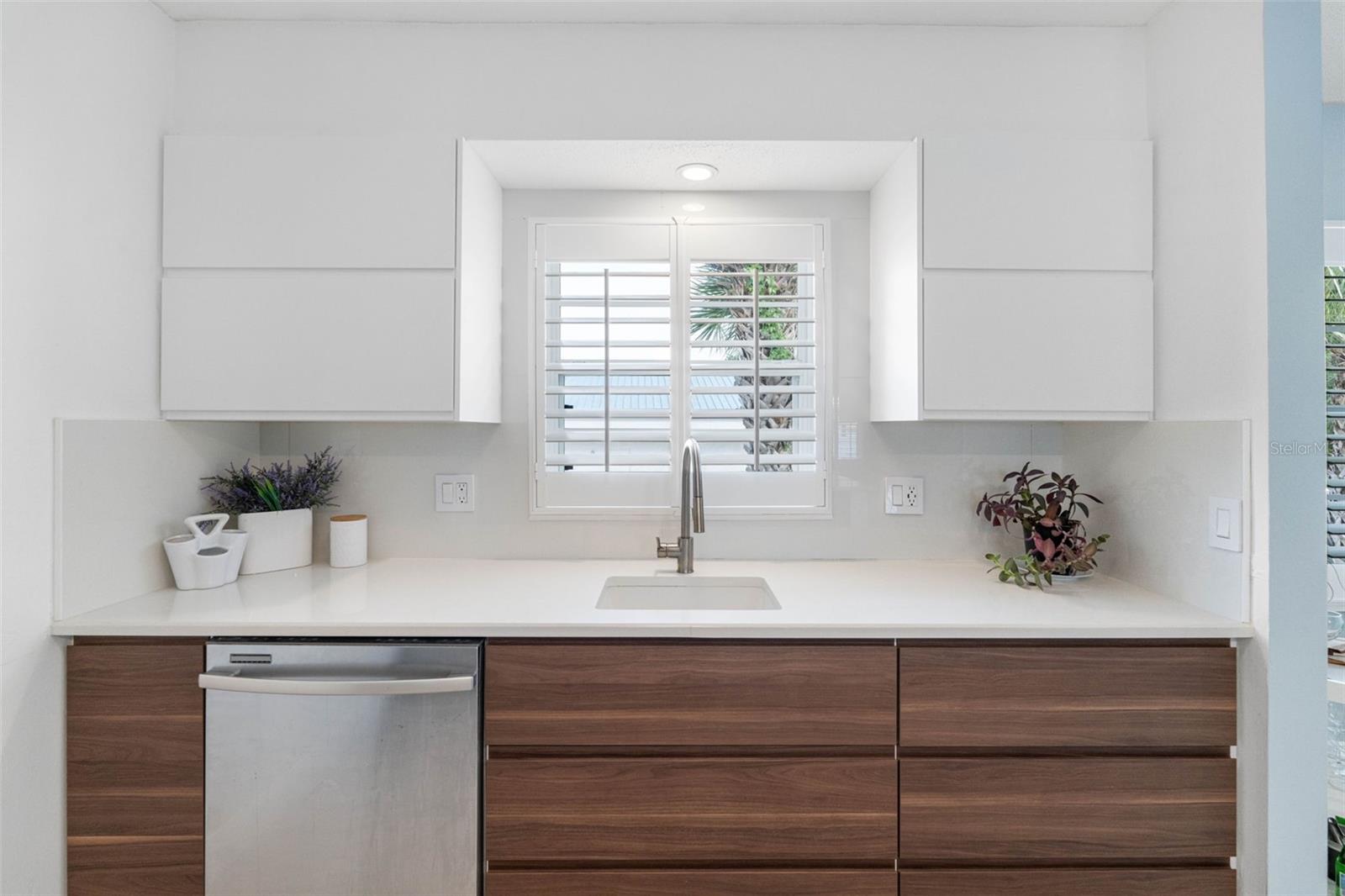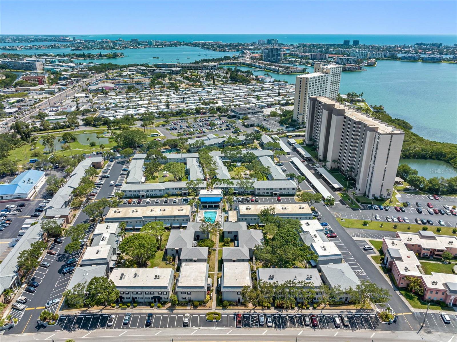 **HOME DID NOT HAVE HURRICANE DAMAGE** Welcome to your beautifully updated modern condo ideally situated near stunning sugary sandy beaches and a short drive to vibrant downtown St. Pete! This chic 2-bedroom, 2-bath home features a thoughtfully designed open floor plan with large-format tile flooring and coastal-inspired paint throughout. Enter the home into the spacious and inviting living room through either the front or back door. The room, painted in a soft, light blue, enhances its open and airy feel, complemented by high ceilings with a modern ceiling fan. Adjacent to the living area, a sleek and modern kitchen with bar seating allows for easy conversation and interaction between spaces. The kitchen showcases rich, Italian walnut-toned lower cabinetry and white upper cabinets that provide ample storage while adding a warm contrast to the crisp walls and quartz countertops. A large, single-basin sink situated beneath a wide window allows natural light to brighten the space, enhancing the clean and uncluttered feel. The kitchen is also equipped with stainless steel appliances. The charming dining area offers a fresh, coastal vibe highlighted by a striking glass pendant light overhead. Large windows throughout, equipped with white plantation shutters, frame views of lush greenery and palms, enhancing the home’s airy and bright ambiance. The primary bedroom beautifully combines serenity and modern elegance, making it a perfect retreat. The walk-in closet features built-ins, and a tankless water heater saves space and ensures you never run out of hot water. The updated ensuite bathroom presents a clean and modern design, highlighted by a soothing neutral palette. It features large, light gray tiles that cover the walls, complementing the white fixtures and cabinetry. The sleek vanity offers ample storage with a flat-panel design, topped with a white countertop and modern fixtures, and custom practical additions like the wooden shelving built-in provide extra space for towels or decor, enhancing the bathroom’s utility and style. The second bedroom features a large built-in closet, TV, and tile flooring. This updated guest bathroom showcases travertine tiles on the walls and floor, a white vanity, sleek white countertop, and contemporary lighting. The HVAC was replaced in 2024. The building has a new roof and is conveniently located, allowing an easy walk to Publix, Wal-Mart, CVS, and many more stores, restaurants, houses of worship, public transportation, hospitals, and the beautiful Galatea Park. Nearby Duryea Bay View Park offers gorgeous waterfront views of Boca Ciega Bay, walking paths, public tennis courts, and a local playground. The community features a heated pool, putting greens, shuffleboard, a clubhouse with pool tables, and is just a short walk to the intercoastal. St Pete Beach is only minutes away. Assigned parking spot steps from the front door. Call for a showing today!