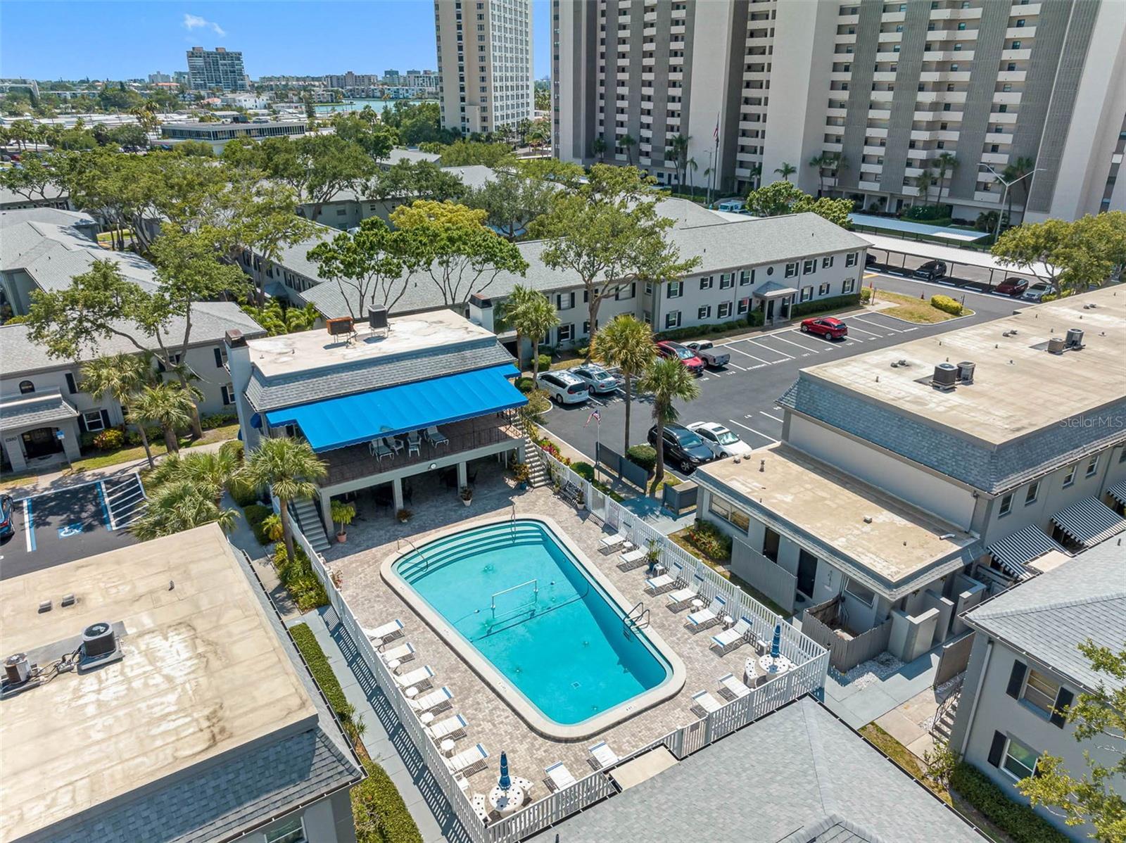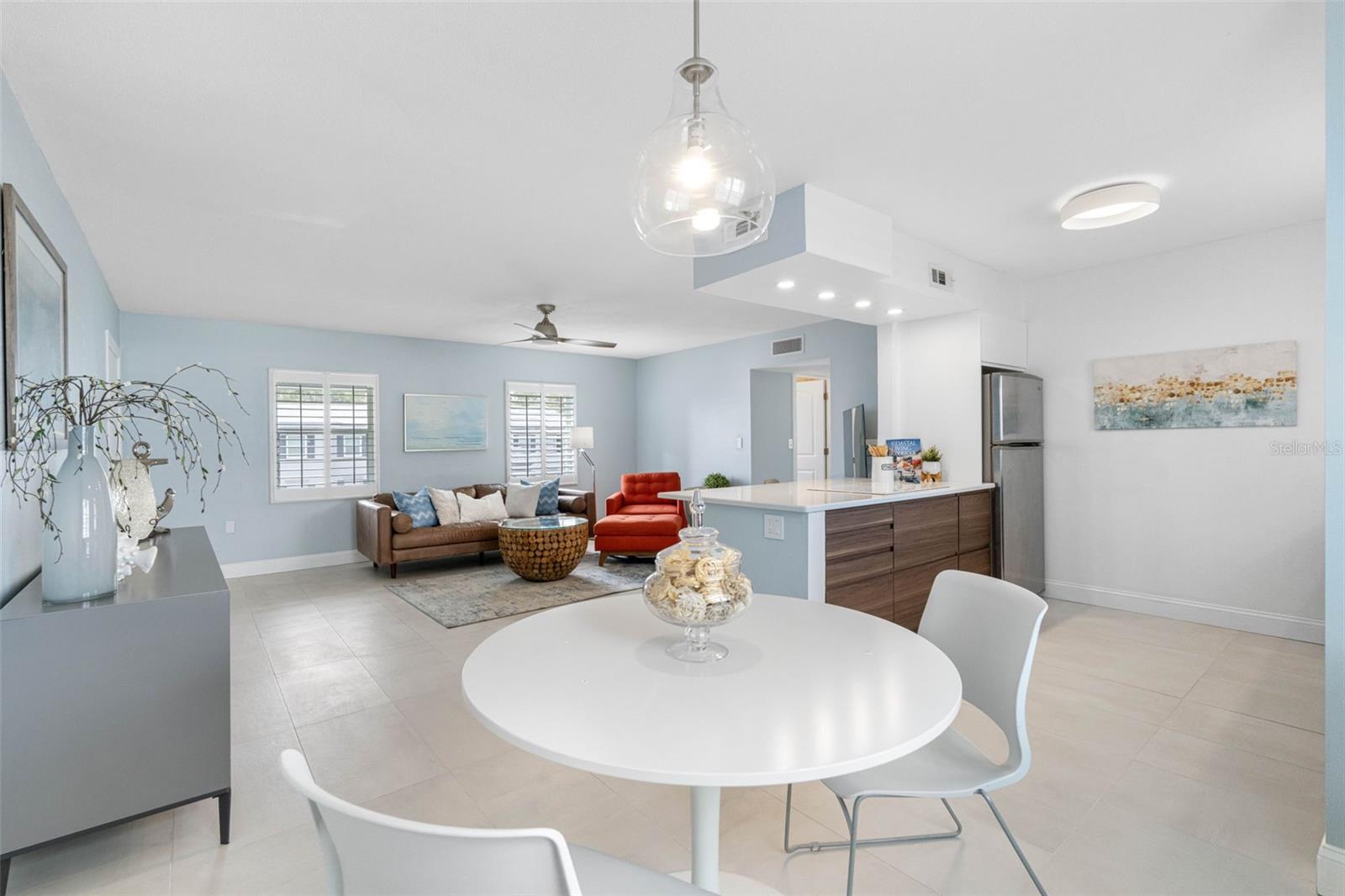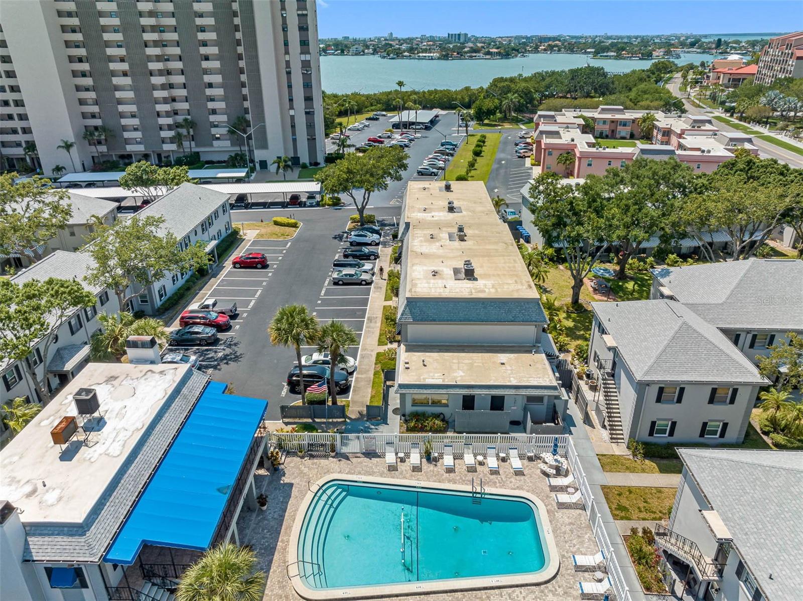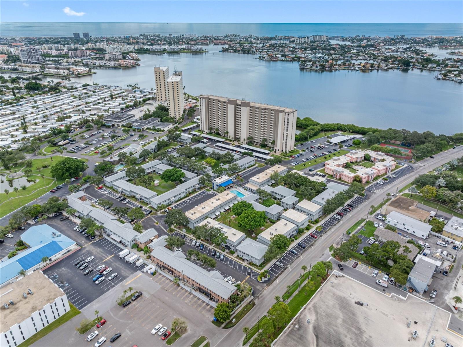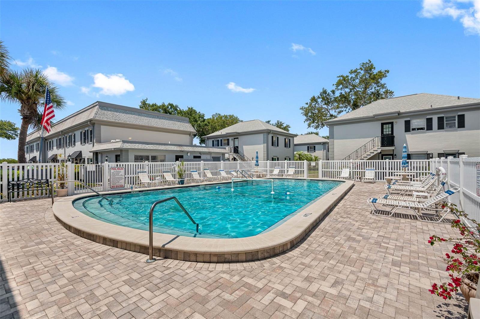**HOME DID NOT HAVE HURRICANE DAMAGE** Welcome to your beautifully updated modern condo ideally situated near stunning sugary sandy beaches and a short drive to vibrant downtown St. Pete! This chic 2-bedroom, 2-bath home features a thoughtfully designed open floor plan with large-format tile flooring and coastal-inspired paint throughout. Enter the home into the spacious and inviting living room through either the front or back door. The room, painted in a soft, light blue, enhances its open and airy feel, complemented by high ceilings with a modern ceiling fan. Adjacent to the living area, a sleek and modern kitchen with bar seating allows for easy conversation and interaction between spaces. The kitchen showcases rich, Italian walnut-toned lower cabinetry and white upper cabinets that provide ample storage while adding a warm contrast to the crisp walls and quartz countertops. A large, single-basin sink situated beneath a wide window allows natural light to brighten the space, enhancing the clean and uncluttered feel. The kitchen is also equipped with stainless steel appliances. The charming dining area offers a fresh, coastal vibe highlighted by a striking glass pendant light overhead. Large windows throughout, equipped with white plantation shutters, frame views of lush greenery and palms, enhancing the home’s airy and bright ambiance. The primary bedroom beautifully combines serenity and modern elegance, making it a perfect retreat. The walk-in closet features built-ins, and a tankless water heater saves space and ensures you never run out of hot water. The updated ensuite bathroom presents a clean and modern design, highlighted by a soothing neutral palette. It features large, light gray tiles that cover the walls, complementing the white fixtures and cabinetry. The sleek vanity offers ample storage with a flat-panel design, topped with a white countertop and modern fixtures, and custom practical additions like the wooden shelving built-in provide extra space for towels or decor, enhancing the bathroom’s utility and style. The second bedroom features a large built-in closet, TV, and tile flooring. This updated guest bathroom showcases travertine tiles on the walls and floor, a white vanity, sleek white countertop, and contemporary lighting. The HVAC was replaced in 2024. The building has a new roof and is conveniently located, allowing an easy walk to Publix, Wal-Mart, CVS, and many more stores, restaurants, houses of worship, public transportation, hospitals, and the beautiful Galatea Park. Nearby Duryea Bay View Park offers gorgeous waterfront views of Boca Ciega Bay, walking paths, public tennis courts, and a local playground. The community features a heated pool, putting greens, shuffleboard, a clubhouse with pool tables, and is just a short walk to the intercoastal. St Pete Beach is only minutes away. Assigned parking spot steps from the front door. Call for a showing today!