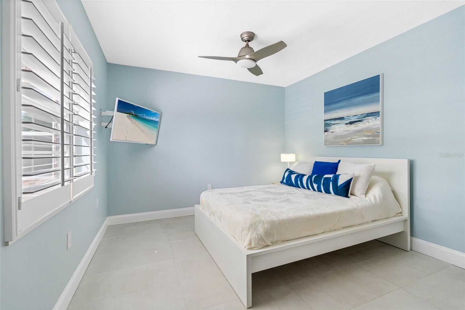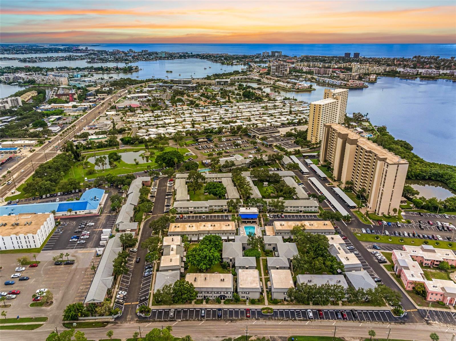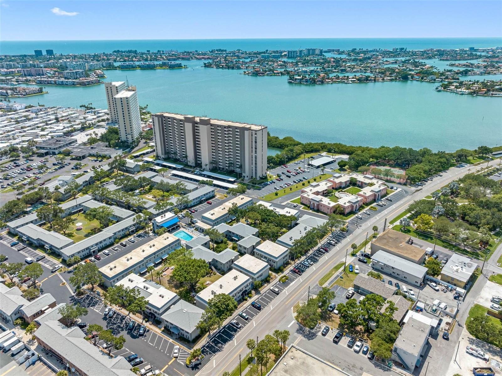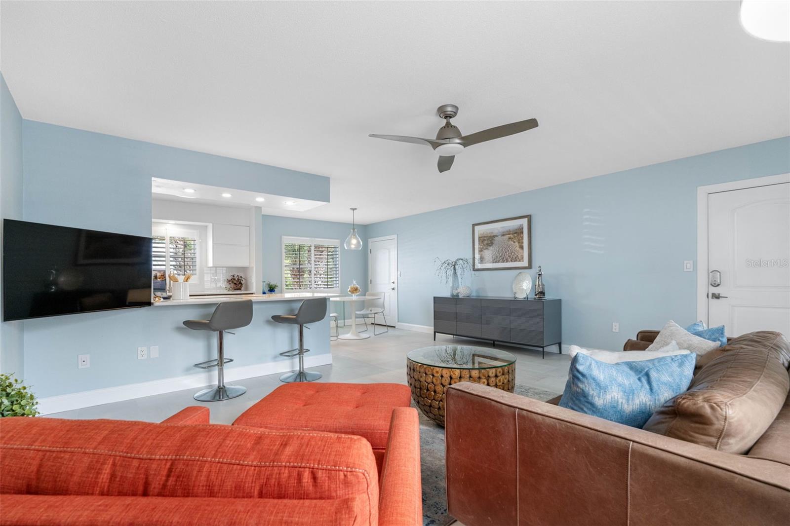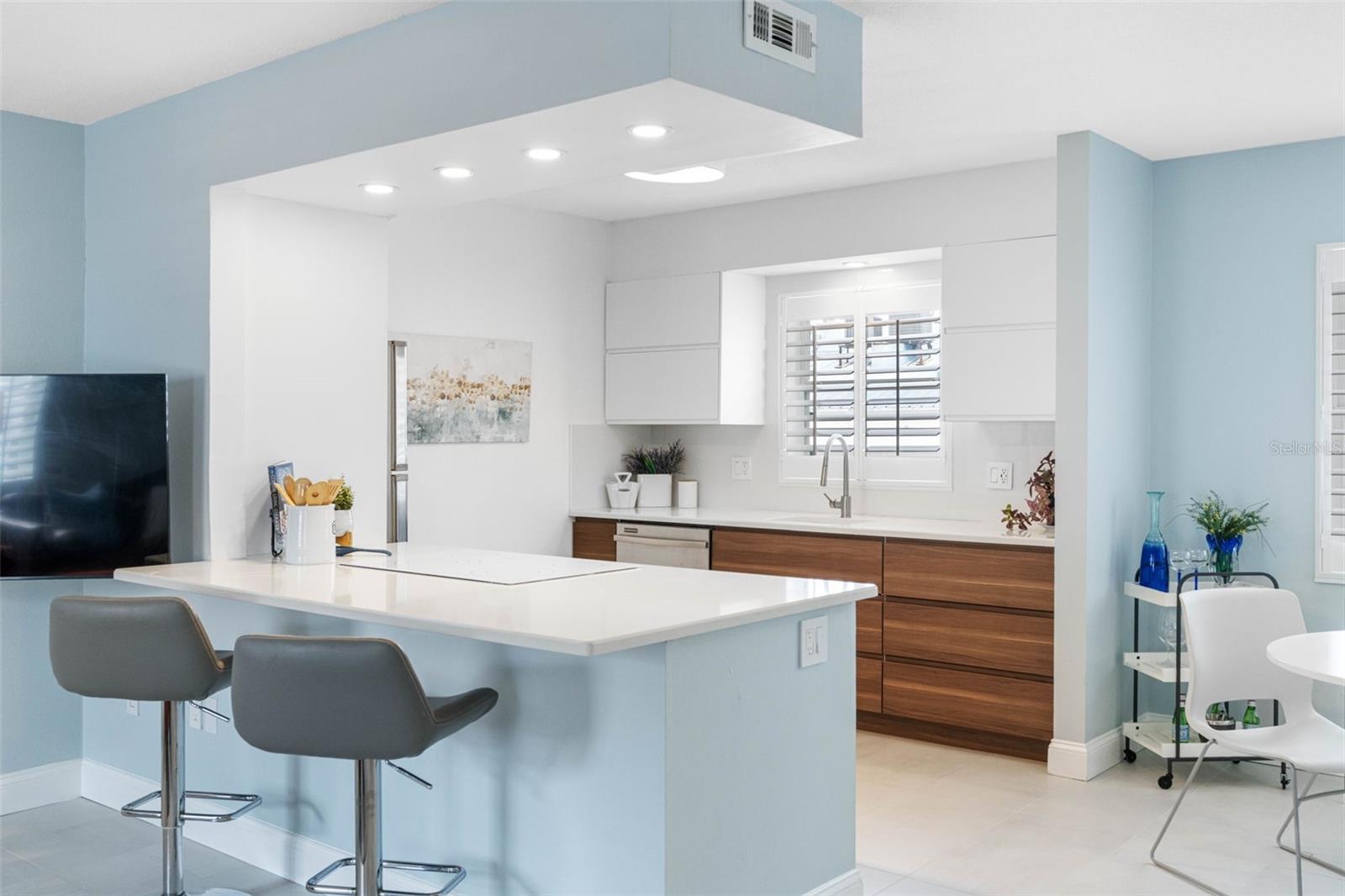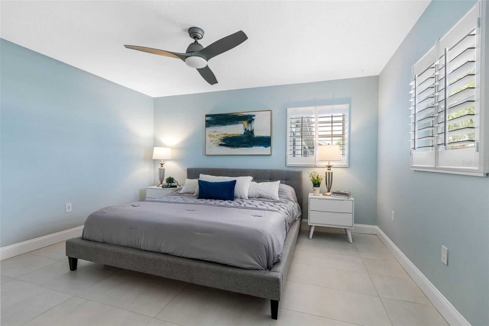 **HOME DID NOT HAVE HURRICANE DAMAGE** Welcome to your beautifully updated modern condo ideally situated near stunning sugary sandy beaches and a short drive to vibrant downtown St. Pete! This chic 2-bedroom, 2-bath home features a thoughtfully designed open floor plan with large-format tile flooring and coastal-inspired paint throughout. Enter the home into the spacious and inviting living room through either the front or back door. The room, painted in a soft, light blue, enhances its open and airy feel, complemented by high ceilings with a modern ceiling fan. Adjacent to the living area, a sleek and modern kitchen with bar seating allows for easy conversation and interaction between spaces. The kitchen showcases rich, Italian walnut-toned lower cabinetry and white upper cabinets that provide ample storage while adding a warm contrast to the crisp walls and quartz countertops. A large, single-basin sink situated beneath a wide window allows natural light to brighten the space, enhancing the clean and uncluttered feel. The kitchen is also equipped with stainless steel appliances. The charming dining area offers a fresh, coastal vibe highlighted by a striking glass pendant light overhead. Large windows throughout, equipped with white plantation shutters, frame views of lush greenery and palms, enhancing the home’s airy and bright ambiance. The primary bedroom beautifully combines serenity and modern elegance, making it a perfect retreat. The walk-in closet features built-ins, and a tankless water heater saves space and ensures you never run out of hot water. The updated ensuite bathroom presents a clean and modern design, highlighted by a soothing neutral palette. It features large, light gray tiles that cover the walls, complementing the white fixtures and cabinetry. The sleek vanity offers ample storage with a flat-panel design, topped with a white countertop and modern fixtures, and custom practical additions like the wooden shelving built-in provide extra space for towels or decor, enhancing the bathroom’s utility and style. The second bedroom features a large built-in closet, TV, and tile flooring. This updated guest bathroom showcases travertine tiles on the walls and floor, a white vanity, sleek white countertop, and contemporary lighting. The HVAC was replaced in 2024. The building has a new roof and is conveniently located, allowing an easy walk to Publix, Wal-Mart, CVS, and many more stores, restaurants, houses of worship, public transportation, hospitals, and the beautiful Galatea Park. Nearby Duryea Bay View Park offers gorgeous waterfront views of Boca Ciega Bay, walking paths, public tennis courts, and a local playground. The community features a heated pool, putting greens, shuffleboard, a clubhouse with pool tables, and is just a short walk to the intercoastal. St Pete Beach is only minutes away. Assigned parking spot steps from the front door. Call for a showing today!
