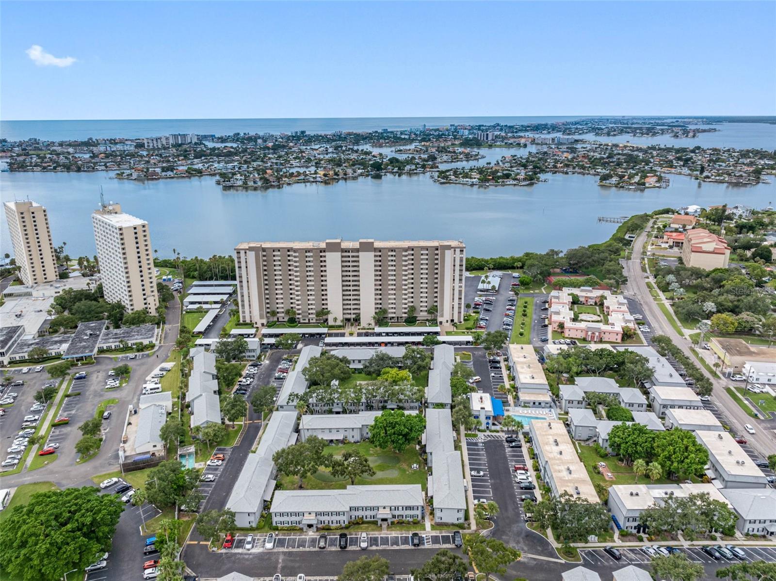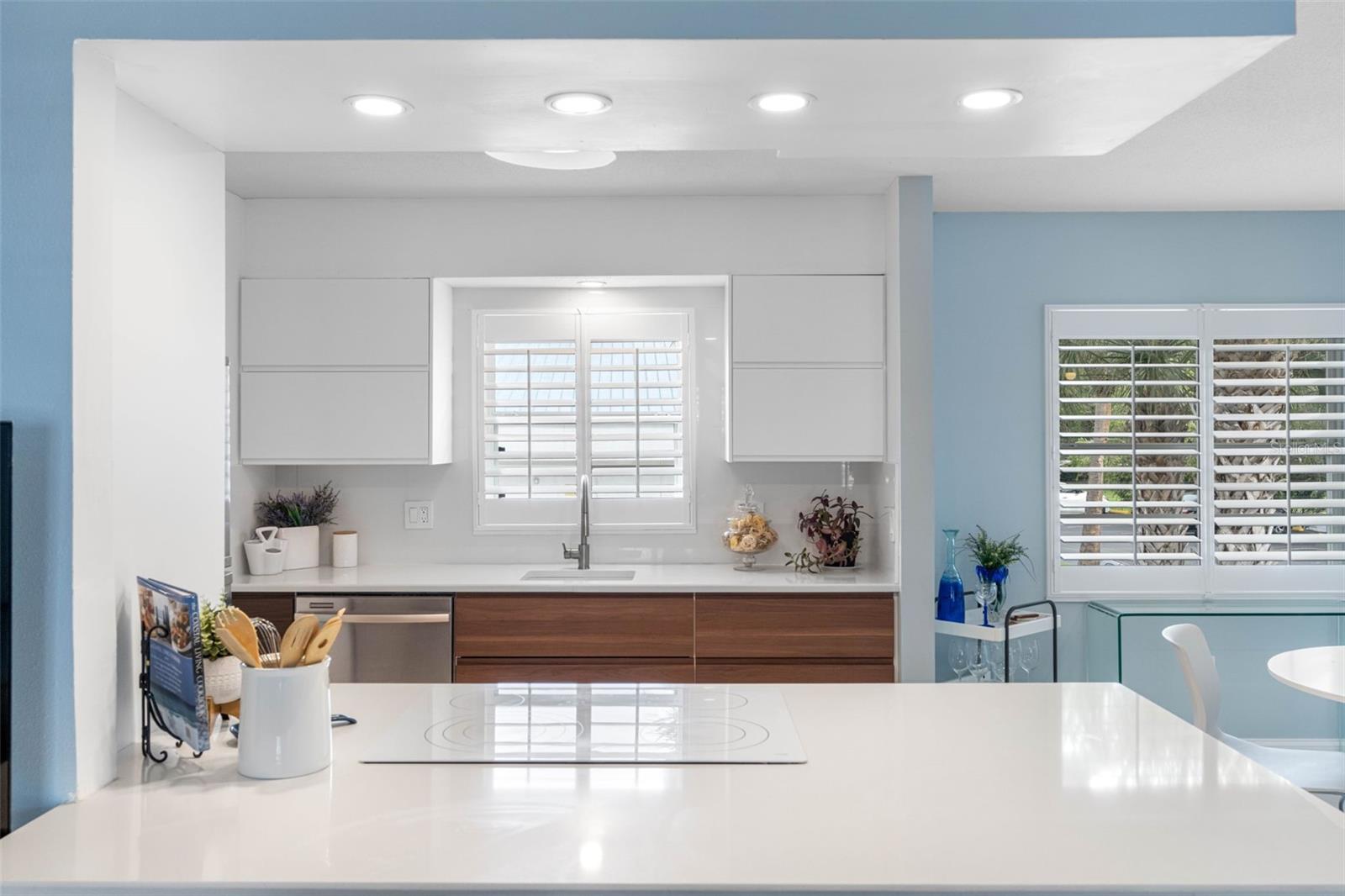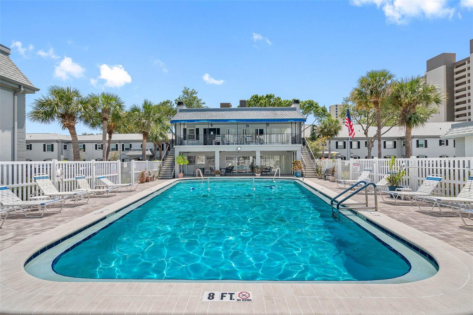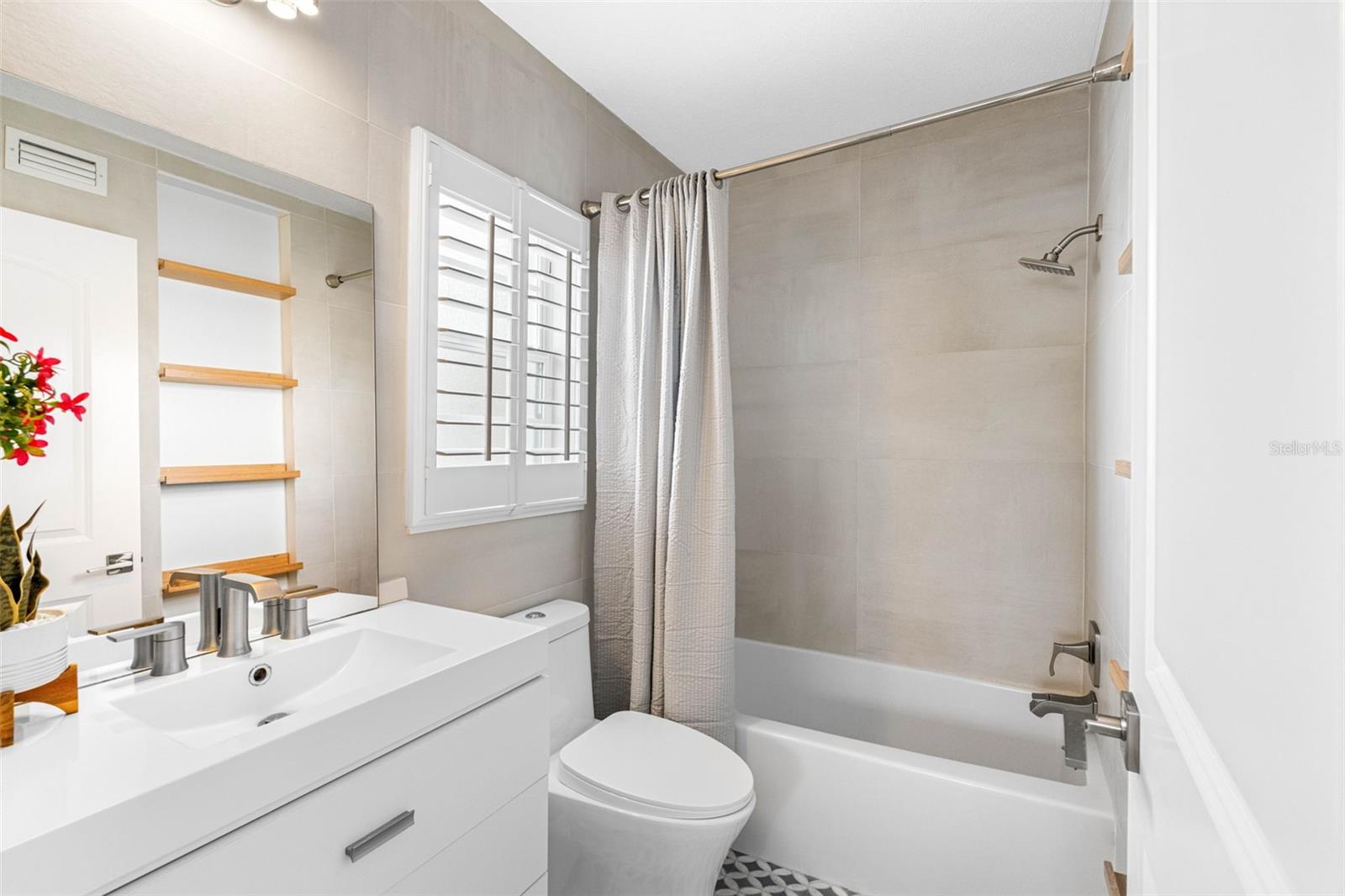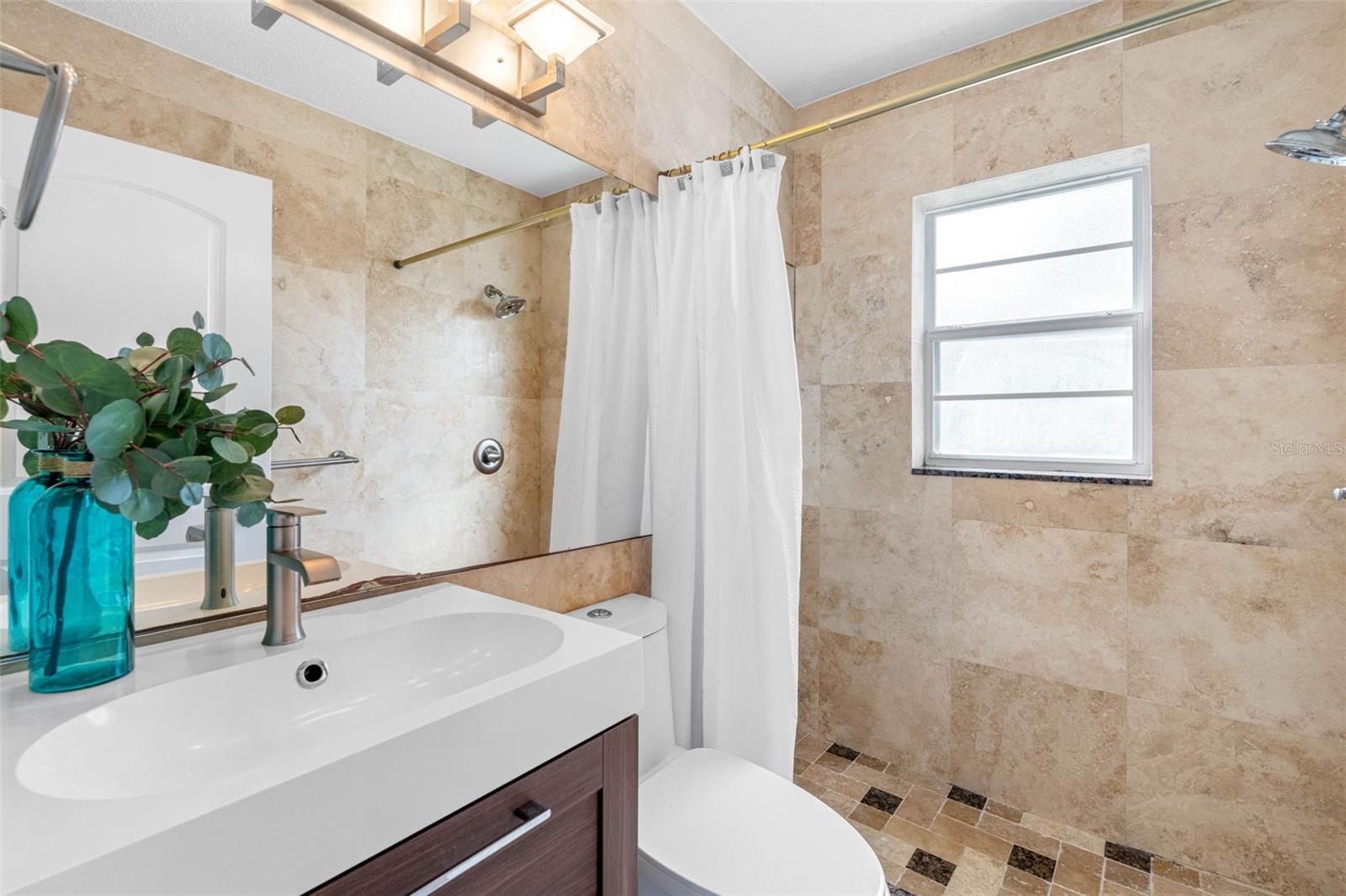 **HOME DID NOT HAVE HURRICANE DAMAGE** Welcome to your beautifully updated modern condo ideally situated near stunning sugary sandy beaches and a short drive to vibrant downtown St. Pete! This chic 2-bedroom, 2-bath home features a thoughtfully designed open floor plan with large-format tile flooring and coastal-inspired paint throughout. Enter the home into the spacious and inviting living room through either the front or back door. The room, painted in a soft, light blue, enhances its open and airy feel, complemented by high ceilings with a modern ceiling fan. Adjacent to the living area, a sleek and modern kitchen with bar seating allows for easy conversation and interaction between spaces. The kitchen showcases rich, Italian walnut-toned lower cabinetry and white upper cabinets that provide ample storage while adding a warm contrast to the crisp walls and quartz countertops. A large, single-basin sink situated beneath a wide window allows natural light to brighten the space, enhancing the clean and uncluttered feel. The kitchen is also equipped with stainless steel appliances. The charming dining area offers a fresh, coastal vibe highlighted by a striking glass pendant light overhead. Large windows throughout, equipped with white plantation shutters, frame views of lush greenery and palms, enhancing the home’s airy and bright ambiance. The primary bedroom beautifully combines serenity and modern elegance, making it a perfect retreat. The walk-in closet features built-ins, and a tankless water heater saves space and ensures you never run out of hot water. The updated ensuite bathroom presents a clean and modern design, highlighted by a soothing neutral palette. It features large, light gray tiles that cover the walls, complementing the white fixtures and cabinetry. The sleek vanity offers ample storage with a flat-panel design, topped with a white countertop and modern fixtures, and custom practical additions like the wooden shelving built-in provide extra space for towels or decor, enhancing the bathroom’s utility and style. The second bedroom features a large built-in closet, TV, and tile flooring. This updated guest bathroom showcases travertine tiles on the walls and floor, a white vanity, sleek white countertop, and contemporary lighting. The HVAC was replaced in 2024. The building has a new roof and is conveniently located, allowing an easy walk to Publix, Wal-Mart, CVS, and many more stores, restaurants, houses of worship, public transportation, hospitals, and the beautiful Galatea Park. Nearby Duryea Bay View Park offers gorgeous waterfront views of Boca Ciega Bay, walking paths, public tennis courts, and a local playground. The community features a heated pool, putting greens, shuffleboard, a clubhouse with pool tables, and is just a short walk to the intercoastal. St Pete Beach is only minutes away. Assigned parking spot steps from the front door. Call for a showing today!