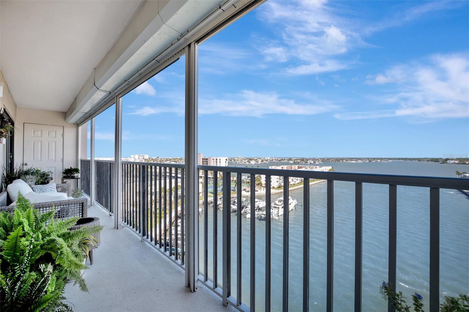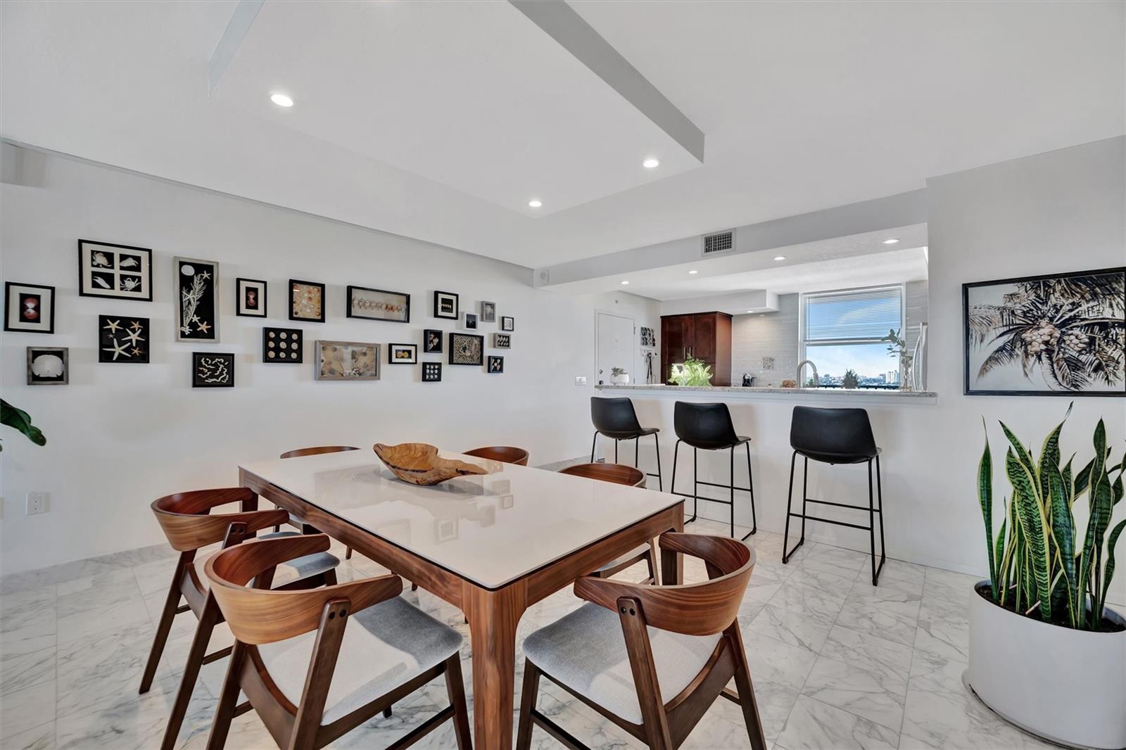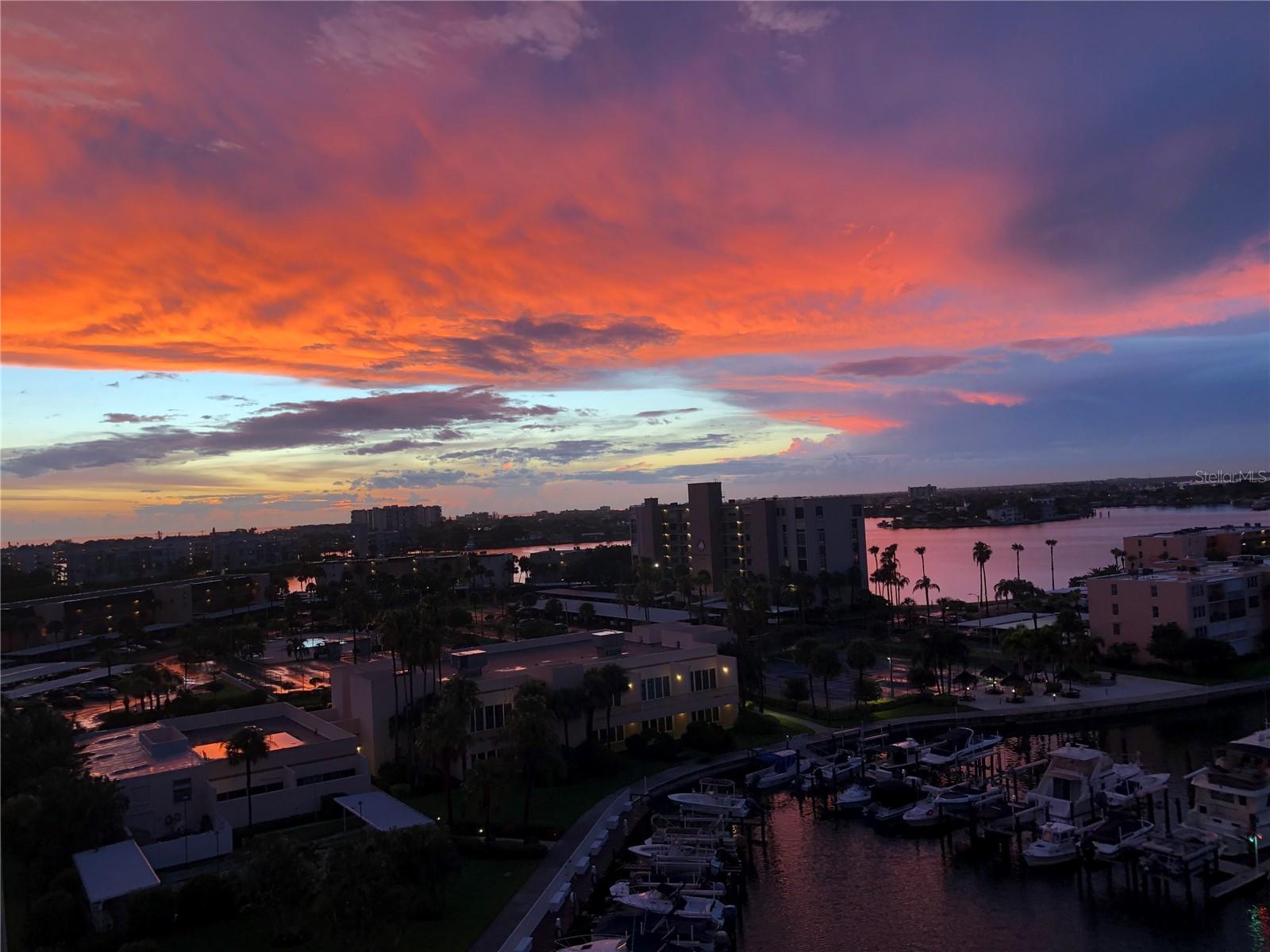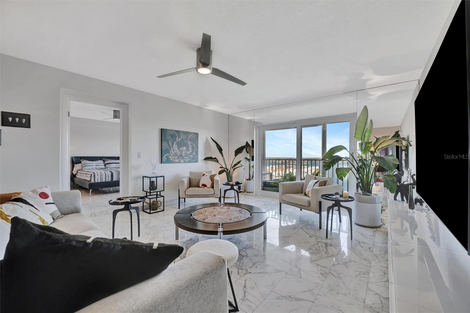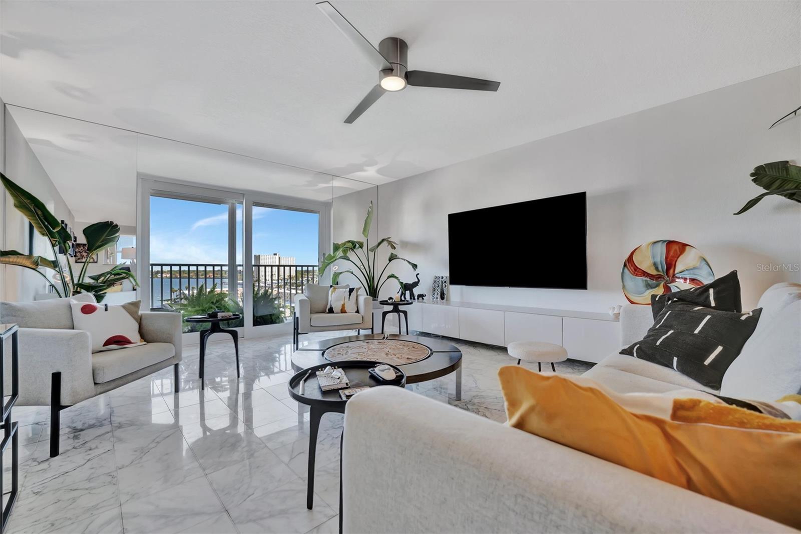 This exquisite two-bedroom, two-bath condominium, located on the ninth floor, boasts spectacular unobstructed waterfront views that can be enjoyed from every window. The contemporary unit features an open floor plan adorned with marble flooring throughout and abundant natural sunlight in every room. The entertainer’s kitchen has been tastefully remodeled, showcasing custom hardwood cabinets with interior pull-outs, granite countertops, newer appliances, a breakfast bar, and an open kitchen island. The spacious master bedroom includes a walk-in closet, equipped with a cherry hardwood closet system, and an updated master bath replete with elegant touches. Additionally, it provides access to a 26-foot covered waterfront balcony. The unit also features a guest bedroom with a walk-in closet and an in-unit stacked washer and dryer. Situated in the highly sought-after Admiral Building, a pet friendly, premier 55+ waterfront community, residents enjoy added conveniences, including storage closets on balconies, an extra hallway closet, a secure storage unit on the first floor, and a designated covered parking space (#903). Bay Island is a gated community with 24-hour security, offering resort-style amenities such as six heated pools, a jacuzzi spa, a full marina with boat slips (subject to a waitlist), tennis and pickleball courts, a waterfront walking trail, outdoor grilling stations, and a newly renovated clubhouse. The clubhouse features a billiards room, card room, gym with a sauna, and hosts a variety of social events organized by a dedicated social director. Additional amenities include his-and-hers gyms, a library with internet access, card rooms, table tennis, and a banquet room complete with a lounge, dance floor, and commercial kitchen. Small pets are welcome in this vibrant 55+ community. With the Milestone and SIRS reports completed and the seller motivated, this move-in-ready unit presents an unparalleled waterfront retreat. Don’t miss this exceptional opportunity! This prime location is merely minutes away from the beach, DTSP, Johns Pass Village, shopping, dining, Palms of Pasadena Hospital, the Tampa International Airport (as well as several private airports) and much more. This stunning condominium epitomizes luxury, convenience, and coastal charm. Schedule your private showing now.