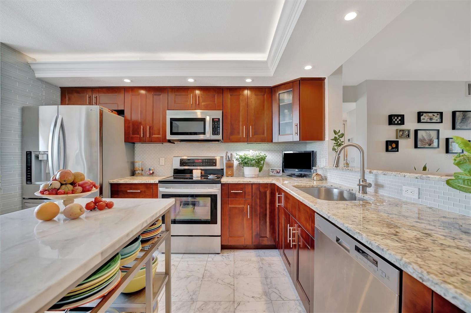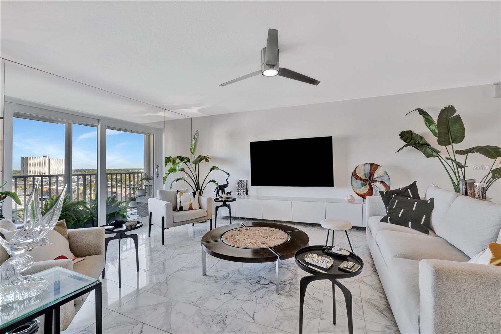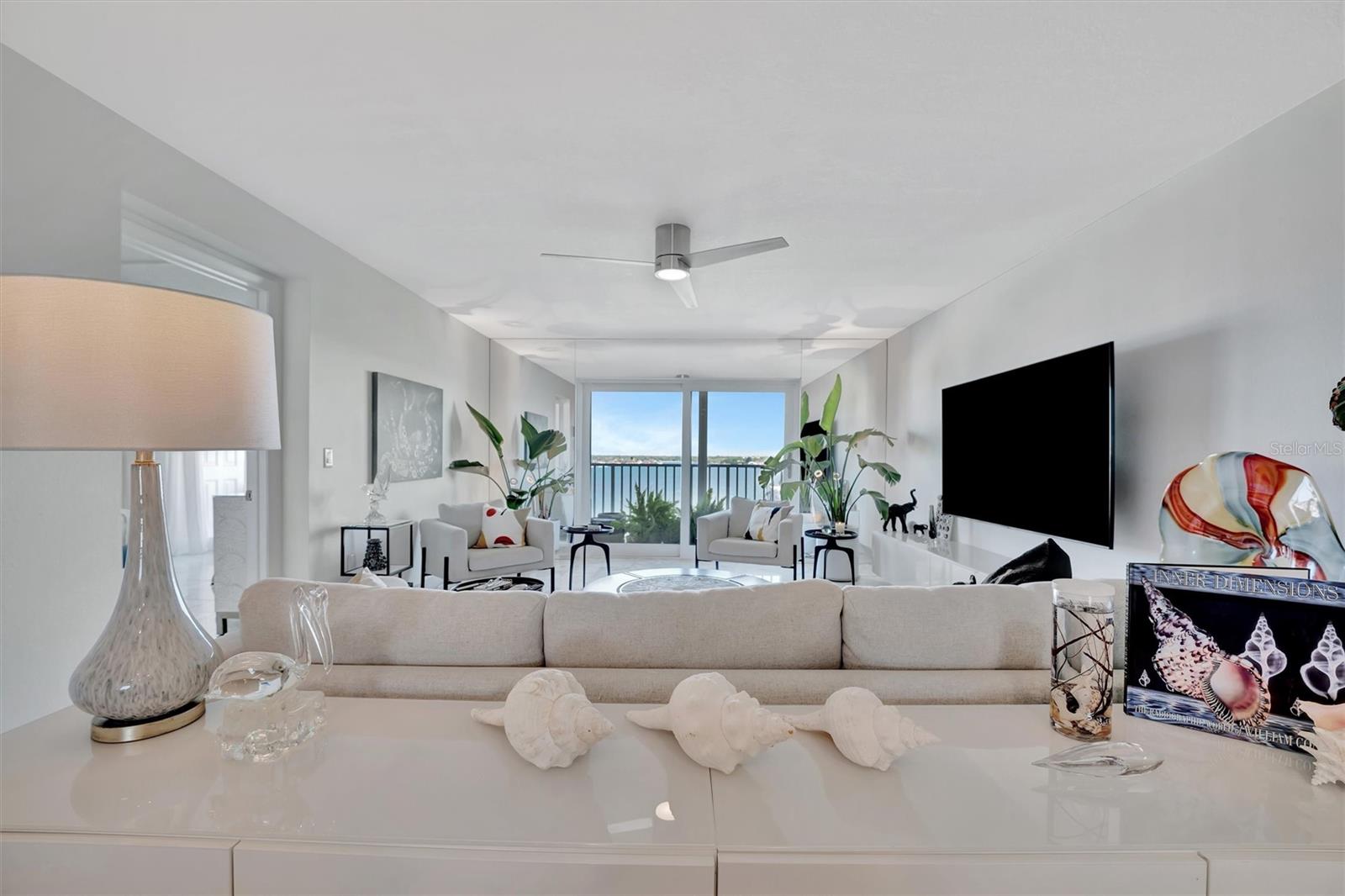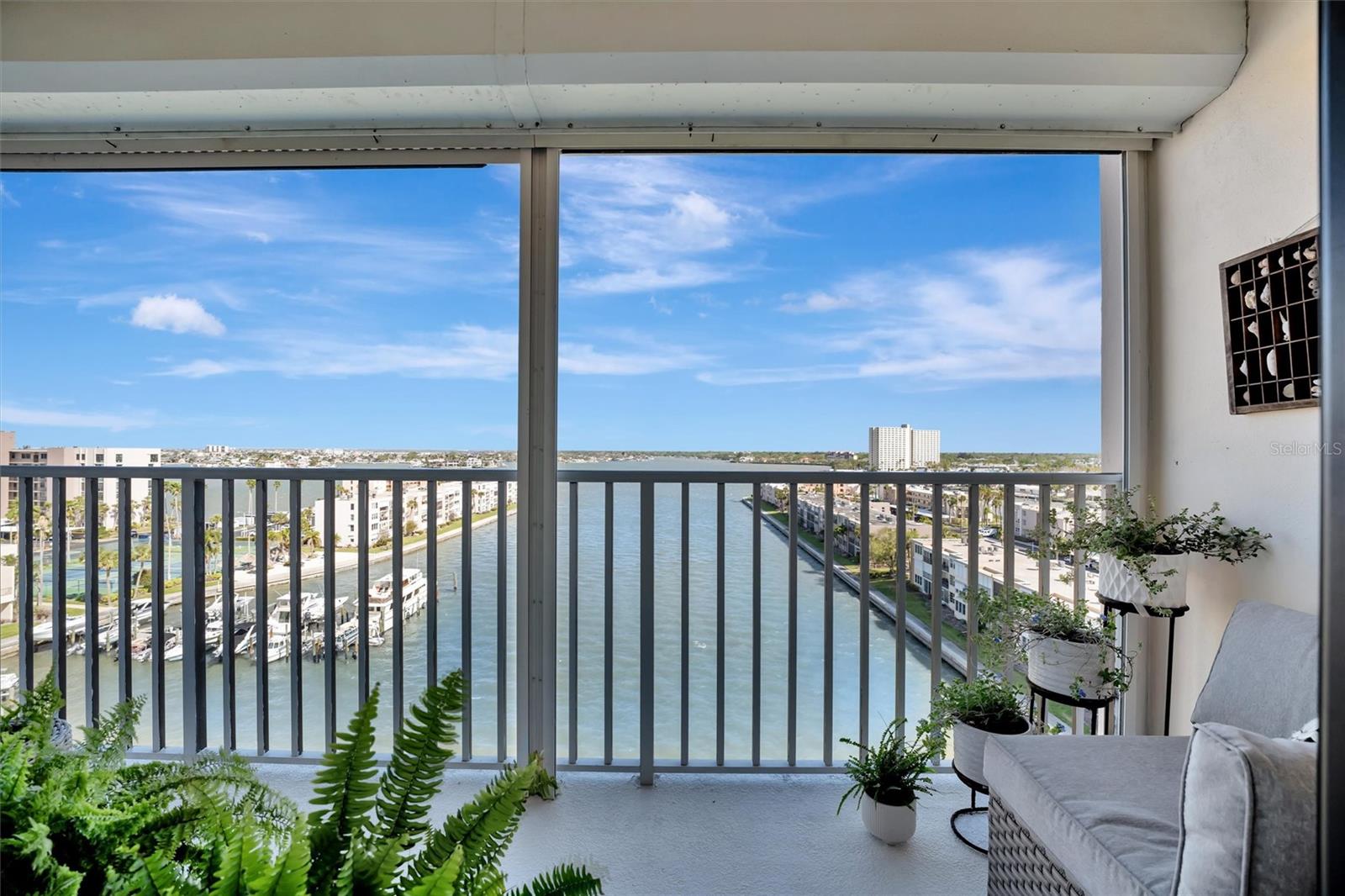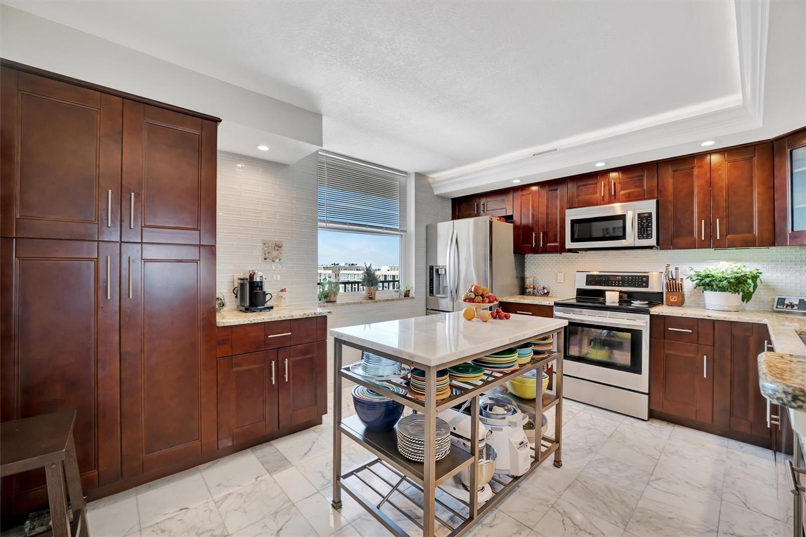 This exquisite two-bedroom, two-bath condominium, located on the ninth floor, boasts spectacular unobstructed waterfront views that can be enjoyed from every window. The contemporary unit features an open floor plan adorned with marble flooring throughout and abundant natural sunlight in every room. The entertainer’s kitchen has been tastefully remodeled, showcasing custom hardwood cabinets with interior pull-outs, granite countertops, newer appliances, a breakfast bar, and an open kitchen island. The spacious master bedroom includes a walk-in closet, equipped with a cherry hardwood closet system, and an updated master bath replete with elegant touches. Additionally, it provides access to a 26-foot covered waterfront balcony. The unit also features a guest bedroom with a walk-in closet and an in-unit stacked washer and dryer. Situated in the highly sought-after Admiral Building, a pet friendly, premier 55+ waterfront community, residents enjoy added conveniences, including storage closets on balconies, an extra hallway closet, a secure storage unit on the first floor, and a designated covered parking space (#903). Bay Island is a gated community with 24-hour security, offering resort-style amenities such as six heated pools, a jacuzzi spa, a full marina with boat slips (subject to a waitlist), tennis and pickleball courts, a waterfront walking trail, outdoor grilling stations, and a newly renovated clubhouse. The clubhouse features a billiards room, card room, gym with a sauna, and hosts a variety of social events organized by a dedicated social director. Additional amenities include his-and-hers gyms, a library with internet access, card rooms, table tennis, and a banquet room complete with a lounge, dance floor, and commercial kitchen. Small pets are welcome in this vibrant 55+ community. With the Milestone and SIRS reports completed and the seller motivated, this move-in-ready unit presents an unparalleled waterfront retreat. Don’t miss this exceptional opportunity! This prime location is merely minutes away from the beach, DTSP, Johns Pass Village, shopping, dining, Palms of Pasadena Hospital, the Tampa International Airport (as well as several private airports) and much more. This stunning condominium epitomizes luxury, convenience, and coastal charm. Schedule your private showing now.