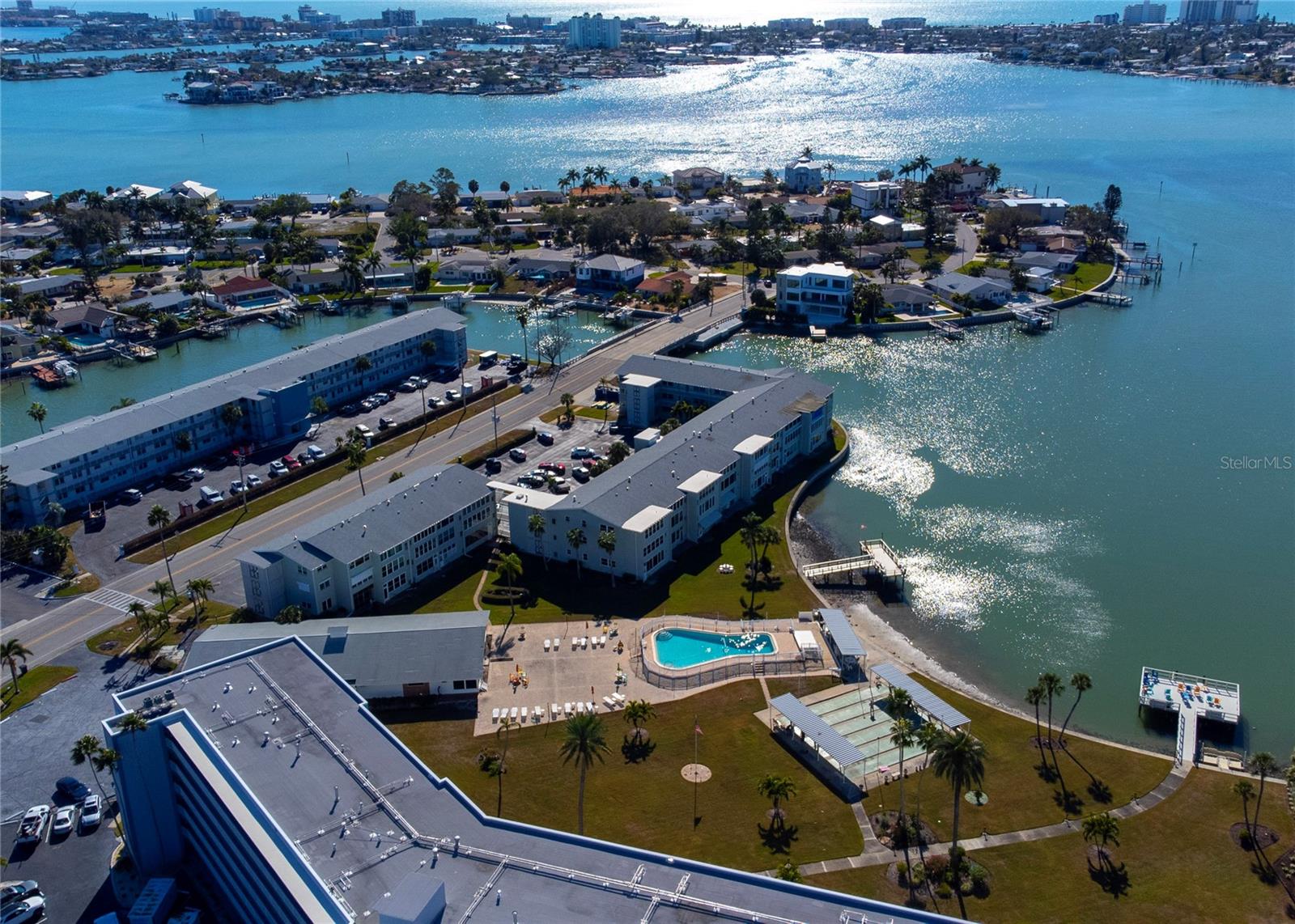 Light, bright, and perfectly positioned for Florida living! From the moment you step inside this comfortable 2 bedroom, 1 bath condo with 1,120 sq. ft, you're welcomed by an open floor plan filled with natural light. The living area flows seamlessly into the Florida room, featuring a wall of windows with stunning views of Boca Ciega Bay.....the perfect spot to relax or entertain. The primary bedroom enjoys the same beautiful water views, bringing the outdoors in. Inside, you'll find spacious bedrooms, abundant closet and storage spaces, and an efficient galley kitchen with a gas cooktop. Recent updates include luxury vinyl flooring, updated windows in the Florida room, and an updated vanity, making this home move-in ready and easy to enjoy. This complex is fully owner-occupied, 55+ well-maintained, steel-reinforced building offers peace of mind with a new roof, and state-of-the-art laundry rooms on the 1st, 5th, and 8th floors. For added convenience, a washer and ventless dryer may be installed in this unit. The monthly maintenance fee of $601 covers nearly everything, including Cable TV, Internet, Gas, Water, Sewer, Trash, Insurance, Escrow Reserves Fund, Exterior and Grounds Maintenance, Community Pool, Pool Maintenance, Recreational Facilities, and on-site Management.....leaving only electricity and property taxes as additional expenses.