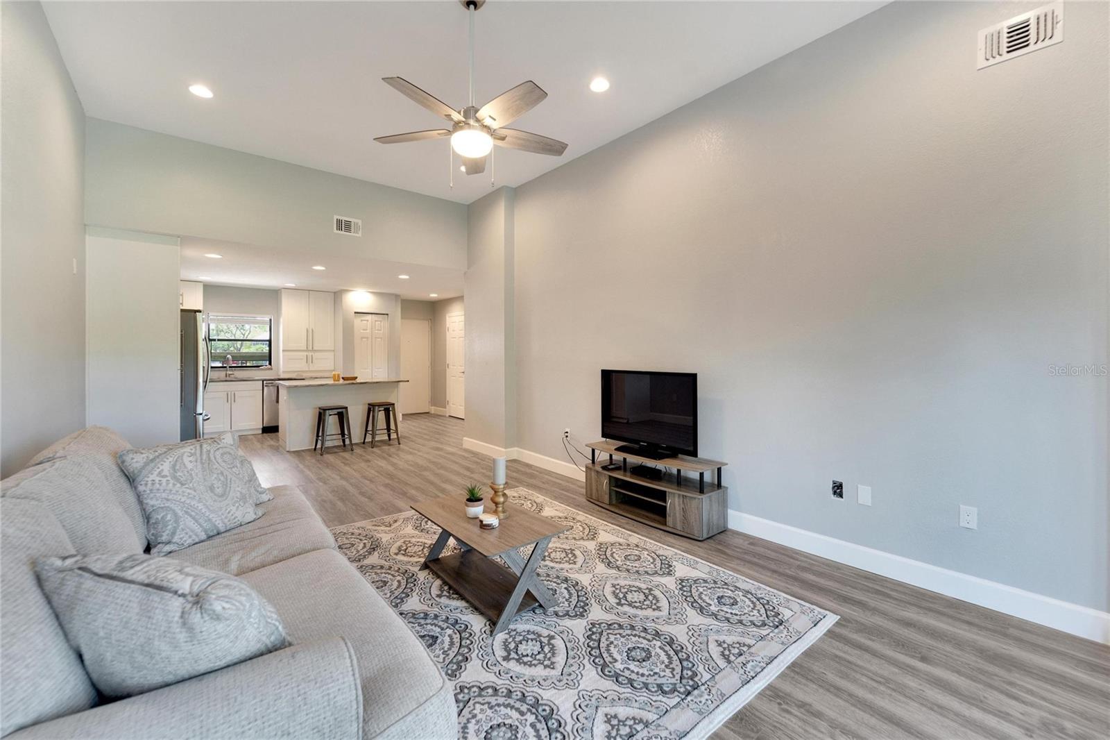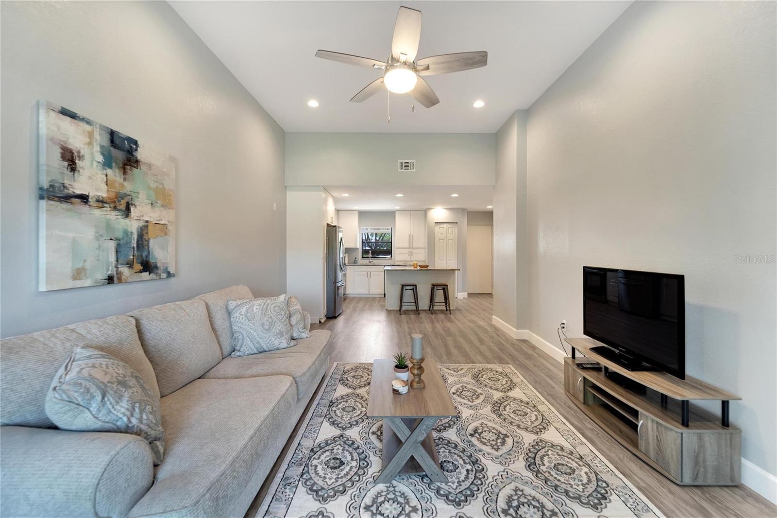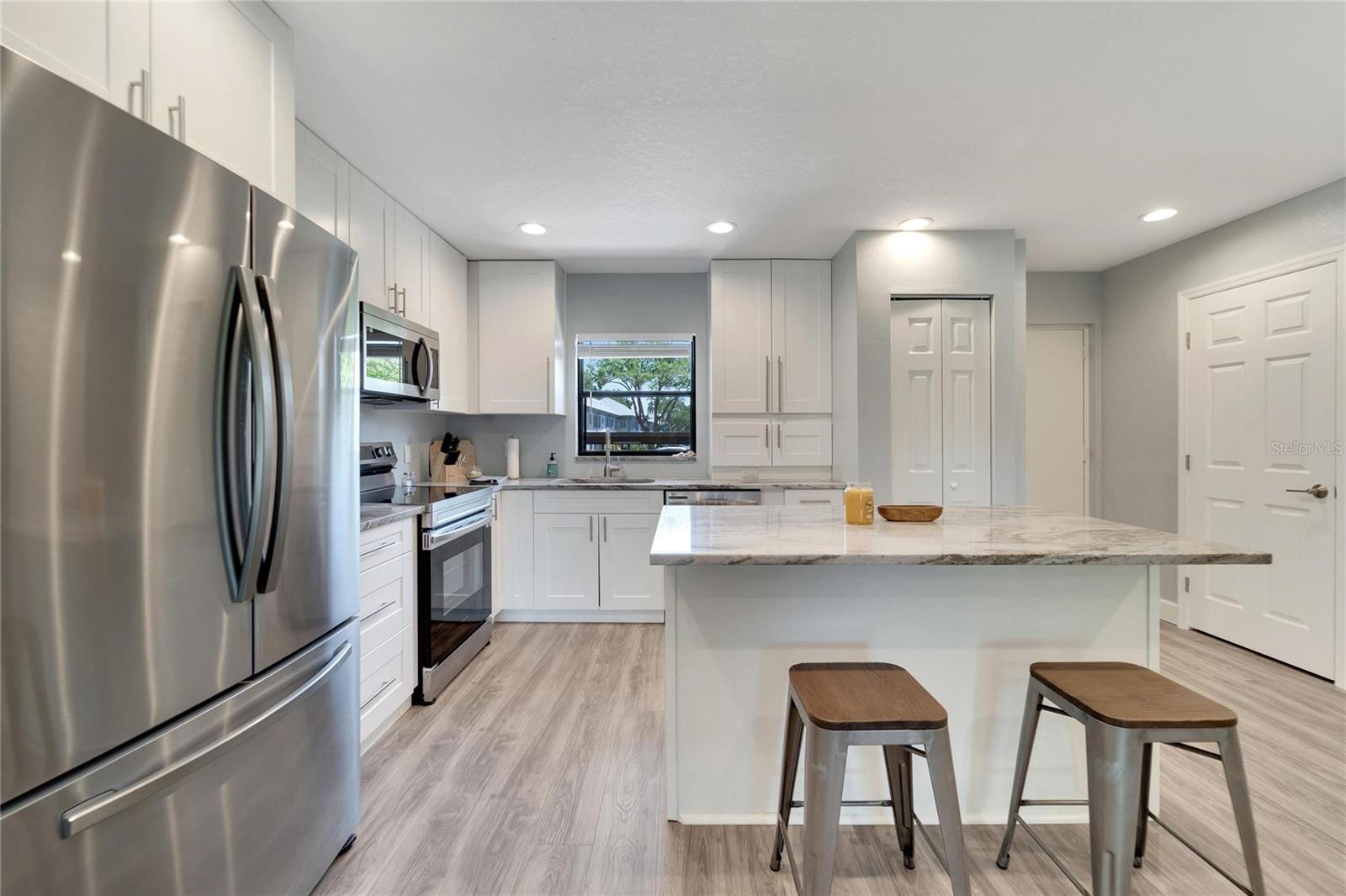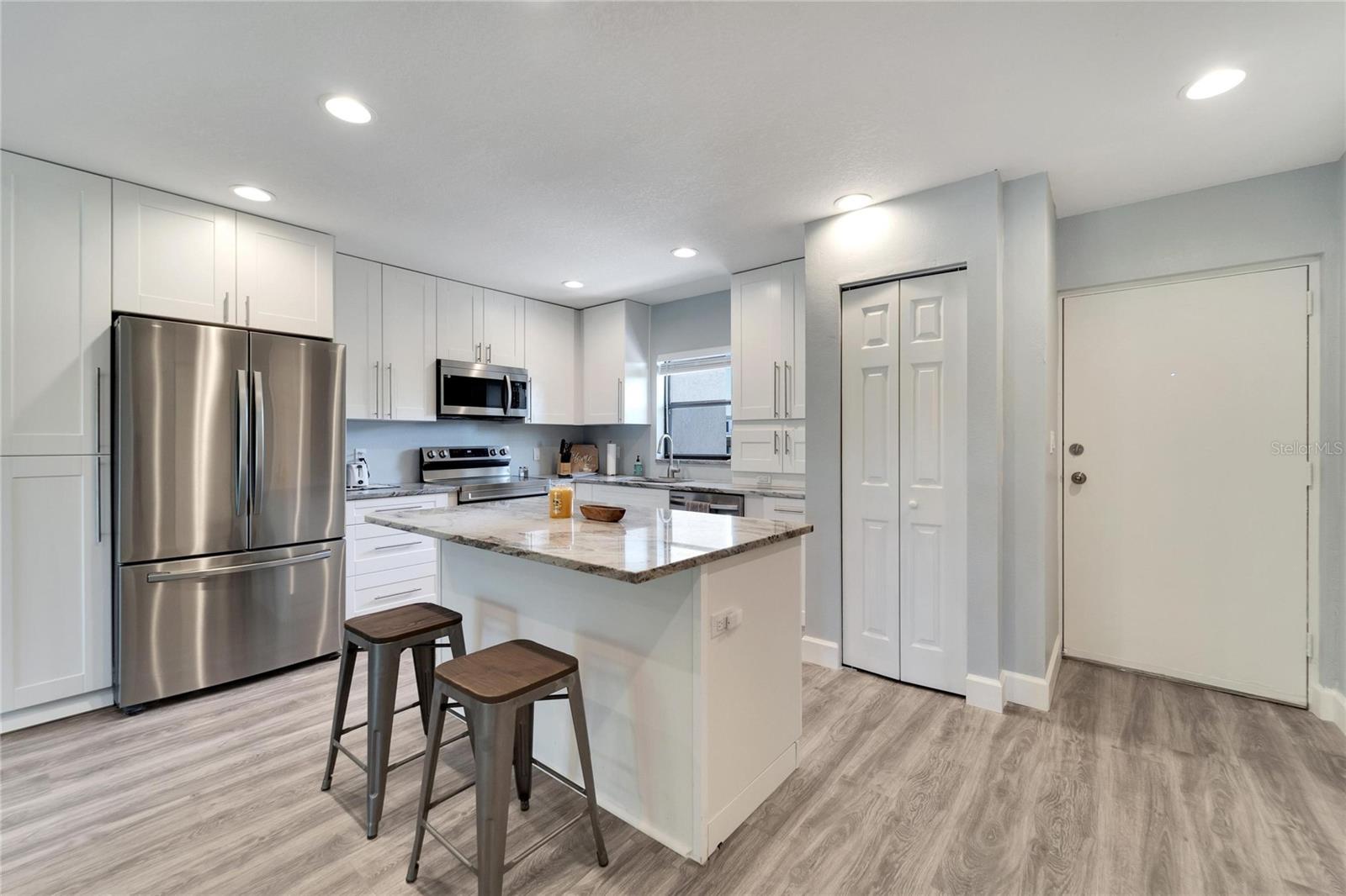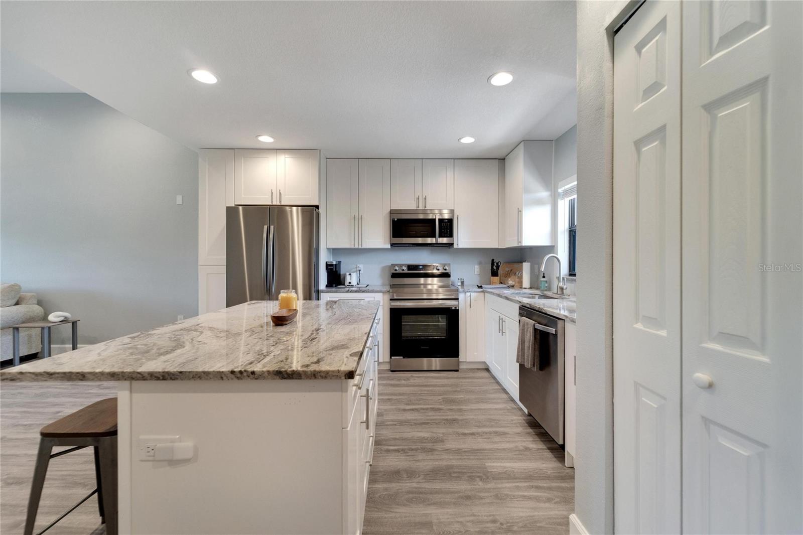Experience the epitome of modern living in this beautifully remodeled 1-bedroom, 1.5-bathroom condo, ideally located in the heart of South Pasadena. Meticulously updated with thoughtful design and premium finishes, this ground-floor unit stands apart from the rest, offering unparalleled convenience and style. What makes this home truly unique is its soaring ceilings—13 feet in the living room and 11 feet in the primary suite—made possible by its ground-level location. The result is a bright, open space that feels expansive and luxurious. The new waterproof luxury vinyl plank flooring throughout is as durable as it is stylish, complemented by sleek baseboards for a clean, contemporary look. The kitchen is a chef’s dream, featuring solid wood, soft-close shaker cabinets, a built-in pantry, and a stunning marble-topped island with abundant storage. Brand-new Samsung appliances complete this gourmet space, while a private washer and dryer are seamlessly integrated for ultimate convenience. The spacious primary suite is a retreat in itself, with vaulted ceilings, a custom walk-through closet, and a spa-like bathroom. Enjoy designer touches such as upgraded granite, chic tilework, and a high-end vanity. The full-size shower, adorned with a Super-HD glass door, elevates the entire experience. Additional features include a new sliding glass patio door, recessed lighting with dimmers, hurricane shutters, and an assigned parking space. The building offers a wealth of amenities, including a pool, hot tub, steam room, sauna, fitness center with pool views, library, game room, and party room. Step outside to discover nearby parks, tennis courts, and a Publix within walking distance—an unbeatable location for convenience and leisure. This exceptional condo is more than a home; it’s a lifestyle upgrade. Don’t miss this rare opportunity!