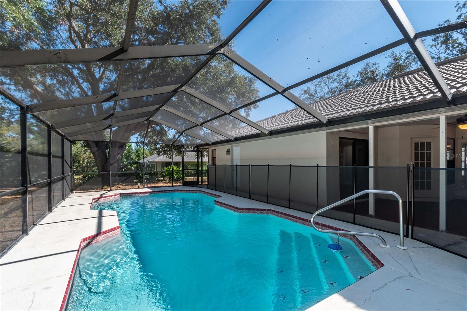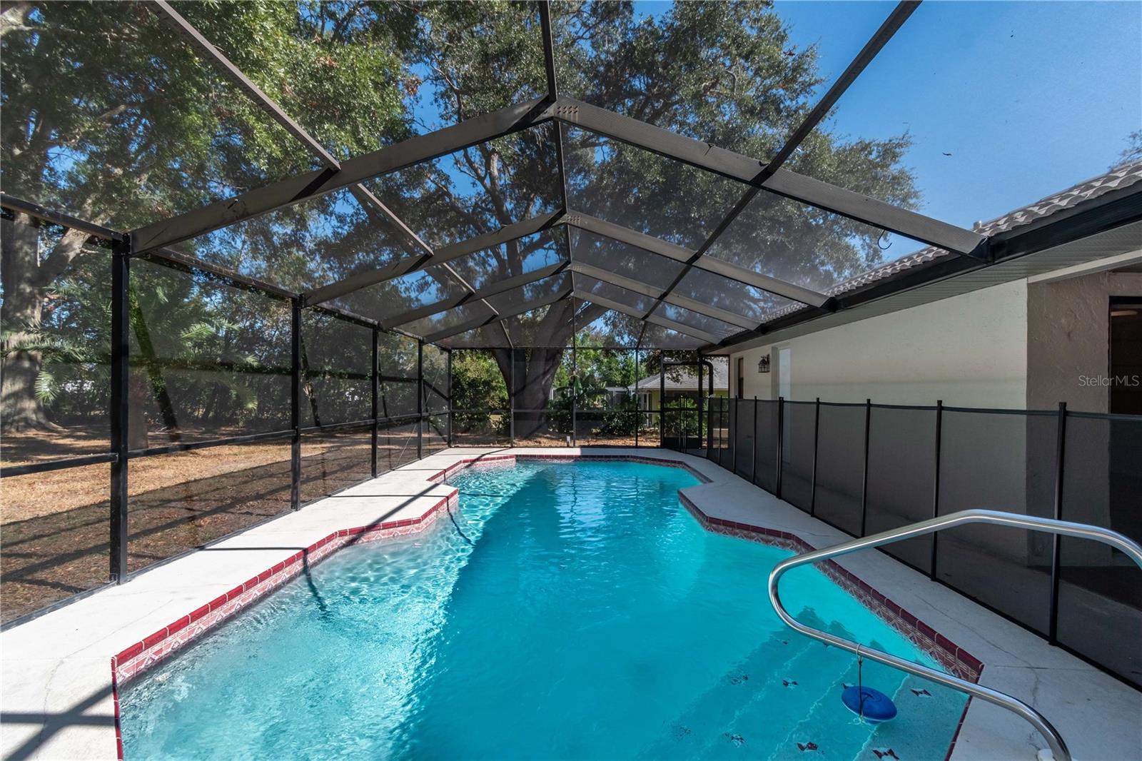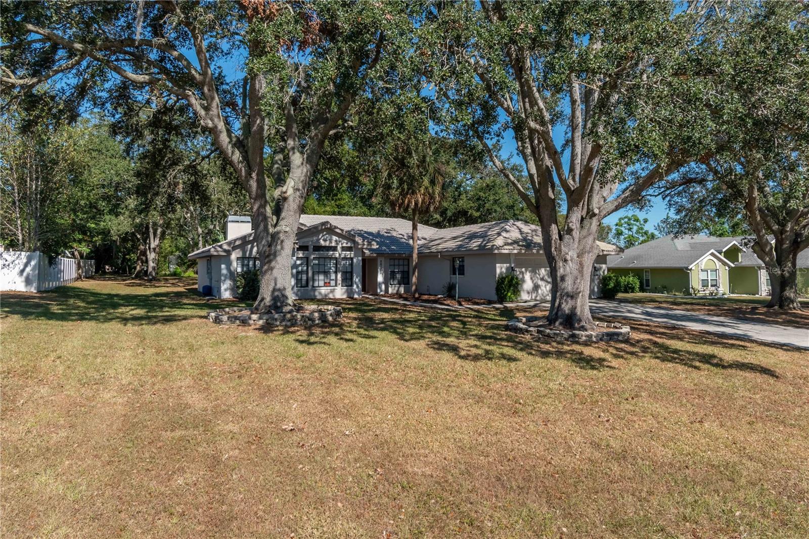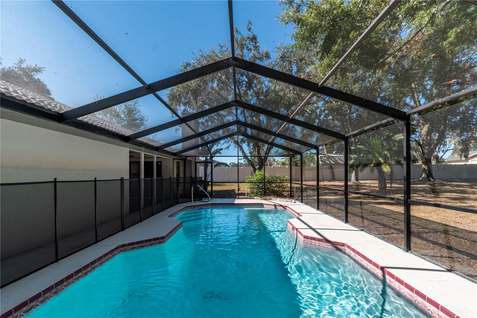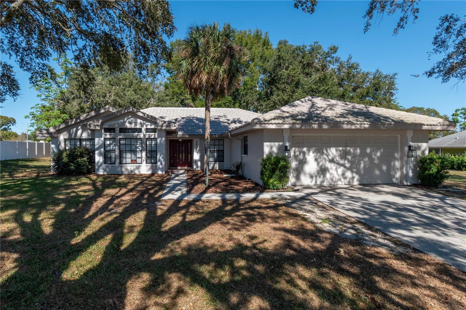 Back on the market! Don't miss out! Discover a rare gem: a 3-bedroom Spring Hill pool home, conveniently located just 5 minutes from the Suncoast Parkway in Springwood Estates, and with no HOA fees. This former model home sits on a vast .66-acre fenced lot with a barrel tile roof, recently painted interior and exterior, & luxury vinyl plank flooring throughout. Upon entering, you're greeted by a spacious foyer with French doors showing you a view of the pool area. Adjacent to the foyer is the formal living room with its high ceilings and expansive windows that provide the space with plenty of natural light. The kitchen is updated with new cabinets, stainless steel appliances and new countertops and has a breakfast bar & dinette area. The kitchen opens to the family room, complete with a wood-burning fireplace and sliding doors to the covered lanai and pool area. The bonus room could be used as a playroom, extra bedroom, or home office. The primary bedroom features a separate seating area with a view of the pool, a huge closet, a garden tub, and a separate shower. The primary bathroom offers pool access and functions as a pool bath. Both additional bedrooms are generously sized at 16' x 10'. The expansive backyard offers limitless possibilities with its mature trees providing shade and partial fencing for privacy. The covered lanai extends the living space, perfect for outdoor dining and entertainment. The screen-enclosed in-ground pool invites relaxation. Recent upgrades feature a new a/c unit in 2022, newer hot water heater, an irrigation well, and modern exterior light fixtures. All of this conveniently situated mere minutes from shopping, dining, schools and entertainment.