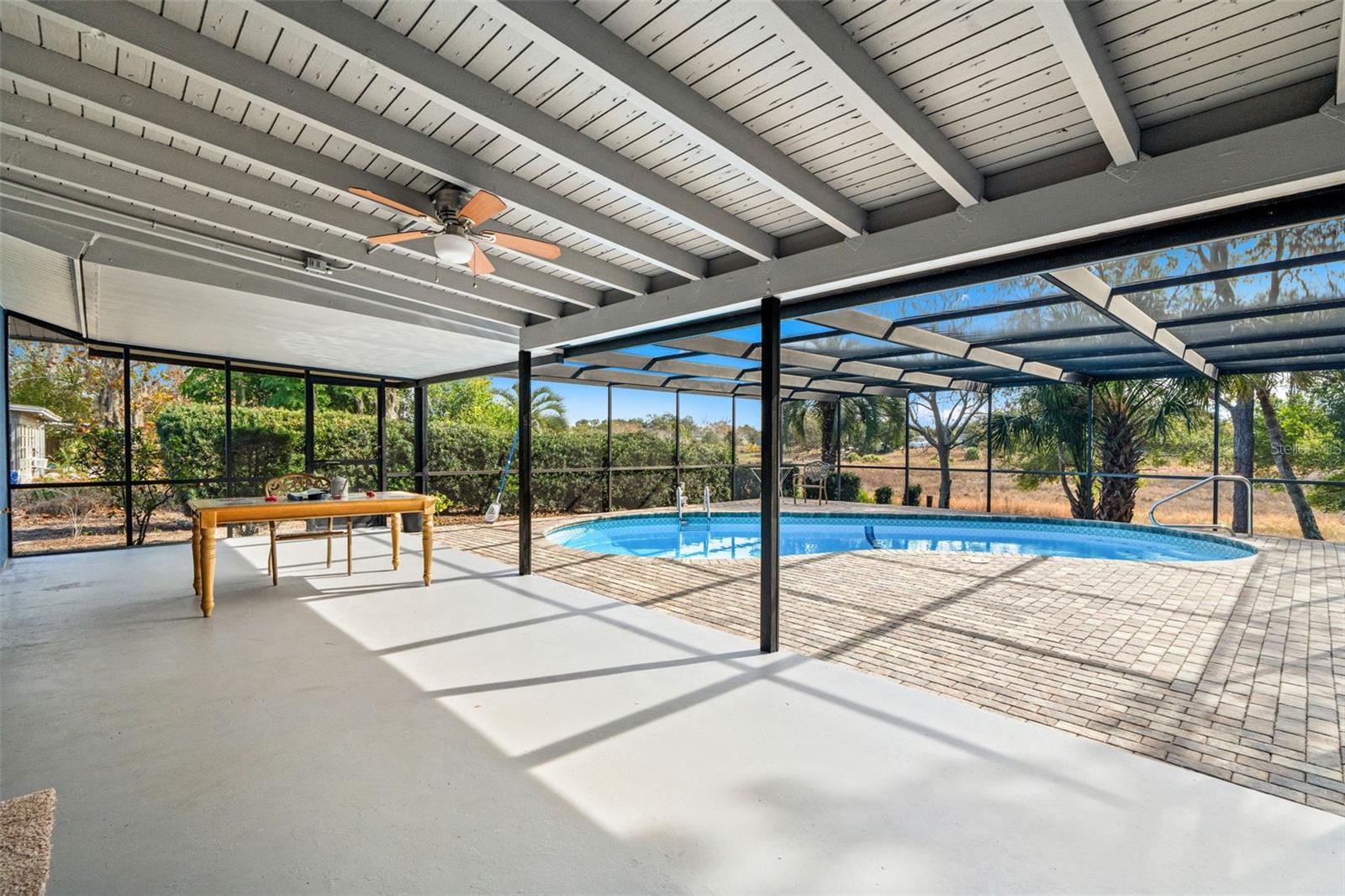 Move-in ready pool home featuring 3 bedrooms and 2 baths with a spacious open floor plan and open-concept design. Impressive double front doors welcome you into an airy, light-filled living area. All major updates are complete for peace of mind, including a new 2025 roof and newer A/C (HVAC). The desirable split-bedroom floor plan offers an oversized primary suite, while two secondary bedrooms share a convenient Jack-and-Jill bathroom. Enjoy a private backyard with no rear neighbors and a beautiful, scenic view. Outdoor living shines with a screened, sparkling pool, expansive paver lanai, and an additional paver patio perfect for entertaining. The updated, well-appointed kitchen features granite countertops, newer appliances, and modern finishes. Unique style, low-maintenance pavers, and a flexible layout deliver comfort, convenience, and curb appeal—ideal for buyers seeking an open floor plan, split plan, private backyard, and upgraded kitchen.