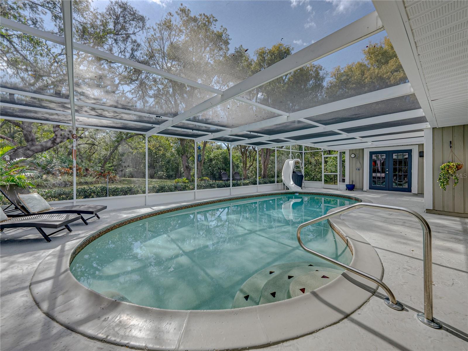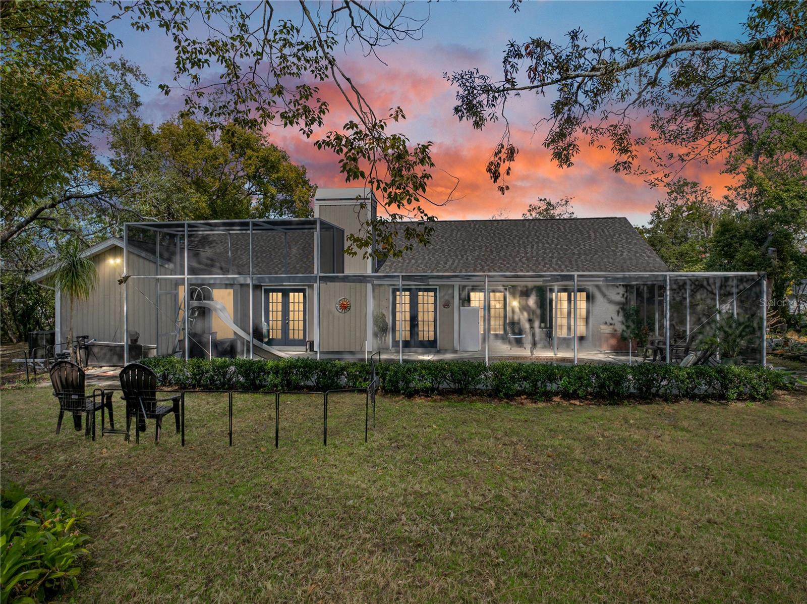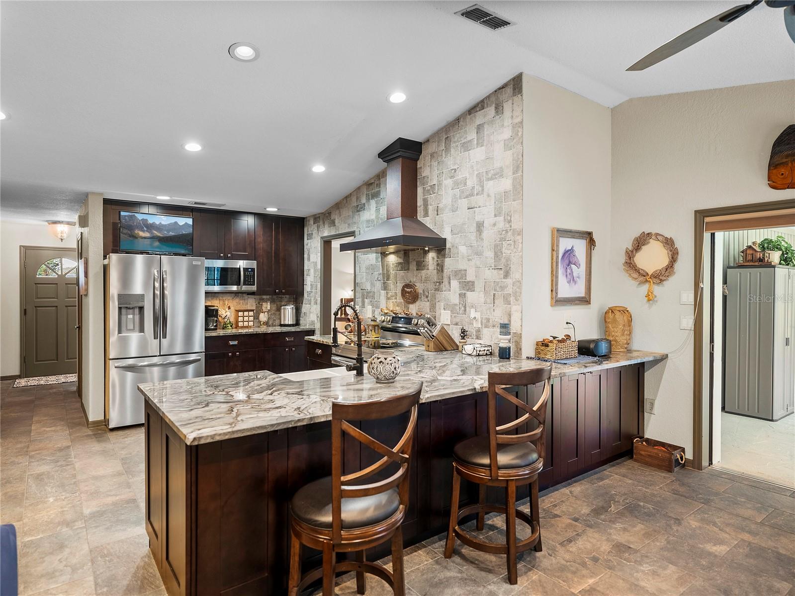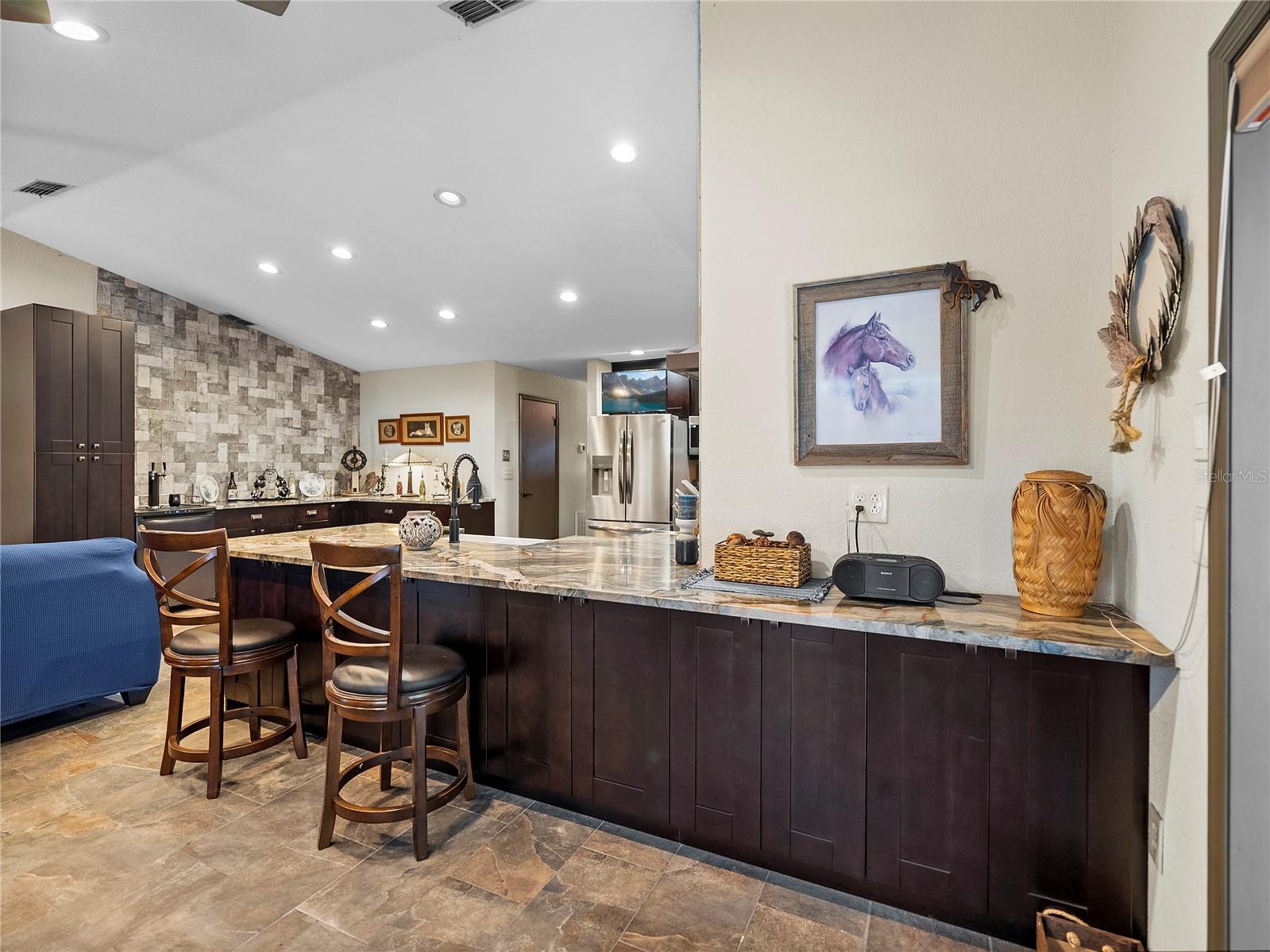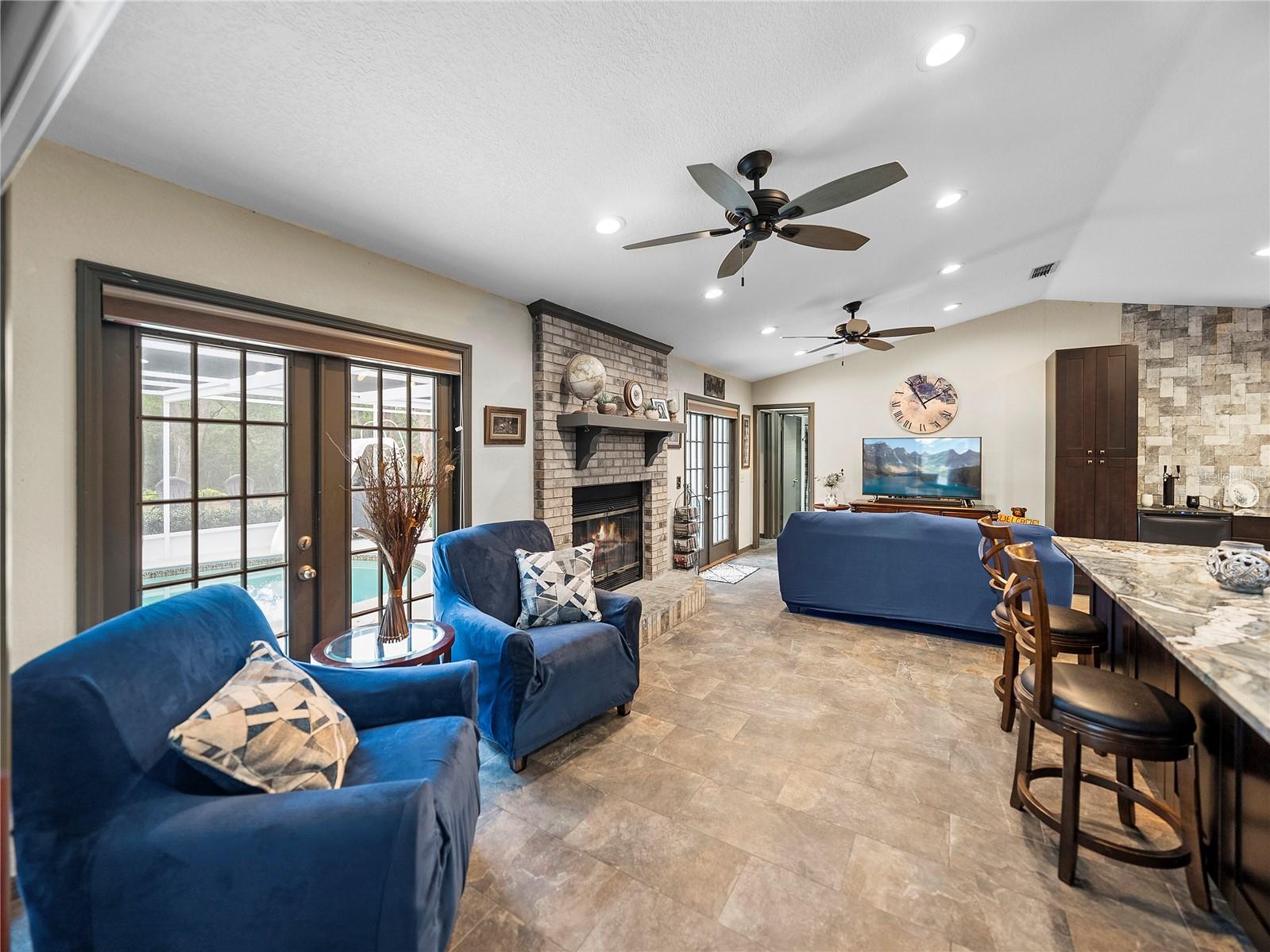 RARE DOUBLE LOT POOL HOME WITH AN ABUNDANCE OF MATURE LANDSCAPING FOR THE ULTIMATE PRIVATE OASIS-OR YOU CAN SPLIT THIS DOUBLE LOT INTO TWO LOTS WITH ENDLESS OPTIONS AND OPPORTUNITIES! Welcome to this absolutely stunning 3 bedroom, 2 bath, 2 car garage residence, meticulously maintained with a 2022 ROOF, a 2021 AC, and a host of other updates. As you step inside, you are greeted by the warm charm of imported Spanish porcelain tile flooring that flows seamlessly throughout the entire home. The spacious living room, featuring plenty of natural light through large windows, invites you to relax and unwind. An intimate but combined dining area flows into the kitchen and provides easy access to the serene pool area through French doors. The heart of this home, the chef’s kitchen is a true standout, with top-of-the-line Van Gogh granite countertops, custom wood soft-closing cabinets, and a unique hammered copper range hood set against a custom 90-degree herringbone pattern stone backsplash. Equipped with 2023 stainless steel appliances, a farmhouse sink, dual-tap kegerator, coffee bar, and a large walk-in pantry, this kitchen is as functional as it is beautiful! Overlooking the kitchen, a spacious family room invites entertaining with high vaulted ceilings, a brick-faced gas fireplace with a new insert, 2 seating areas, and several pool deck access points, including 2 sets of French doors and a sliding glass door. The primary suite offers a peaceful retreat with an expansive walk-in closet and a private ensuite bathroom complete with a walk-in shower, a new vanity, and a stone countertop. The guest bedrooms are on the opposite side of the home and are generously sized, each featuring large closets and sharing a guest bathroom with a newer tub/shower combo and a new vanity. Step outside to discover your own private paradise. The peaceful pool deck is surrounded by trees and features a resurfaced pool with a slide, a newer pool heater, and newer screens around the lanai. There’s also a hot tub, perfect for relaxing. The outdoor space is beautifully landscaped with mature trees, well-maintained garden areas, and various seating options, including a brick-built grill! Additional outdoor features include a custom-painted shed, and the property is fully irrigated for a lush, green lawn. Recent upgrades include a new roof (2022), new AC (2021), upgraded electrical system, new bathroom vanities, a fresh coat of exterior paint (2022), and much more. With all of these upgrades, unique features, and a convenient location near shoppings, restaurants, medical centers, and major highways- this property is truly a one-of-a-kind residence. Call us today for your private viewing!