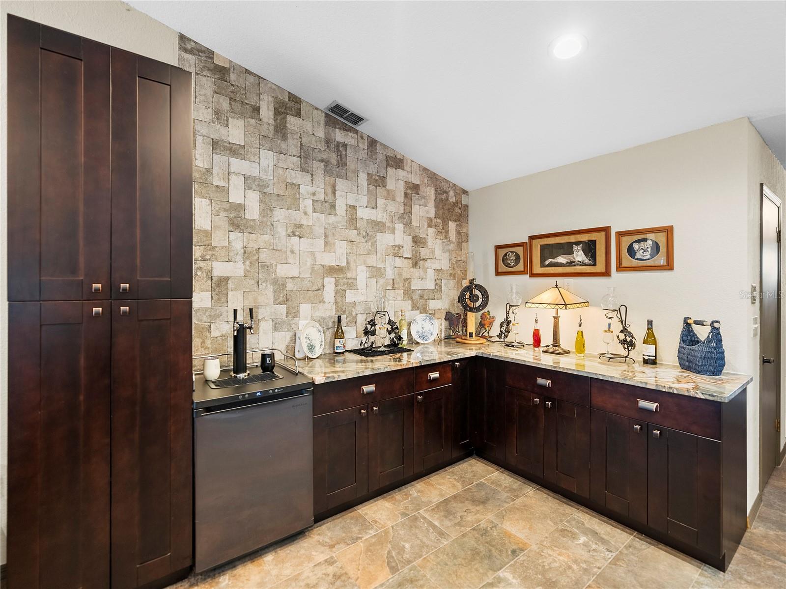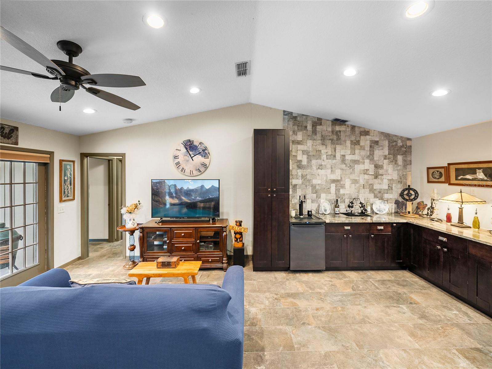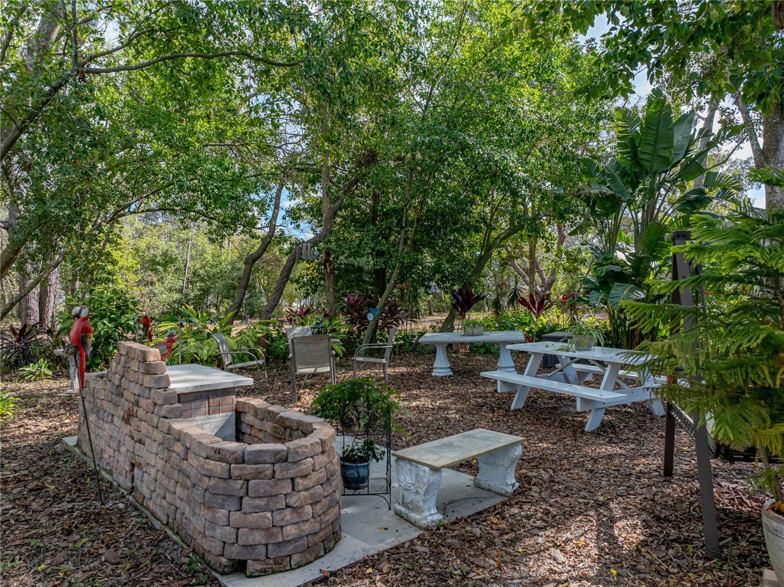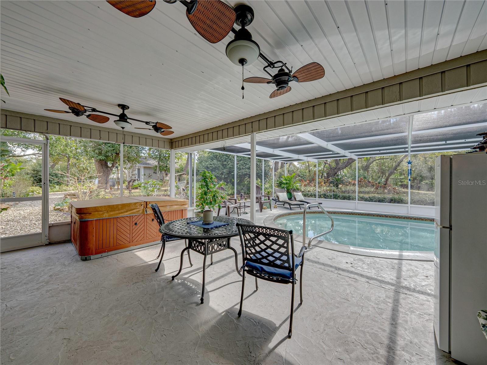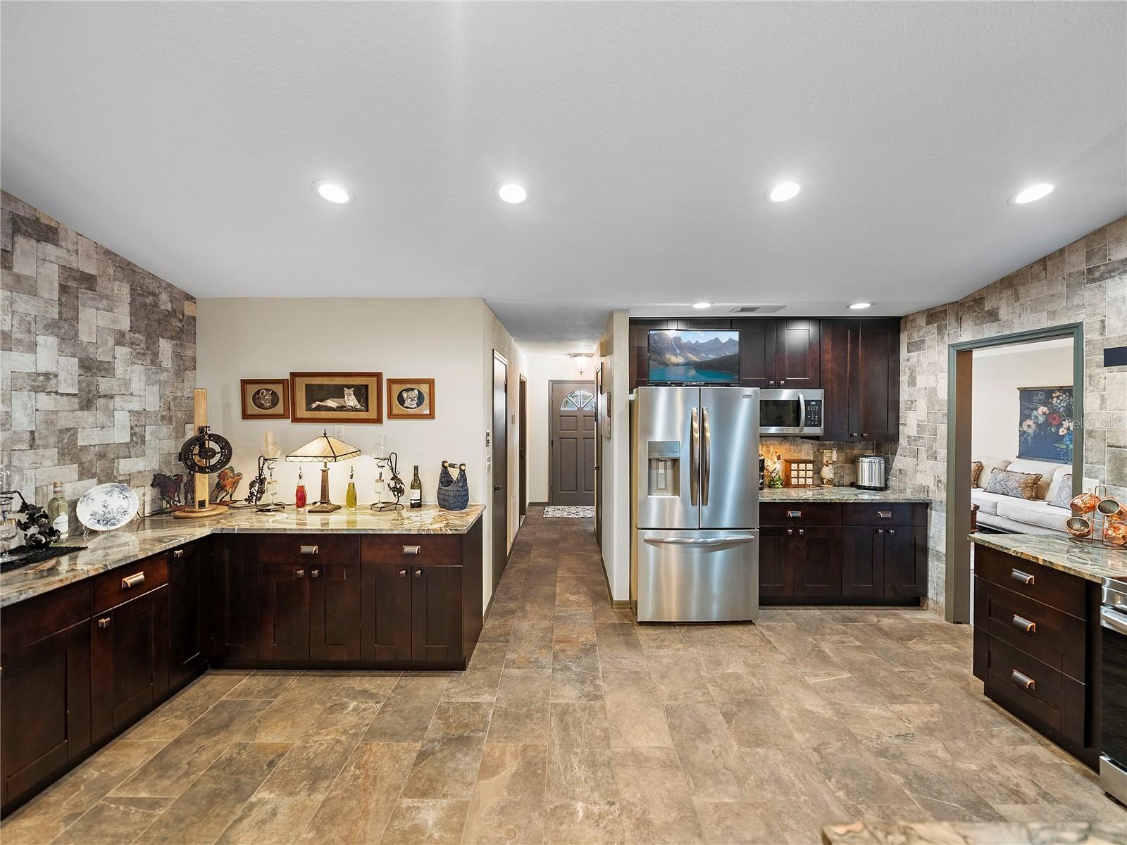 RARE DOUBLE LOT POOL HOME WITH AN ABUNDANCE OF MATURE LANDSCAPING FOR THE ULTIMATE PRIVATE OASIS-OR YOU CAN SPLIT THIS DOUBLE LOT INTO TWO LOTS WITH ENDLESS OPTIONS AND OPPORTUNITIES! Welcome to this absolutely stunning 3 bedroom, 2 bath, 2 car garage residence, meticulously maintained with a 2022 ROOF, a 2021 AC, and a host of other updates. As you step inside, you are greeted by the warm charm of imported Spanish porcelain tile flooring that flows seamlessly throughout the entire home. The spacious living room, featuring plenty of natural light through large windows, invites you to relax and unwind. An intimate but combined dining area flows into the kitchen and provides easy access to the serene pool area through French doors. The heart of this home, the chef’s kitchen is a true standout, with top-of-the-line Van Gogh granite countertops, custom wood soft-closing cabinets, and a unique hammered copper range hood set against a custom 90-degree herringbone pattern stone backsplash. Equipped with 2023 stainless steel appliances, a farmhouse sink, dual-tap kegerator, coffee bar, and a large walk-in pantry, this kitchen is as functional as it is beautiful! Overlooking the kitchen, a spacious family room invites entertaining with high vaulted ceilings, a brick-faced gas fireplace with a new insert, 2 seating areas, and several pool deck access points, including 2 sets of French doors and a sliding glass door. The primary suite offers a peaceful retreat with an expansive walk-in closet and a private ensuite bathroom complete with a walk-in shower, a new vanity, and a stone countertop. The guest bedrooms are on the opposite side of the home and are generously sized, each featuring large closets and sharing a guest bathroom with a newer tub/shower combo and a new vanity. Step outside to discover your own private paradise. The peaceful pool deck is surrounded by trees and features a resurfaced pool with a slide, a newer pool heater, and newer screens around the lanai. There’s also a hot tub, perfect for relaxing. The outdoor space is beautifully landscaped with mature trees, well-maintained garden areas, and various seating options, including a brick-built grill! Additional outdoor features include a custom-painted shed, and the property is fully irrigated for a lush, green lawn. Recent upgrades include a new roof (2022), new AC (2021), upgraded electrical system, new bathroom vanities, a fresh coat of exterior paint (2022), and much more. With all of these upgrades, unique features, and a convenient location near shoppings, restaurants, medical centers, and major highways- this property is truly a one-of-a-kind residence. Call us today for your private viewing!