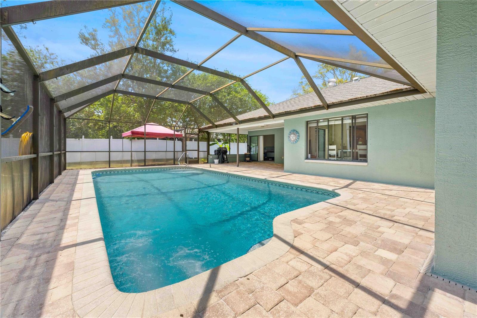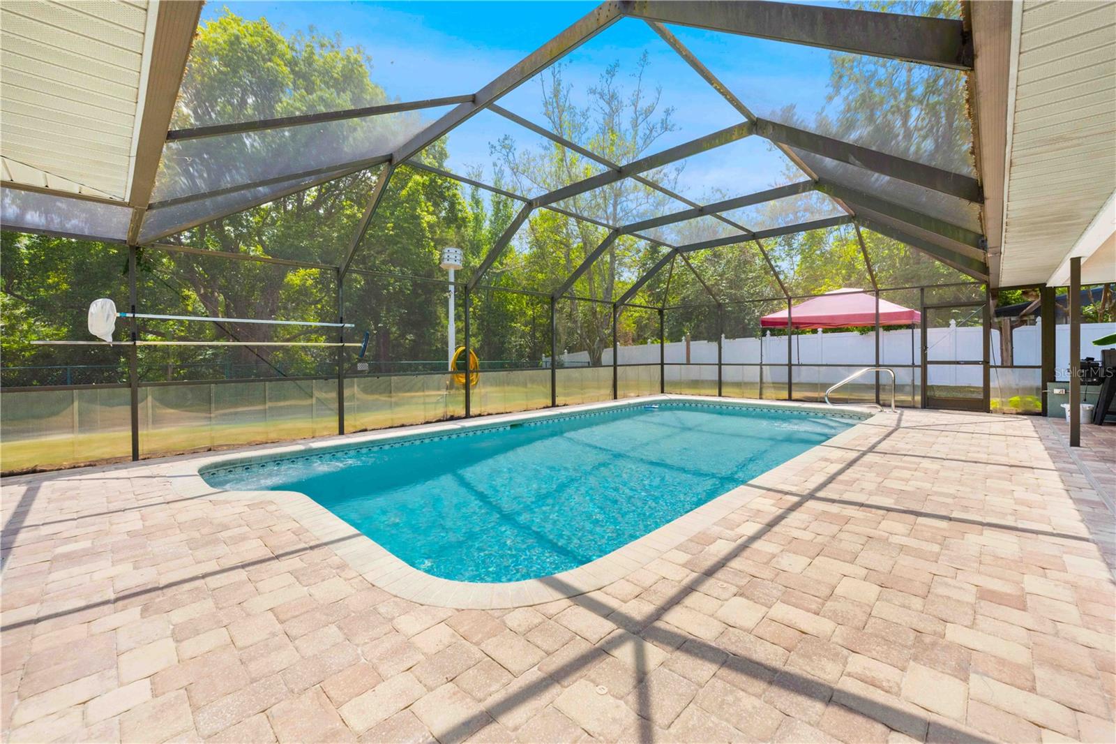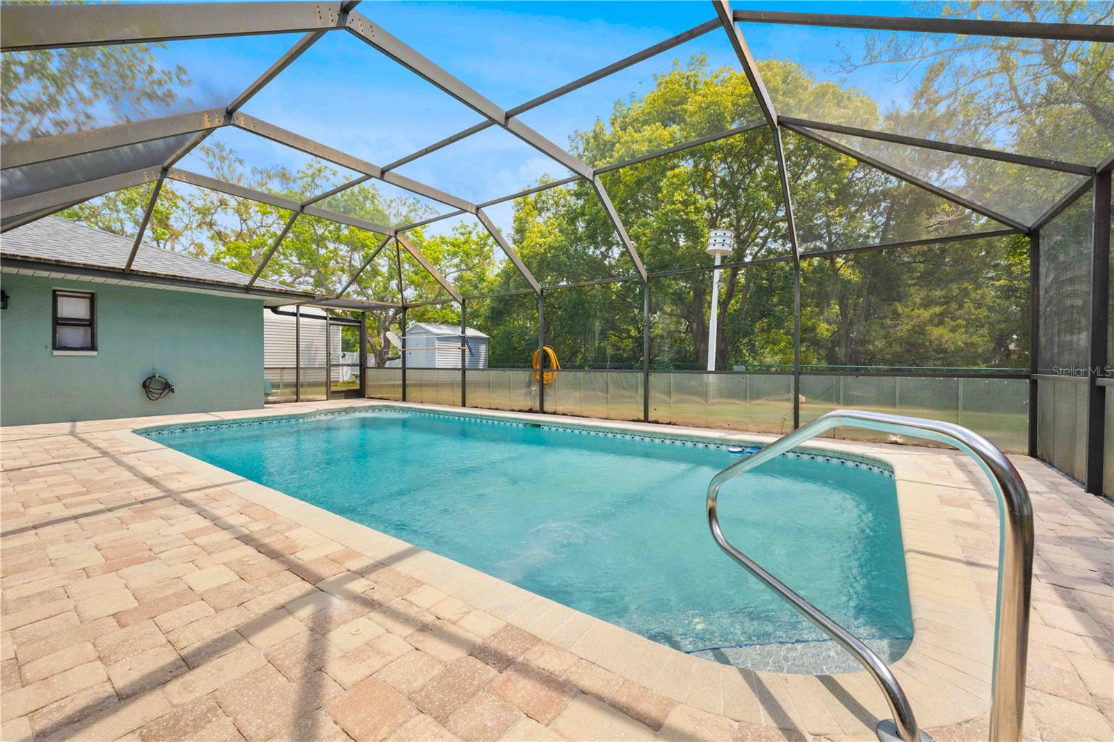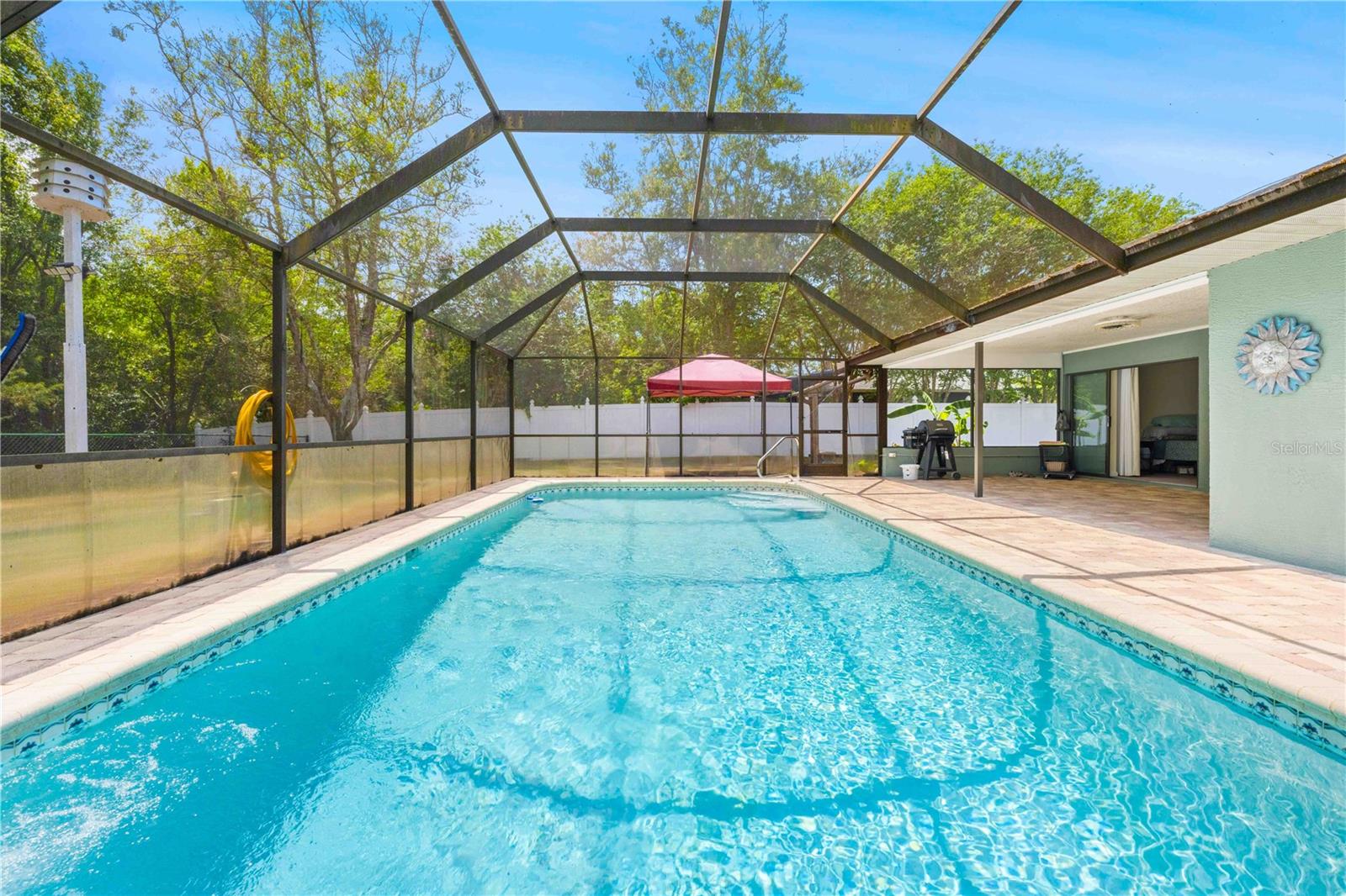 Immaculate 4-Bedroom, 3-Bath Pool Home with Canal View & Upgrades! This beautifully maintained split-plan 4-bedroom, 3-bathroom pool home offers both space and flexibility, perfect for families or multi-generational living. From the moment you enter, you're welcomed into a formal living and dining room, with the spacious master suite located just off the dining area for added privacy. The remodeled master bathroom features elegant quartz countertops and updated finishes. Continue through the foyer to the open-concept family room, updated kitchen, and casual dining area. The remodeled kitchen boasts granite countertops, newer stainless-steel appliances, and plenty of cabinetry. Two generously sized guest bedrooms and a shared full bath are located on one side of the home, while a fourth bedroom and third bathroom are tucked away at the back of the home. This area can be closed off with a pocket door, making it ideal for guests, a home office, or in-law suite. It also features private access to the pool. Enjoy the best of Florida living with a 15x30 screened, caged pool surrounded by brick pavers, powered by a Rheem heat pump. The backyard is fully fenced and overlooks a freshwater canal leading to Bluesink Pond, offering a peaceful natural backdrop and birdwatching opportunities. A spacious 8x10 shed provides additional storage. The property also includes a beautifully landscaped exterior, fresh paint, decorative curbing, and a full irrigation system supplied by an irrigation well. Major updates include a new roof (2021), new drain field (2024), and a grouted, repaired sinkhole with a transferable balance of a 20-year warranty for added peace of mind. The brick-paver driveway complements the pool deck, adding curb appeal and functionality. This home checks all the boxes: space, updates, outdoor living, and a location that combines nature with convenience. Don’t miss your chance to see this exceptional property—schedule your showing today!--