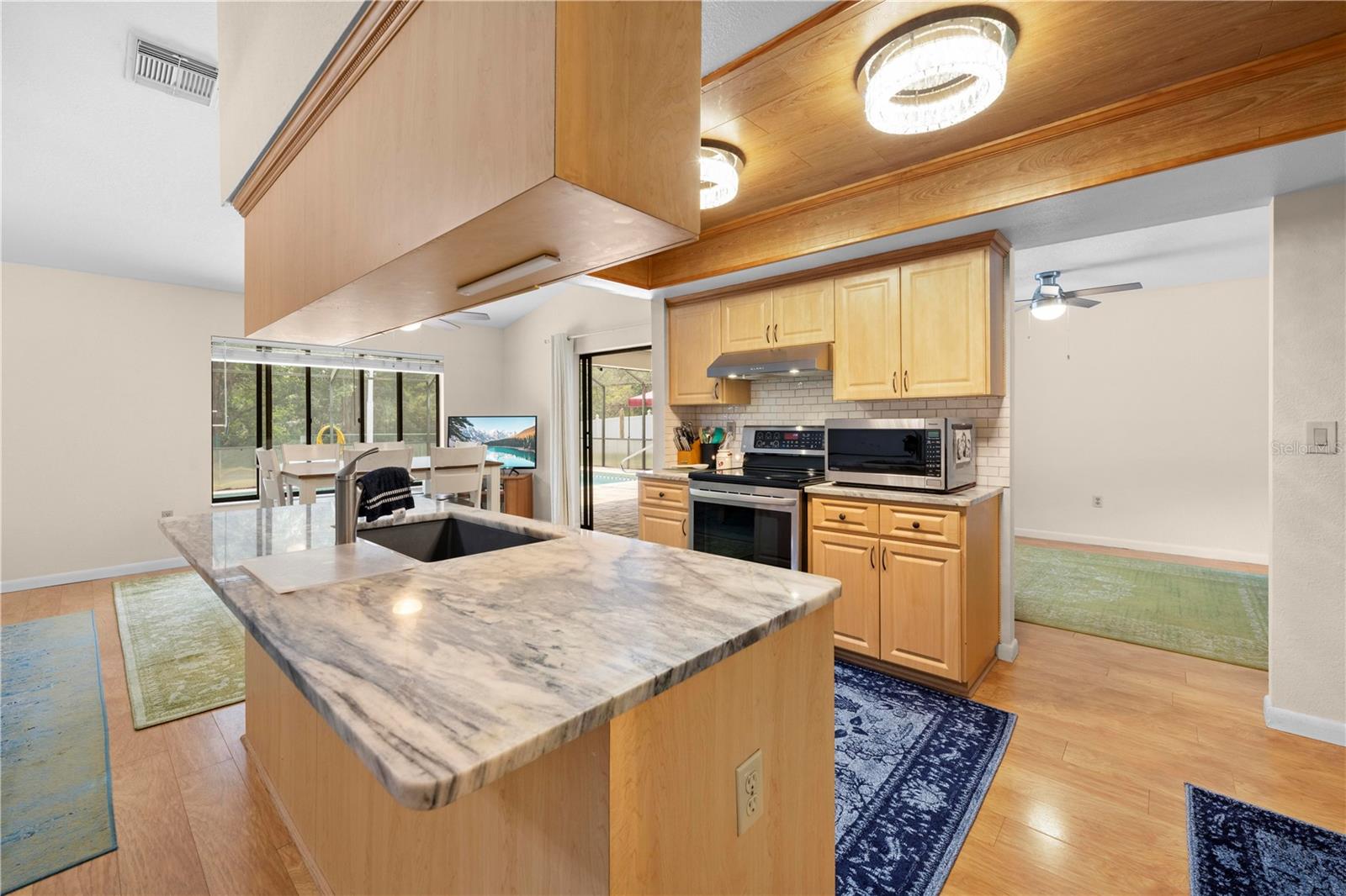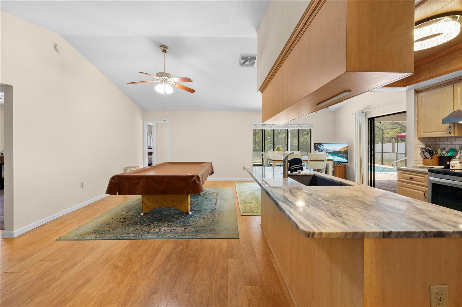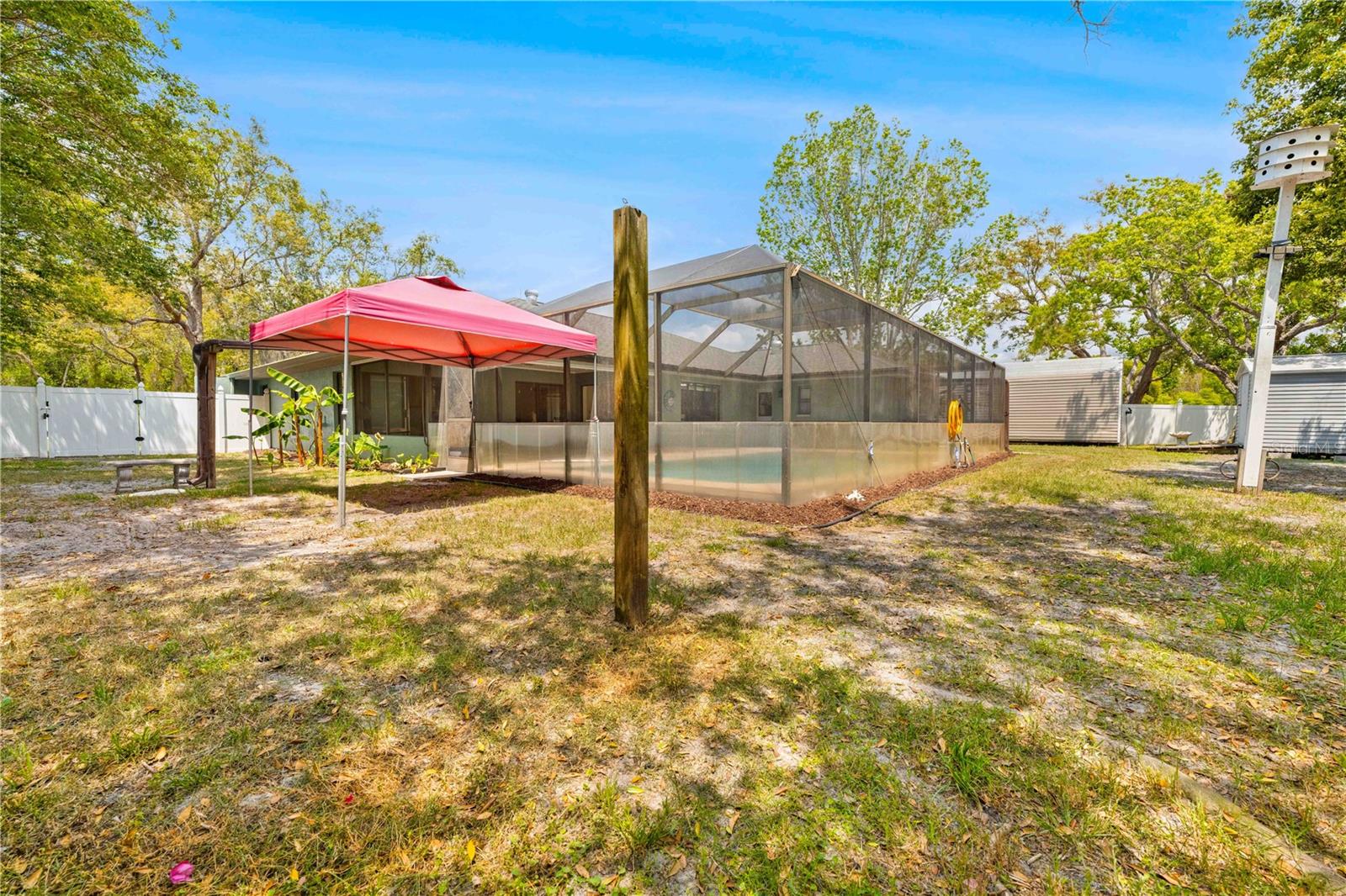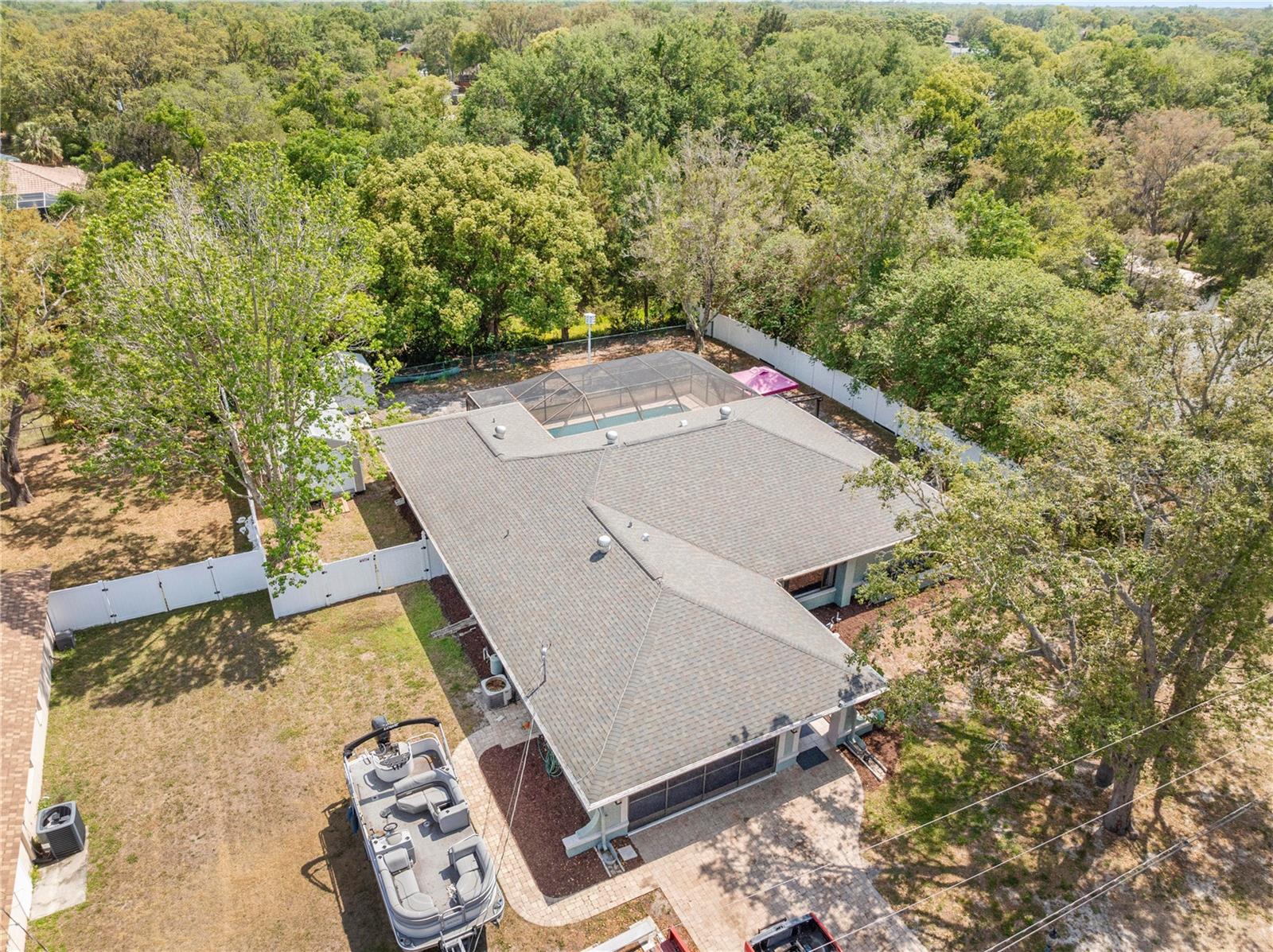 Immaculate 4-Bedroom, 3-Bath Pool Home with Canal View & Upgrades! This beautifully maintained split-plan 4-bedroom, 3-bathroom pool home offers both space and flexibility, perfect for families or multi-generational living. From the moment you enter, you're welcomed into a formal living and dining room, with the spacious master suite located just off the dining area for added privacy. The remodeled master bathroom features elegant quartz countertops and updated finishes. Continue through the foyer to the open-concept family room, updated kitchen, and casual dining area. The remodeled kitchen boasts granite countertops, newer stainless-steel appliances, and plenty of cabinetry. Two generously sized guest bedrooms and a shared full bath are located on one side of the home, while a fourth bedroom and third bathroom are tucked away at the back of the home. This area can be closed off with a pocket door, making it ideal for guests, a home office, or in-law suite. It also features private access to the pool. Enjoy the best of Florida living with a 15x30 screened, caged pool surrounded by brick pavers, powered by a Rheem heat pump. The backyard is fully fenced and overlooks a freshwater canal leading to Bluesink Pond, offering a peaceful natural backdrop and birdwatching opportunities. A spacious 8x10 shed provides additional storage. The property also includes a beautifully landscaped exterior, fresh paint, decorative curbing, and a full irrigation system supplied by an irrigation well. Major updates include a new roof (2021), new drain field (2024), and a grouted, repaired sinkhole with a transferable balance of a 20-year warranty for added peace of mind. The brick-paver driveway complements the pool deck, adding curb appeal and functionality. This home checks all the boxes: space, updates, outdoor living, and a location that combines nature with convenience. Don’t miss your chance to see this exceptional property—schedule your showing today!--