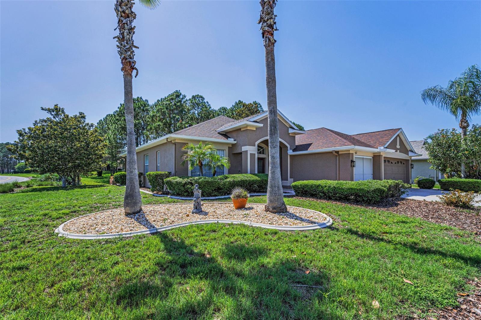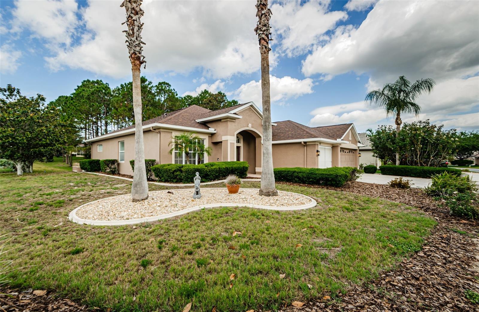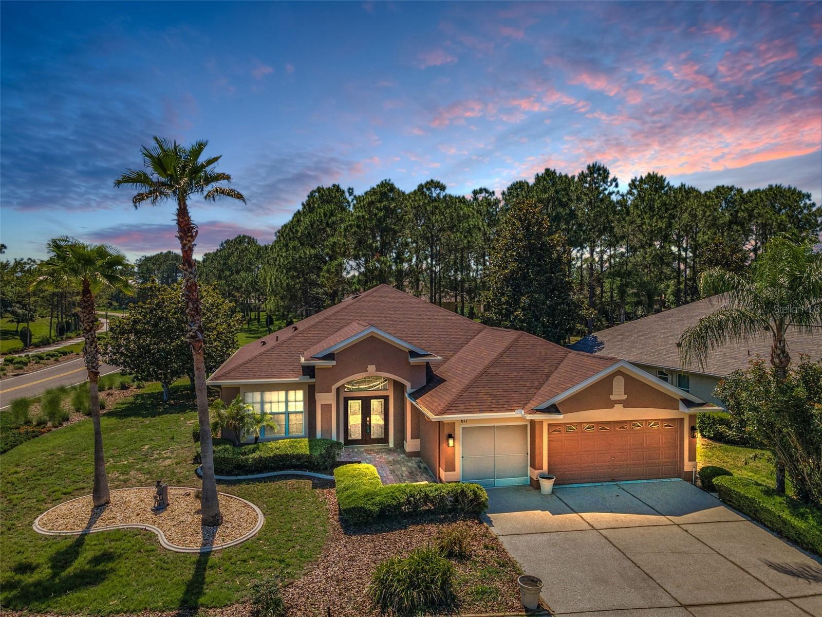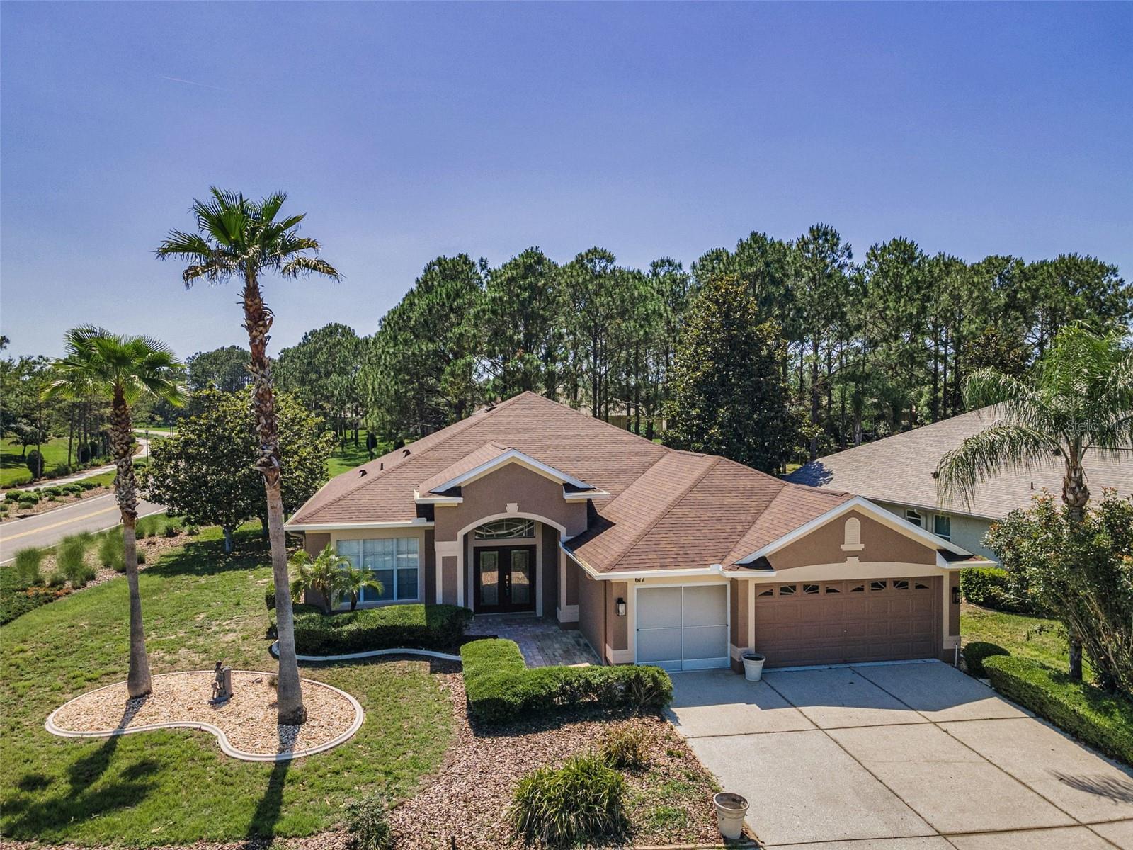 Welcome to this stunning Remington model in the highly sought-after Wellington at Seven Hills, a guard-gated 55+ community with 24/7 security patrol. This home has had only one owner and was meticulously maintained. This move-in ready open floorplan offers 4-bedroom, 3-bathroom, 3-car garage home is situated on a premium corner lot with no rear neighbors, offering serene, wooded views. Recently updated in 2025, this home features a new roof replaced in March of 2025 with a transferable warranty, new HVAC system 4/25 also has a warranty, a new water heater, interior and exterior paint, new carpet in the family room and a new dryer. The washer and microwave convection oven are less than a year old. The kitchen is a chef’s delight, featuring granite countertops, custom backsplash, stainless steel appliances, 42-inch wood cabinets with pull-out shelving, a tray ceiling, a closet pantry, and a cozy breakfast nook. The adjacent spacious family room includes eight-foot-high sliding doors to the extended screened lanai with tile flooring and a ceiling fan—perfect for indoor-outdoor living. The thoughtfully designed split-bedroom layout offers privacy and flexibility. The primary suite includes sliding doors to the lanai, tray ceiling, two large closets (one walk-in), and a luxurious en-suite bath with a garden tub, walk-in shower, and 36-inch dual wood vanities with Corian countertops. Bedrooms 2 and 3 are located in a private wing and share a full bath, while bedroom 4 is adjacent to a third full bath with lanai access, all featuring 36-inch wood cabinets and Corian countertops, ideal for guests or multigenerational living. The utility room includes cabinets and a new oversized stainless-steel sink, a new dryer (2025), and a washer less than a year old. Additional highlights include keyless entry, Ring doorbell, security system, gutters, Pest tubes in walls, cement curbed plant beds, single garage door screen, extended brick paver walkway and cement patio off the lanai, and an irrigation system serviced in 2025. Enjoy this beautifully updated home in a vibrant, amenity-rich community offering a clubhouse, Wellington’s Bar & Grill Restaurant, pool, spa fitness center, pickleball, tennis, bocce, billiards, and endless social activities.