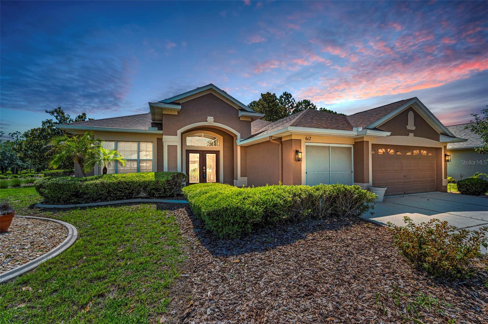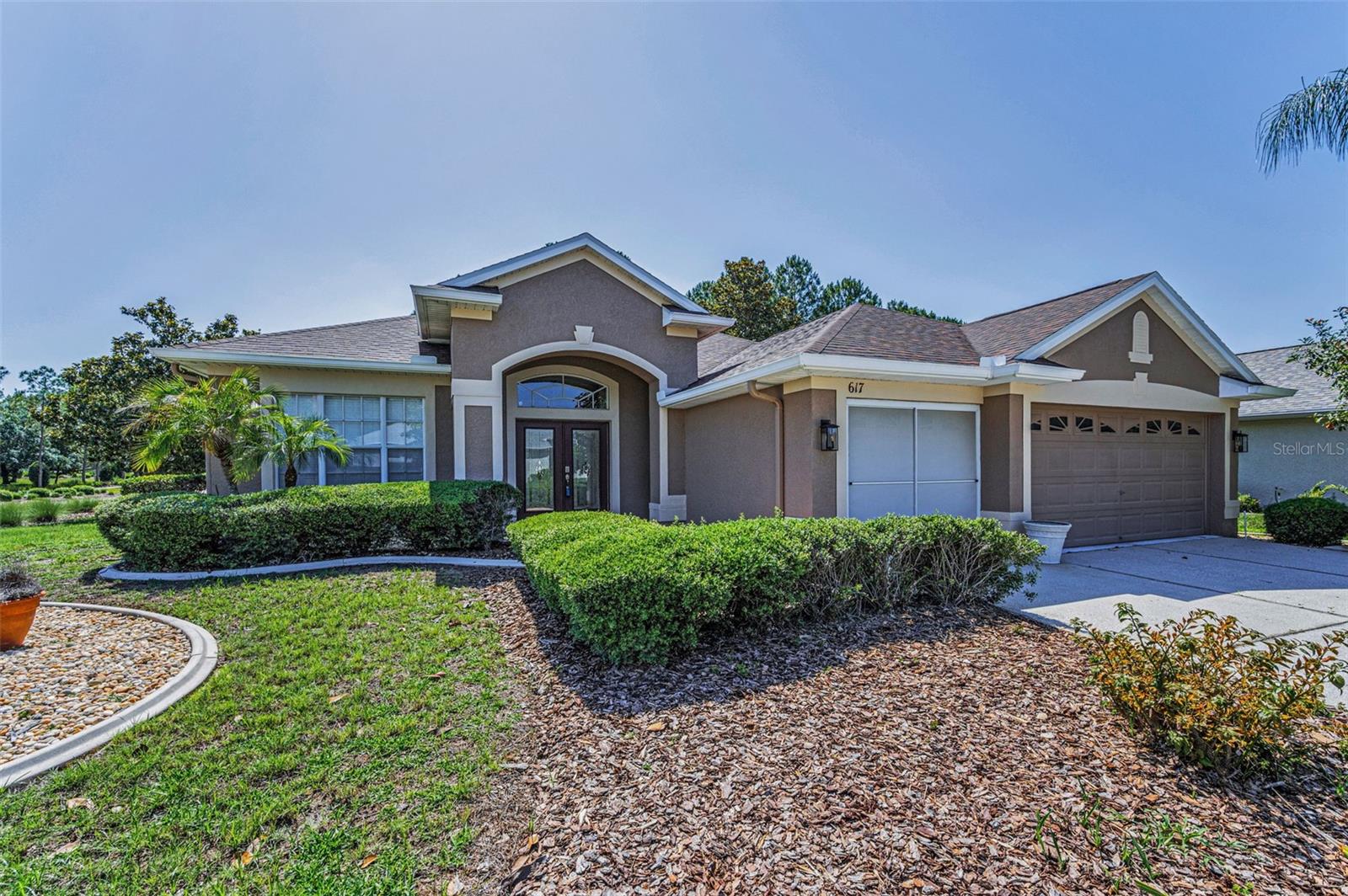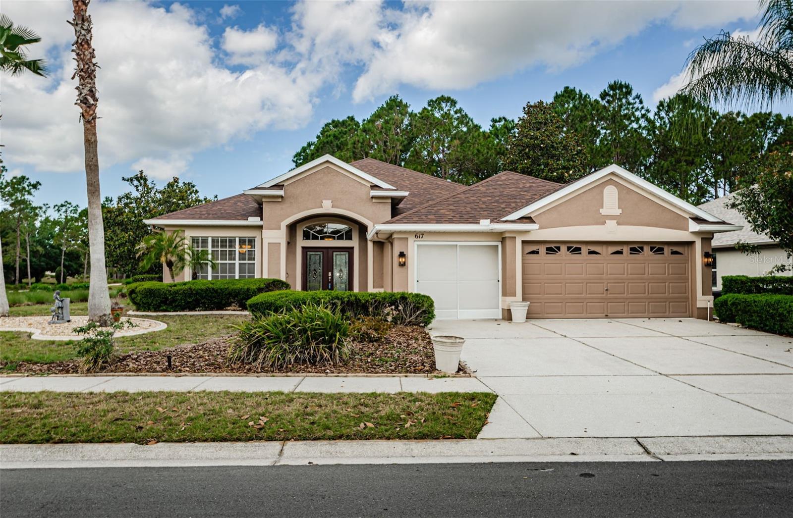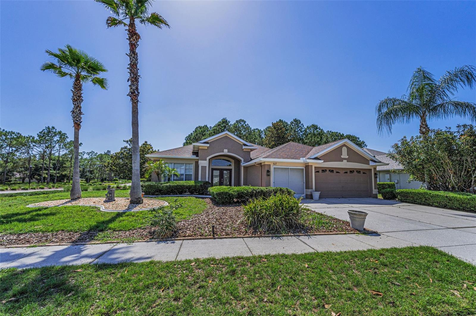 Welcome to this stunning Remington model in the highly sought-after Wellington at Seven Hills, a guard-gated 55+ community with 24/7 security patrol. This home has had only one owner and was meticulously maintained. This move-in ready open floorplan offers 4-bedroom, 3-bathroom, 3-car garage home is situated on a premium corner lot with no rear neighbors, offering serene, wooded views. Recently updated in 2025, this home features a new roof replaced in March of 2025 with a transferable warranty, new HVAC system 4/25 also has a warranty, a new water heater, interior and exterior paint, new carpet in the family room and a new dryer. The washer and microwave convection oven are less than a year old. The kitchen is a chef’s delight, featuring granite countertops, custom backsplash, stainless steel appliances, 42-inch wood cabinets with pull-out shelving, a tray ceiling, a closet pantry, and a cozy breakfast nook. The adjacent spacious family room includes eight-foot-high sliding doors to the extended screened lanai with tile flooring and a ceiling fan—perfect for indoor-outdoor living. The thoughtfully designed split-bedroom layout offers privacy and flexibility. The primary suite includes sliding doors to the lanai, tray ceiling, two large closets (one walk-in), and a luxurious en-suite bath with a garden tub, walk-in shower, and 36-inch dual wood vanities with Corian countertops. Bedrooms 2 and 3 are located in a private wing and share a full bath, while bedroom 4 is adjacent to a third full bath with lanai access, all featuring 36-inch wood cabinets and Corian countertops, ideal for guests or multigenerational living. The utility room includes cabinets and a new oversized stainless-steel sink, a new dryer (2025), and a washer less than a year old. Additional highlights include keyless entry, Ring doorbell, security system, gutters, Pest tubes in walls, cement curbed plant beds, single garage door screen, extended brick paver walkway and cement patio off the lanai, and an irrigation system serviced in 2025. Enjoy this beautifully updated home in a vibrant, amenity-rich community offering a clubhouse, Wellington’s Bar & Grill Restaurant, pool, spa fitness center, pickleball, tennis, bocce, billiards, and endless social activities.