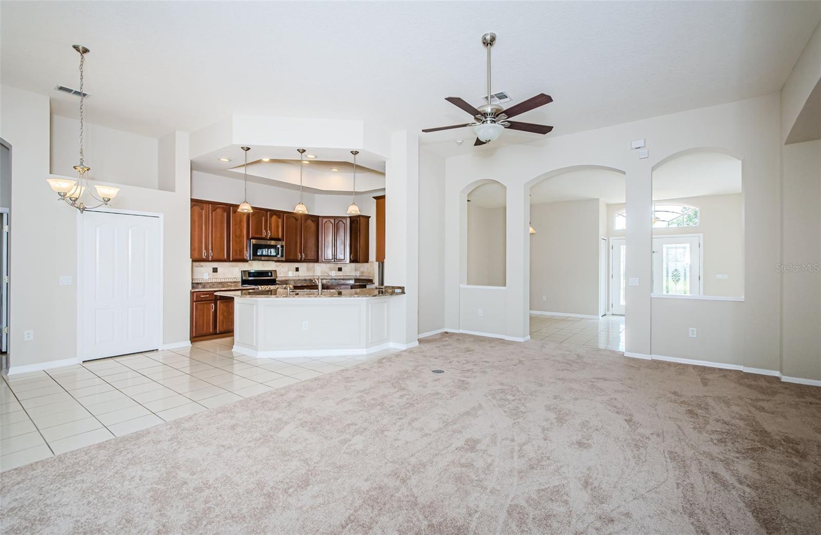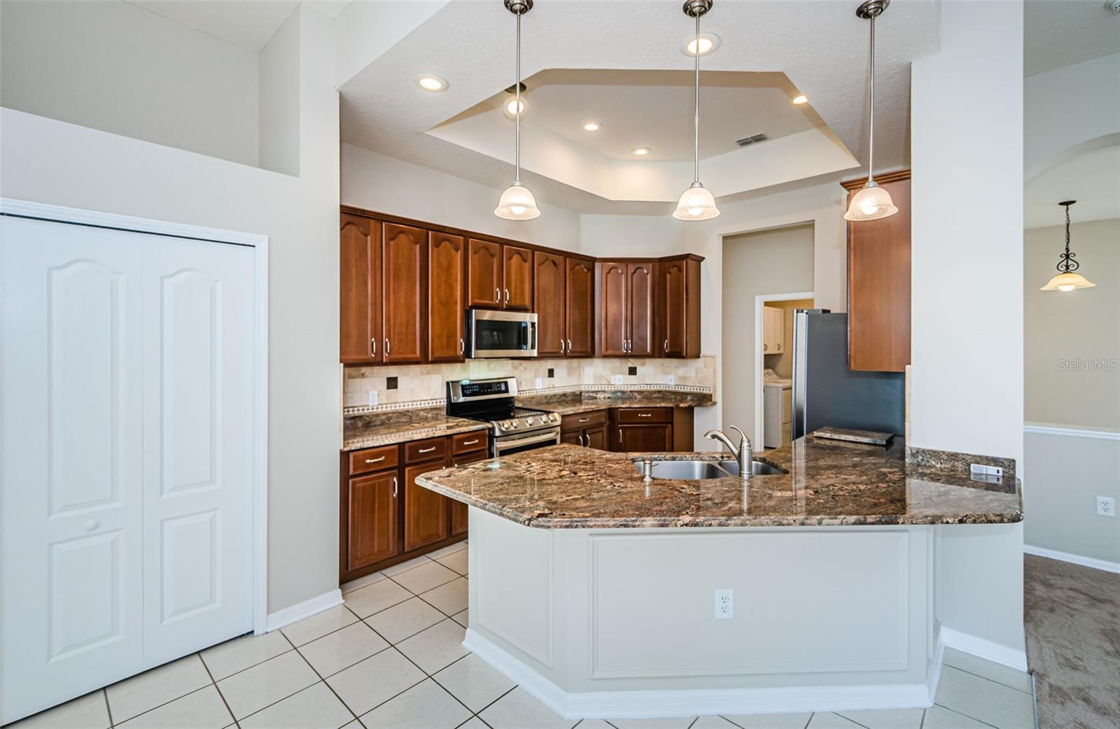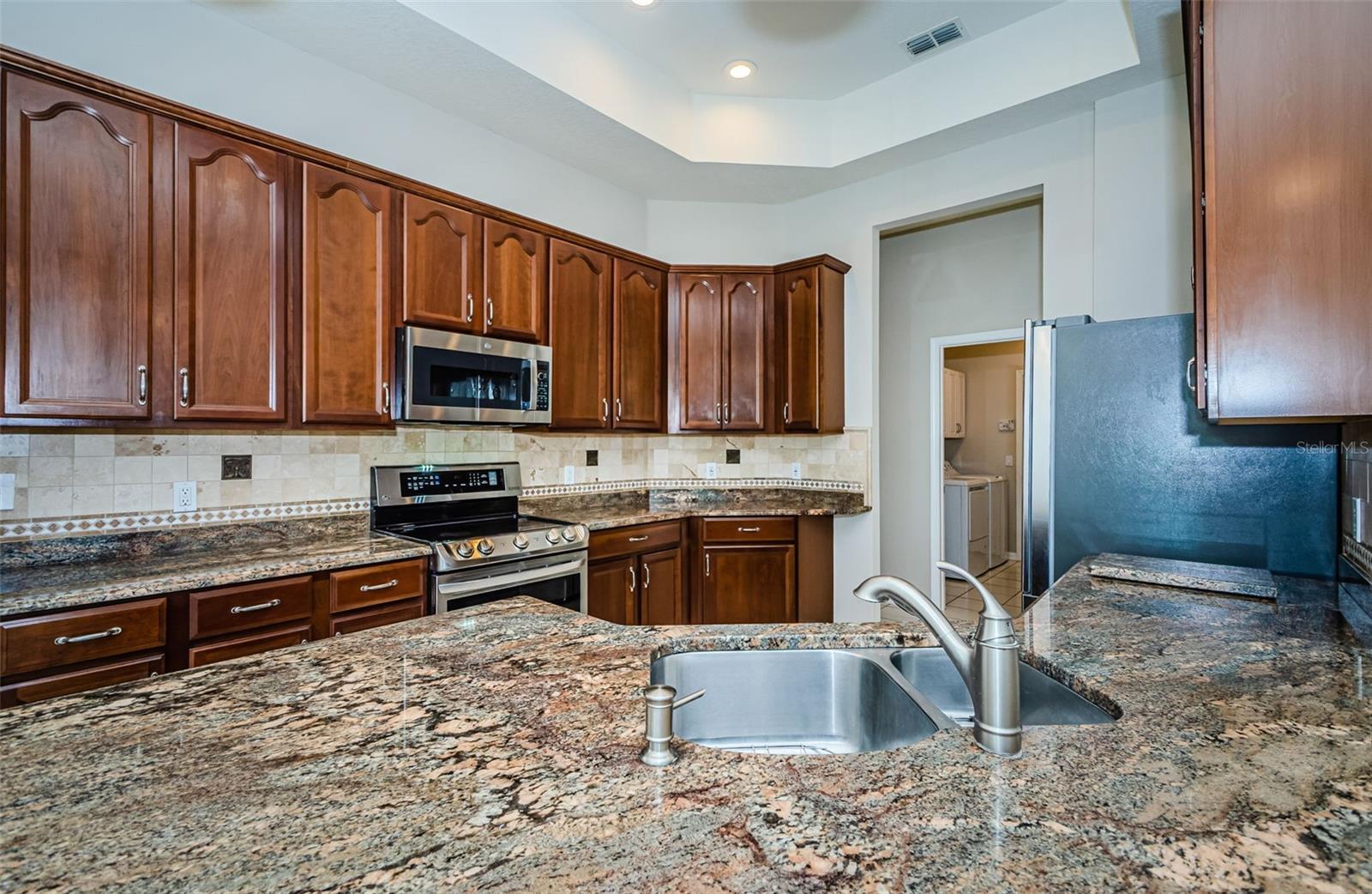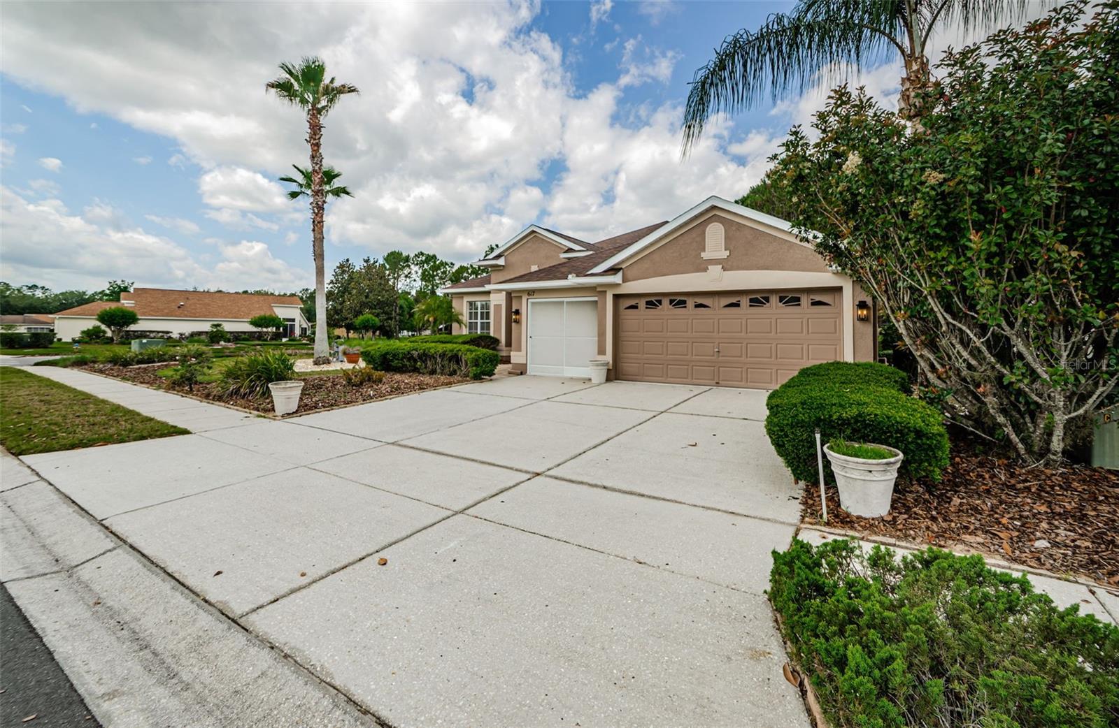 Welcome to this stunning Remington model in the highly sought-after Wellington at Seven Hills, a guard-gated 55+ community with 24/7 security patrol. This home has had only one owner and was meticulously maintained. This move-in ready open floorplan offers 4-bedroom, 3-bathroom, 3-car garage home is situated on a premium corner lot with no rear neighbors, offering serene, wooded views. Recently updated in 2025, this home features a new roof replaced in March of 2025 with a transferable warranty, new HVAC system 4/25 also has a warranty, a new water heater, interior and exterior paint, new carpet in the family room and a new dryer. The washer and microwave convection oven are less than a year old. The kitchen is a chef’s delight, featuring granite countertops, custom backsplash, stainless steel appliances, 42-inch wood cabinets with pull-out shelving, a tray ceiling, a closet pantry, and a cozy breakfast nook. The adjacent spacious family room includes eight-foot-high sliding doors to the extended screened lanai with tile flooring and a ceiling fan—perfect for indoor-outdoor living. The thoughtfully designed split-bedroom layout offers privacy and flexibility. The primary suite includes sliding doors to the lanai, tray ceiling, two large closets (one walk-in), and a luxurious en-suite bath with a garden tub, walk-in shower, and 36-inch dual wood vanities with Corian countertops. Bedrooms 2 and 3 are located in a private wing and share a full bath, while bedroom 4 is adjacent to a third full bath with lanai access, all featuring 36-inch wood cabinets and Corian countertops, ideal for guests or multigenerational living. The utility room includes cabinets and a new oversized stainless-steel sink, a new dryer (2025), and a washer less than a year old. Additional highlights include keyless entry, Ring doorbell, security system, gutters, Pest tubes in walls, cement curbed plant beds, single garage door screen, extended brick paver walkway and cement patio off the lanai, and an irrigation system serviced in 2025. Enjoy this beautifully updated home in a vibrant, amenity-rich community offering a clubhouse, Wellington’s Bar & Grill Restaurant, pool, spa fitness center, pickleball, tennis, bocce, billiards, and endless social activities.