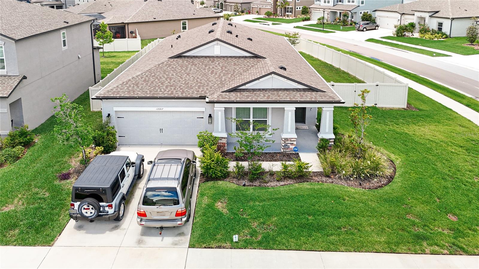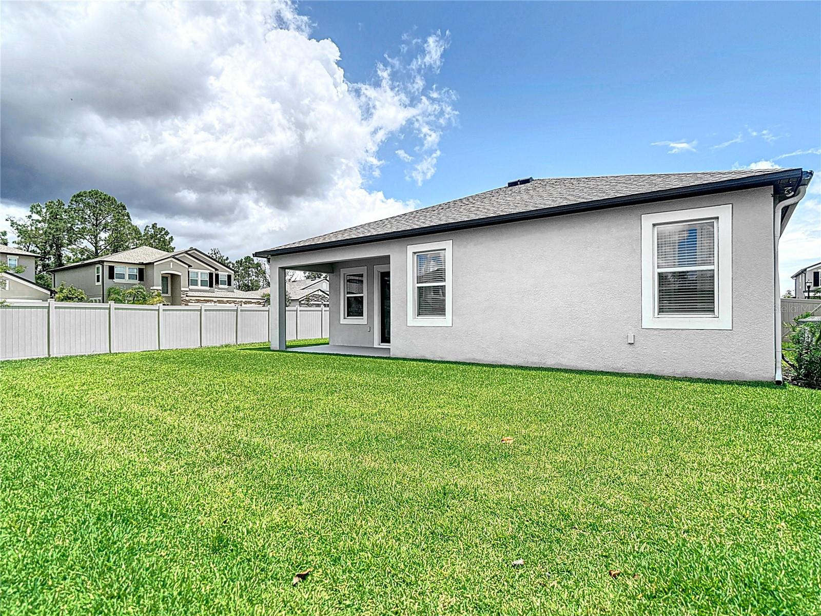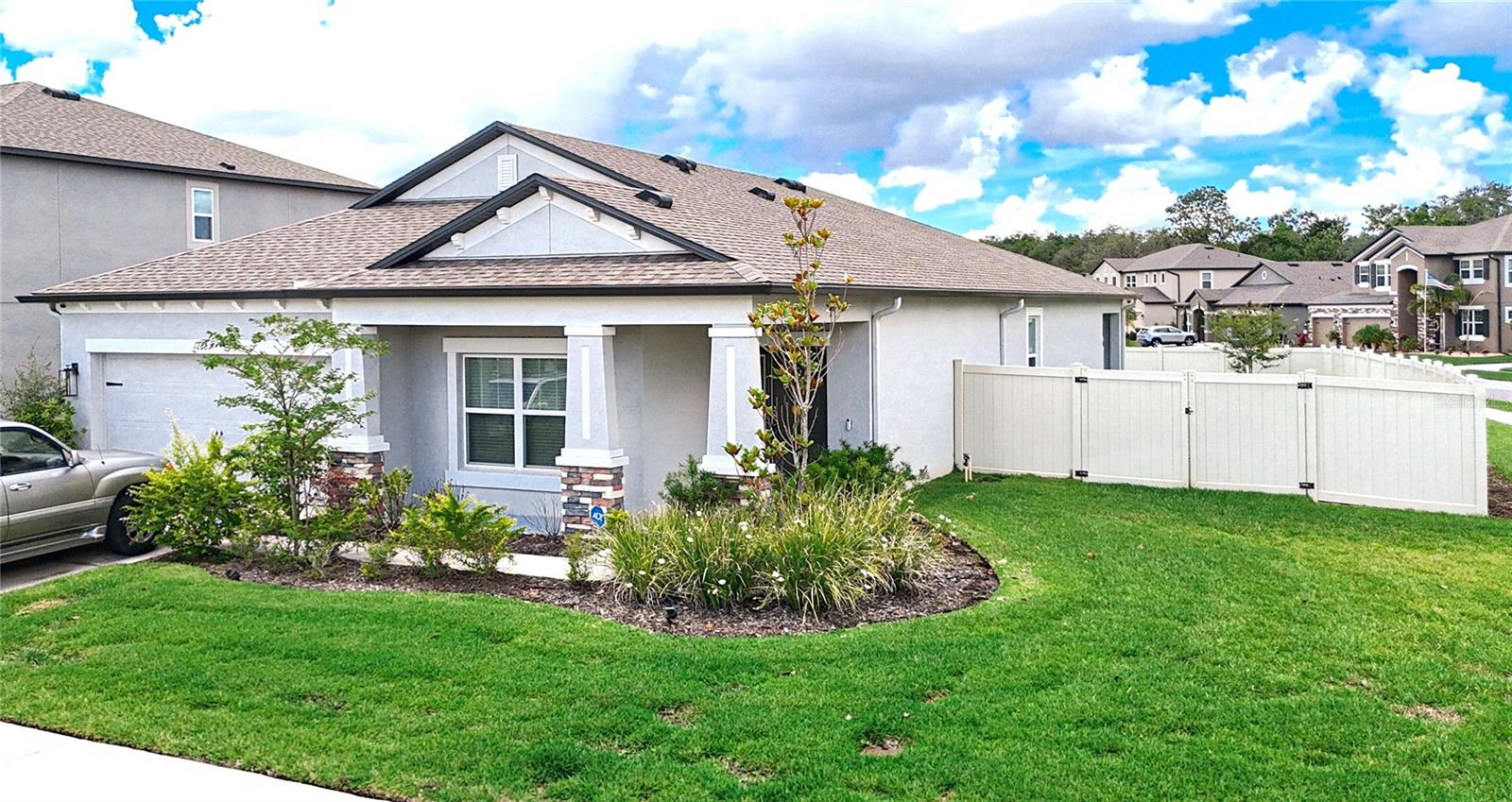 Seller willing to pay $10,000 towards buyers closing costs. No need to wait for a new built when you can have this home that was only used seasonally. Mint condition. This quality home built in 2022 by MI Homes offers a great split floor plan and a front stone elevation. Features a separate spacious living room which could be a formal dining room, kitchen with granite countertops, stainless steel appliances, large island with seating, dining area and family room leading to a quiet evening on your covered patio with a new privacy fence surrounding the large backyard. Great for entertaining. Large owner’s suite with private bath that has granite counters, separate water closet, step-in shower and walk-in closet. Newer gutters were added. A water softener is included. Home has crown molding. Low traffic dead end street. Low HOA. Talavera Community has a lot of amenities with a tropical pool that includes a splash pad and cabana, playground, tennis courts, basketball court, community pond and garden. Close to Veterans Expressway for easy commute to airport, downtown Tampa and beaches.