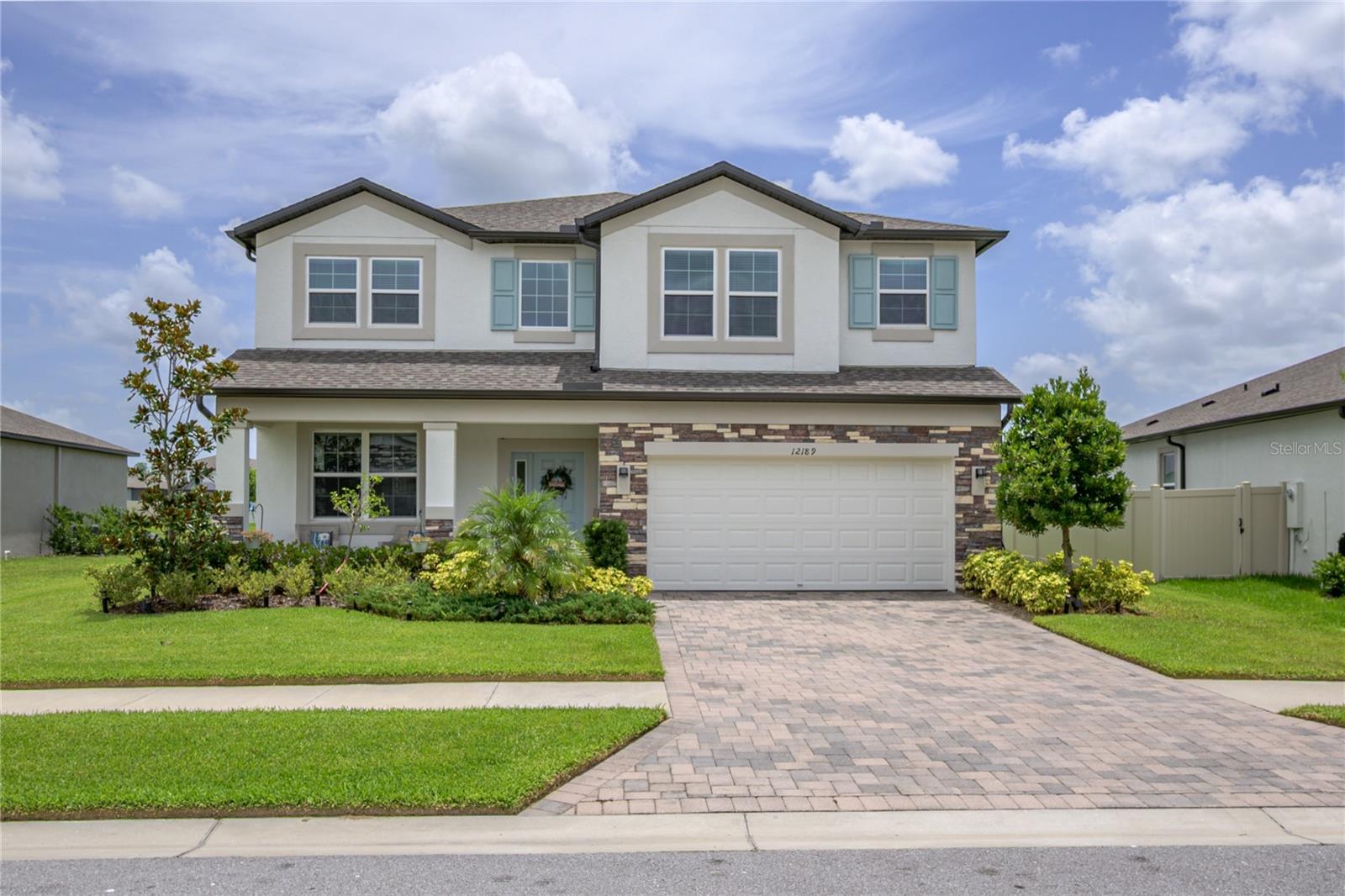 Stunning and better than new Talavera home situated on just under 1/4 ACRE! Welcome home to the 2023-built Mira Lago "B" model by M/I Homes, offering 3,531 sq. ft. of luxury living on an oversized homesite with serene pond views! This 5-bedroom, 3-bathroom home features a spacious open floor plan, high ceilings and premium upgrades including tile throughout main living area. Brick paver driveway, lead walk and entryways welcome you to a trussed front porch featuring stone elevation and glass sidelight window at front door. The grand foyer boasts an airy and tranquil ambience to the home with a separate formal dining area and neutral color palette throughout, including exterior. The gourmet kitchen boasts granite countertops, 42-inch neutral upper cabinets with crown molding, a walk-in pantry, and high-end stainless steel appliances, including an area for a butlers pantry and under cabinet lighting. The cafe area features an extra window allowing panoramic views of pond and trees. The expansive family room leads to a trussed lanai, perfect for entertaining or enjoying peaceful sunsets. The oversized laundry room showcases ample space and corridor access to the 3-car tandem garage. Upstairs, the primary suite features plenty of natural light and a spa-like en suite with dual sink granite vanity, a shower, private water closet and spacious walk-in closet. The second floor also includes a spacious game/media room with tray ceiling, along with three additional bedrooms. A first-floor bedroom with a nearby full bath adds flexibility for guests while showcasing a granite vanity and pool door access, making it a private retreat. Additional features include: upgraded light fixtures, gutters, upgraded 6 inch baseboards, and an in-wall pest control system. With plenty of space to add a private pool, this home offers endless potential and plenty of interior and exterior space. Located in Talavera, a golf cart-friendly community with a resort-style pool, splash pad, basketball and tennis courts, a clubhouse, and weekend food trucks. Situated near US-41, SR-52, top-rated schools, outlet malls, dining, and the Suncoast Parkway, this home provides the perfect balance of privacy and accessibility. M/I Homes' structural warranty is transferrable and offers peace of mind for purchase. Schedule your showing today!