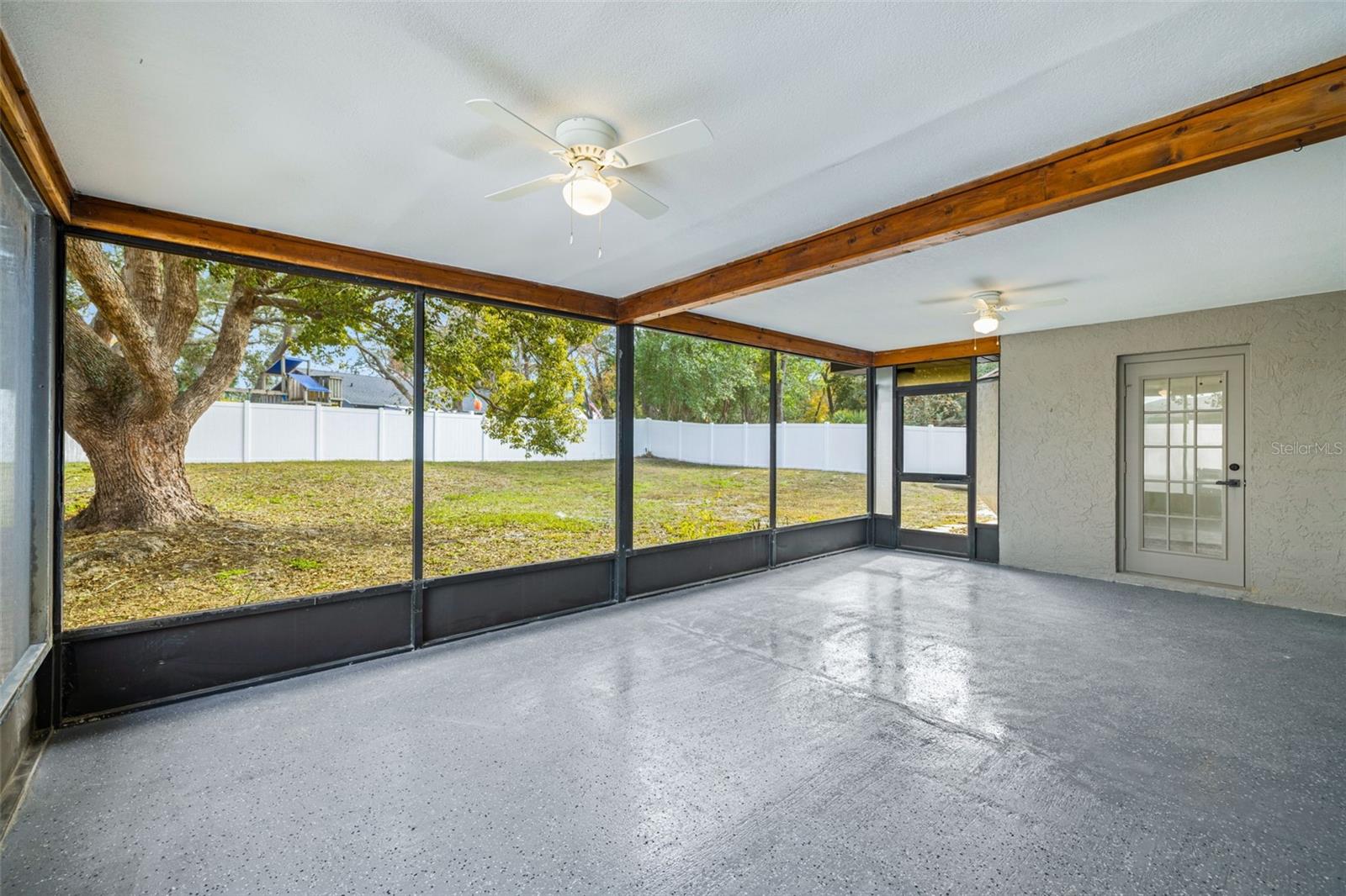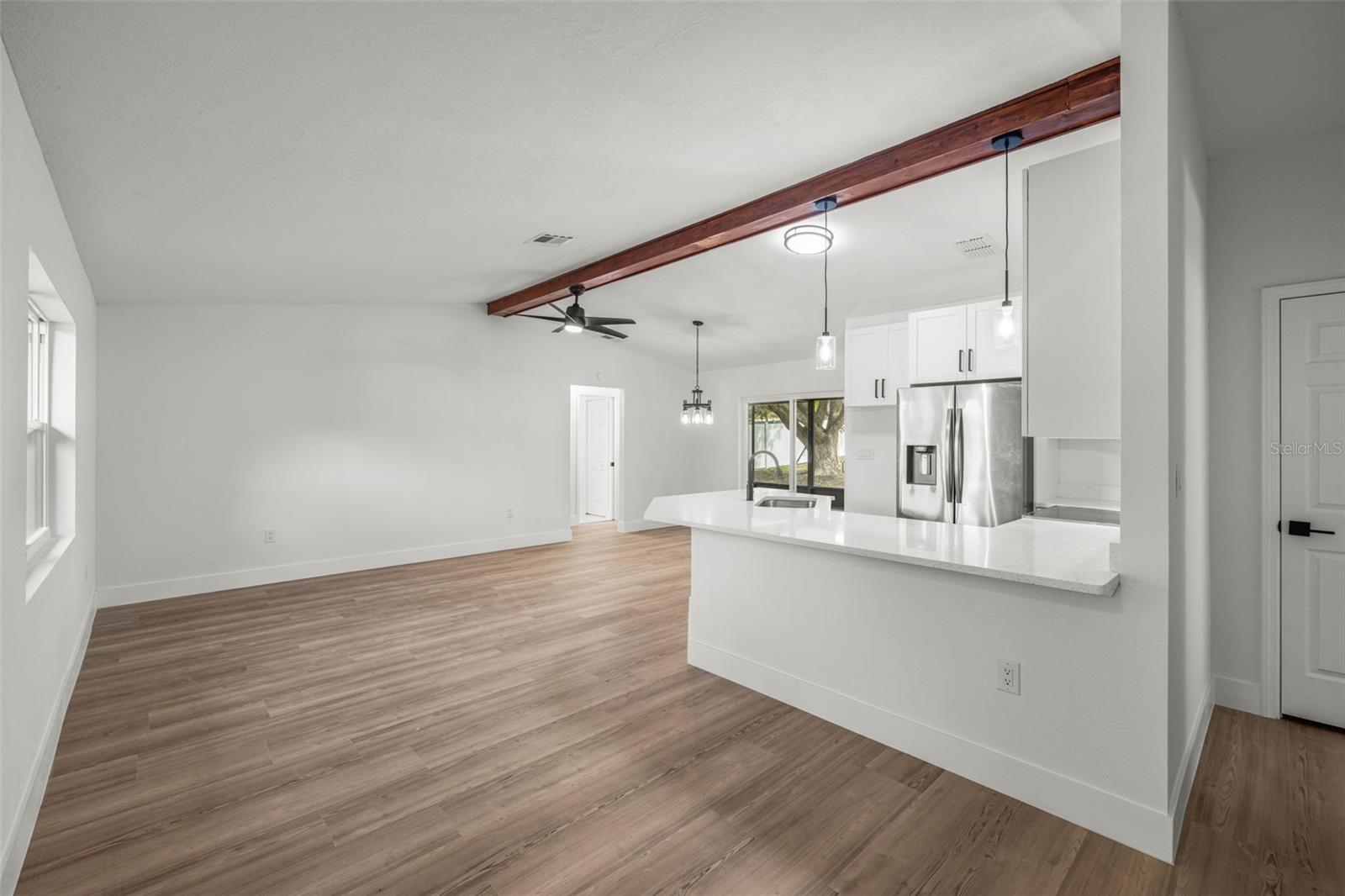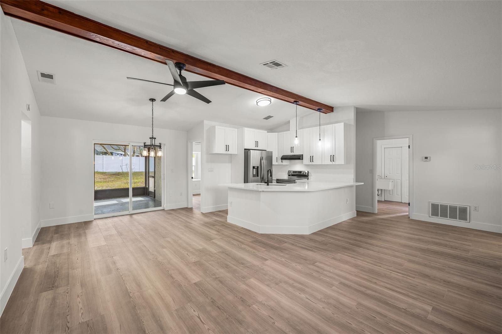 As you arrive, you’re welcomed by fresh exterior paint, modern curb appeal, and a spacious driveway leading to the two-car garage. Step inside and immediately notice the brand-new flooring, fresh interior paint, and the open, airy feel of the main living space accented by updated lighting and clean architectural lines. Moving through the home, the fully remodeled kitchen comes into view, featuring granite countertops, shaker cabinetry, stainless steel appliances, and a large center island that opens seamlessly to the living and dining areas, making it ideal for entertaining and everyday living. From the main living space, glass doors lead you into the covered and screened lanai, a perfect extension of the home where you can relax and enjoy Florida living year-round. Beyond the lanai, the large, fully fenced backyard with vinyl fencing offers privacy and plenty of room for outdoor gatherings, pets, or play. Back inside, the split bedroom layout provides privacy, with a spacious primary bedroom and updated en-suite bath, while the additional bedrooms and second bathroom have also been fully renovated with modern finishes. The home features a dedicated interior laundry room for added convenience, along with an oversized two-car garage complete with a new epoxy floor. Major upgrades including a new roof, new AC system, and new windows provide energy efficiency and peace of mind. Conveniently located near shopping, dining, and major roadways, this fully renovated, move-in ready home with no HOA offers the best of modern comfort and Florida living.