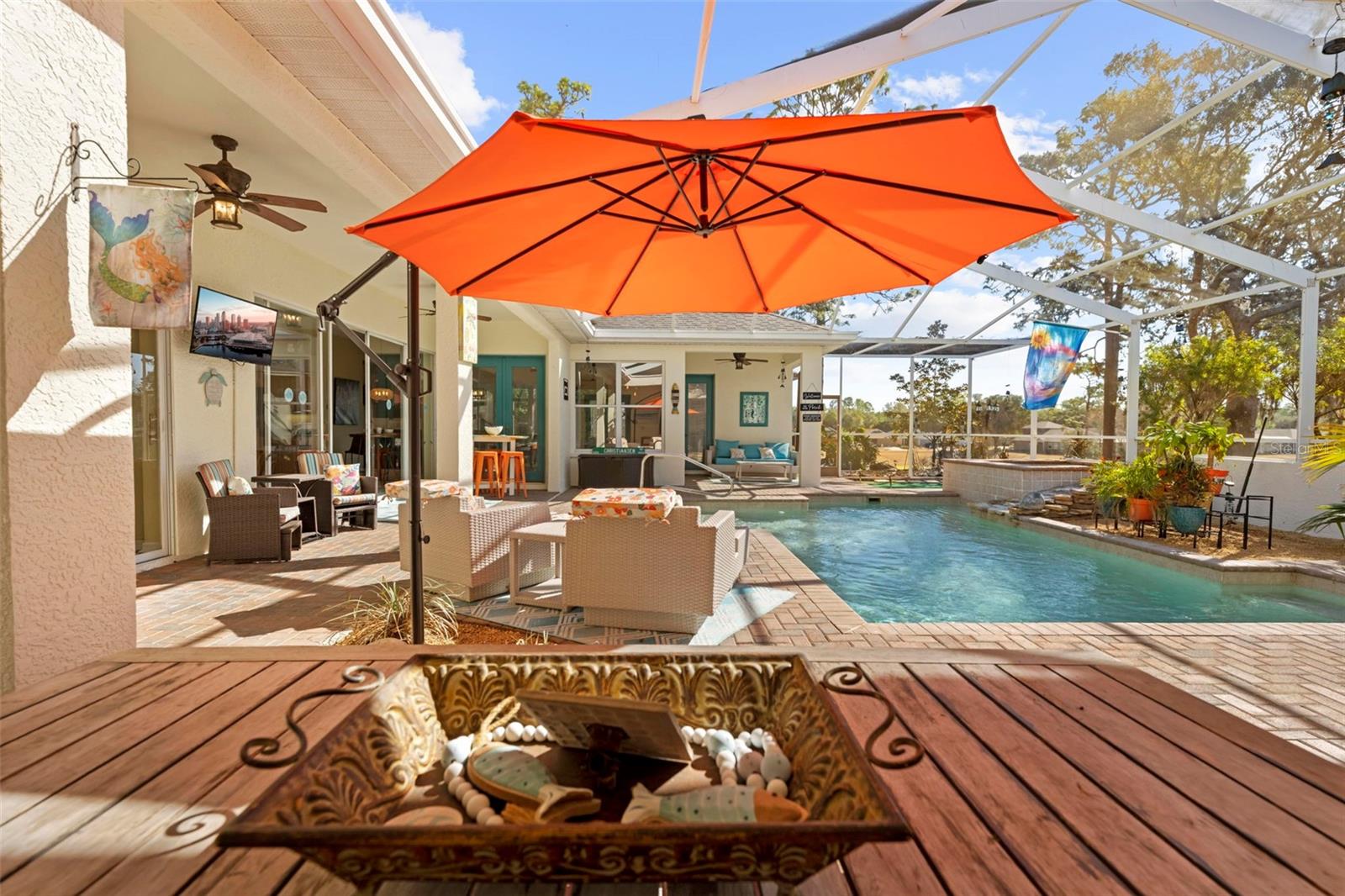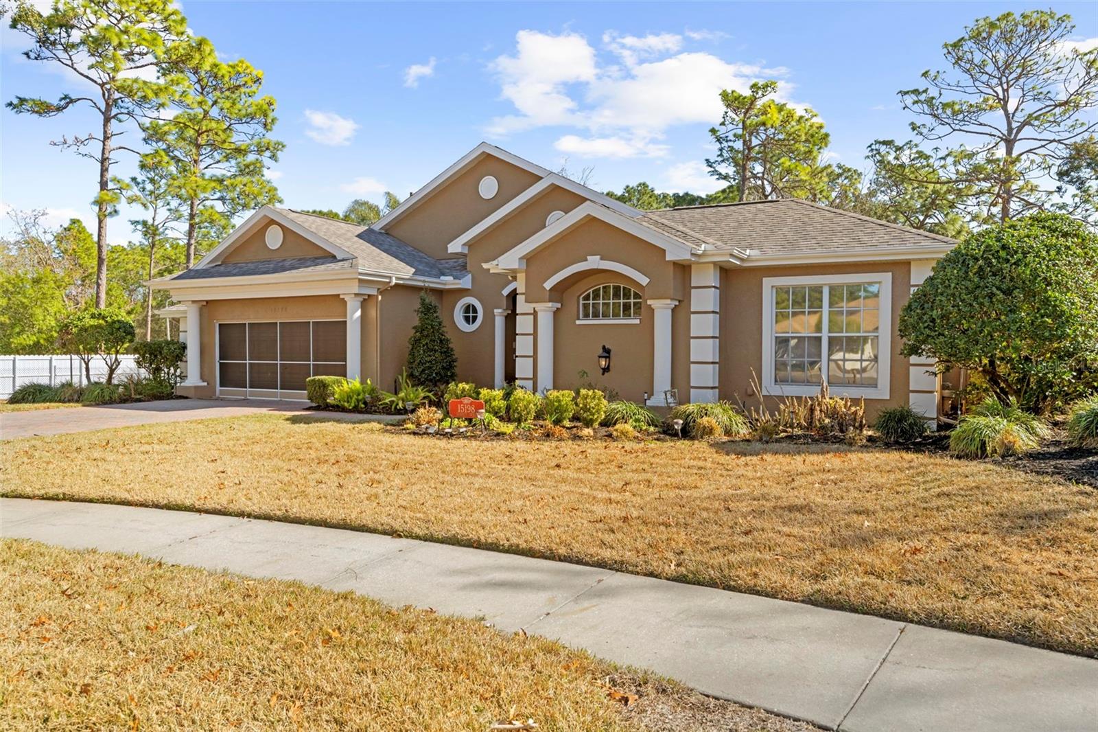 Here's your chance to own the cabana home of your dreams within the gated, guarded Silverthorn community. Welcome to Silverthorn’s hidden gem, tucked away on one of the community’s few peaceful cul-de-sacs, offering an extraordinary blend of privacy, elegance, and Florida living at its finest. This stunning cabana-style home redefines the concept of indoor-outdoor living — a true entertainer’s dream! This one is all sun, sand and sea! Step inside your front doors, and you’ll be welcomed by a courtyard pool oasis, at the heart of the home, providing a seamless flow between the main residence and the guest wing. Additionally, you'll find the stylish Casita, perfect for overnight guests, in-laws, or a private home office retreat. Unique to this property, the knock-down wall design allows you to open the pool area to enjoy lush tropical gardens, filling the space with light and fresh air while maintaining your perfect sense of privacy. All living areas of the home open up to the central cabana/pool area... talk about dinner with a view! Living areas are large and light-filled. The rear of the home boasts a 3-seasons room with a wall full of windows, allowing so much natural light to flow in. The bonus flex room overlooks the serene Par 3 #15 golf hole, offering one of the most picturesque views in all of Silverthorn — the ideal spot for morning coffee or evening sunsets. Whether hosting a lively party or enjoying a quiet afternoon swim, this home is designed for those who love to live, relax and entertain effortlessly. You'll also appreciate the efficiency of this home - paid-in-full solar and newer appliances keep utilities low. Beyond your front door, the Silverthorn community offers a warm and social lifestyle — from its vibrant pickleball community to the challenging golf course that winds through rolling greens. Excitement is in the air as the new Silverthorn Bar & Grille owners revitalize the heart of the neighborhood, bringing back a local favorite spot to gather with friends for casual beverages, delicious dinners and community connection. Silverthorn provides the perfect blend of having all conveniences - shopping, dining, all that Nature Coast has to offer - within minutes, while still enjoying a serene, quiet neighborhood feel. Come take a look at 15198 Surrey Bend and you'll quickly realize that this is not just a home - it's your own personal Florida retreat.