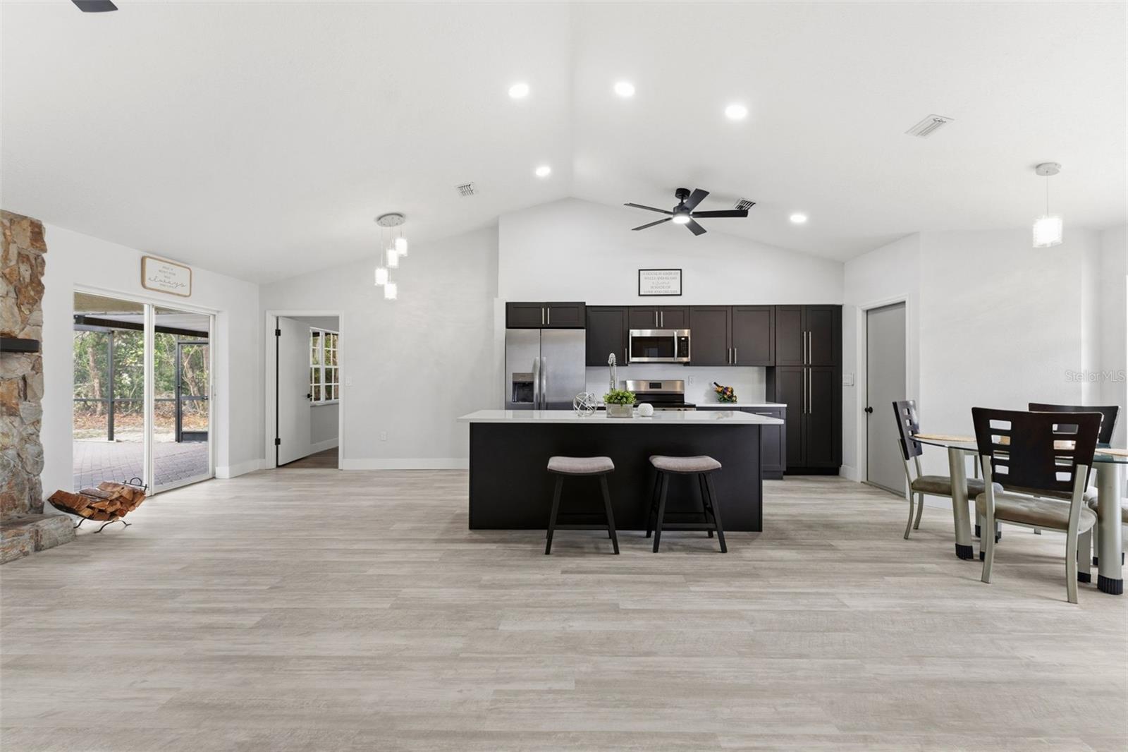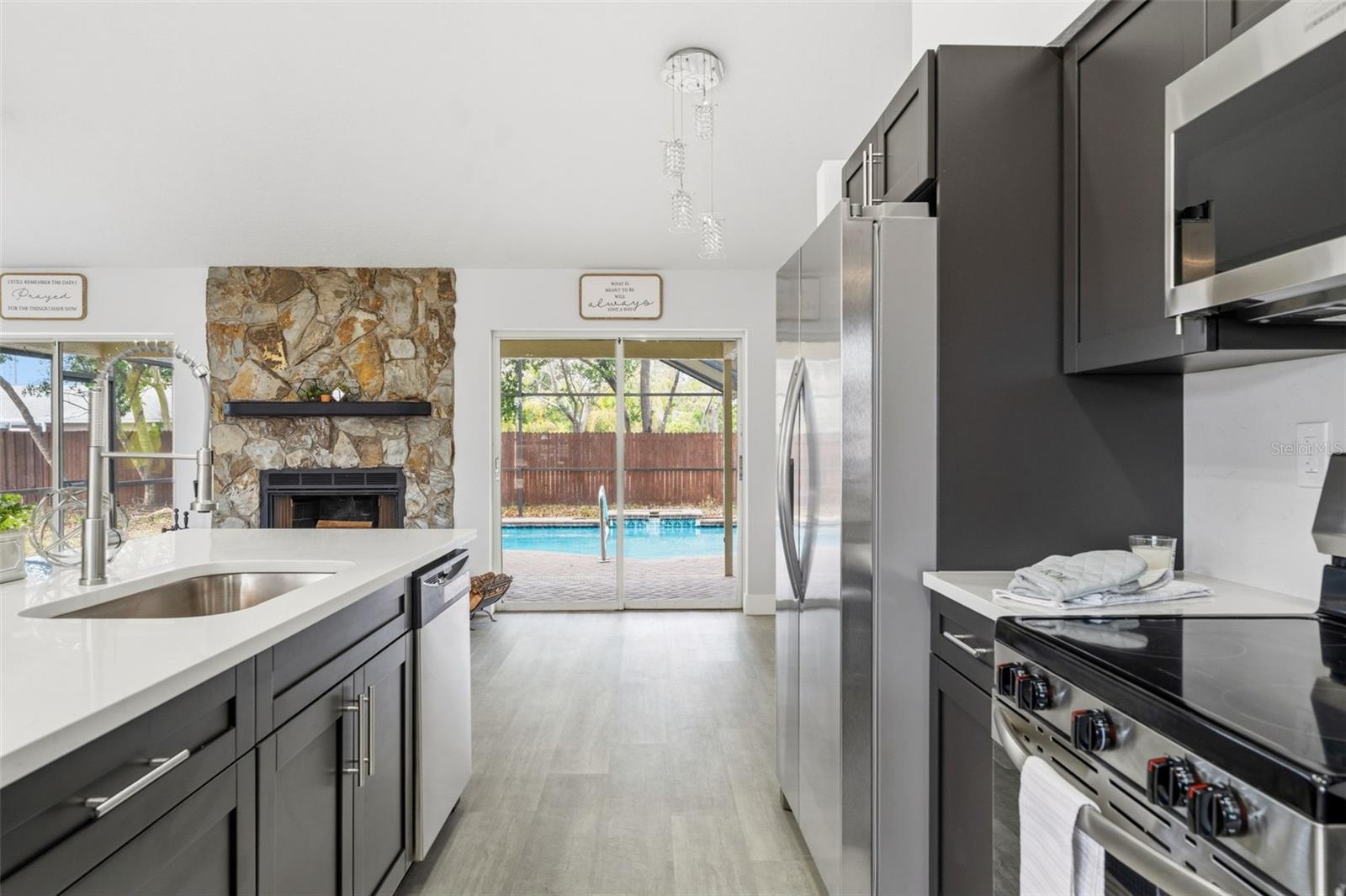 Home Sweet Home! Welcome to this cozy and quaint 3/2/2 full of upgrades and situated in the heart of Spring Hill! New roof, interior/exterior paint, new LVP flooring in main living area, kitchen completely renovated with quartz island, countertops, backsplash and new stainless steel appliances. Both baths upgraded with porcelain tile throughout, energy efficient toilets. Beautiful open concept with functioning wood burning fireplace, family room overlooks screened pool/lanai area. Split floor plan, large master bedroom/walk in closet. Approx.45 to/ from Tampa Airport, 1.5 hours to theme parks, centrally located restaurants, hospital, shopping all mins away.