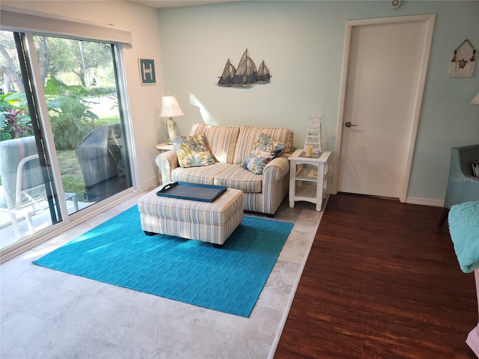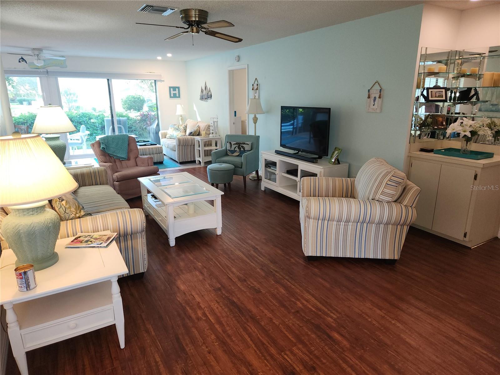 Wonderful end unit villa for sale in the exclusive gated golf community of Timber Pines with 24 hour guarded gates. This meticulously maintained villa is in the village of Pine Glen 11 and is close to the main gate entrance. There is a new roof and air conditioner, a large welcoming front porch, wood and high-end laminate and tiled floors throughout. It has an open floor plan, excellent for entertaining and is bright and sunny with a southern exposure, letting in an abundance of natural light. There is an eat in kitchen, stainless appliances, an island, double sinks and garburator in the kitchen, with an extra fridge in the garage. The large main bedroom boasts a walk-in closet with many built-ins, a bath with walk-in shower, dual sinks and a solar tube. The guest bedroom at the other end of the house also has a walk-in closet with lots of storage space. The second bath has tub/ shower combo and has a solar tube. There are loads of extras, electric blinds on the two large slider doors and an electric screen on the garage door. There is recessed lighting throughout and attic storage with easy access. The large back patio has a view of mature landscaping and is very private. This villa is in a socially active village with its own private heated swimming pool. Timber Pines Community has 4 pristine golf courses owned by the association, a Country Club with an elegant dining room, an upscale sports bar with multiple tv screens, two Olympic size heated swimming pools, a Health and Wellness Center with state-of-the-art exercise equipment, and rooms for many forms of exercise classes. There is a Performing Arts Center with an abundance of entertainment. New state of the art Pickle Ball and tennis courts as well as bocci ball, billiards and more than 100 different clubs keep you active. It is one hour from Tampa and the airport there, as well as the beautiful beach of Clearwater and two hours from Disney World in Orlando. Cable with two boxes and high-speed internet is included in HOA fees, also termite protection. This is a “no dogs” village. Call today for a showing.