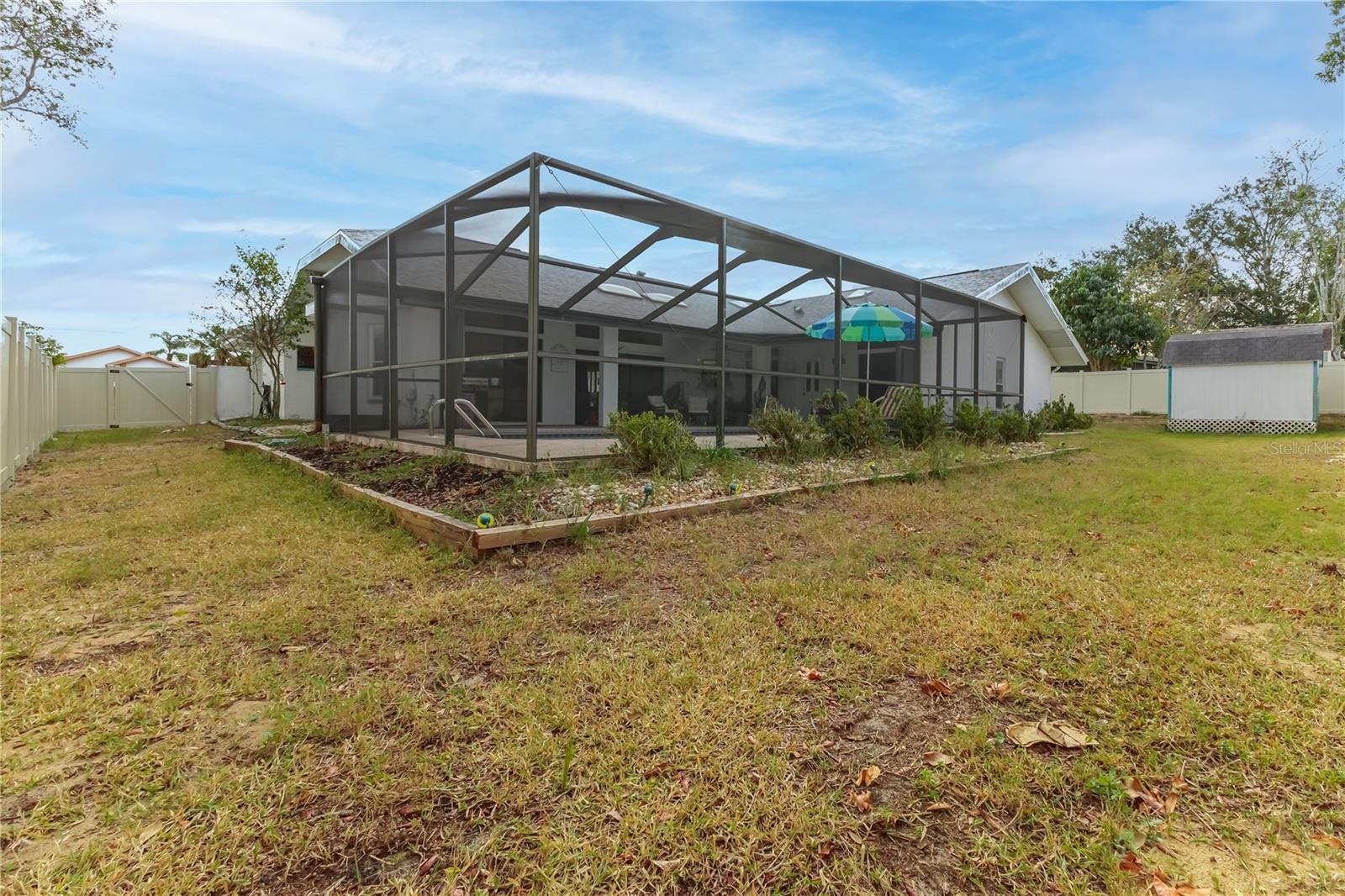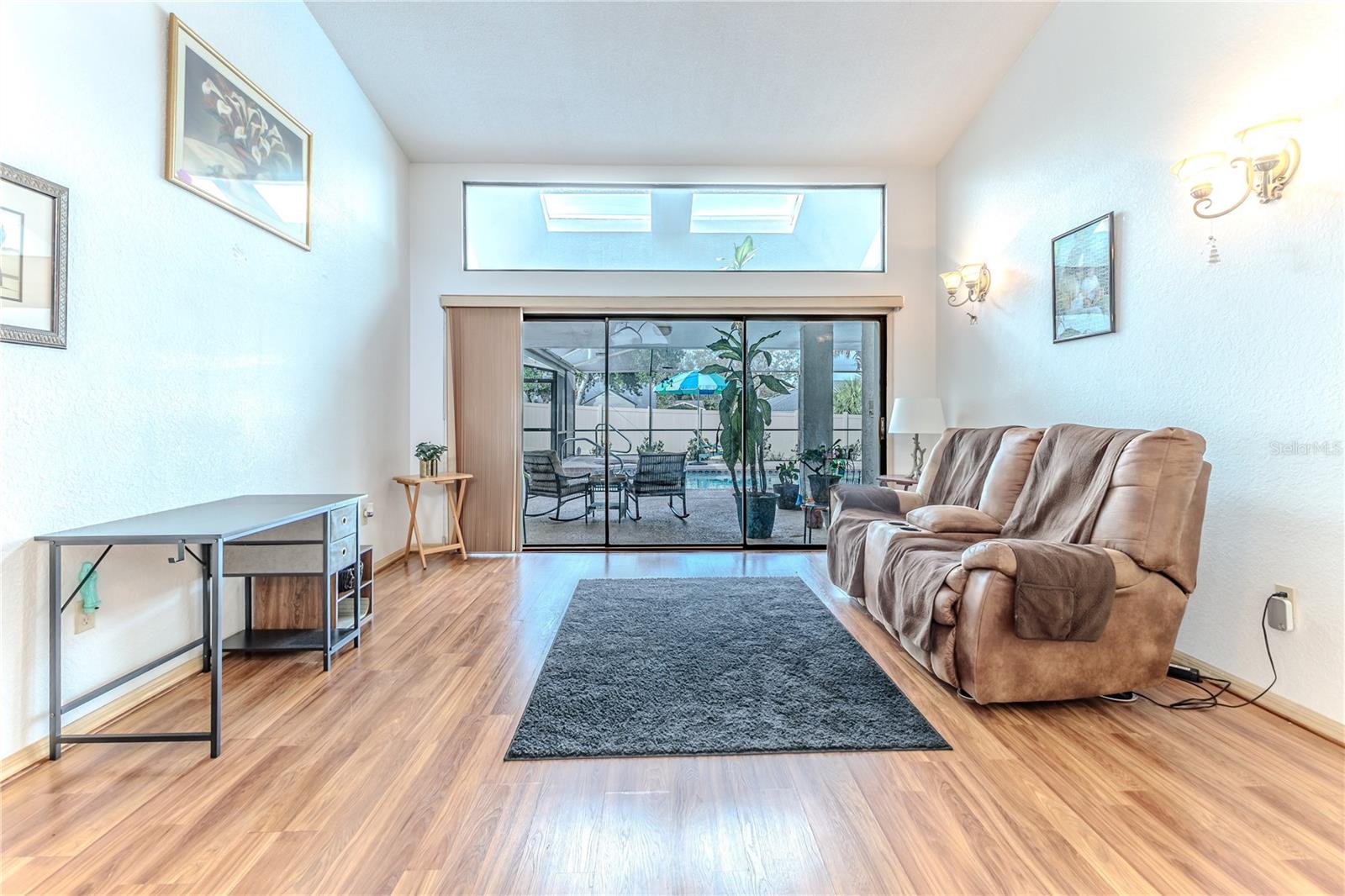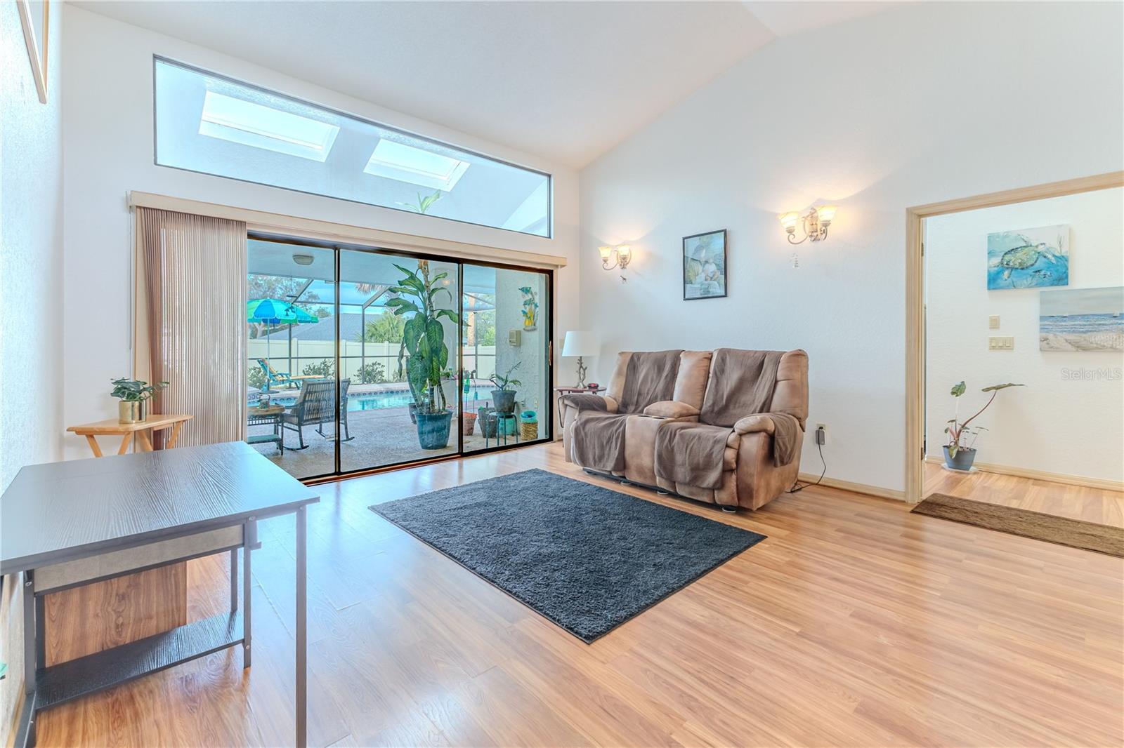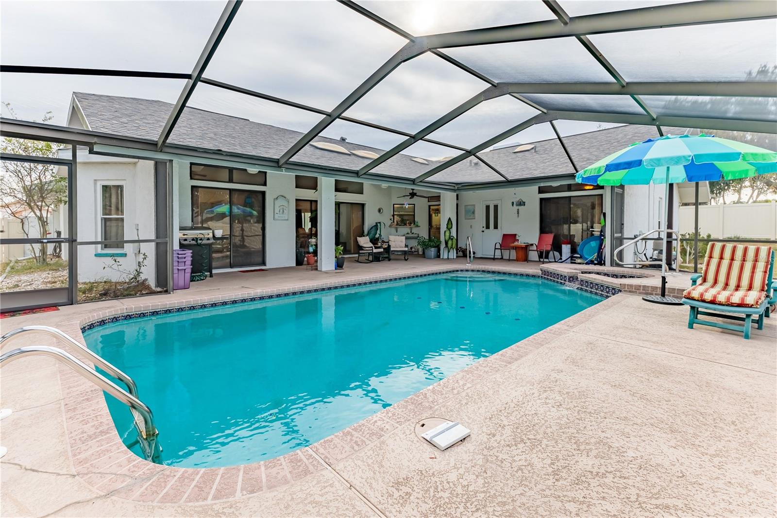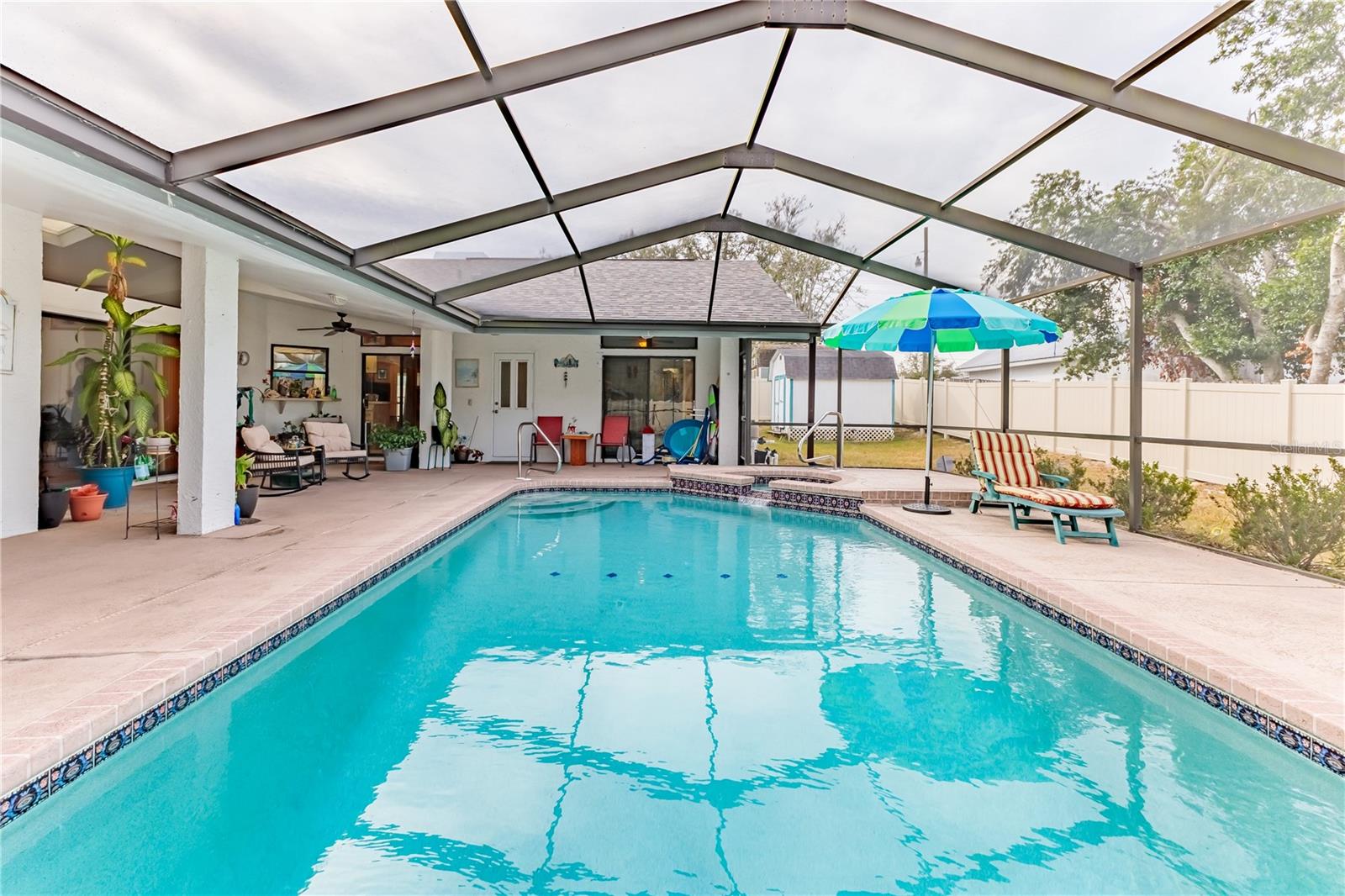 Discover this beautifully maintained 3-bedroom, 2-bathroom home with a 2.5-car garage and a heated saltwater pool and spa, perfect for enjoying Florida's sunshine. The split floor plan provides privacy, while the double-door entry welcomes you into a grand formal living and dining room with vaulted ceilings, laminate flooring, and three sliding doors leading to the expansive lanai. The main bedroom suite is a true retreat, featuring laminate floors, a skylight, private pool access, and two oversized walk-in closets. The ensuite bathroom offers a jetted tub, dual sink vanity, shower, linen closet, and a separate toilet closet. The open-concept kitchen and family room create the heart of the home, boasting a fireplace, built-ins, two skylights, a range with built-in oven, pantry, breakfast bar, and cozy dining nook with lanai access. Two additional spacious bedrooms include large walk-in closets, with one offering direct pool access. The guest bathroom features a new walk-in tub and a convenient door leading to the lanai. Step outside to an outdoor oasis, complete with a covered lanai with skylights, a screen-enclosed heated pool and spa with a waterfall feature, and a fully fenced backyard. Additional highlights include new windows (2024), a new HVAC system (2024), and a new roof (2025), ensuring peace of mind. A shed provides extra storage, and the large garage includes a freezer. The inside laundry room is equipped with a sink and cabinets. This home is a rare find—move-in ready. Schedule your showing today and experience Florida living at its best!
