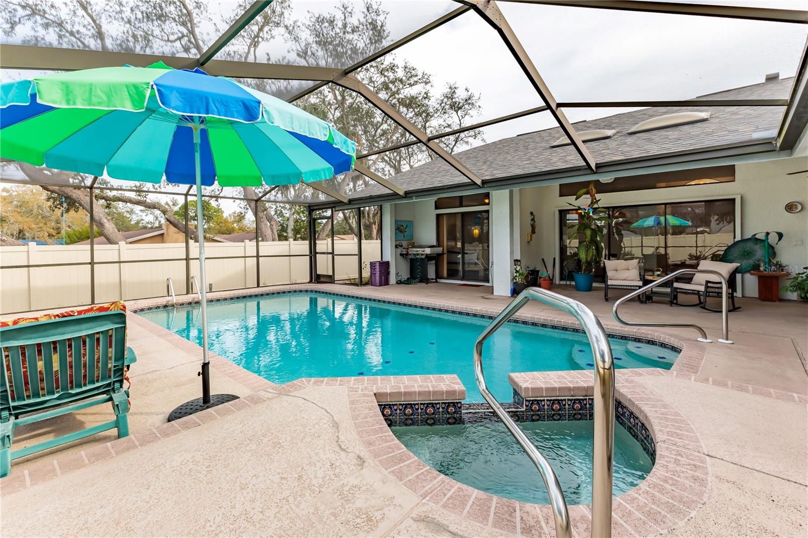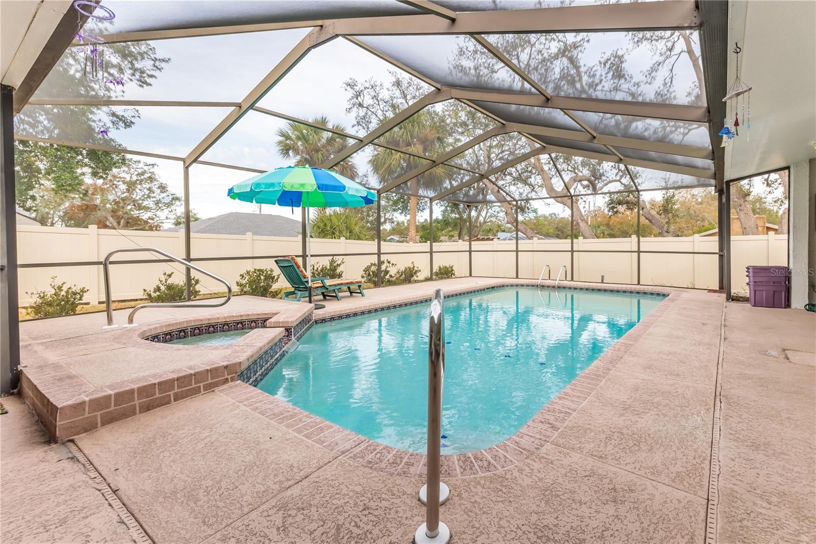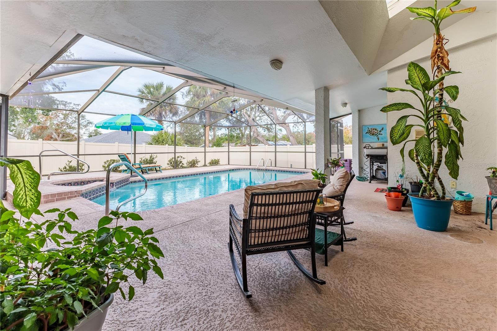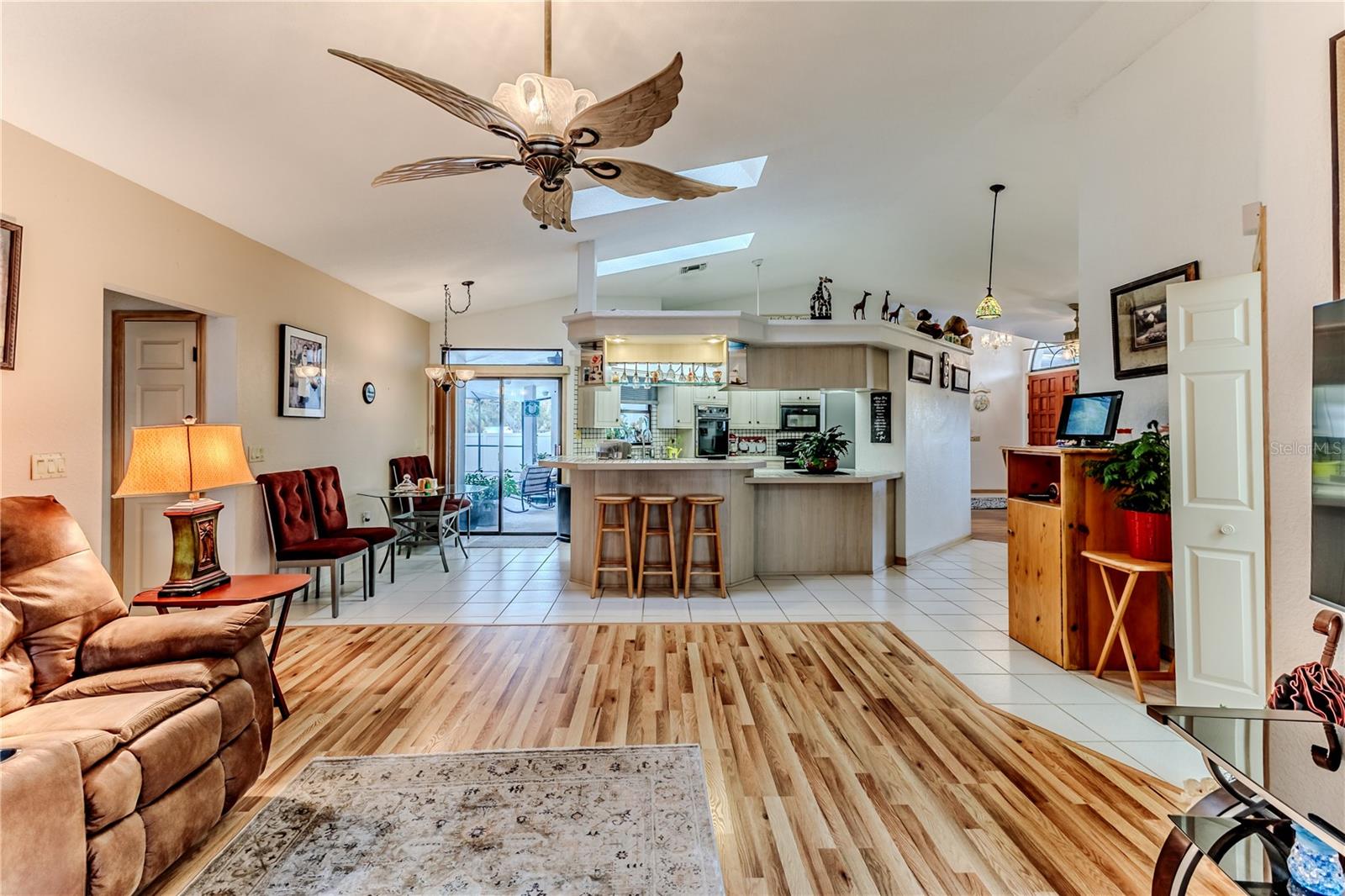 Discover this beautifully maintained 3-bedroom, 2-bathroom home with a 2.5-car garage and a heated saltwater pool and spa, perfect for enjoying Florida's sunshine. The split floor plan provides privacy, while the double-door entry welcomes you into a grand formal living and dining room with vaulted ceilings, laminate flooring, and three sliding doors leading to the expansive lanai. The main bedroom suite is a true retreat, featuring laminate floors, a skylight, private pool access, and two oversized walk-in closets. The ensuite bathroom offers a jetted tub, dual sink vanity, shower, linen closet, and a separate toilet closet. The open-concept kitchen and family room create the heart of the home, boasting a fireplace, built-ins, two skylights, a range with built-in oven, pantry, breakfast bar, and cozy dining nook with lanai access. Two additional spacious bedrooms include large walk-in closets, with one offering direct pool access. The guest bathroom features a new walk-in tub and a convenient door leading to the lanai. Step outside to an outdoor oasis, complete with a covered lanai with skylights, a screen-enclosed heated pool and spa with a waterfall feature, and a fully fenced backyard. Additional highlights include new windows (2024), a new HVAC system (2024), and a new roof (2025), ensuring peace of mind. A shed provides extra storage, and the large garage includes a freezer. The inside laundry room is equipped with a sink and cabinets. This home is a rare find—move-in ready. Schedule your showing today and experience Florida living at its best!