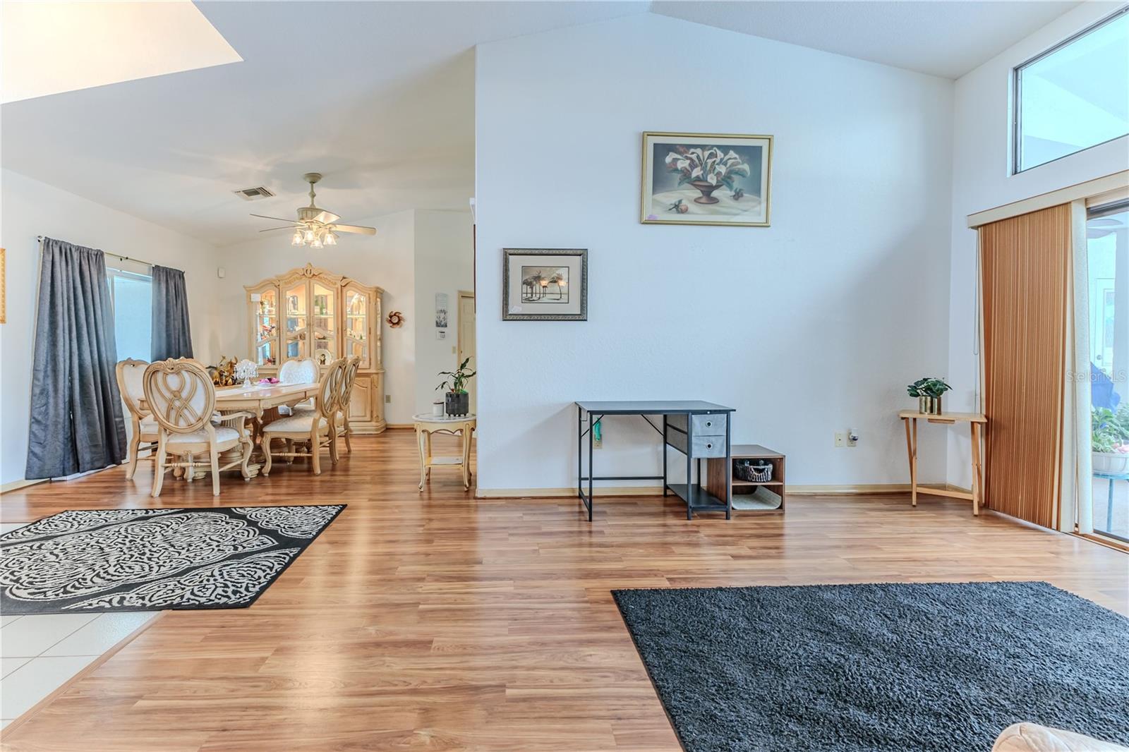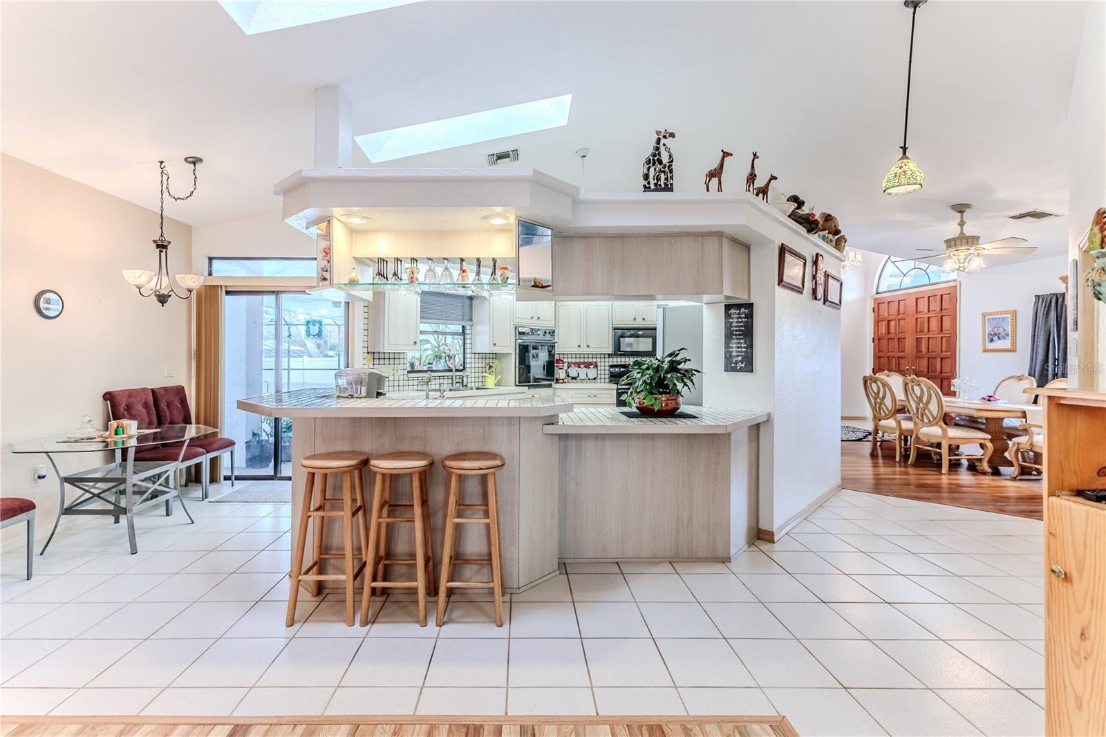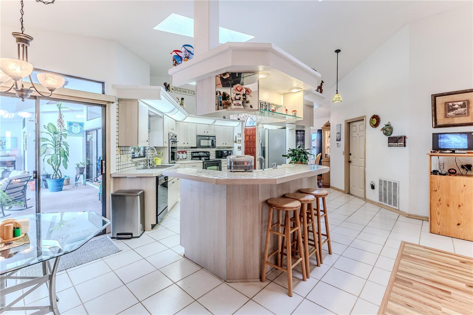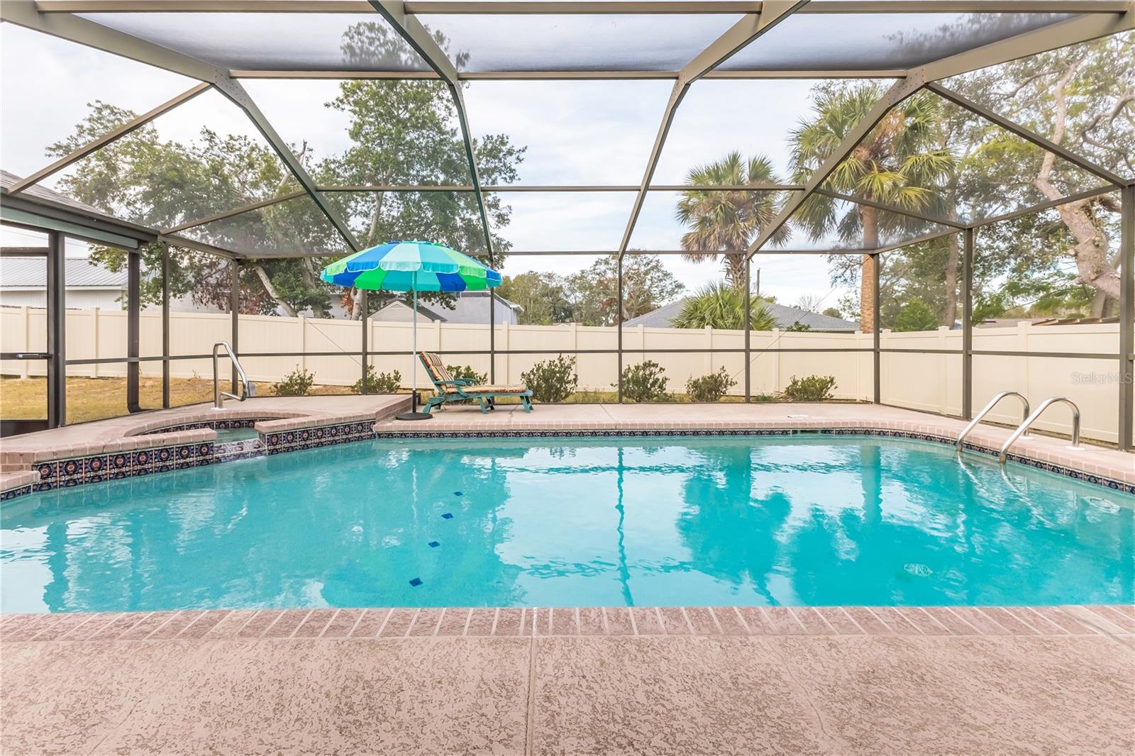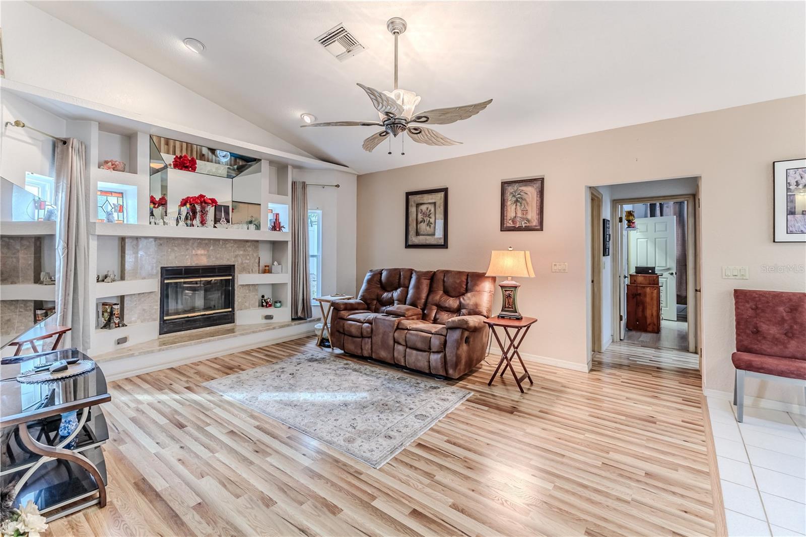 Discover this beautifully maintained 3-bedroom, 2-bathroom home with a 2.5-car garage and a heated saltwater pool and spa, perfect for enjoying Florida's sunshine. The split floor plan provides privacy, while the double-door entry welcomes you into a grand formal living and dining room with vaulted ceilings, laminate flooring, and three sliding doors leading to the expansive lanai. The main bedroom suite is a true retreat, featuring laminate floors, a skylight, private pool access, and two oversized walk-in closets. The ensuite bathroom offers a jetted tub, dual sink vanity, shower, linen closet, and a separate toilet closet. The open-concept kitchen and family room create the heart of the home, boasting a fireplace, built-ins, two skylights, a range with built-in oven, pantry, breakfast bar, and cozy dining nook with lanai access. Two additional spacious bedrooms include large walk-in closets, with one offering direct pool access. The guest bathroom features a new walk-in tub and a convenient door leading to the lanai. Step outside to an outdoor oasis, complete with a covered lanai with skylights, a screen-enclosed heated pool and spa with a waterfall feature, and a fully fenced backyard. Additional highlights include new windows (2024), a new HVAC system (2024), and a new roof (2025), ensuring peace of mind. A shed provides extra storage, and the large garage includes a freezer. The inside laundry room is equipped with a sink and cabinets. This home is a rare find—move-in ready. Schedule your showing today and experience Florida living at its best!