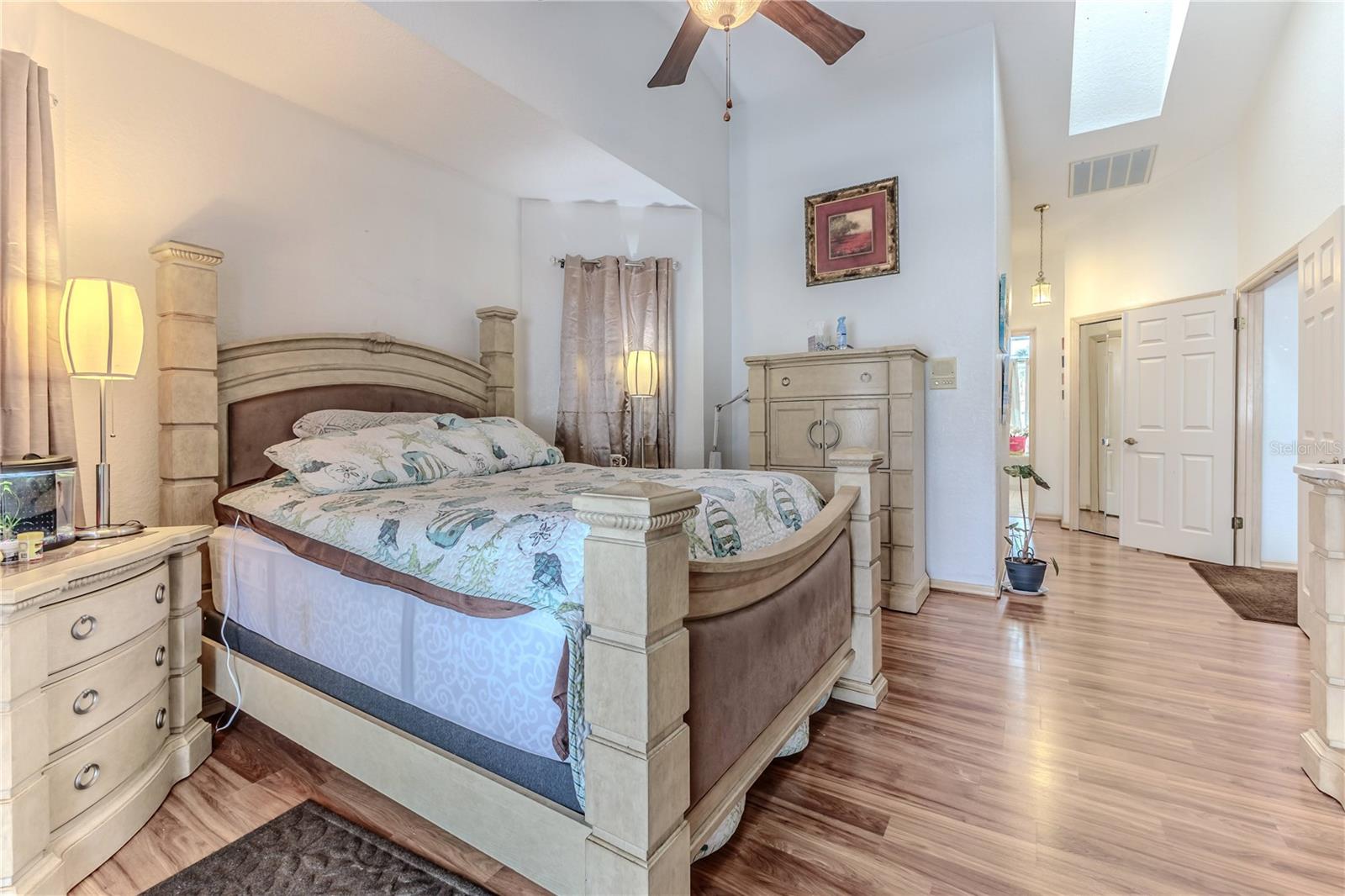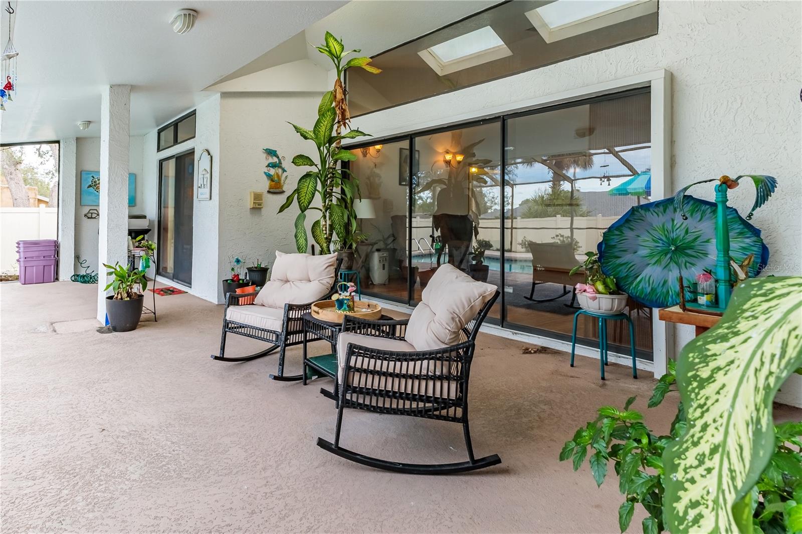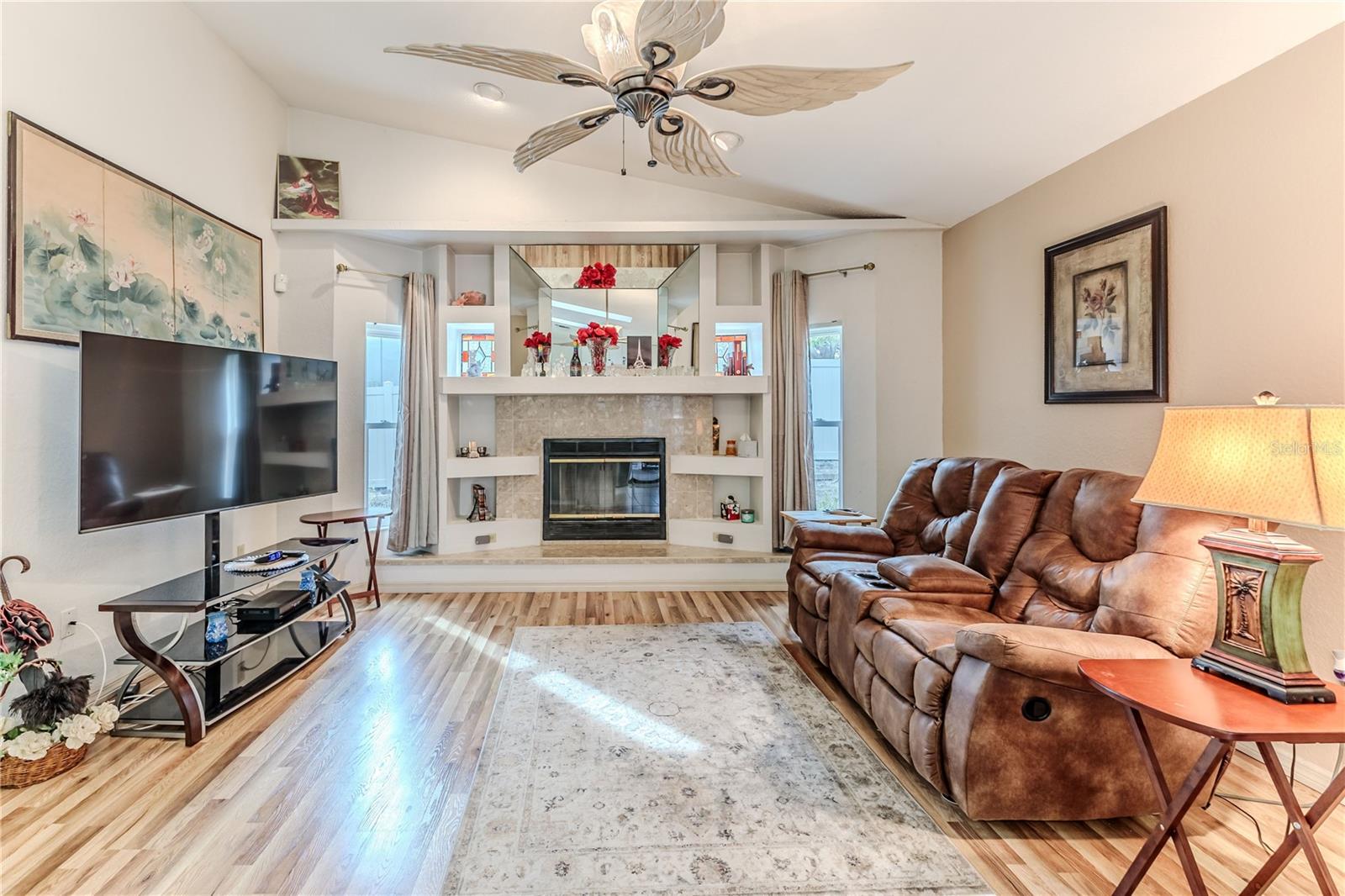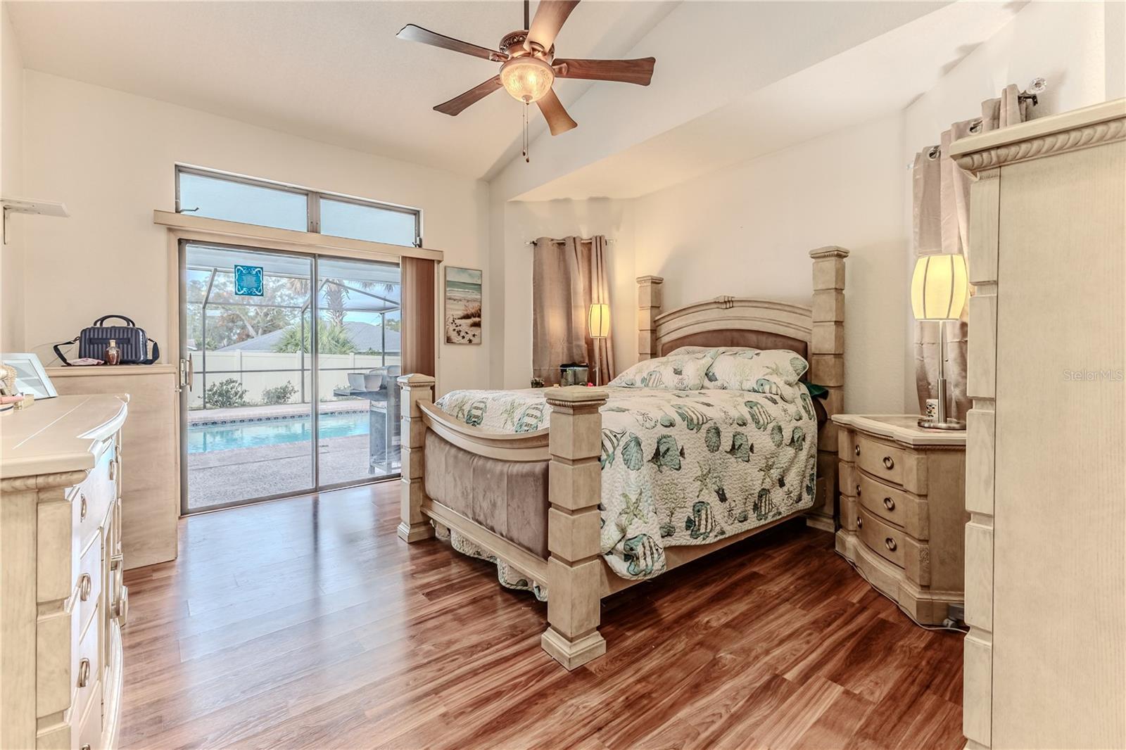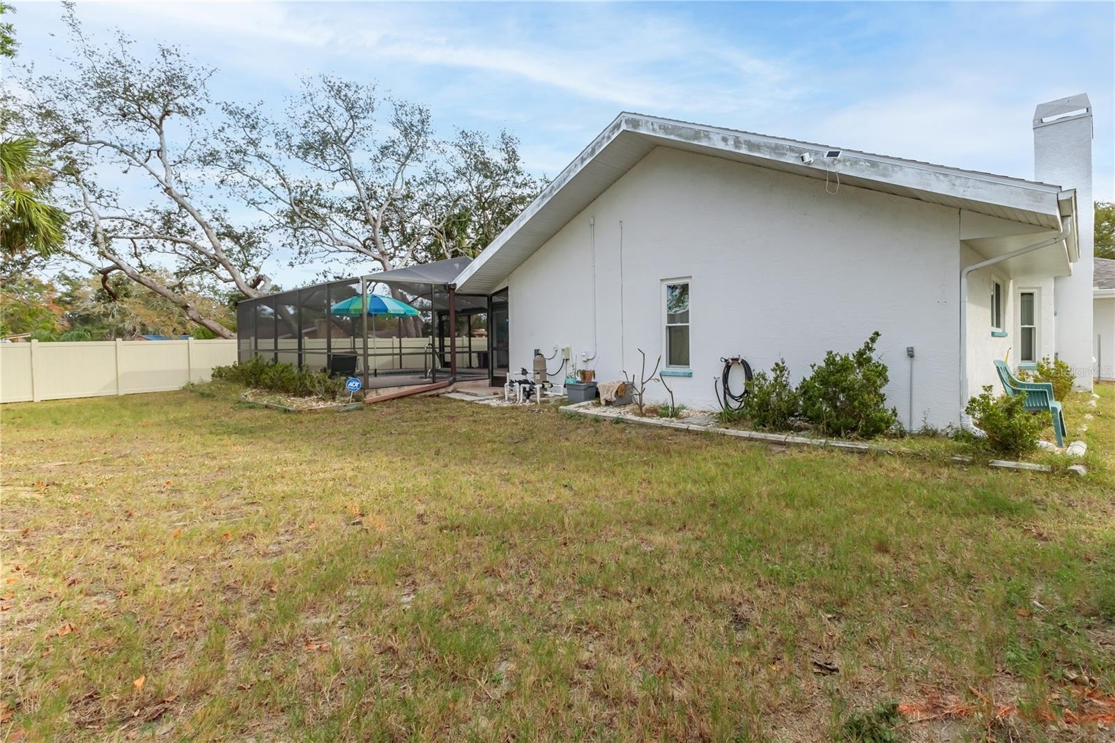 Discover this beautifully maintained 3-bedroom, 2-bathroom home with a 2.5-car garage and a heated saltwater pool and spa, perfect for enjoying Florida's sunshine. The split floor plan provides privacy, while the double-door entry welcomes you into a grand formal living and dining room with vaulted ceilings, laminate flooring, and three sliding doors leading to the expansive lanai. The main bedroom suite is a true retreat, featuring laminate floors, a skylight, private pool access, and two oversized walk-in closets. The ensuite bathroom offers a jetted tub, dual sink vanity, shower, linen closet, and a separate toilet closet. The open-concept kitchen and family room create the heart of the home, boasting a fireplace, built-ins, two skylights, a range with built-in oven, pantry, breakfast bar, and cozy dining nook with lanai access. Two additional spacious bedrooms include large walk-in closets, with one offering direct pool access. The guest bathroom features a new walk-in tub and a convenient door leading to the lanai. Step outside to an outdoor oasis, complete with a covered lanai with skylights, a screen-enclosed heated pool and spa with a waterfall feature, and a fully fenced backyard. Additional highlights include new windows (2024), a new HVAC system (2024), and a new roof (2025), ensuring peace of mind. A shed provides extra storage, and the large garage includes a freezer. The inside laundry room is equipped with a sink and cabinets. This home is a rare find—move-in ready. Schedule your showing today and experience Florida living at its best!