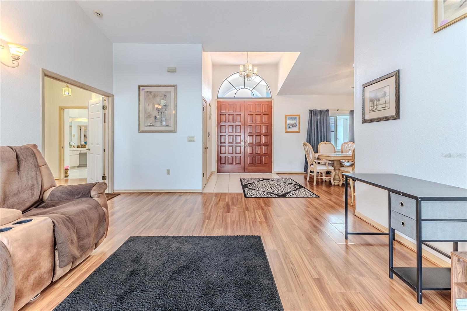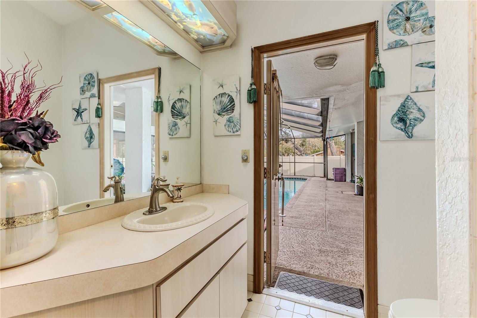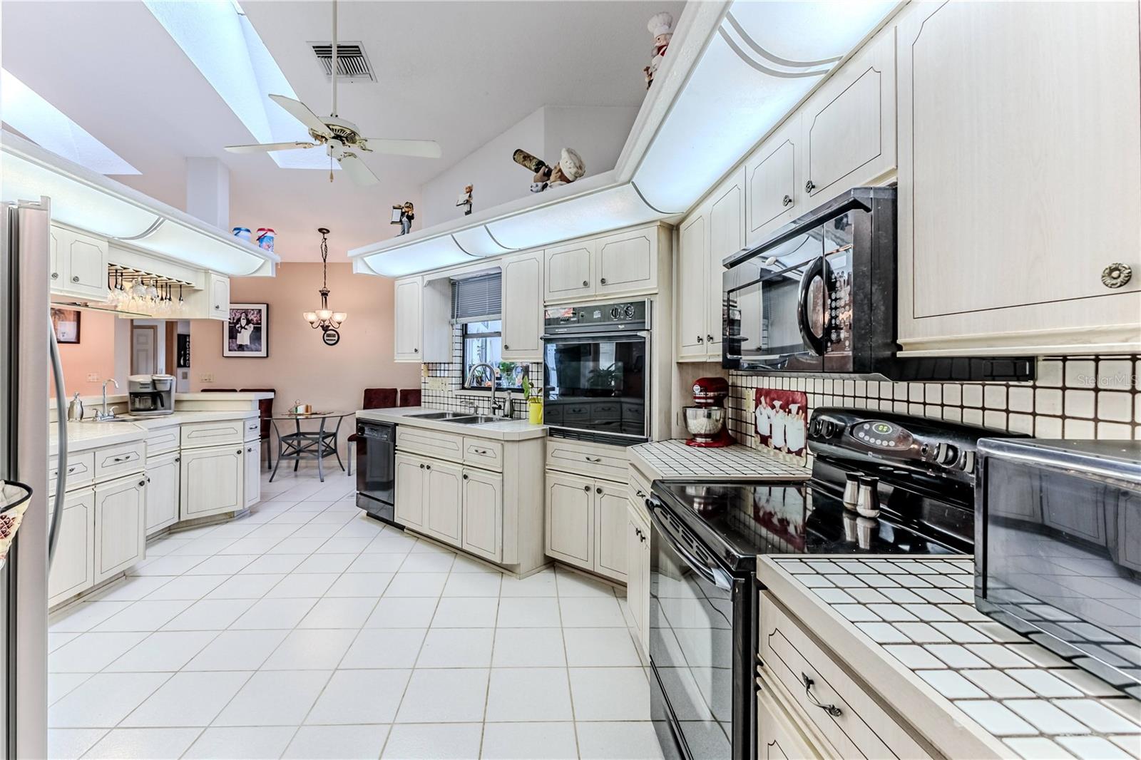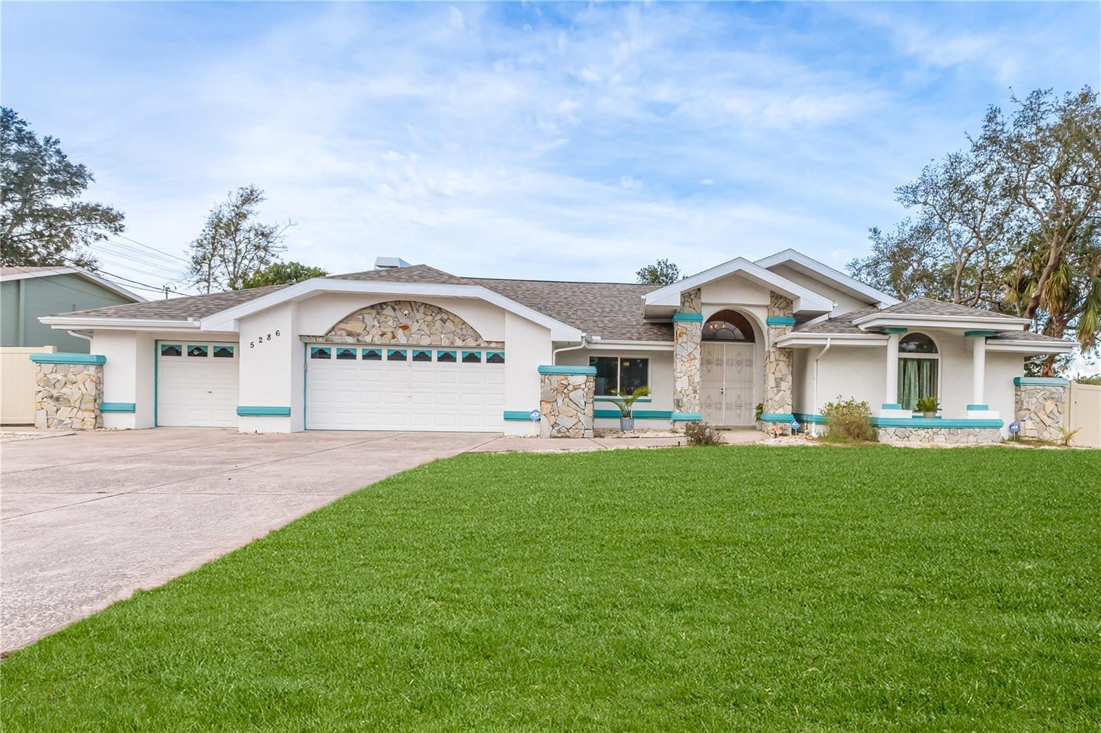 Discover this beautifully maintained 3-bedroom, 2-bathroom home with a 2.5-car garage and a heated saltwater pool and spa, perfect for enjoying Florida's sunshine. The split floor plan provides privacy, while the double-door entry welcomes you into a grand formal living and dining room with vaulted ceilings, laminate flooring, and three sliding doors leading to the expansive lanai. The main bedroom suite is a true retreat, featuring laminate floors, a skylight, private pool access, and two oversized walk-in closets. The ensuite bathroom offers a jetted tub, dual sink vanity, shower, linen closet, and a separate toilet closet. The open-concept kitchen and family room create the heart of the home, boasting a fireplace, built-ins, two skylights, a range with built-in oven, pantry, breakfast bar, and cozy dining nook with lanai access. Two additional spacious bedrooms include large walk-in closets, with one offering direct pool access. The guest bathroom features a new walk-in tub and a convenient door leading to the lanai. Step outside to an outdoor oasis, complete with a covered lanai with skylights, a screen-enclosed heated pool and spa with a waterfall feature, and a fully fenced backyard. Additional highlights include new windows (2024), a new HVAC system (2024), and a new roof (2025), ensuring peace of mind. A shed provides extra storage, and the large garage includes a freezer. The inside laundry room is equipped with a sink and cabinets. This home is a rare find—move-in ready. Schedule your showing today and experience Florida living at its best!