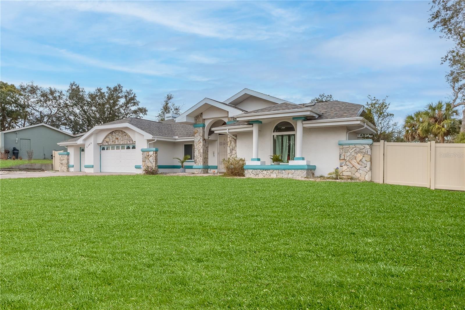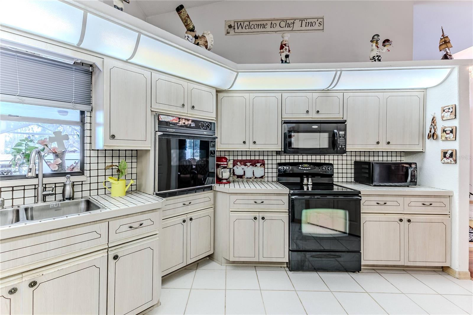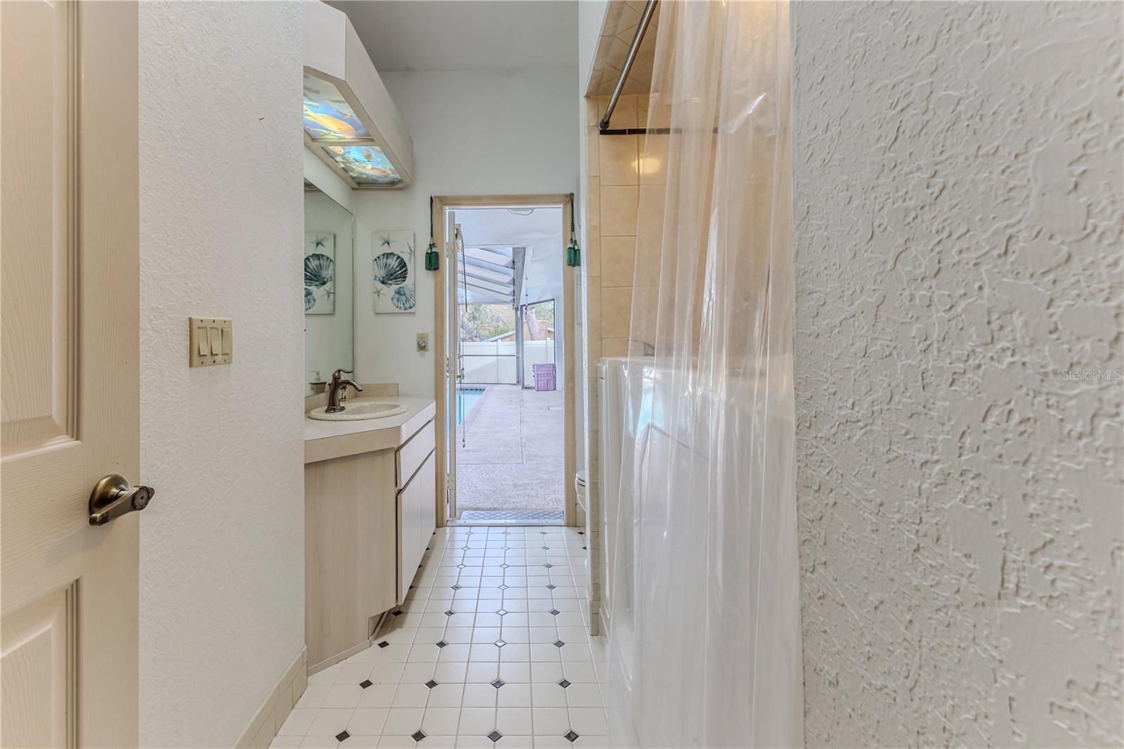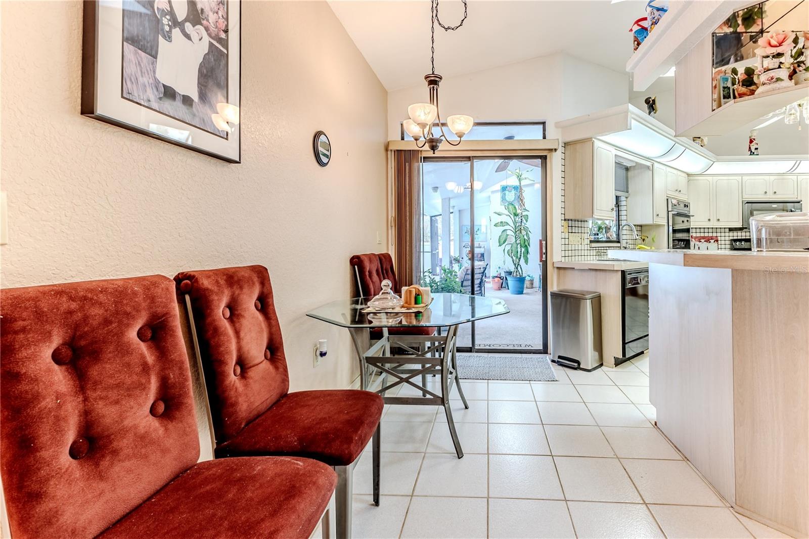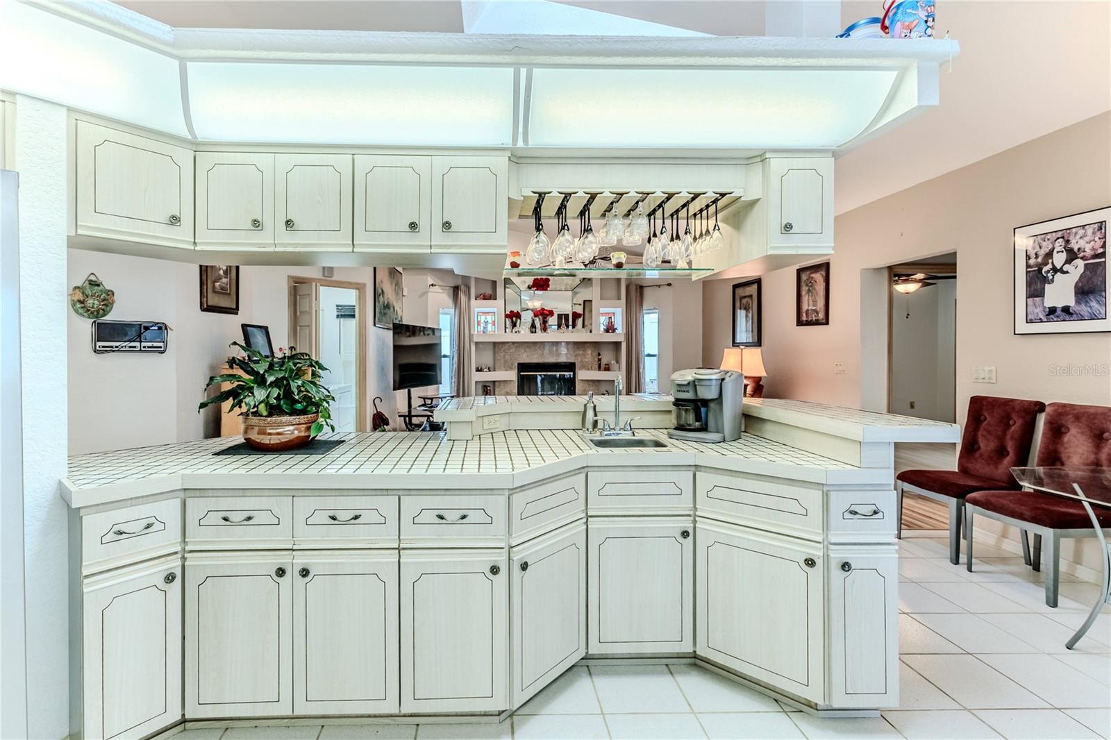 Discover this beautifully maintained 3-bedroom, 2-bathroom home with a 2.5-car garage and a heated saltwater pool and spa, perfect for enjoying Florida's sunshine. The split floor plan provides privacy, while the double-door entry welcomes you into a grand formal living and dining room with vaulted ceilings, laminate flooring, and three sliding doors leading to the expansive lanai. The main bedroom suite is a true retreat, featuring laminate floors, a skylight, private pool access, and two oversized walk-in closets. The ensuite bathroom offers a jetted tub, dual sink vanity, shower, linen closet, and a separate toilet closet. The open-concept kitchen and family room create the heart of the home, boasting a fireplace, built-ins, two skylights, a range with built-in oven, pantry, breakfast bar, and cozy dining nook with lanai access. Two additional spacious bedrooms include large walk-in closets, with one offering direct pool access. The guest bathroom features a new walk-in tub and a convenient door leading to the lanai. Step outside to an outdoor oasis, complete with a covered lanai with skylights, a screen-enclosed heated pool and spa with a waterfall feature, and a fully fenced backyard. Additional highlights include new windows (2024), a new HVAC system (2024), and a new roof (2025), ensuring peace of mind. A shed provides extra storage, and the large garage includes a freezer. The inside laundry room is equipped with a sink and cabinets. This home is a rare find—move-in ready. Schedule your showing today and experience Florida living at its best!