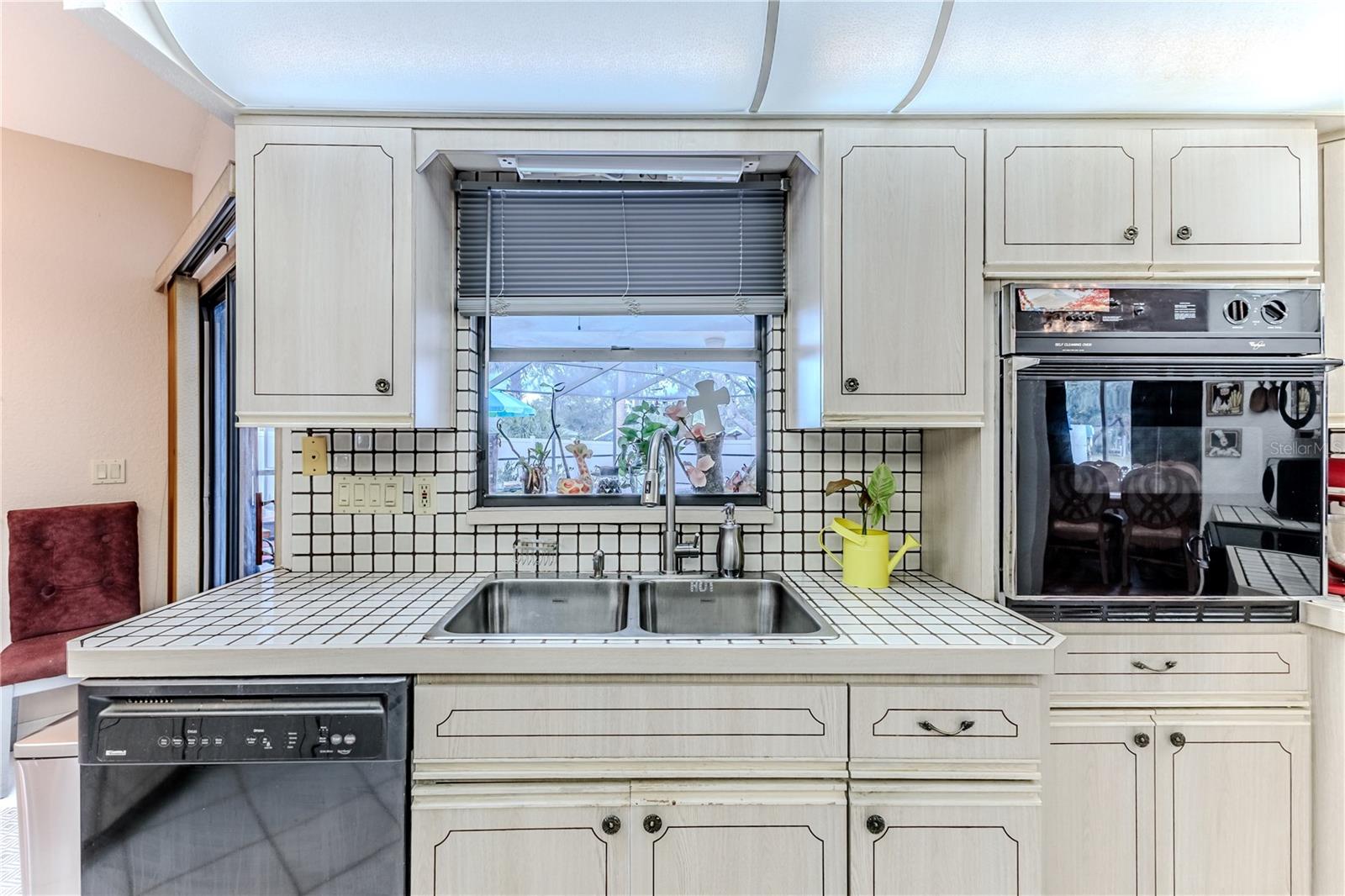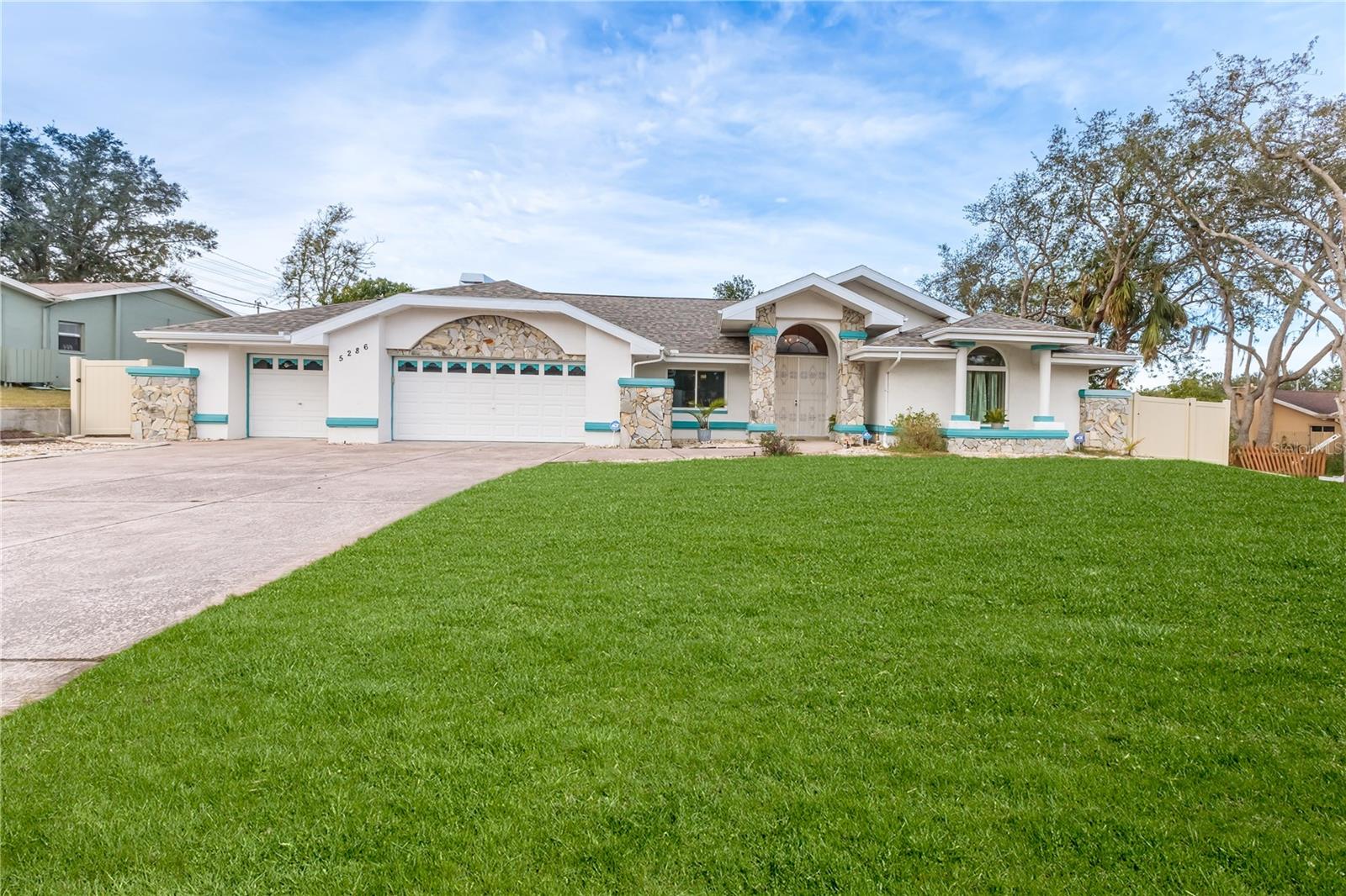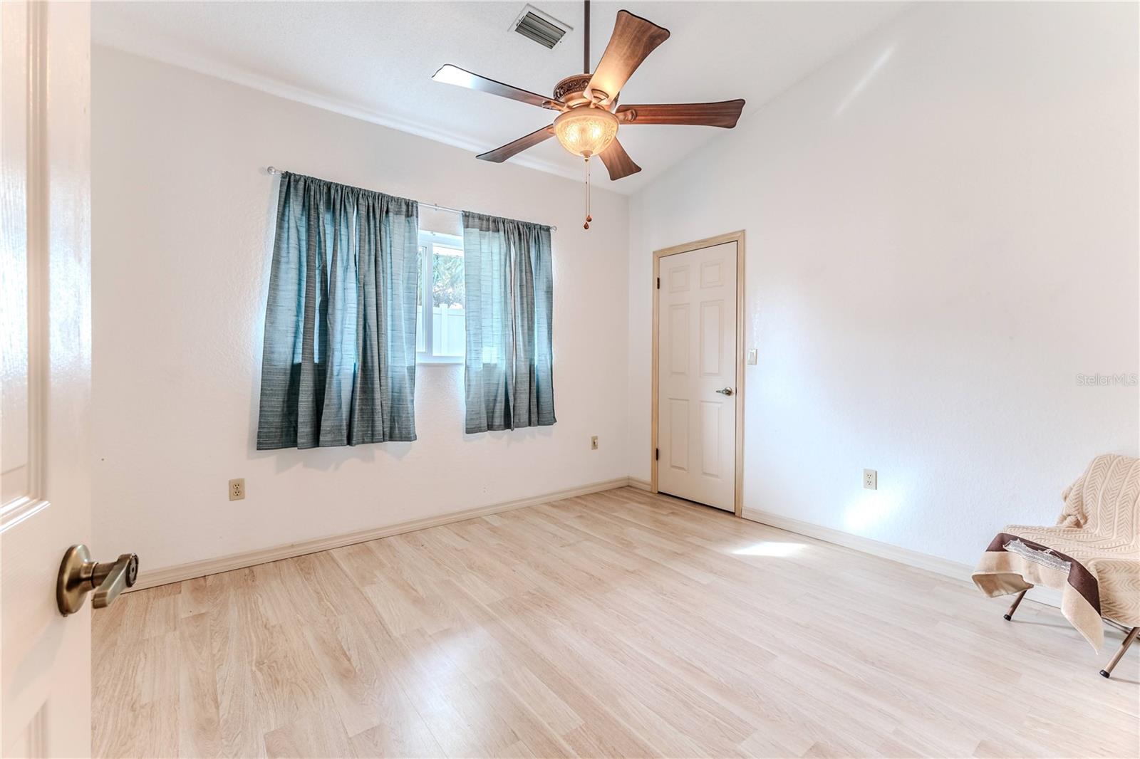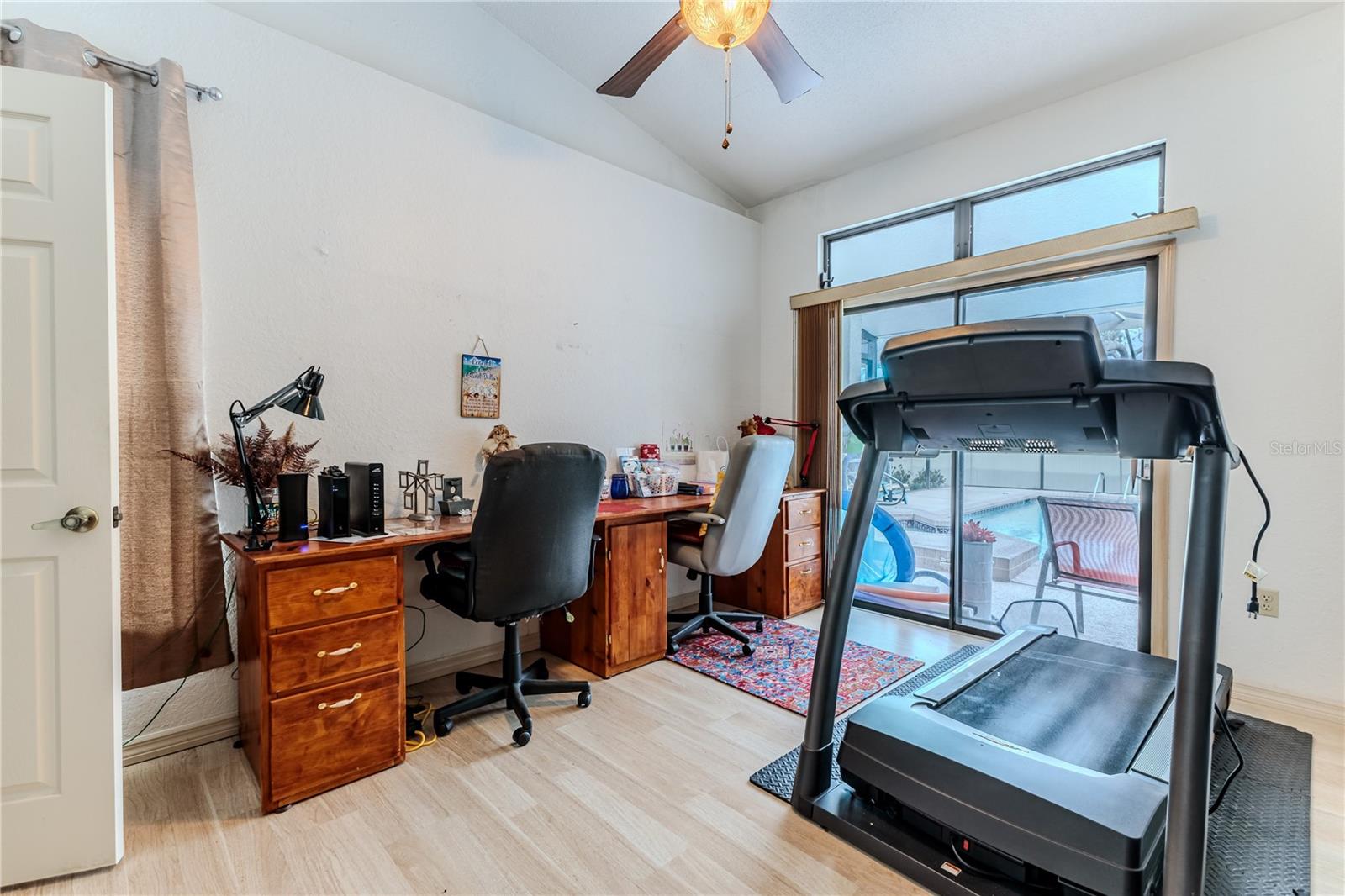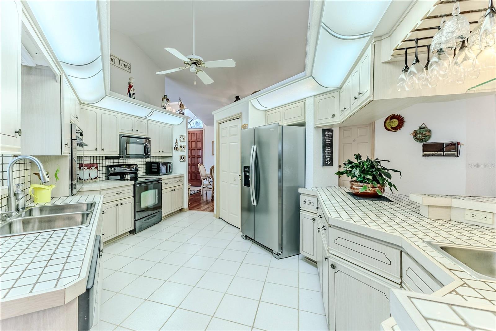 Discover this beautifully maintained 3-bedroom, 2-bathroom home with a 2.5-car garage and a heated saltwater pool and spa, perfect for enjoying Florida's sunshine. The split floor plan provides privacy, while the double-door entry welcomes you into a grand formal living and dining room with vaulted ceilings, laminate flooring, and three sliding doors leading to the expansive lanai. The main bedroom suite is a true retreat, featuring laminate floors, a skylight, private pool access, and two oversized walk-in closets. The ensuite bathroom offers a jetted tub, dual sink vanity, shower, linen closet, and a separate toilet closet. The open-concept kitchen and family room create the heart of the home, boasting a fireplace, built-ins, two skylights, a range with built-in oven, pantry, breakfast bar, and cozy dining nook with lanai access. Two additional spacious bedrooms include large walk-in closets, with one offering direct pool access. The guest bathroom features a new walk-in tub and a convenient door leading to the lanai. Step outside to an outdoor oasis, complete with a covered lanai with skylights, a screen-enclosed heated pool and spa with a waterfall feature, and a fully fenced backyard. Additional highlights include new windows (2024), a new HVAC system (2024), and a new roof (2025), ensuring peace of mind. A shed provides extra storage, and the large garage includes a freezer. The inside laundry room is equipped with a sink and cabinets. This home is a rare find—move-in ready. Schedule your showing today and experience Florida living at its best!