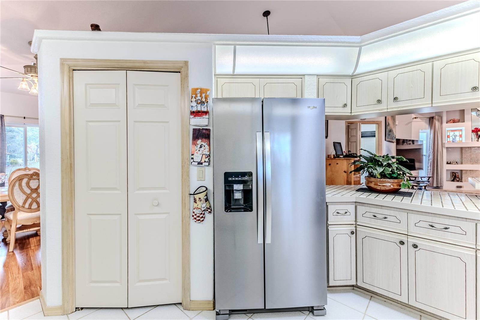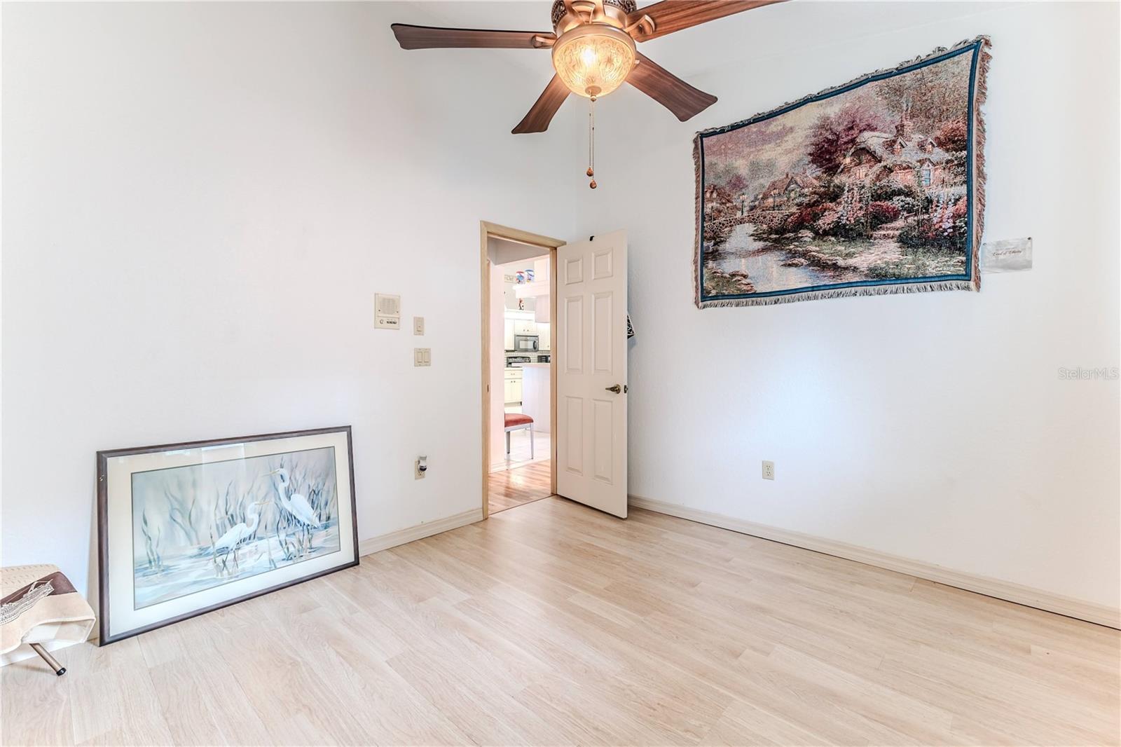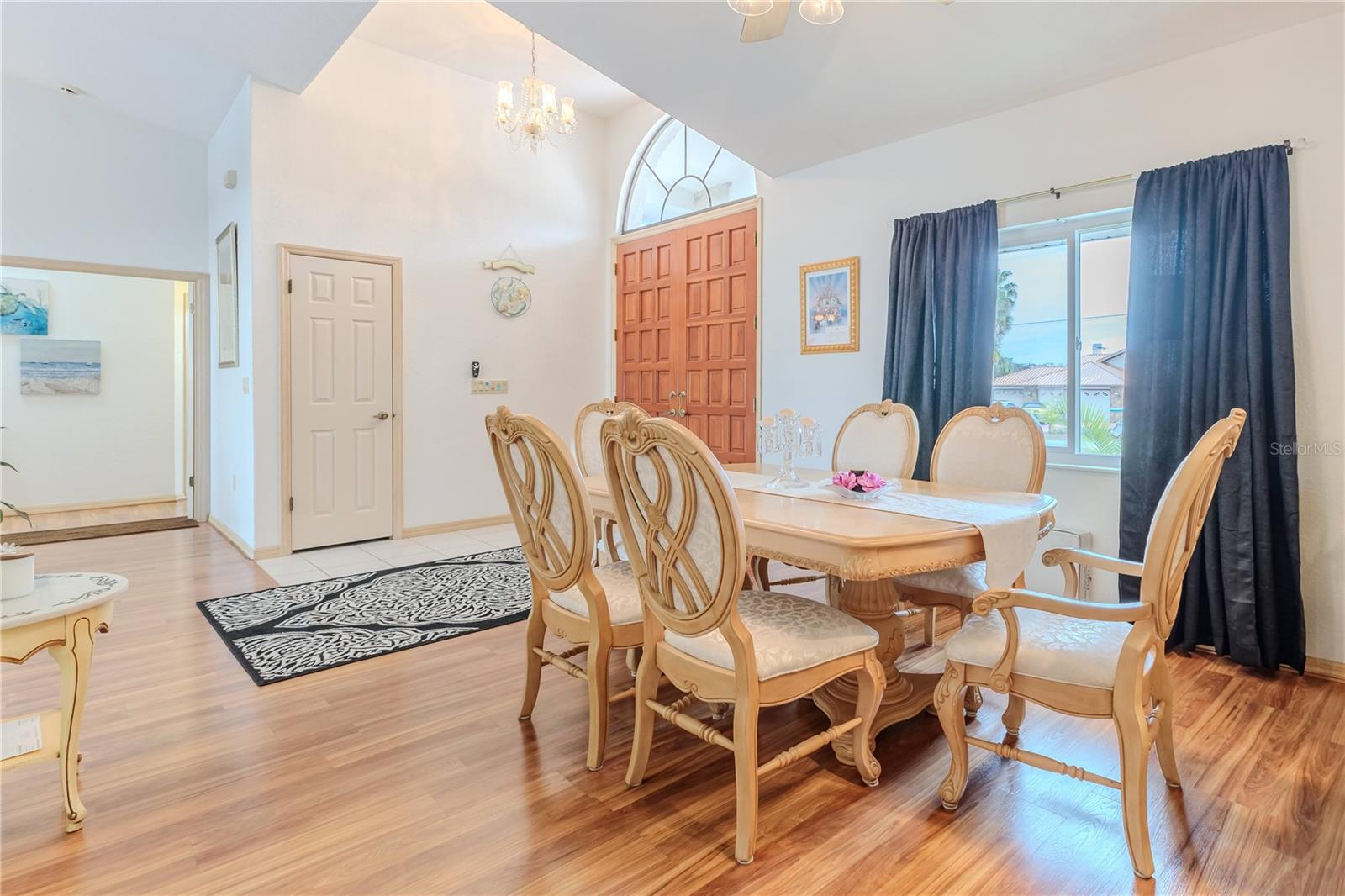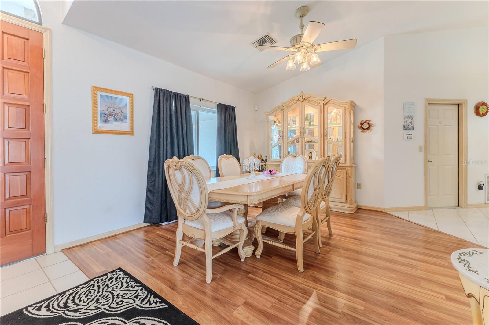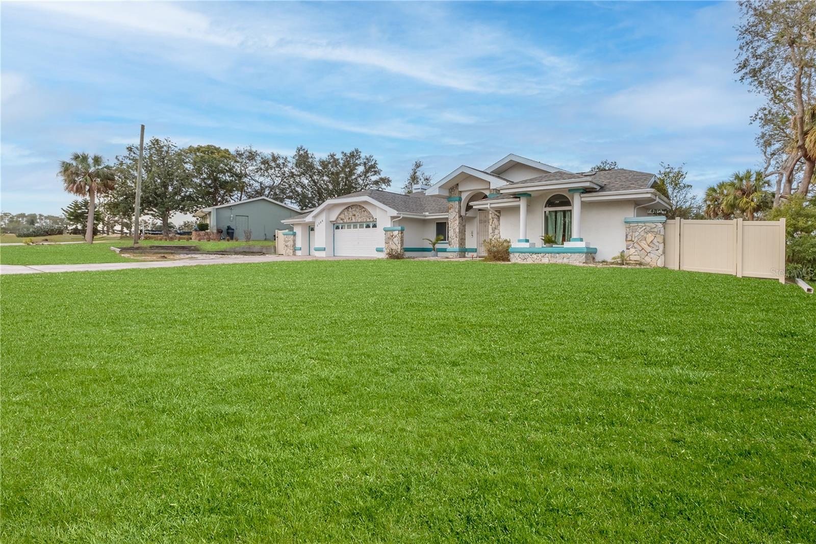 Discover this beautifully maintained 3-bedroom, 2-bathroom home with a 2.5-car garage and a heated saltwater pool and spa, perfect for enjoying Florida's sunshine. The split floor plan provides privacy, while the double-door entry welcomes you into a grand formal living and dining room with vaulted ceilings, laminate flooring, and three sliding doors leading to the expansive lanai. The main bedroom suite is a true retreat, featuring laminate floors, a skylight, private pool access, and two oversized walk-in closets. The ensuite bathroom offers a jetted tub, dual sink vanity, shower, linen closet, and a separate toilet closet. The open-concept kitchen and family room create the heart of the home, boasting a fireplace, built-ins, two skylights, a range with built-in oven, pantry, breakfast bar, and cozy dining nook with lanai access. Two additional spacious bedrooms include large walk-in closets, with one offering direct pool access. The guest bathroom features a new walk-in tub and a convenient door leading to the lanai. Step outside to an outdoor oasis, complete with a covered lanai with skylights, a screen-enclosed heated pool and spa with a waterfall feature, and a fully fenced backyard. Additional highlights include new windows (2024), a new HVAC system (2024), and a new roof (2025), ensuring peace of mind. A shed provides extra storage, and the large garage includes a freezer. The inside laundry room is equipped with a sink and cabinets. This home is a rare find—move-in ready. Schedule your showing today and experience Florida living at its best!