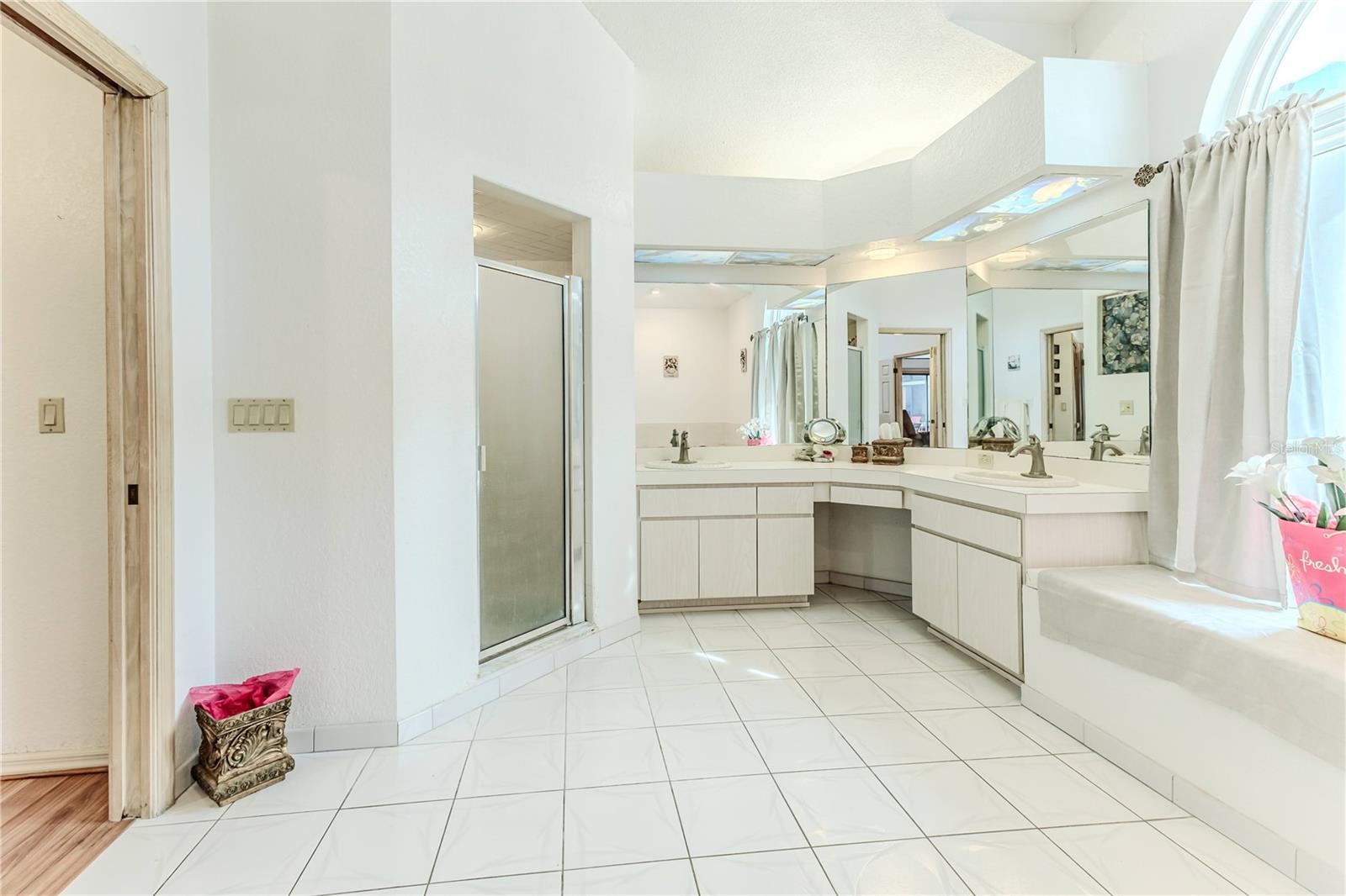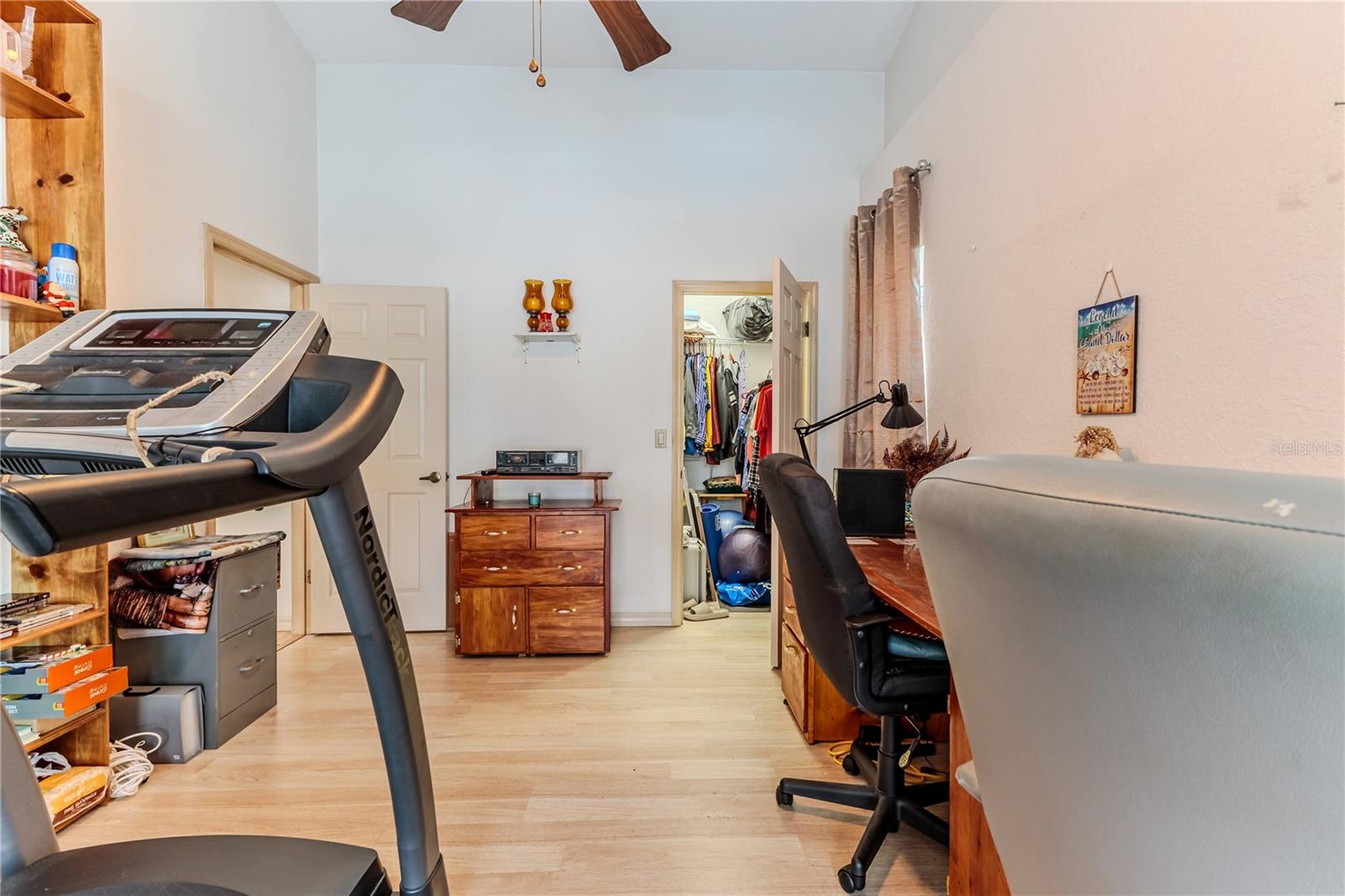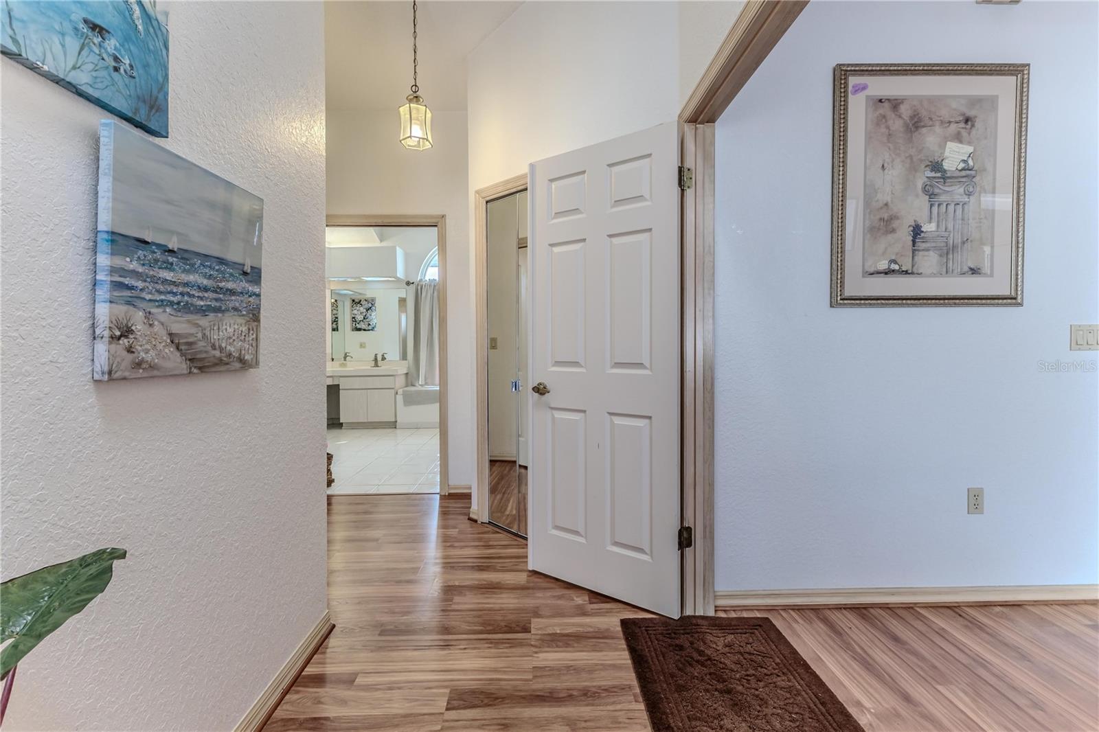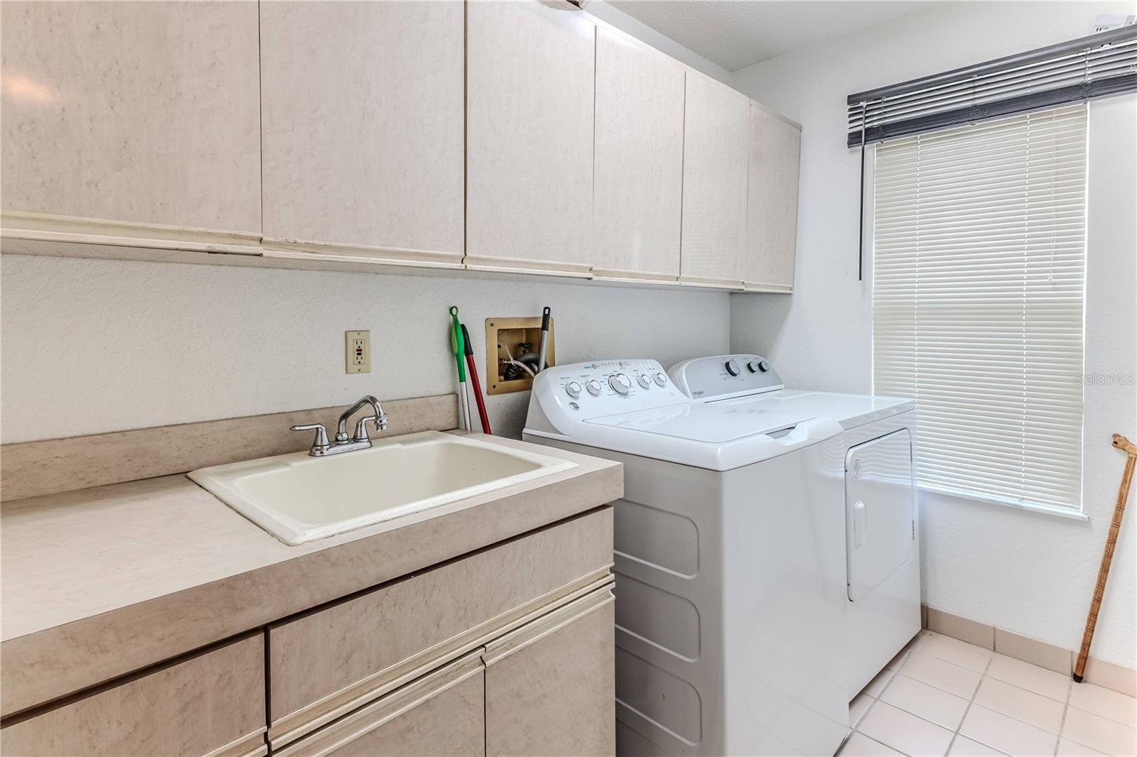 Discover this beautifully maintained 3-bedroom, 2-bathroom home with a 2.5-car garage and a heated saltwater pool and spa, perfect for enjoying Florida's sunshine. The split floor plan provides privacy, while the double-door entry welcomes you into a grand formal living and dining room with vaulted ceilings, laminate flooring, and three sliding doors leading to the expansive lanai. The main bedroom suite is a true retreat, featuring laminate floors, a skylight, private pool access, and two oversized walk-in closets. The ensuite bathroom offers a jetted tub, dual sink vanity, shower, linen closet, and a separate toilet closet. The open-concept kitchen and family room create the heart of the home, boasting a fireplace, built-ins, two skylights, a range with built-in oven, pantry, breakfast bar, and cozy dining nook with lanai access. Two additional spacious bedrooms include large walk-in closets, with one offering direct pool access. The guest bathroom features a new walk-in tub and a convenient door leading to the lanai. Step outside to an outdoor oasis, complete with a covered lanai with skylights, a screen-enclosed heated pool and spa with a waterfall feature, and a fully fenced backyard. Additional highlights include new windows (2024), a new HVAC system (2024), and a new roof (2025), ensuring peace of mind. A shed provides extra storage, and the large garage includes a freezer. The inside laundry room is equipped with a sink and cabinets. This home is a rare find—move-in ready. Schedule your showing today and experience Florida living at its best!