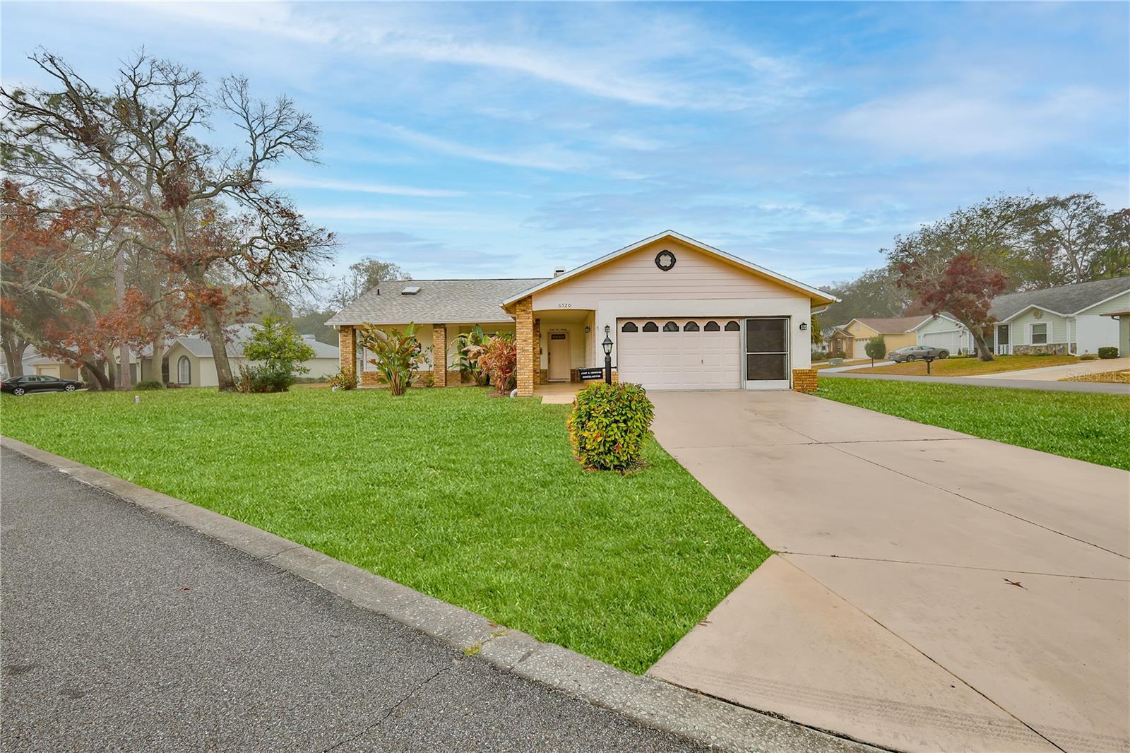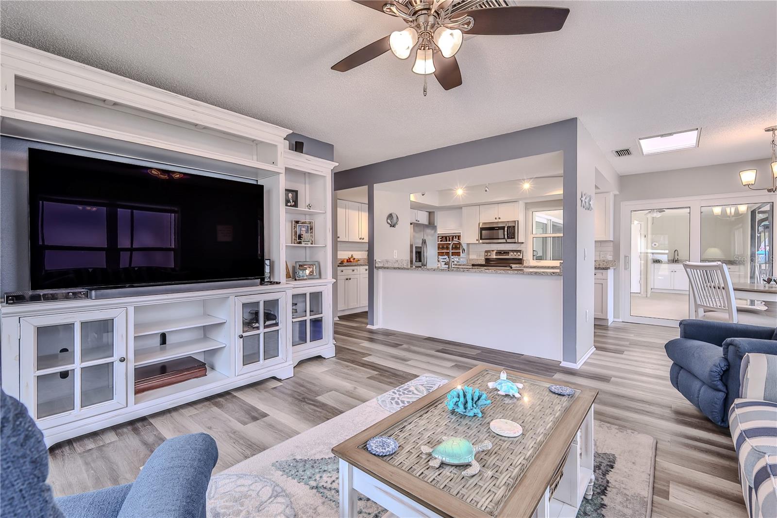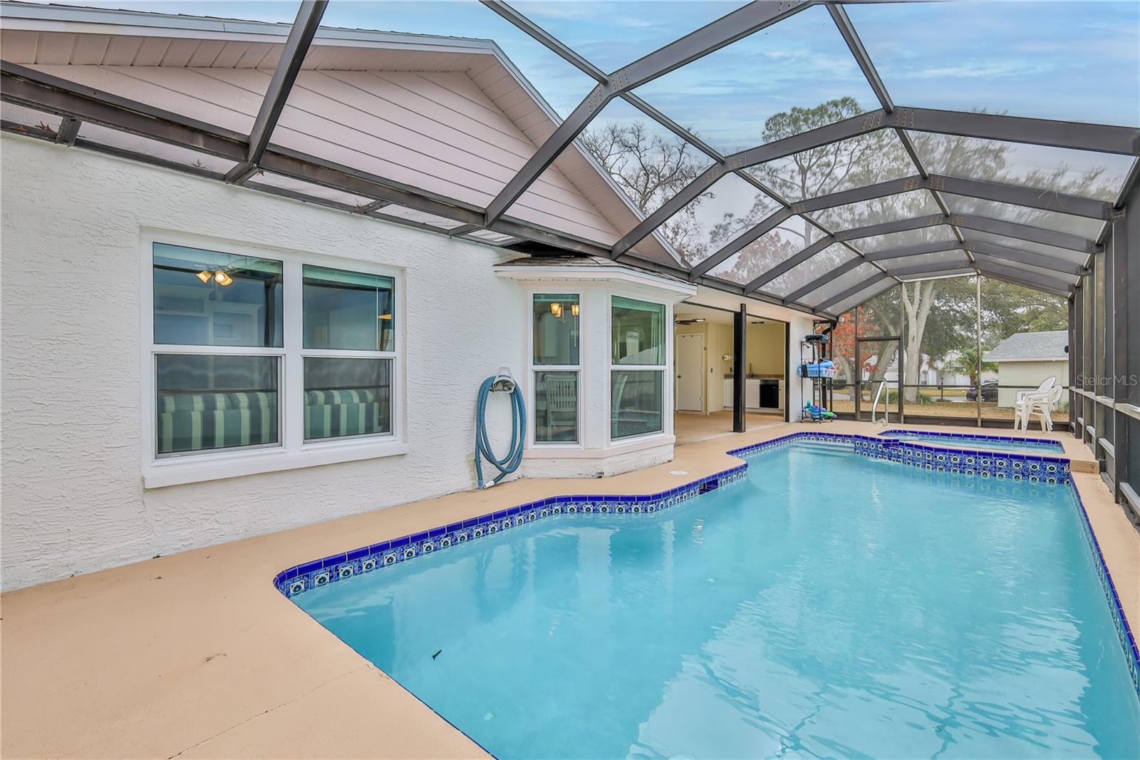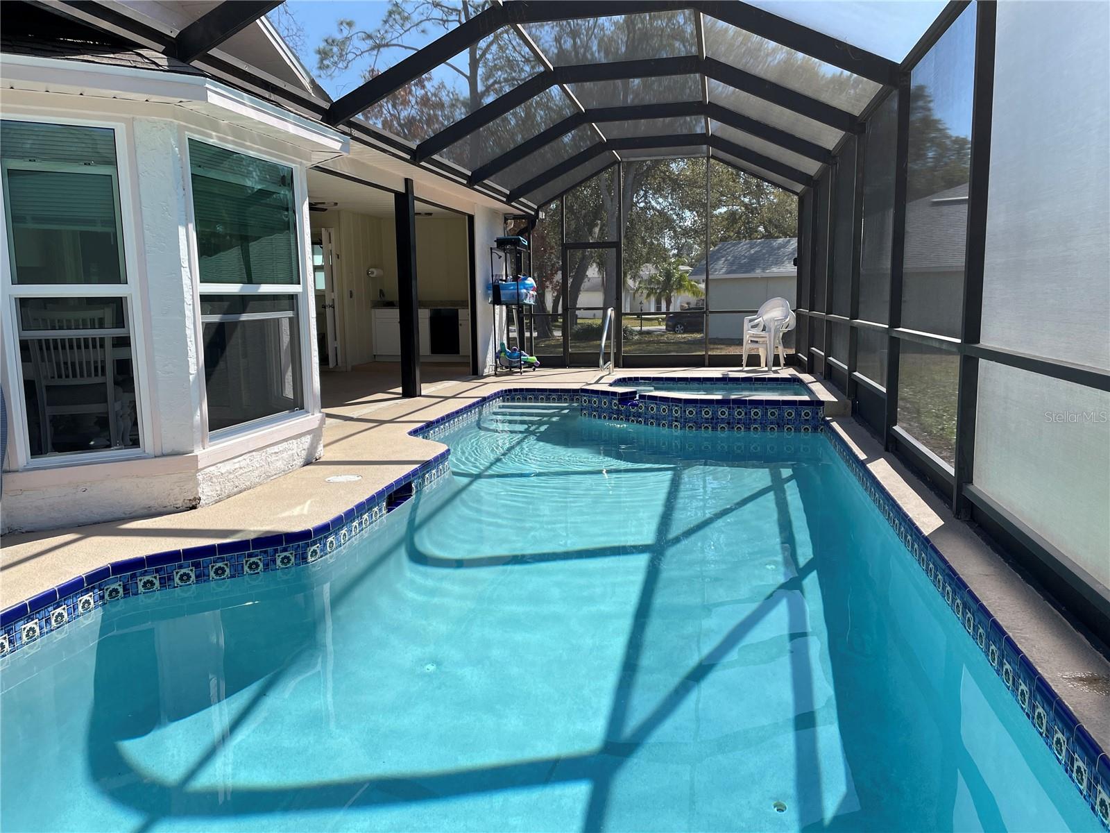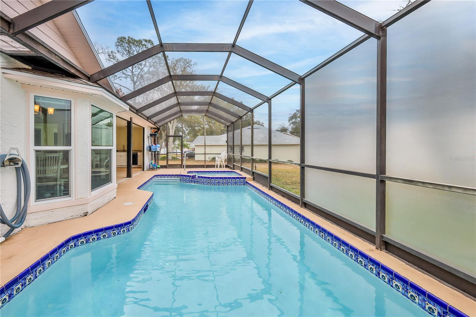 You'll love this beautifully decorated Victoria model, pool-home! Boasting 3 bedrooms, 2 full bathrooms, 2 half bathrooms and a 2-car garage, this home features a split floor plan with a mix of carpet and luxury vinyl plank flooring throughout. Step inside to a freshly painted interior featuring a formal living and dining area with vaulted ceilings, skylights, along with a cozy wood-burning fireplace. This space flows seamlessly into a versatile screened-in pool and lanai—perfect for relaxation or entertaining. The inviting family room offers tranquil pool views, creating a warm and welcoming atmosphere. The updated kitchen is light and bright, featuring soft-close wood cabinets, granite countertops, a new dishwasher, stainless steel appliances, and a sunny breakfast nook ideal for enjoying your morning coffee. The main bedroom ensuite is a private haven with two walk-in closets, sliding glass doors to the lanai, and serene pool views. The updated ensuite bathroom includes a walk-in shower and a linen closet. Guests will appreciate the generously sized second bedroom with an ensuite half bath, while bedroom 3 is conveniently located near the guest bathroom with a tub/shower combo. The outdoor oasis includes a screened-in heated pool with a jetted spa and waterfall feature, as well as a covered lanai with a kitchenette, sink, storage, and a half bath—perfect for entertaining. This home is move-in ready with a new roof (2024), new HVAC system (2024), and new hurricane-rated double-pane windows and sliding doors (2024). Additional highlights include new toilets, newer lighting fixtures, a well for the sprinkler system, water softener, and an inside utility room with cabinets and a sink. Located in Timber Pines, a guard-gated, 55+ deed-restricted community, you'll enjoy unparalleled amenities, including three 18-hole golf courses, a pitch-and-putt course, two pools, 12 pickleball courts, a clubhouse with a restaurant and bar, a performing arts center, and a state-of-the-art fitness center. Engage in over 100 clubs, from golf and Mah Jongg to woodworking and pottery. Explore this captivating home and envision your future in this vibrant, resort-style community. Your dream home awaits!