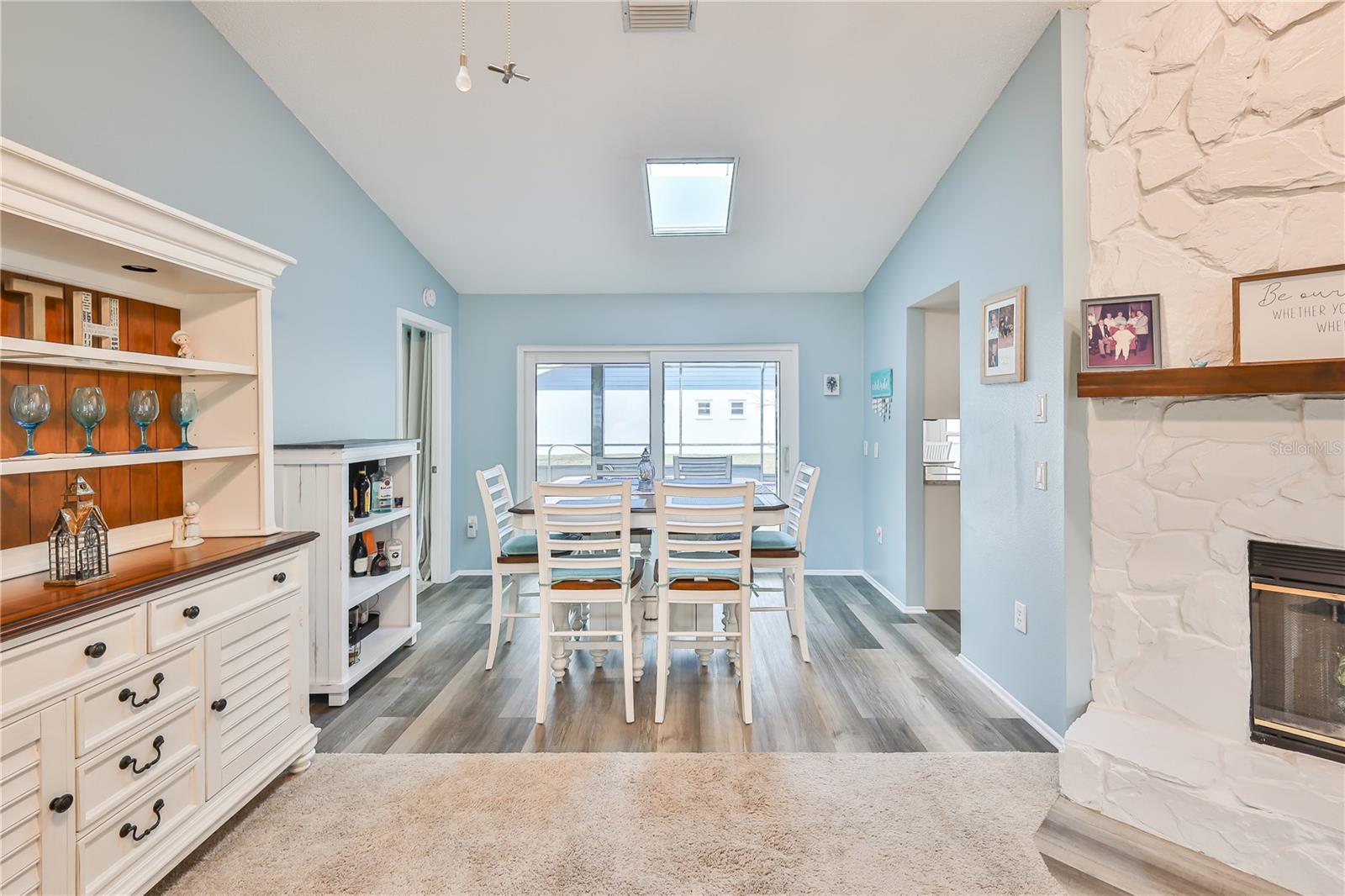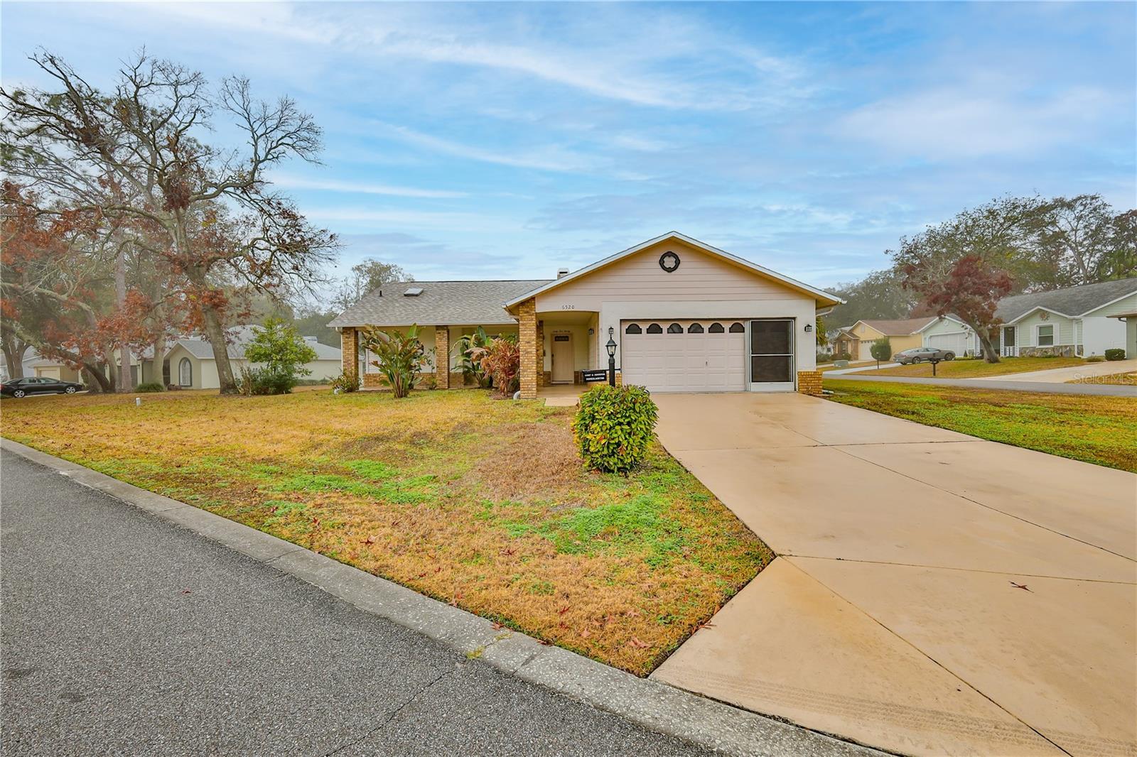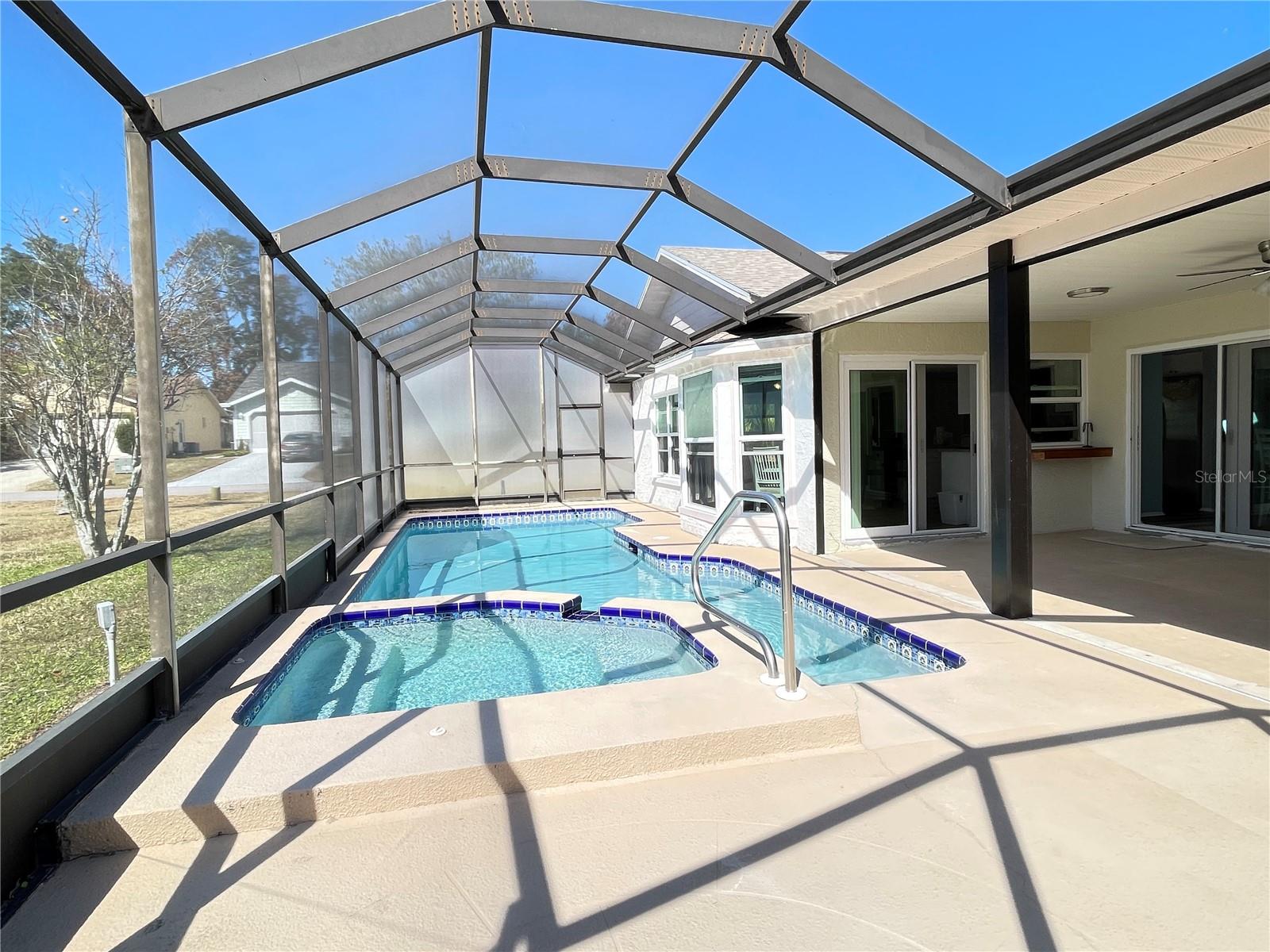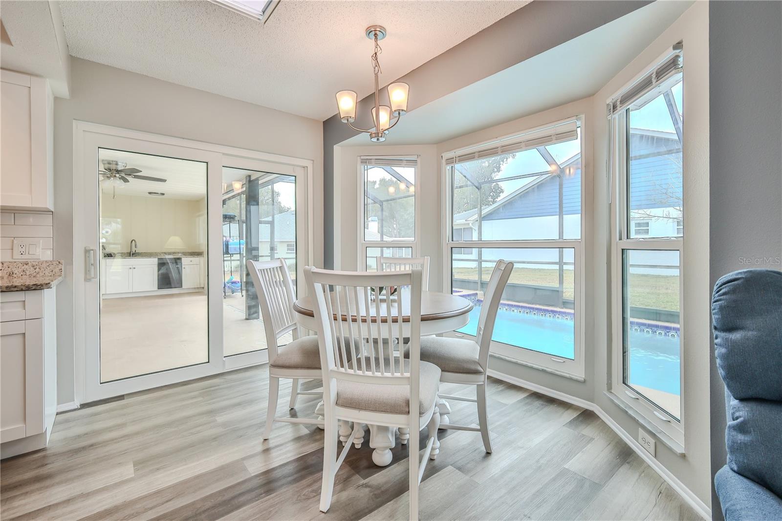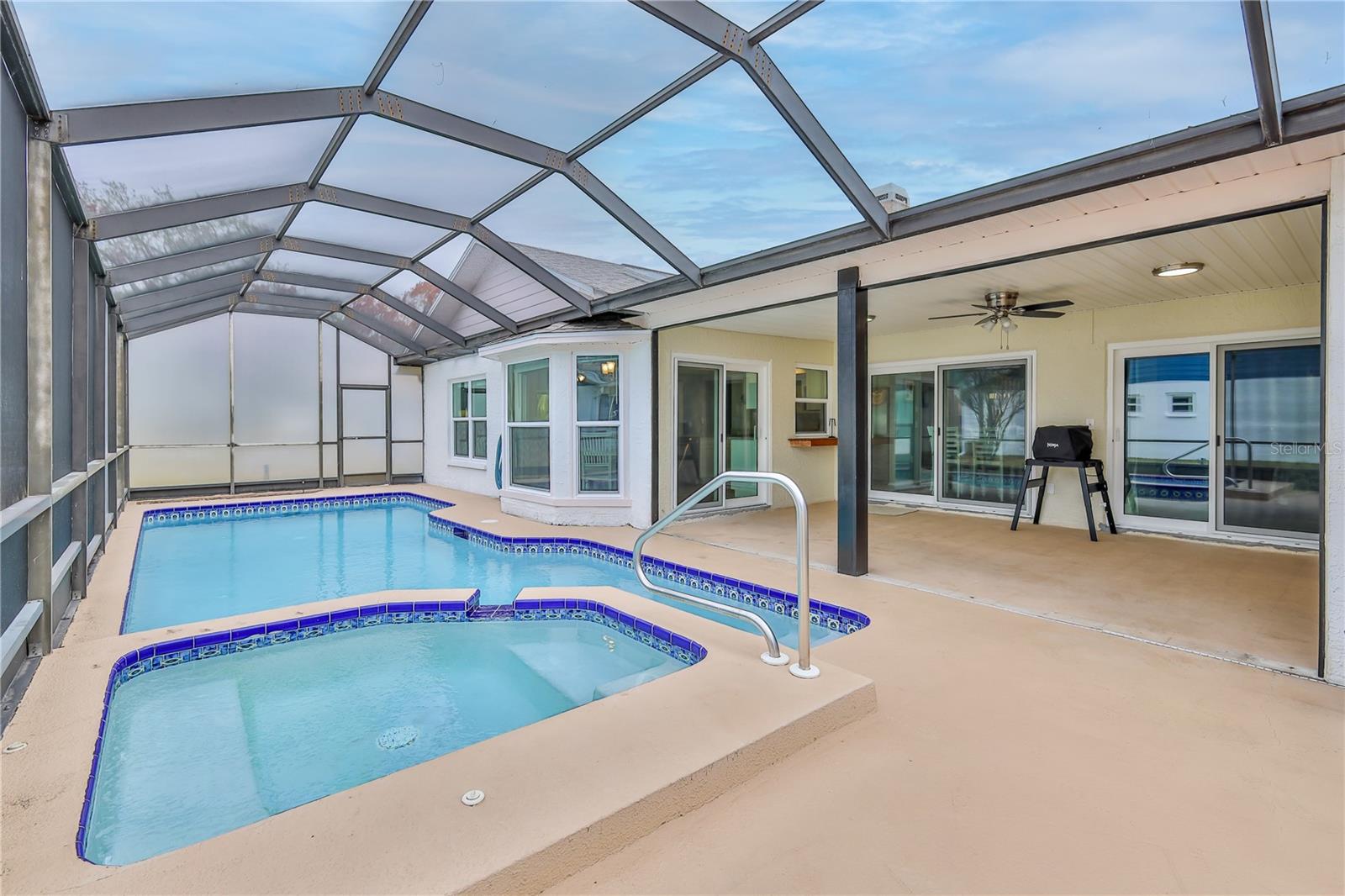 You'll love this beautifully decorated Victoria model, pool-home! Boasting 3 bedrooms, 2 full bathrooms, 2 half bathrooms and a 2-car garage, this home features a split floor plan with a mix of carpet and luxury vinyl plank flooring throughout. Step inside to a freshly painted interior featuring a formal living and dining area with vaulted ceilings, skylights, along with a cozy wood-burning fireplace. This space flows seamlessly into a versatile screened-in pool and lanai—perfect for relaxation or entertaining. The inviting family room offers tranquil pool views, creating a warm and welcoming atmosphere. The updated kitchen is light and bright, featuring soft-close wood cabinets, granite countertops, a new dishwasher, stainless steel appliances, and a sunny breakfast nook ideal for enjoying your morning coffee. The main bedroom ensuite is a private haven with two walk-in closets, sliding glass doors to the lanai, and serene pool views. The updated ensuite bathroom includes a walk-in shower and a linen closet. Guests will appreciate the generously sized second bedroom with an ensuite half bath, while bedroom 3 is conveniently located near the guest bathroom with a tub/shower combo. The outdoor oasis includes a screened-in heated pool with a jetted spa and waterfall feature, as well as a covered lanai with a kitchenette, sink, storage, and a half bath—perfect for entertaining. This home is move-in ready with a new roof (2024), new HVAC system (2024), and new hurricane-rated double-pane windows and sliding doors (2024). Additional highlights include new toilets, newer lighting fixtures, a well for the sprinkler system, water softener, and an inside utility room with cabinets and a sink. Located in Timber Pines, a guard-gated, 55+ deed-restricted community, you'll enjoy unparalleled amenities, including three 18-hole golf courses, a pitch-and-putt course, two pools, 12 pickleball courts, a clubhouse with a restaurant and bar, a performing arts center, and a state-of-the-art fitness center. Engage in over 100 clubs, from golf and Mah Jongg to woodworking and pottery. Explore this captivating home and envision your future in this vibrant, resort-style community. Your dream home awaits!