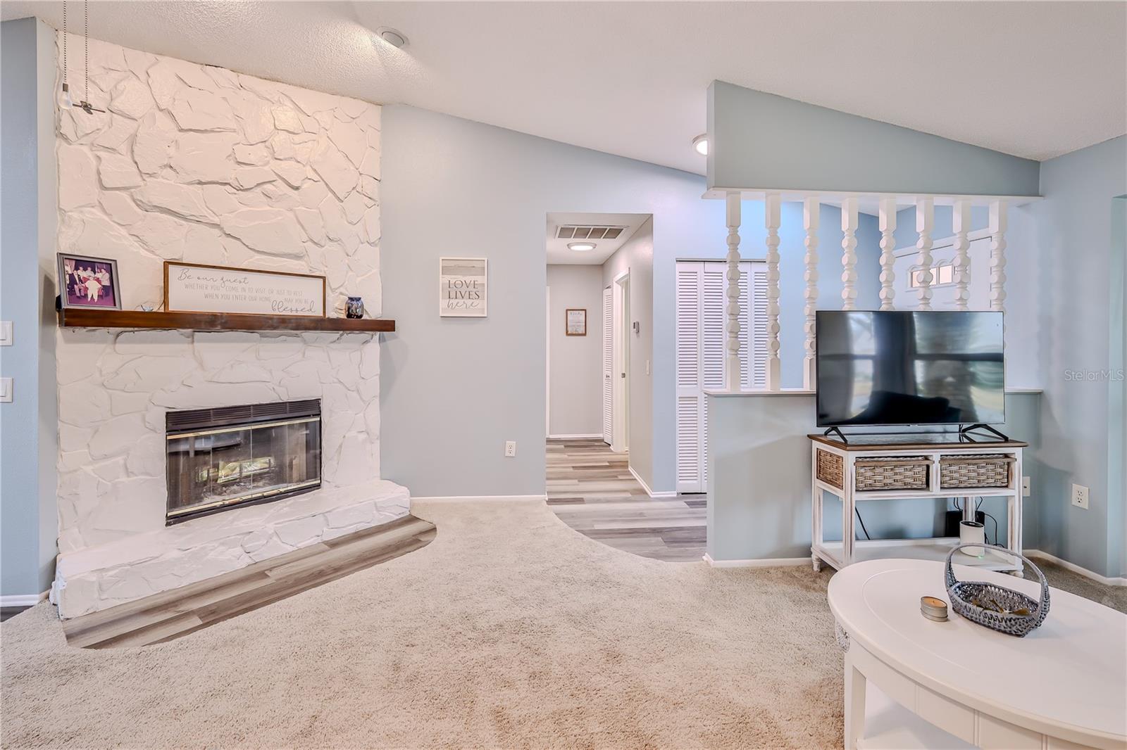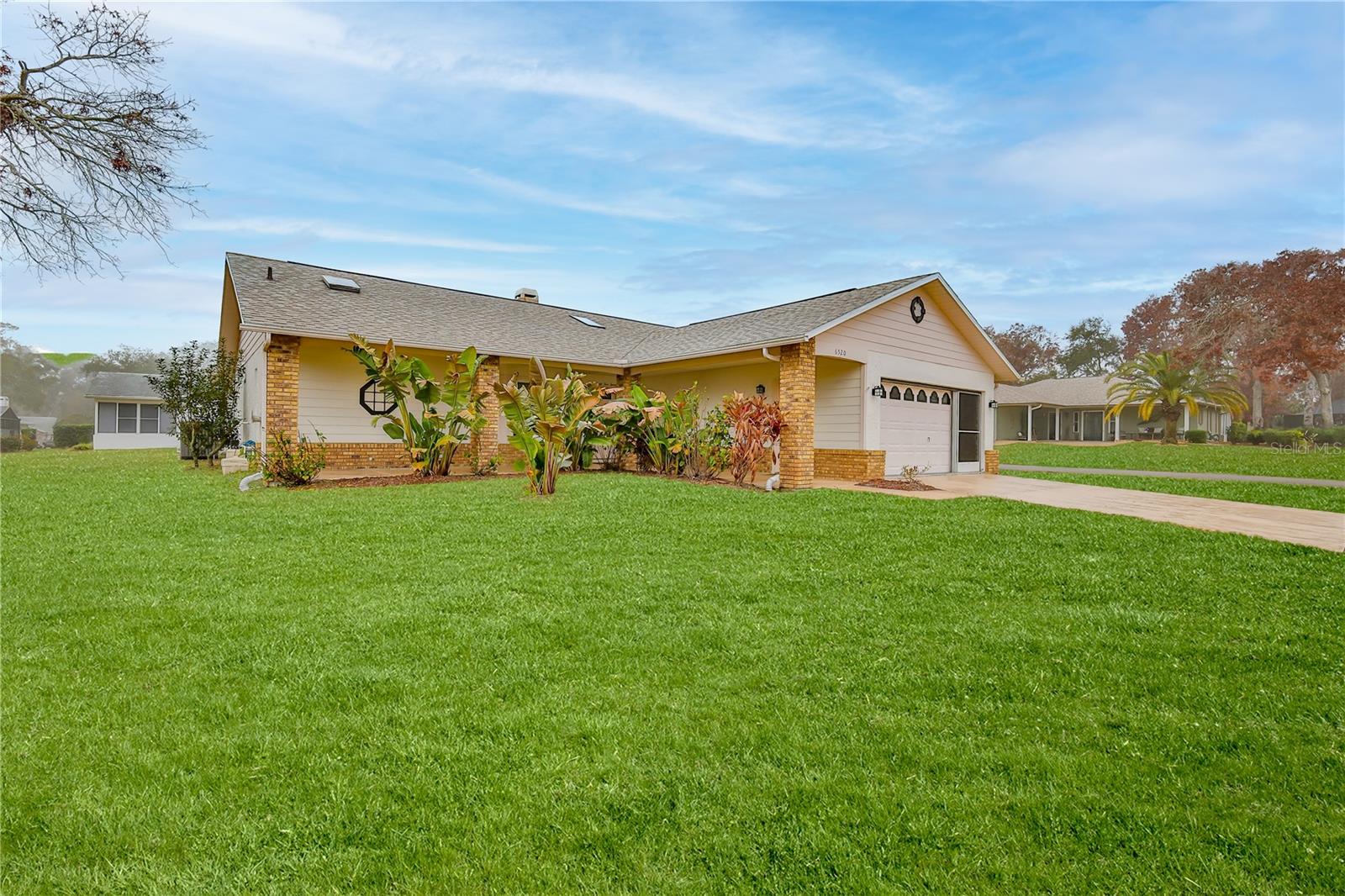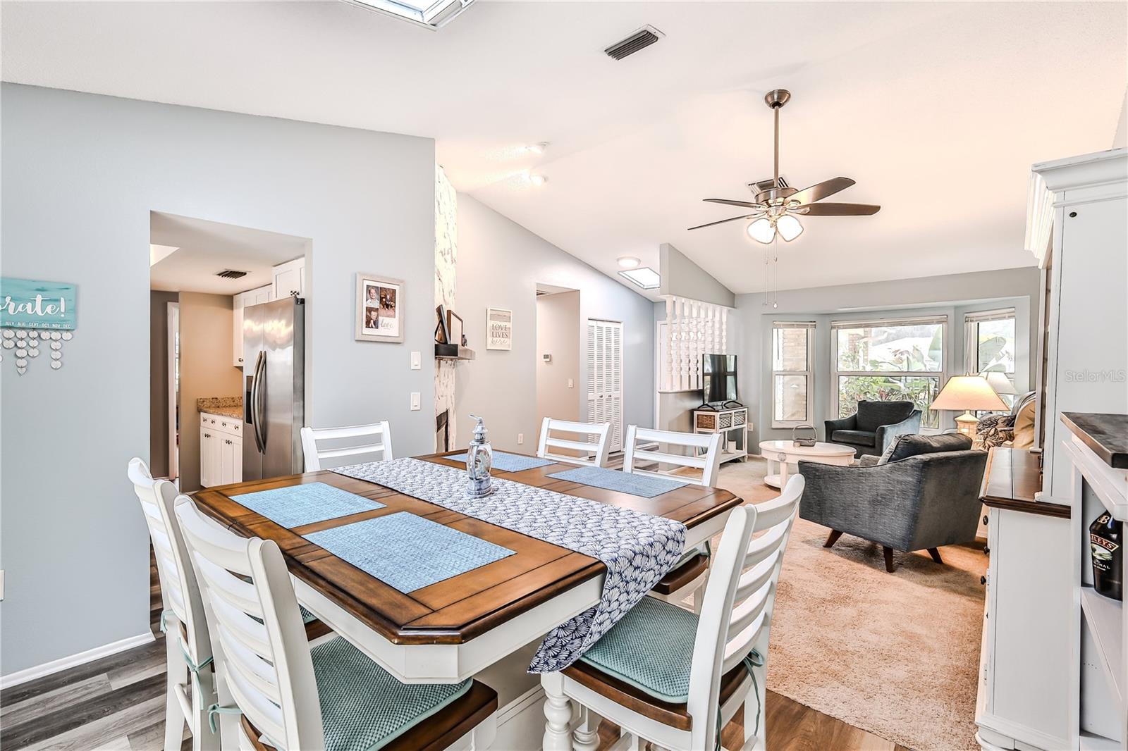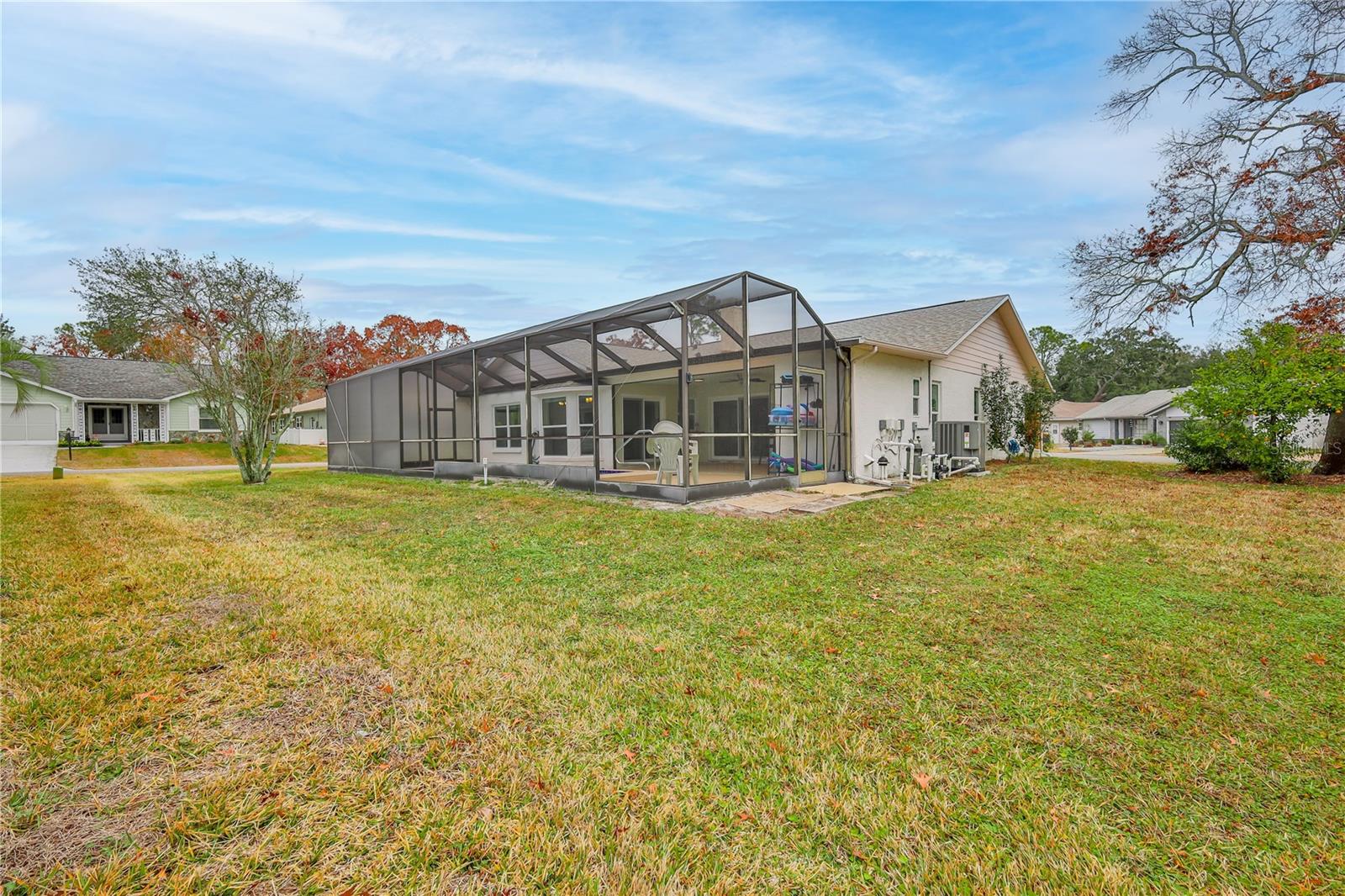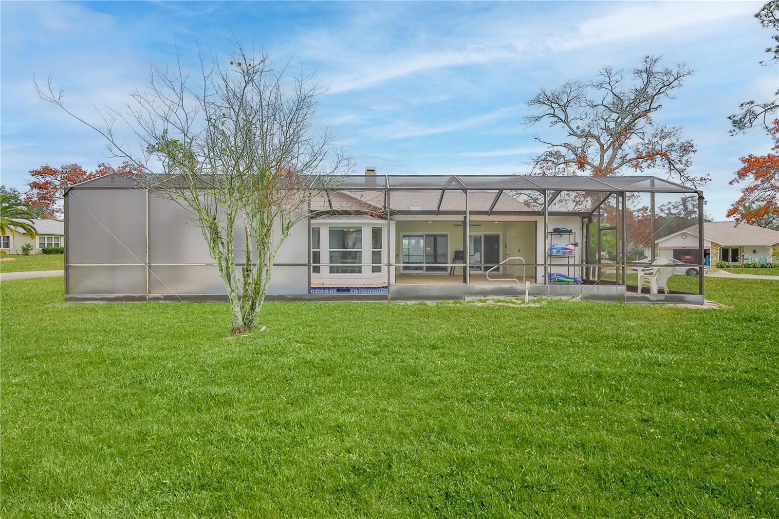 You'll love this beautifully decorated Victoria model, pool-home! Boasting 3 bedrooms, 2 full bathrooms, 2 half bathrooms and a 2-car garage, this home features a split floor plan with a mix of carpet and luxury vinyl plank flooring throughout. Step inside to a freshly painted interior featuring a formal living and dining area with vaulted ceilings, skylights, along with a cozy wood-burning fireplace. This space flows seamlessly into a versatile screened-in pool and lanai—perfect for relaxation or entertaining. The inviting family room offers tranquil pool views, creating a warm and welcoming atmosphere. The updated kitchen is light and bright, featuring soft-close wood cabinets, granite countertops, a new dishwasher, stainless steel appliances, and a sunny breakfast nook ideal for enjoying your morning coffee. The main bedroom ensuite is a private haven with two walk-in closets, sliding glass doors to the lanai, and serene pool views. The updated ensuite bathroom includes a walk-in shower and a linen closet. Guests will appreciate the generously sized second bedroom with an ensuite half bath, while bedroom 3 is conveniently located near the guest bathroom with a tub/shower combo. The outdoor oasis includes a screened-in heated pool with a jetted spa and waterfall feature, as well as a covered lanai with a kitchenette, sink, storage, and a half bath—perfect for entertaining. This home is move-in ready with a new roof (2024), new HVAC system (2024), and new hurricane-rated double-pane windows and sliding doors (2024). Additional highlights include new toilets, newer lighting fixtures, a well for the sprinkler system, water softener, and an inside utility room with cabinets and a sink. Located in Timber Pines, a guard-gated, 55+ deed-restricted community, you'll enjoy unparalleled amenities, including three 18-hole golf courses, a pitch-and-putt course, two pools, 12 pickleball courts, a clubhouse with a restaurant and bar, a performing arts center, and a state-of-the-art fitness center. Engage in over 100 clubs, from golf and Mah Jongg to woodworking and pottery. Explore this captivating home and envision your future in this vibrant, resort-style community. Your dream home awaits!