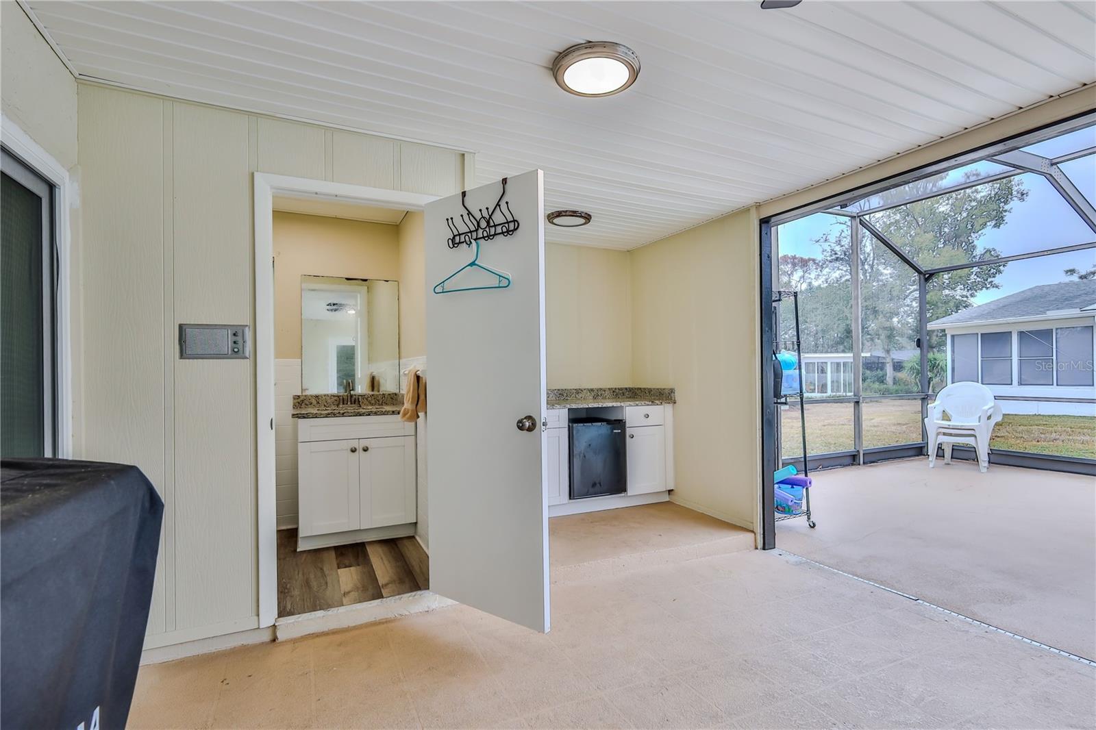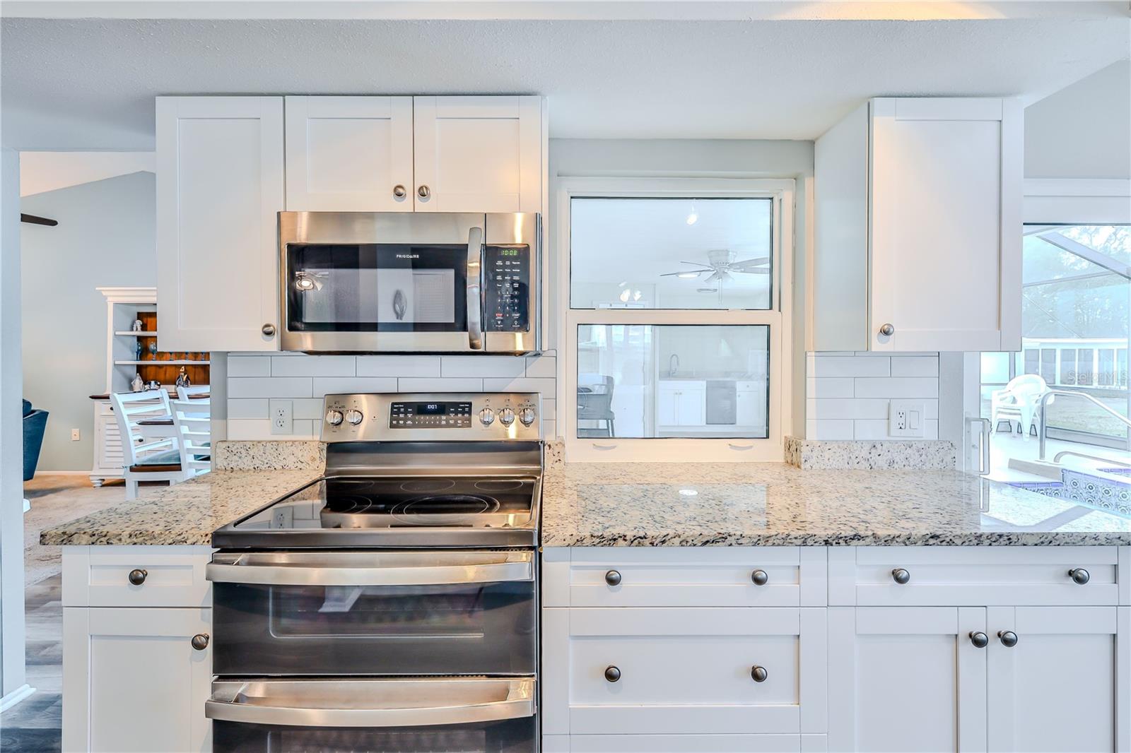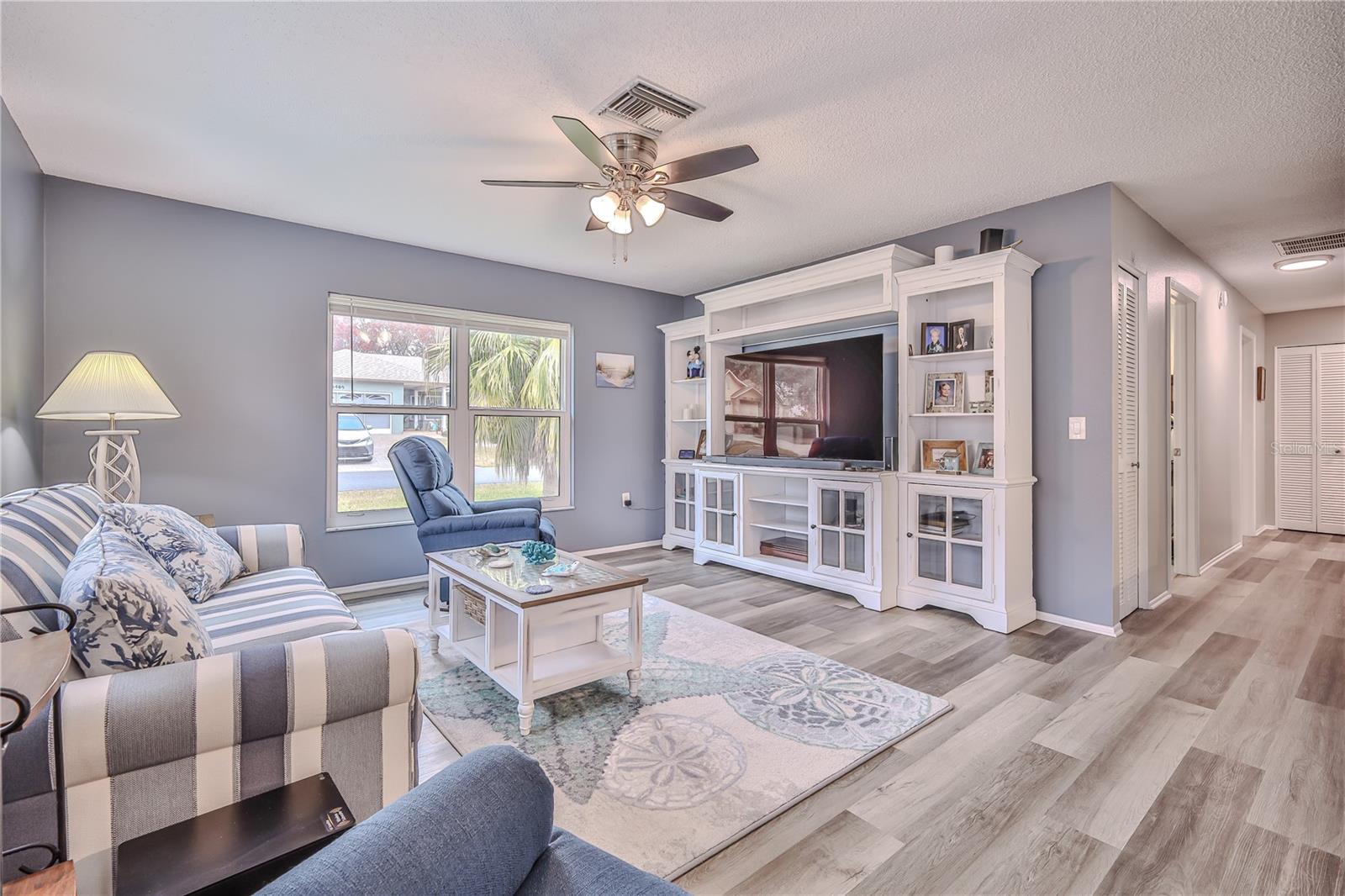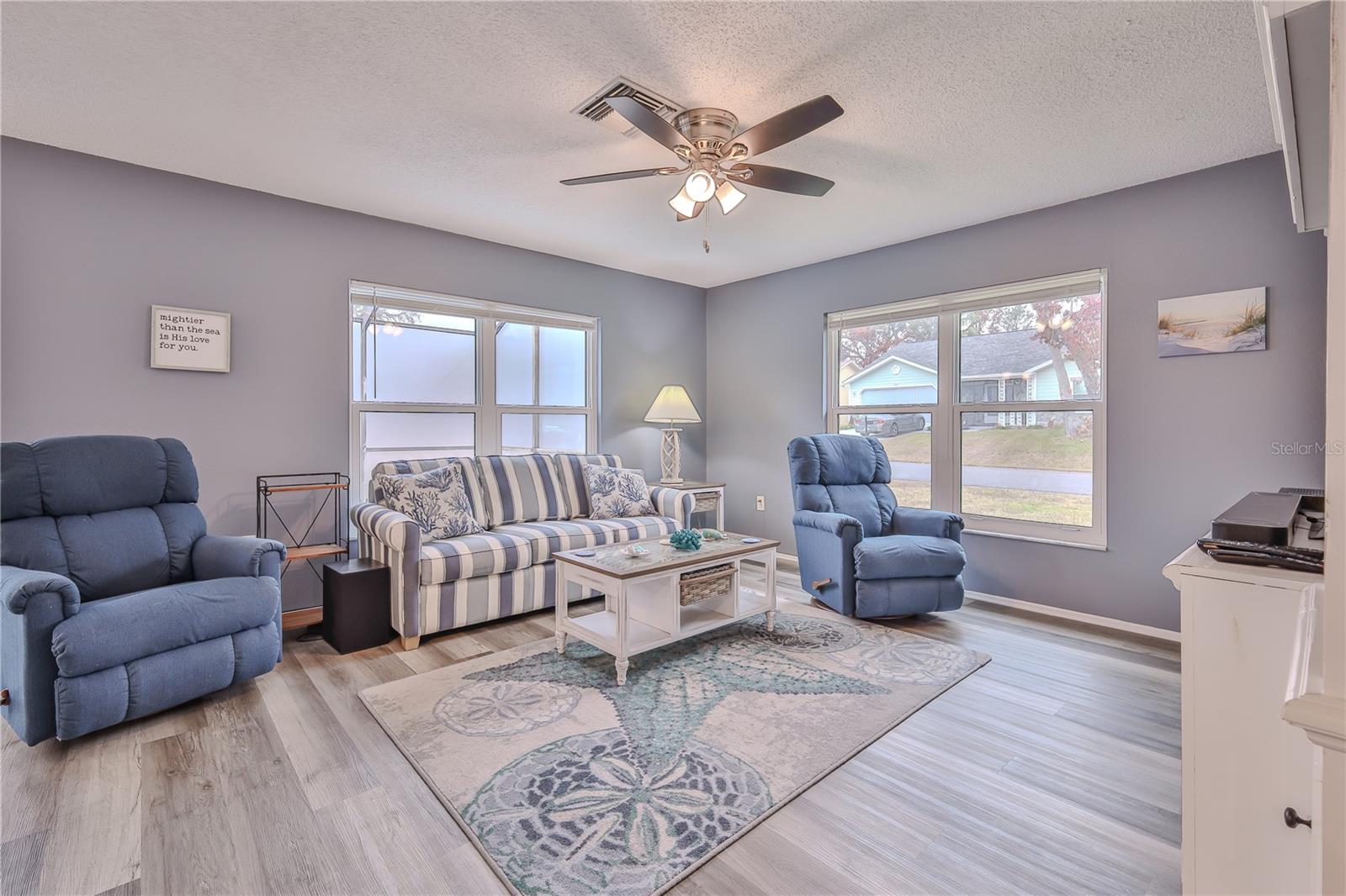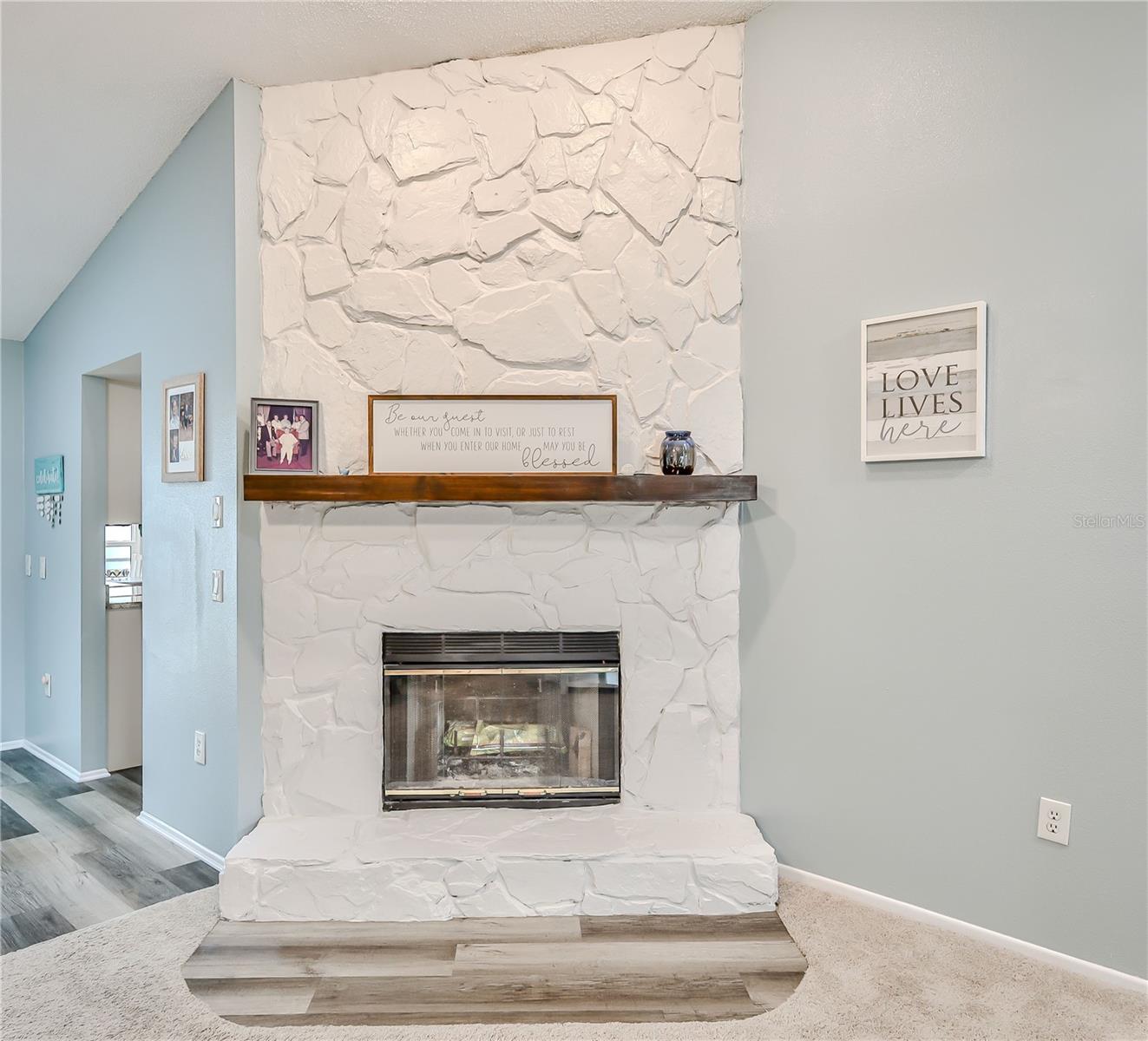 You'll love this beautifully decorated Victoria model, pool-home! Boasting 3 bedrooms, 2 full bathrooms, 2 half bathrooms and a 2-car garage, this home features a split floor plan with a mix of carpet and luxury vinyl plank flooring throughout. Step inside to a freshly painted interior featuring a formal living and dining area with vaulted ceilings, skylights, along with a cozy wood-burning fireplace. This space flows seamlessly into a versatile screened-in pool and lanai—perfect for relaxation or entertaining. The inviting family room offers tranquil pool views, creating a warm and welcoming atmosphere. The updated kitchen is light and bright, featuring soft-close wood cabinets, granite countertops, a new dishwasher, stainless steel appliances, and a sunny breakfast nook ideal for enjoying your morning coffee. The main bedroom ensuite is a private haven with two walk-in closets, sliding glass doors to the lanai, and serene pool views. The updated ensuite bathroom includes a walk-in shower and a linen closet. Guests will appreciate the generously sized second bedroom with an ensuite half bath, while bedroom 3 is conveniently located near the guest bathroom with a tub/shower combo. The outdoor oasis includes a screened-in heated pool with a jetted spa and waterfall feature, as well as a covered lanai with a kitchenette, sink, storage, and a half bath—perfect for entertaining. This home is move-in ready with a new roof (2024), new HVAC system (2024), and new hurricane-rated double-pane windows and sliding doors (2024). Additional highlights include new toilets, newer lighting fixtures, a well for the sprinkler system, water softener, and an inside utility room with cabinets and a sink. Located in Timber Pines, a guard-gated, 55+ deed-restricted community, you'll enjoy unparalleled amenities, including three 18-hole golf courses, a pitch-and-putt course, two pools, 12 pickleball courts, a clubhouse with a restaurant and bar, a performing arts center, and a state-of-the-art fitness center. Engage in over 100 clubs, from golf and Mah Jongg to woodworking and pottery. Explore this captivating home and envision your future in this vibrant, resort-style community. Your dream home awaits!